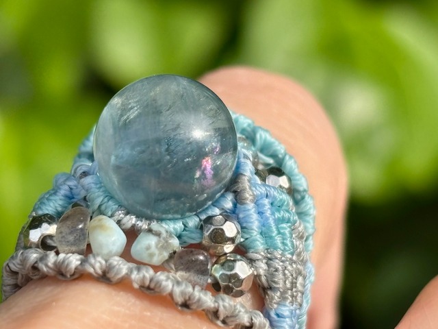#854天然ブルーフローライト一点物(ブルーフローライト×ラリマー×ラブラドライト マクラメ編みリング/指輪)
