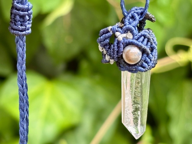 透明度抜群のブラジル・ミナスジェライス州コリントで2019年に新しく発見された鉱山【Zeca de Souza(ゼッカ・デ・ソーザ)鉱山】産のレムリアンシードです。 ファセット面などで研磨が無いナチュラルレムリアンで、透明度・照りどれをとっても極上品質の新しい産地のスターブラリーレムリアンシードですよ!! コリントのゼッカ・デ・ソーザ鉱山の水晶は【スターブラリークォーツ】や【ヴィジョンクォーツ】と呼ばれています。 この産地の水晶の特徴として、結晶は自然の芸術と言えるぐらいに美しく、透明度は非常に高く、そして清らかな結晶の柱面には美しい紋様や条線が刻まれ、内部には光の粒を散らしたような煌めきが浮かびます。 スターブラリーとはスター(星)+ライブラリー(図書館)という意味で、天然の特徴あるグリフ(模様)の刻まれたクリスタルになります。いわゆるゼッカデソーザ産の水晶は宇宙規模の情報を宿していると言われているクリスタルです。 レムリアンシードが太古の人々の記憶を宿すのに対して、スターブラリークォーツは人智を凌駕し、宇宙の域にまで達していると言われています。 その両方のエネルギーを持つのがスターブラリーレムリアンシードとされ、いまヒーリング大国のアメリカをはじめ世界中のヒーラーの方から絶大な人気を誇るレムリアンシードとされます。 この奇跡の結晶を繊細なマクラメ編みで編み上げた一点物ネックレス。 今までにないアクセサリーを、ご自身の装いに加えてみませんか? ※天然石は自然のものの為、特有のクラック、爪にかかる傷、凹みが御座いますが、それらも天然石の魅力として愛して頂ける方のご購入をお願いしたいと思います。 ※本商品は一点物です。掲載写真現物を発送いたします。(当店では色・形状・品質が違う品については、基本的に個別に撮影し、一点物販売をしております。) ※ギャランティカード付き ■ゼッカデソーザ産スターブラリーレムリアンシード たて約37.5mm×よこ約7.9mm×厚み約8.0mm ■北投石 約5mm ■ビーズ(シルバー) ■ネックレスサイズ 最長約70cm ■ベタ付きの少ない、良質なワックスコード(ポリエステル100%) (ネイビー×グレー) ※ご購入前に【SHOPPING GUIDE】ご一読、お願い致します。 (Pay IDアプリからご購入のお客様は”ショップ情報”から御覧ください。) ▫️Instagram⇒merci_cn