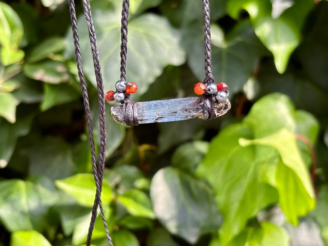 #867天然カイヤナイト一点物(カイヤナイト原石×テラヘルツ×カーネリアン マクラメ編みネックレス)