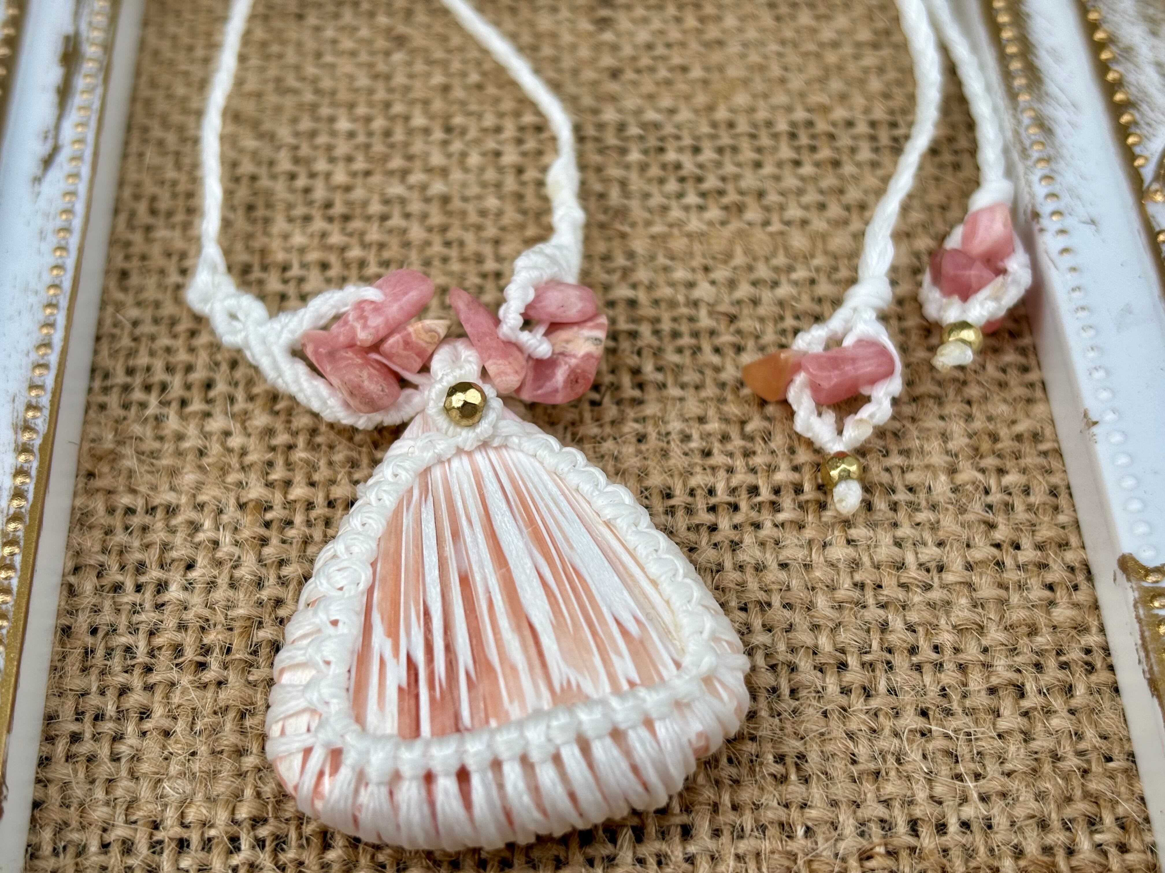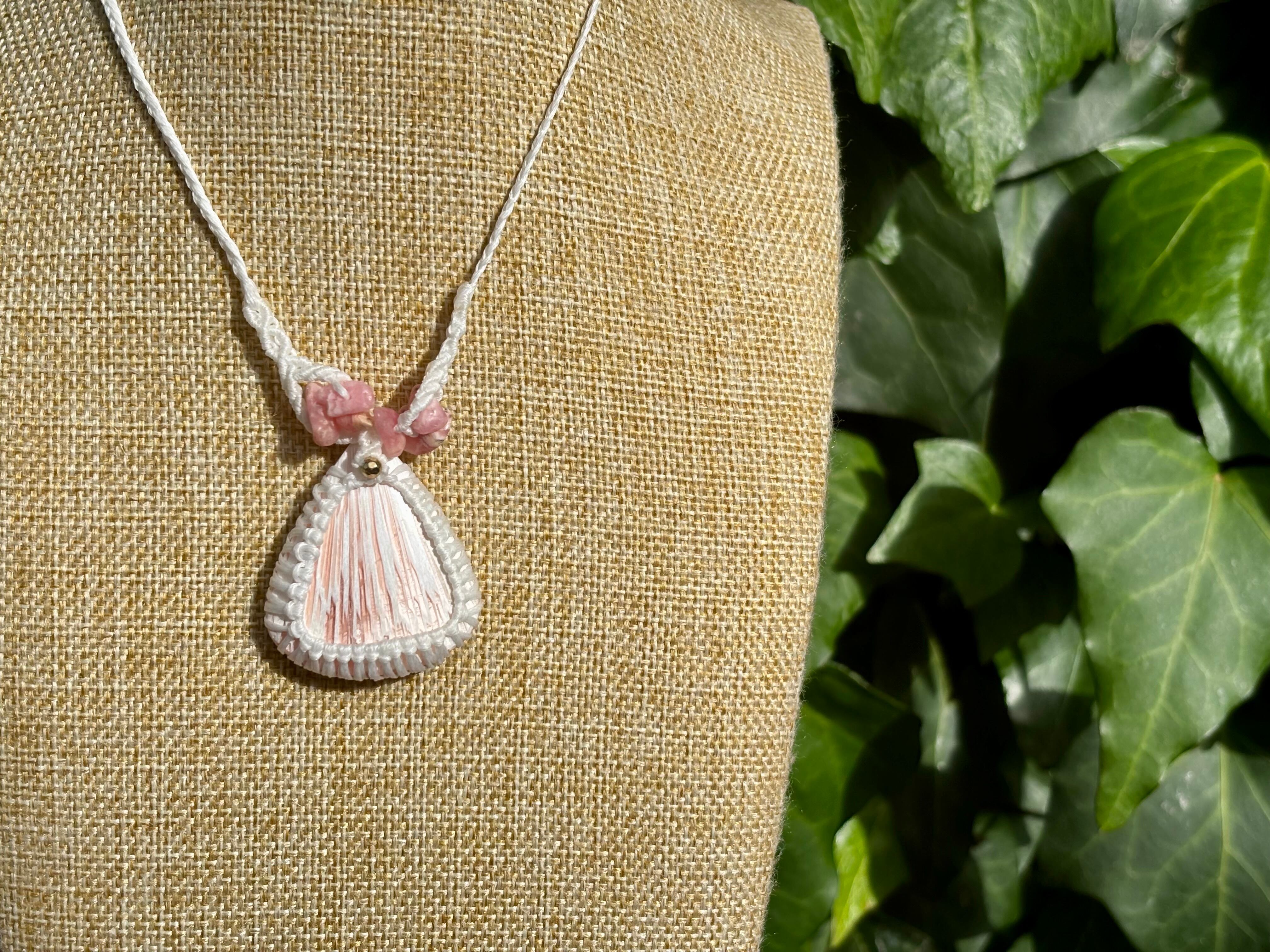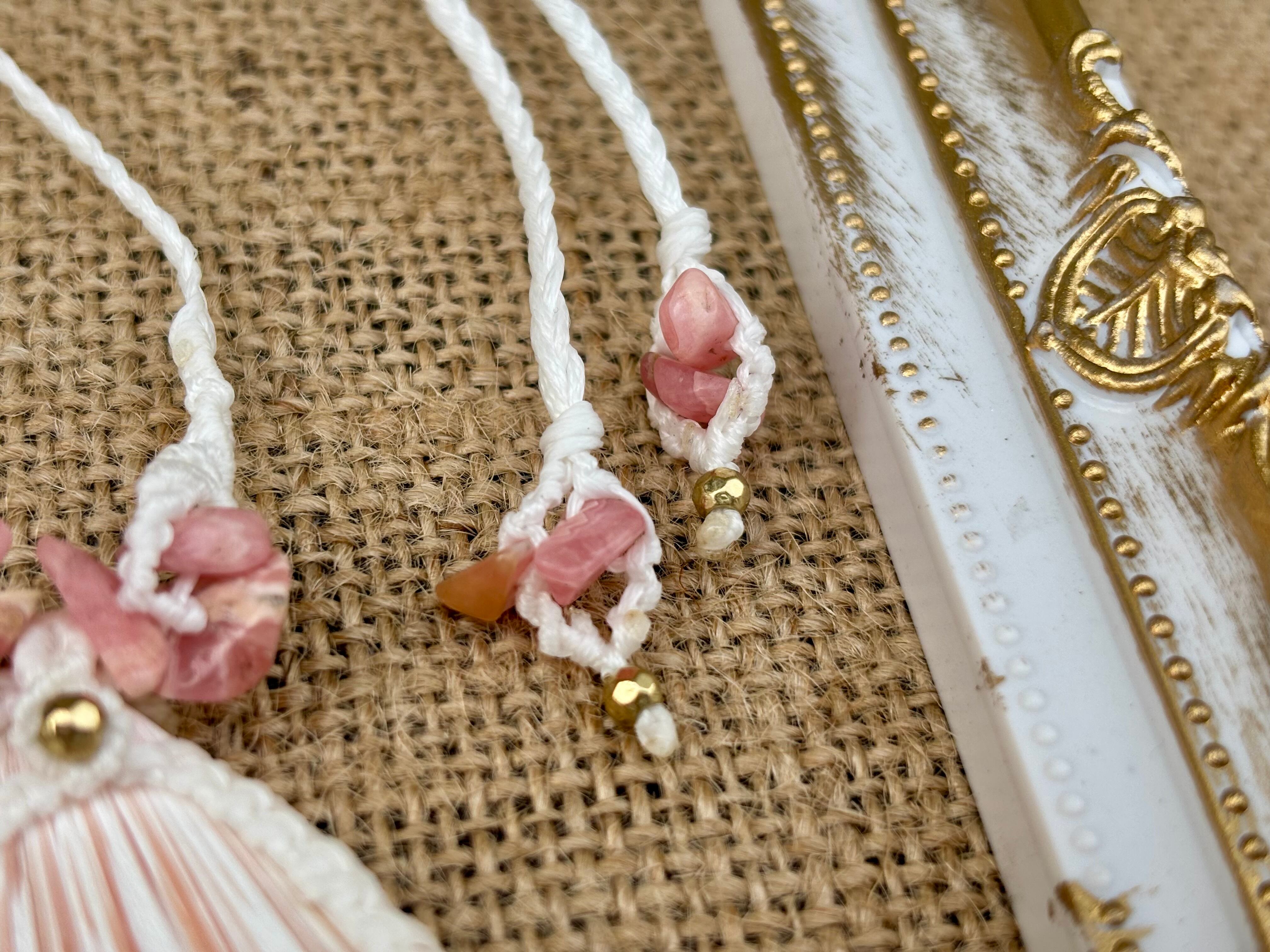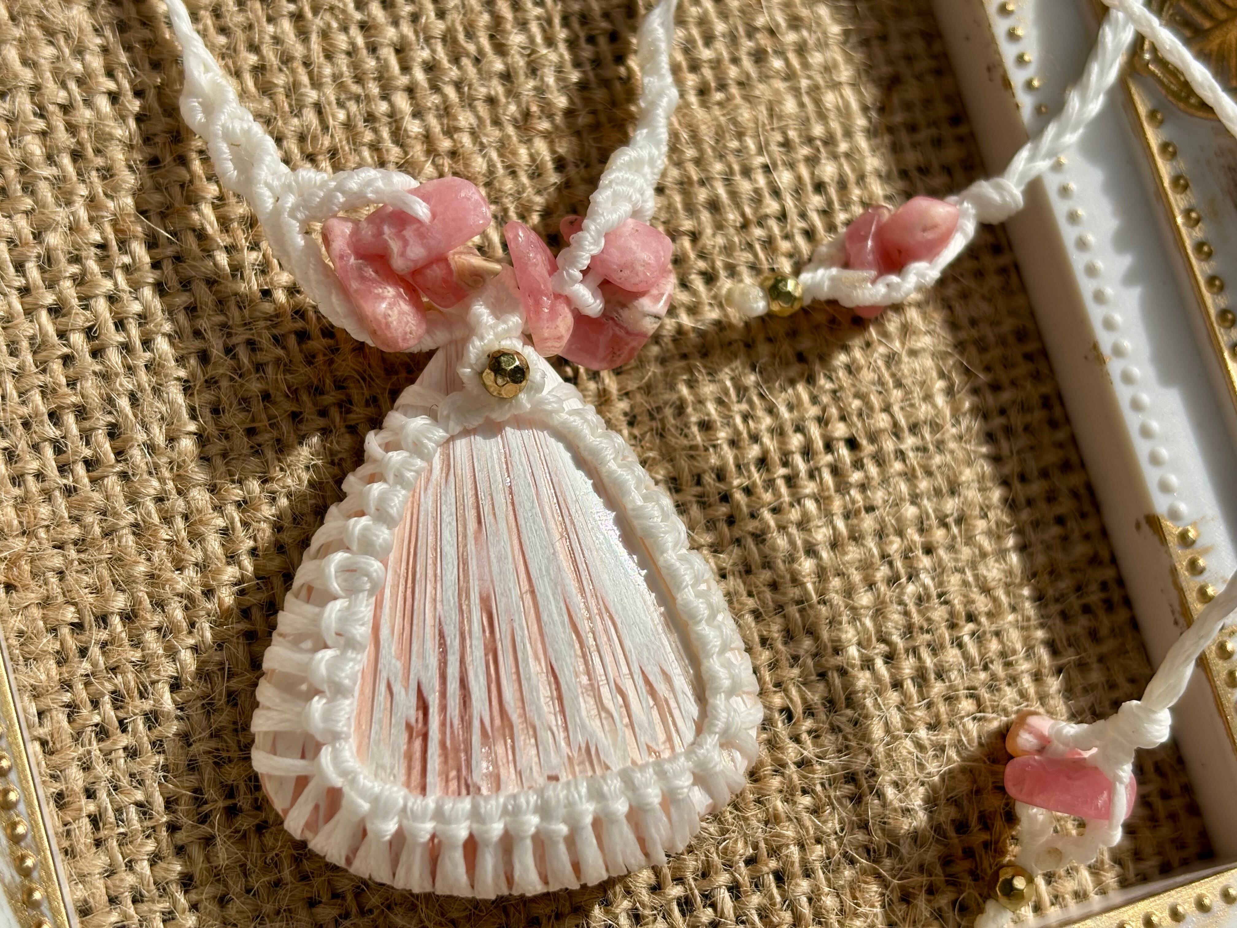 そんな美しいスコレサイトとインカローズを組み合わせた一点物のマクラメ編みネックレスです。スコレサイトは心を穏やかにし、インカローズは愛と情熱を象徴する石と言われています。この特別なネックレスは、手編みの上品なスタイルで、あなた自身の魅力を引き立てる素敵なアクセサリーとなります。日常使いから特別な日まで、幅広いシーンで活躍すること間違いなしです。