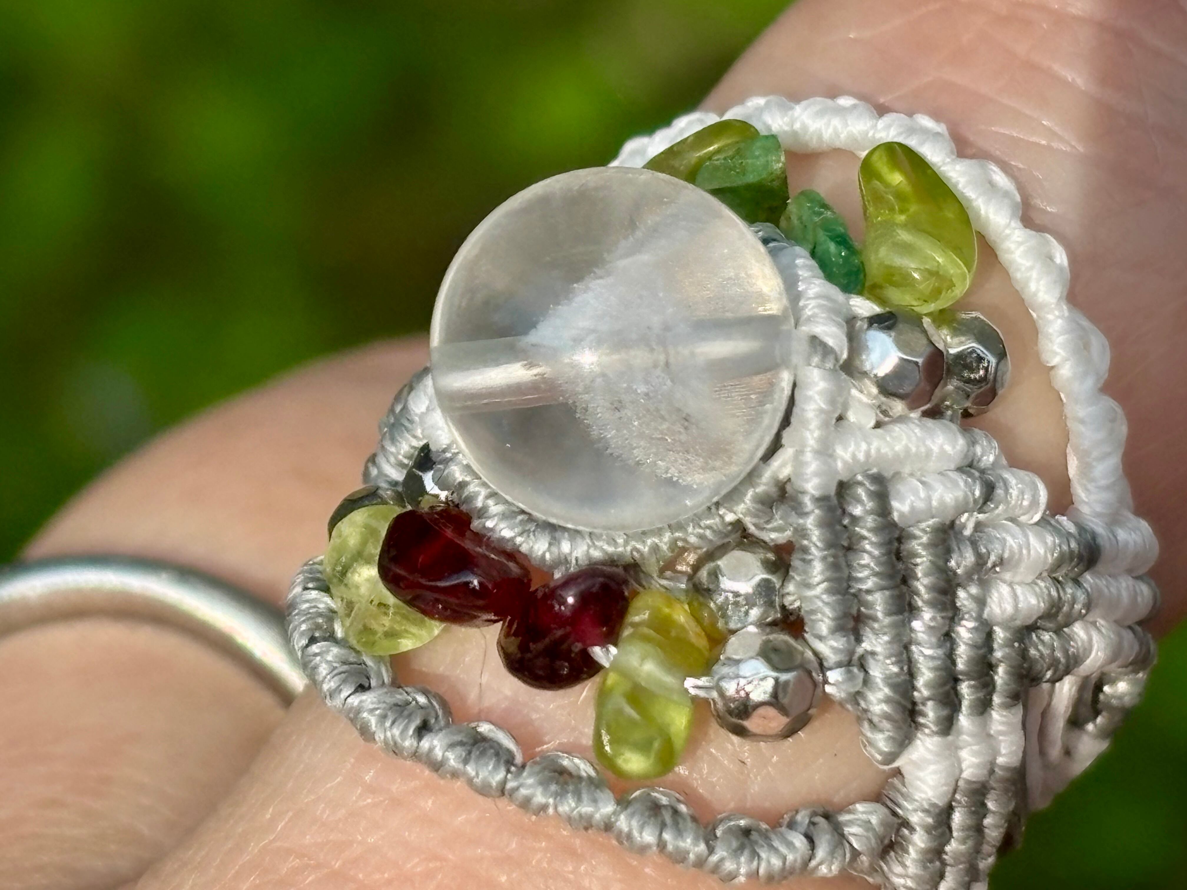 #601 透明度☆レーザーファントムクォーツ一点物 (レーザーファントムクォーツ×エメラルド×ガーネット×ペリドット マクラメ編みリング/指輪)