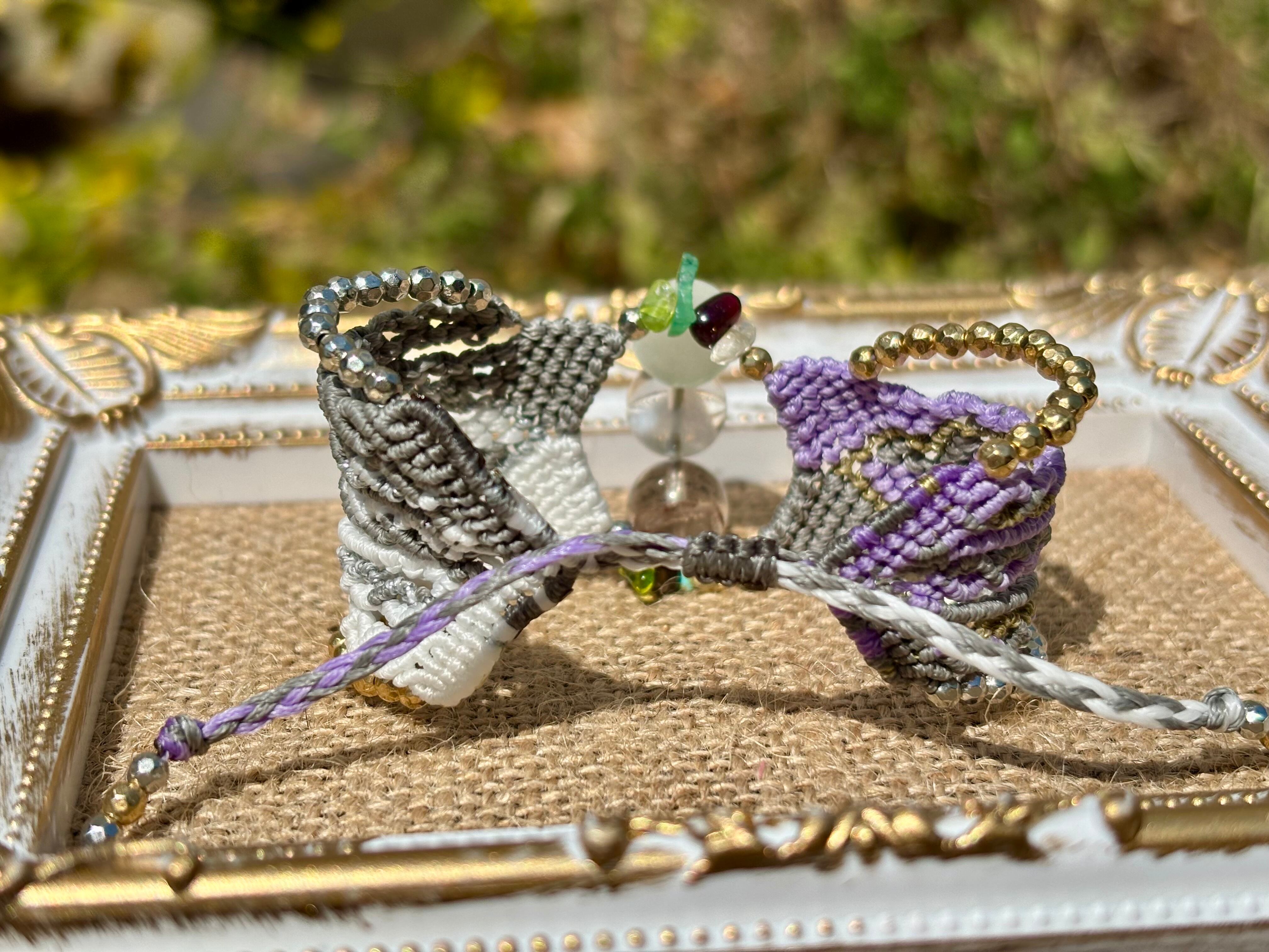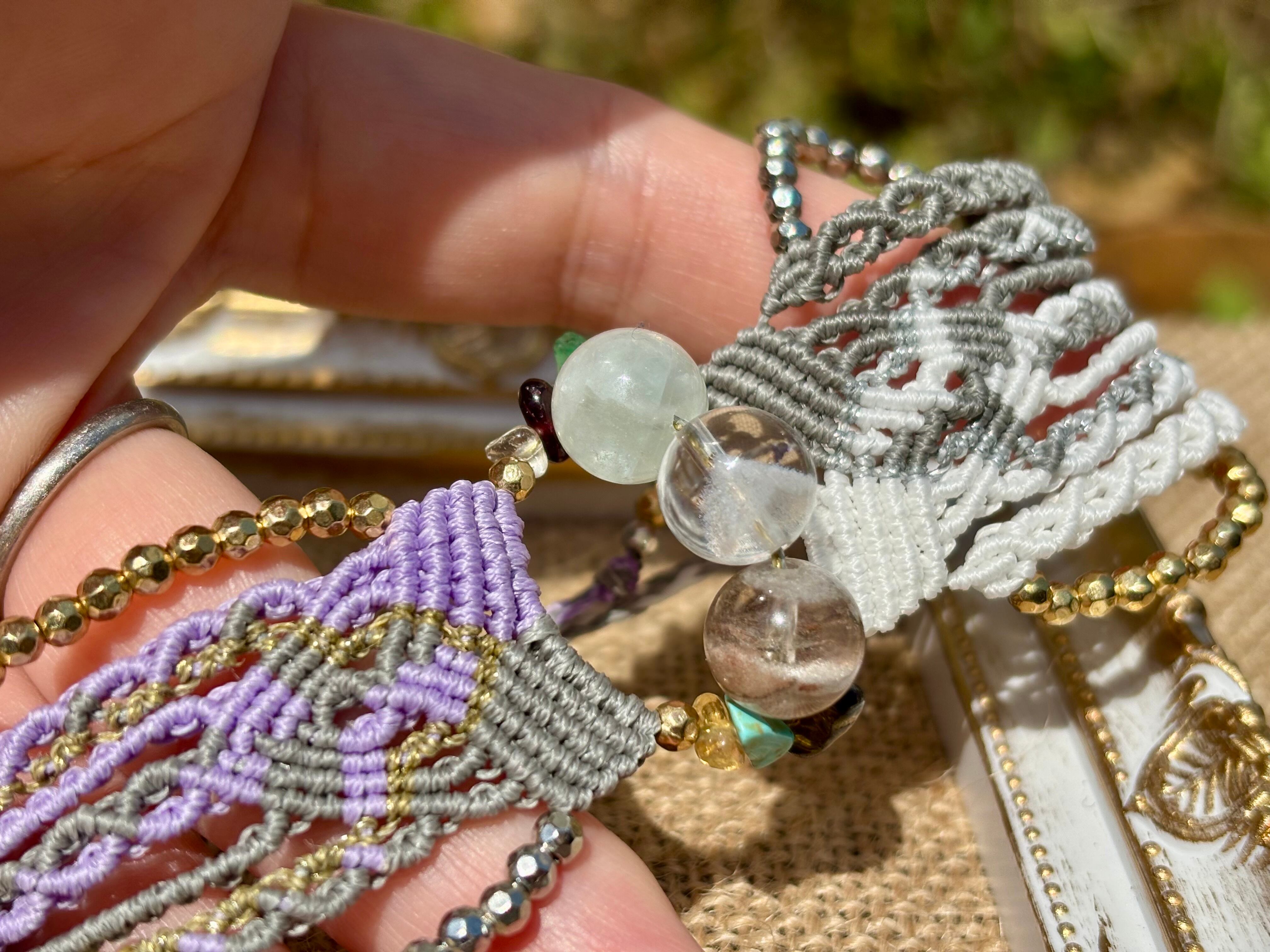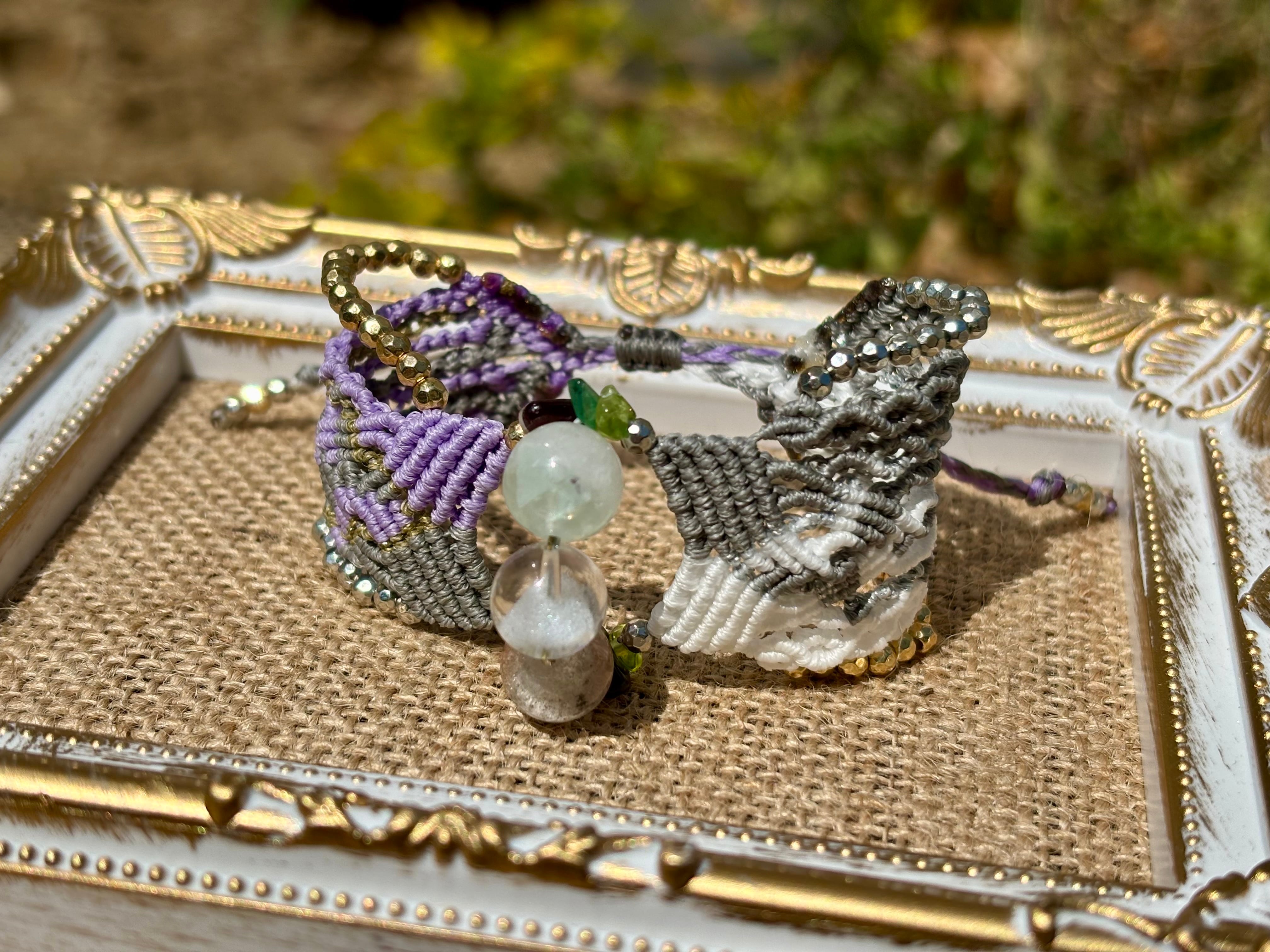 この World Heritage Ayuttaya 一点物マクラメ編みブレスレット。レーザーファントムクォーツ、フローライトインクォーツ、ガーデンクォーツという貴重な天然石を贅沢に使用した、美しいブレスレットです。 さざれ石にはガーネット、ターコイズ、シトリン、ペリドット、スモーキークォーツ、エンジェルの各石の力を借りて、身につける方に癒しや幸運をもたらすと言われています。翼をイメージしたマクラメ編みの技法で丁寧に作られたブレスレットは、存在感がありながらも軽やかで、日常のおしゃれにぴったりです。美しい色合いと繊細なデザインが、あなたの手元を華やかに彩ります。