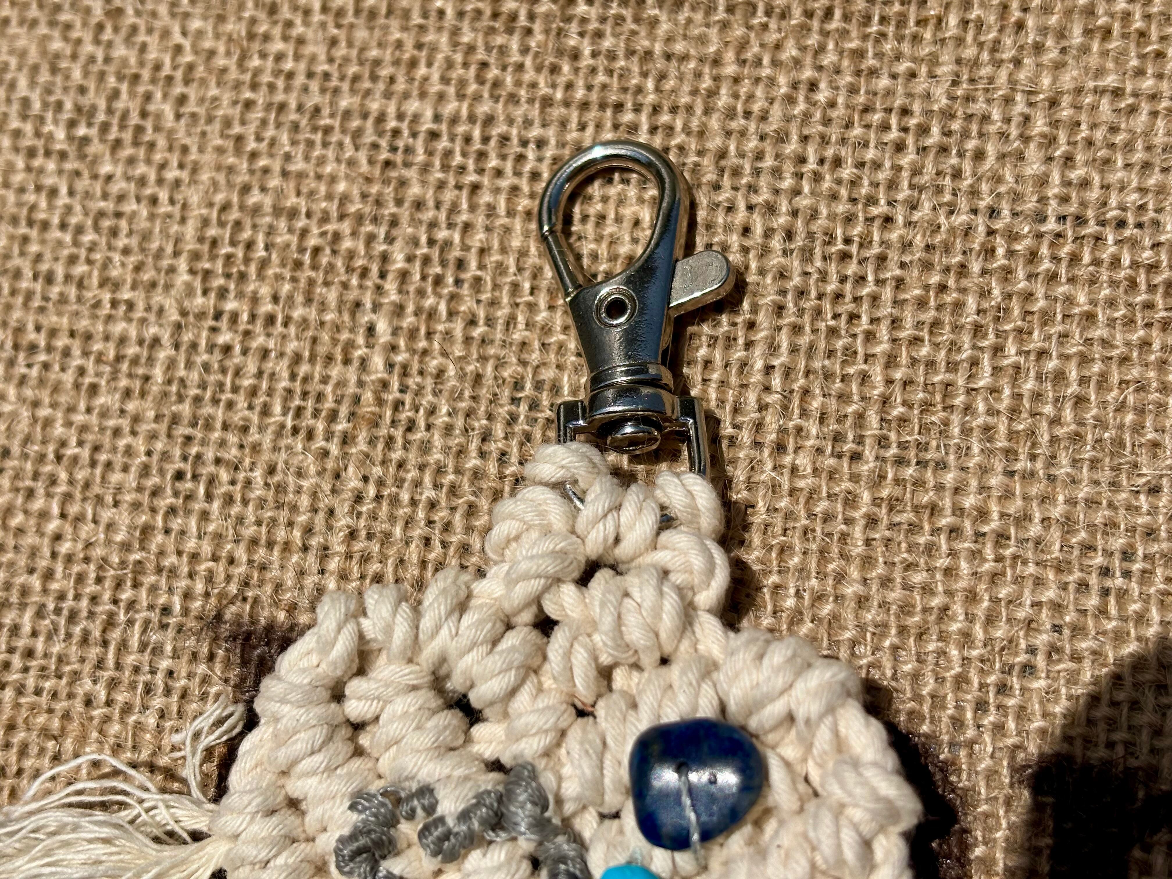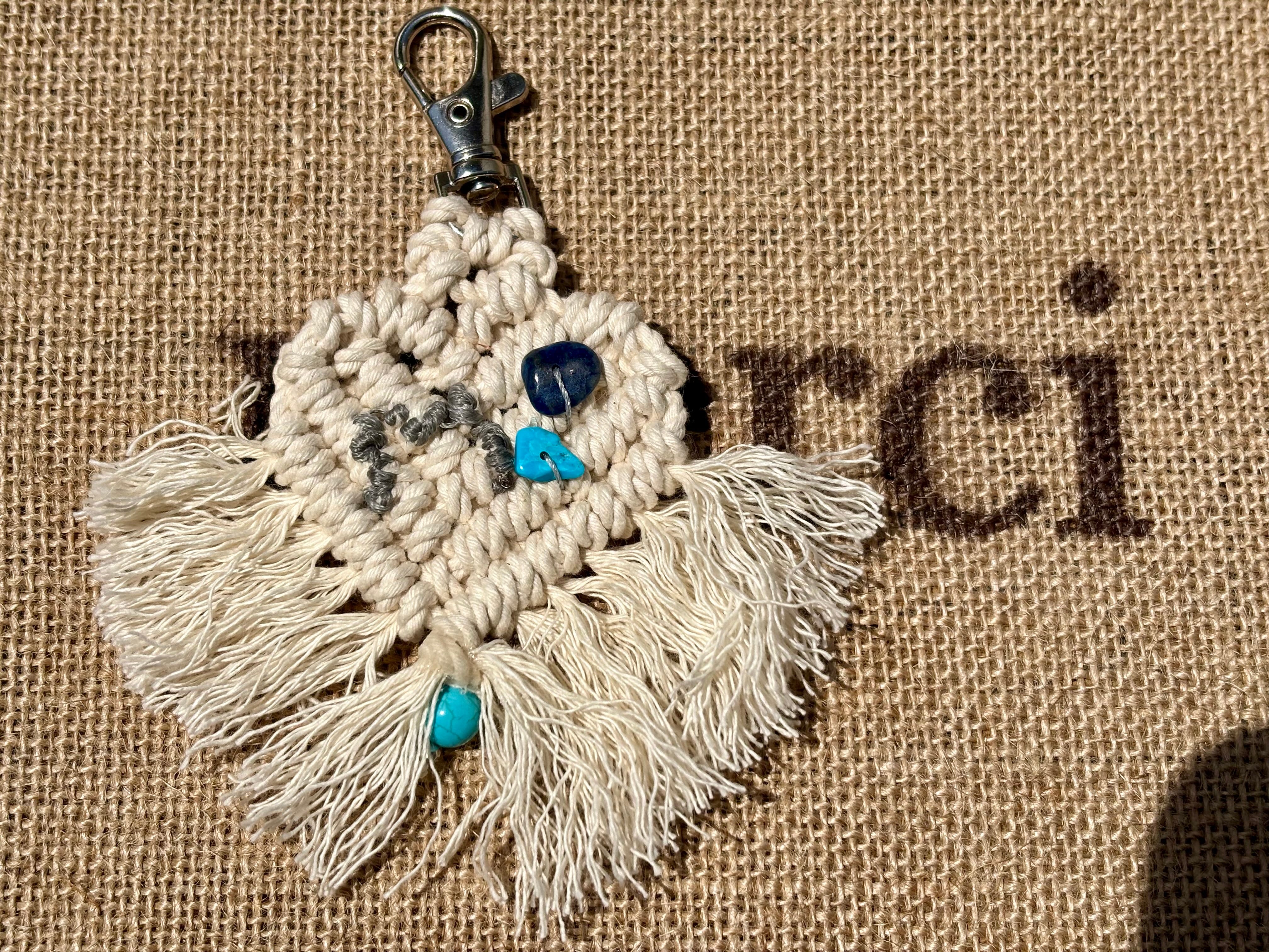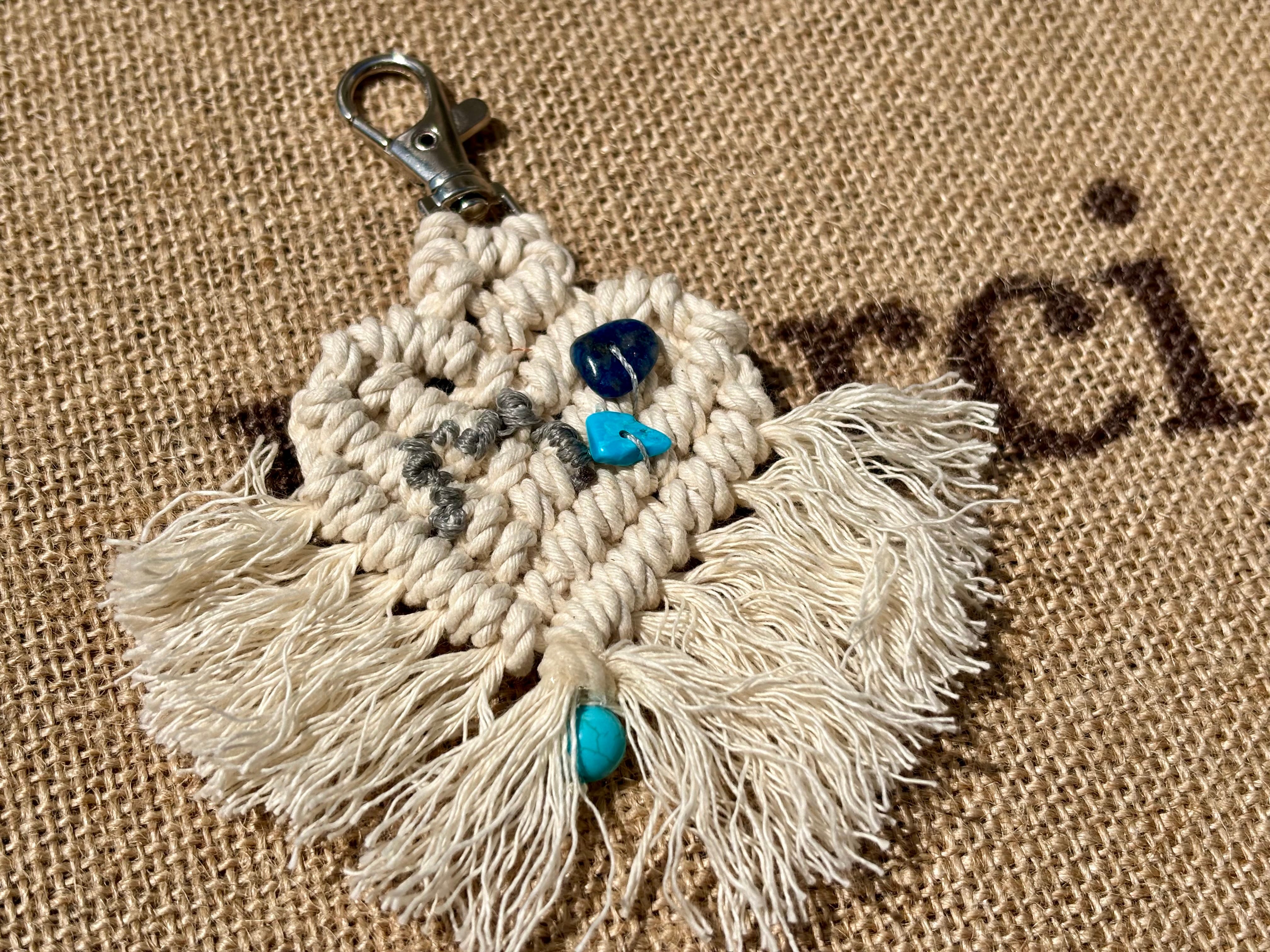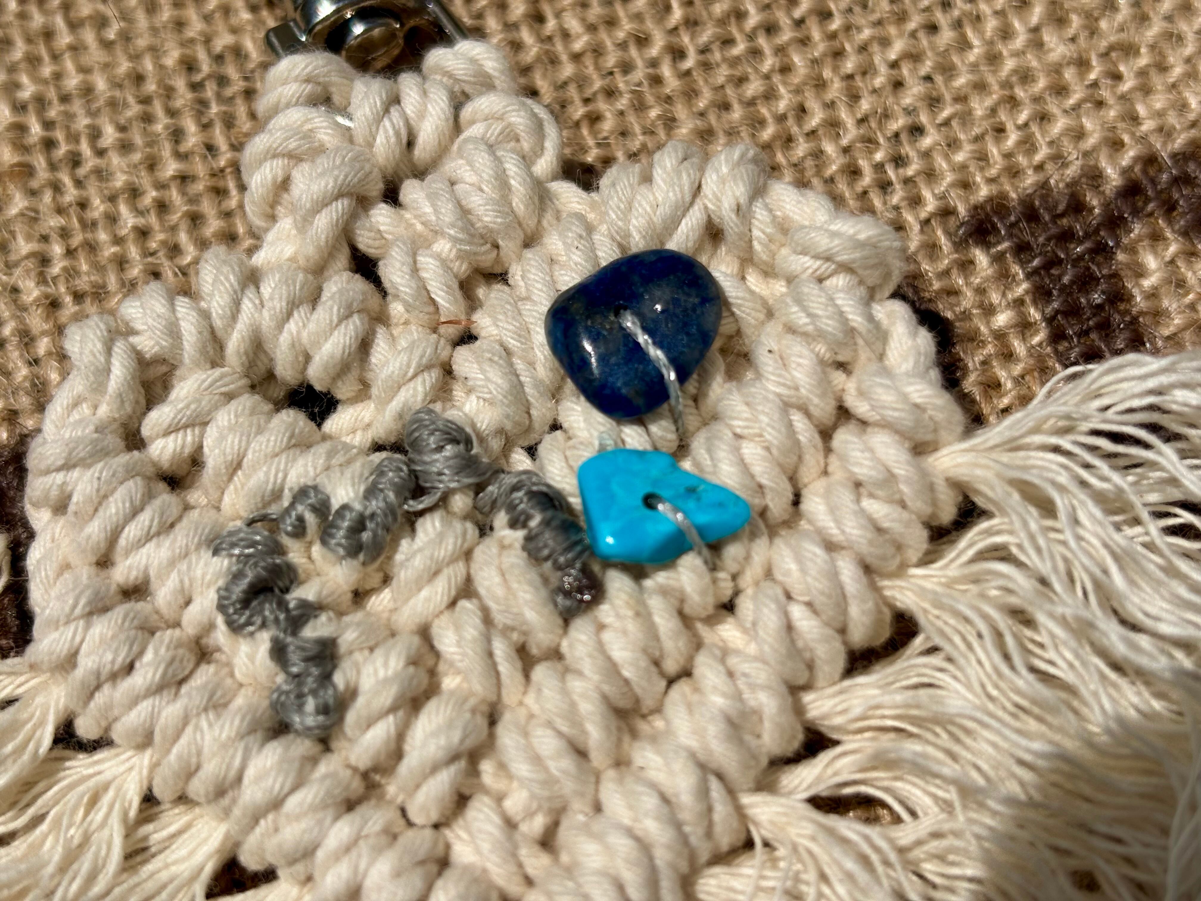 ターコイズとラピスラズリを使用した一点物のマクラメ編みチャーム兼キーホルダーです。
