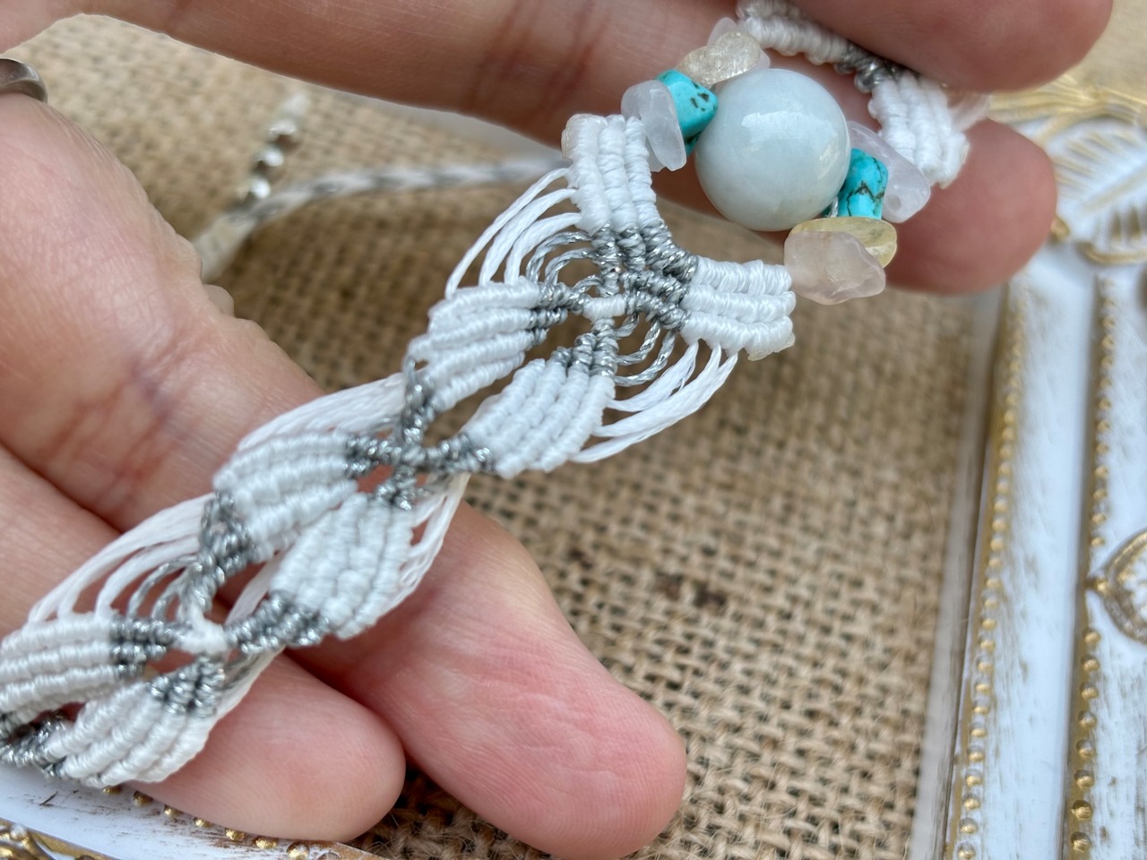 タイのアユタヤからインスパイアを受けたこのブレスレットは、天然石の美しさとマクラメ編みの技術が見事に融合しています。一つ一つの石の色合いが、手首に華やかさを加え、まるで文化遺産のような特別な魅力を持っています。個性的なデザインは、日常のコーディネートに新しい風を吹き込み、自信を持ってお出かけできるアクセサリーに仕上がっています。