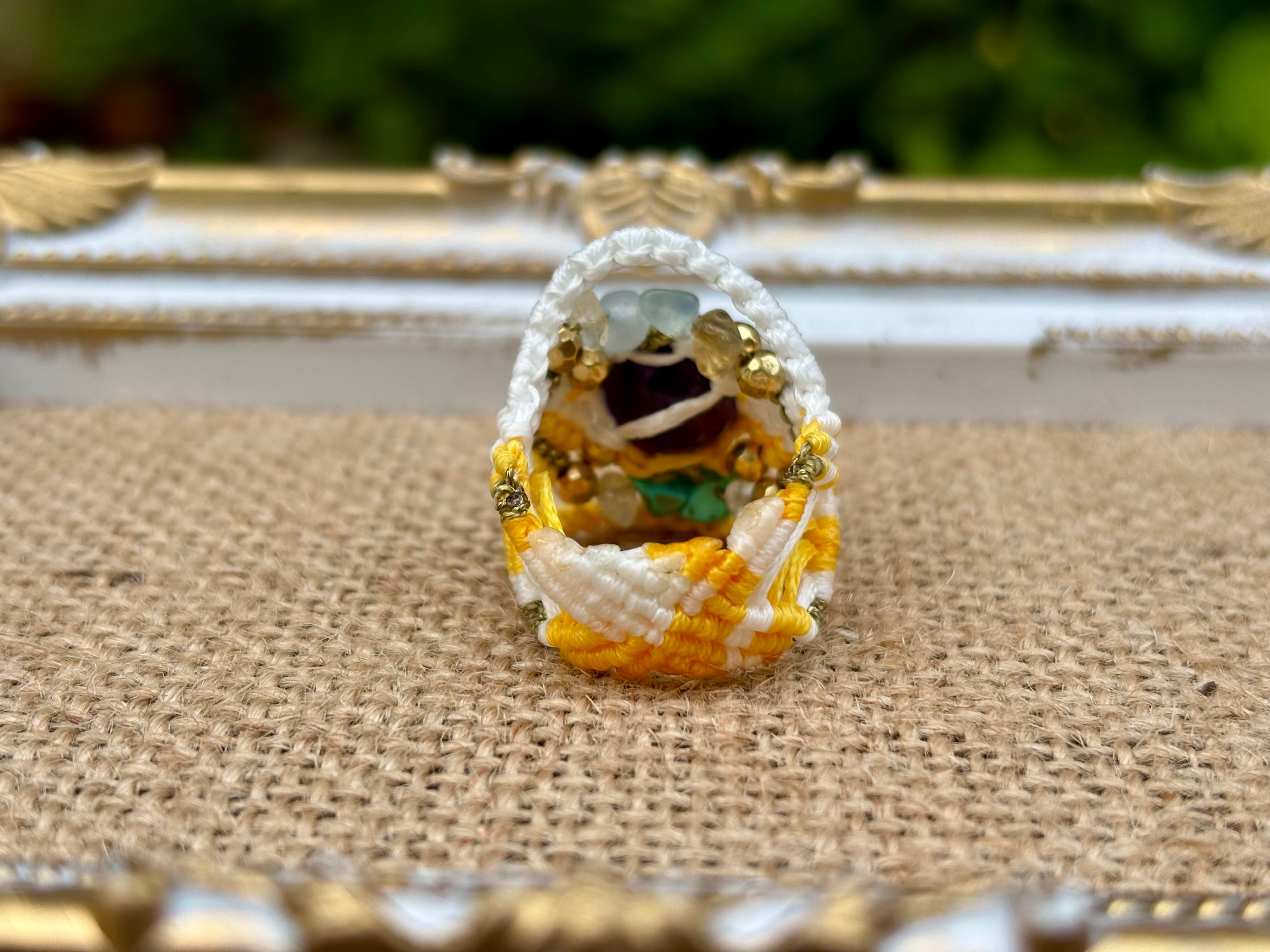 天然のアメジスト、ターコイズ、シトリン、アクアマリンを巧みに編み上げたこのリングは、タイのアユタヤからインスパイアを受けています。その独特なデザインとカラフルな石たちが、指元に神秘的な魅力を添えます。 この美しいリングは、日常のスタイルに特別なアクセントを加え、さらなる自信と機会をもたらすことでしょう。一つ一つ丁寧に手作りされたため、どこにもない唯一の存在感を楽しんでいただけます。