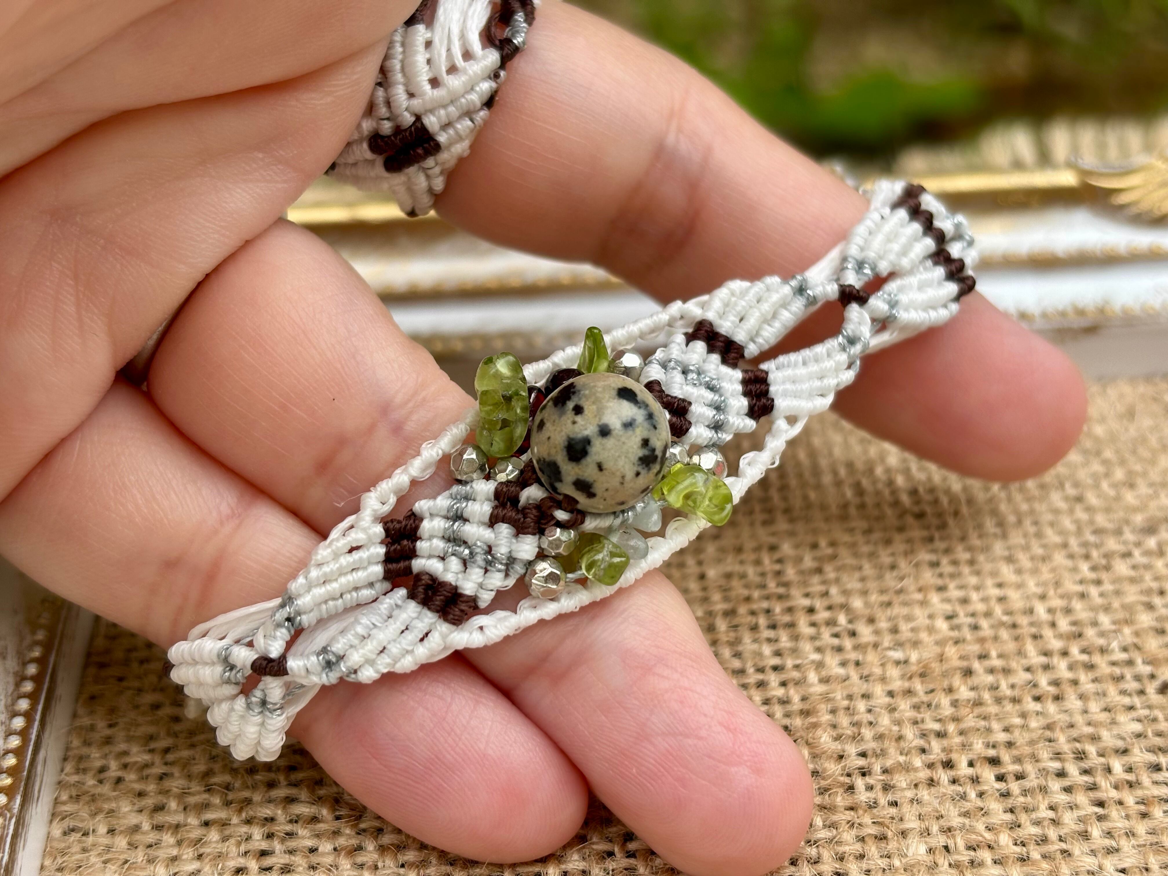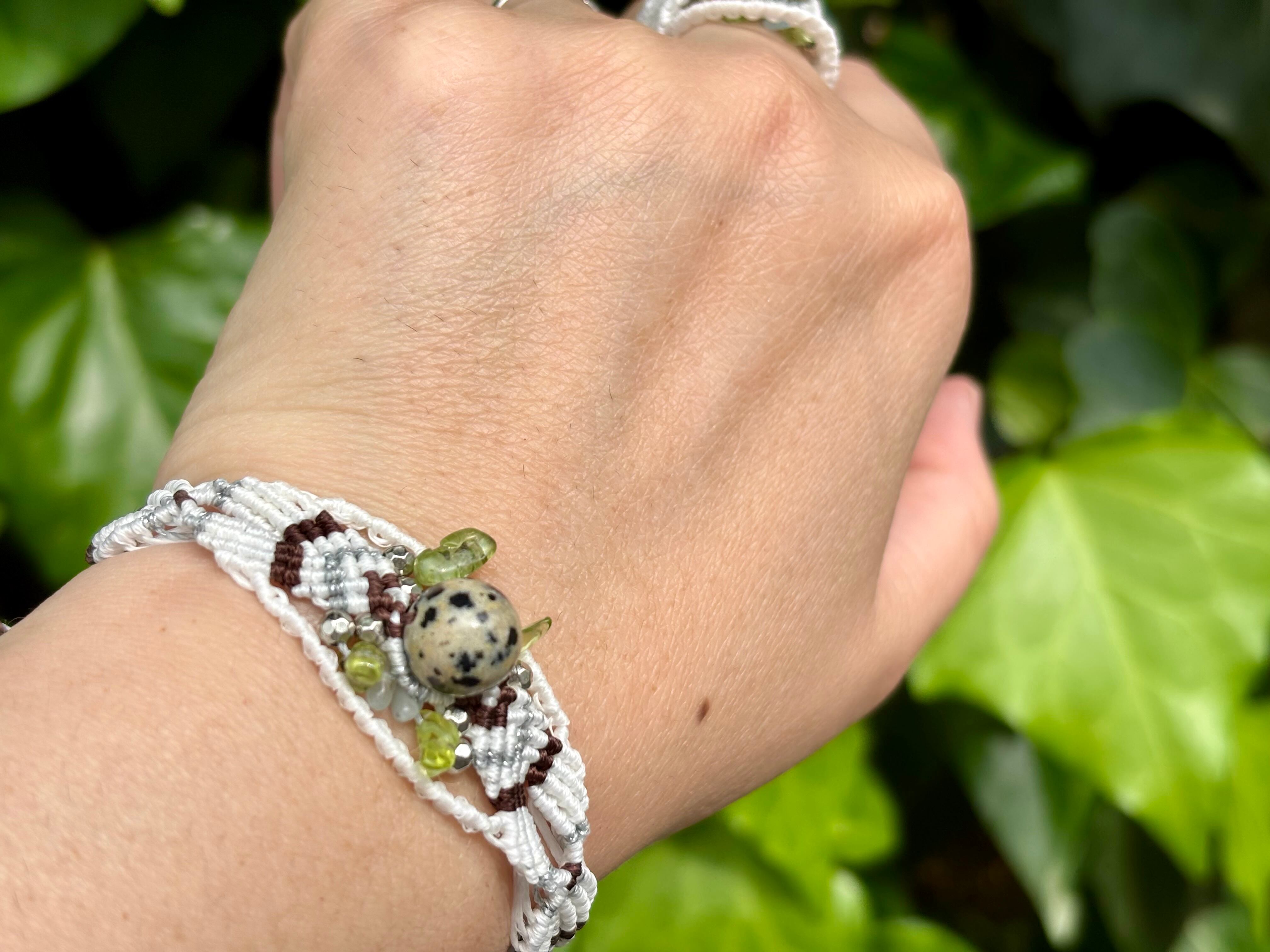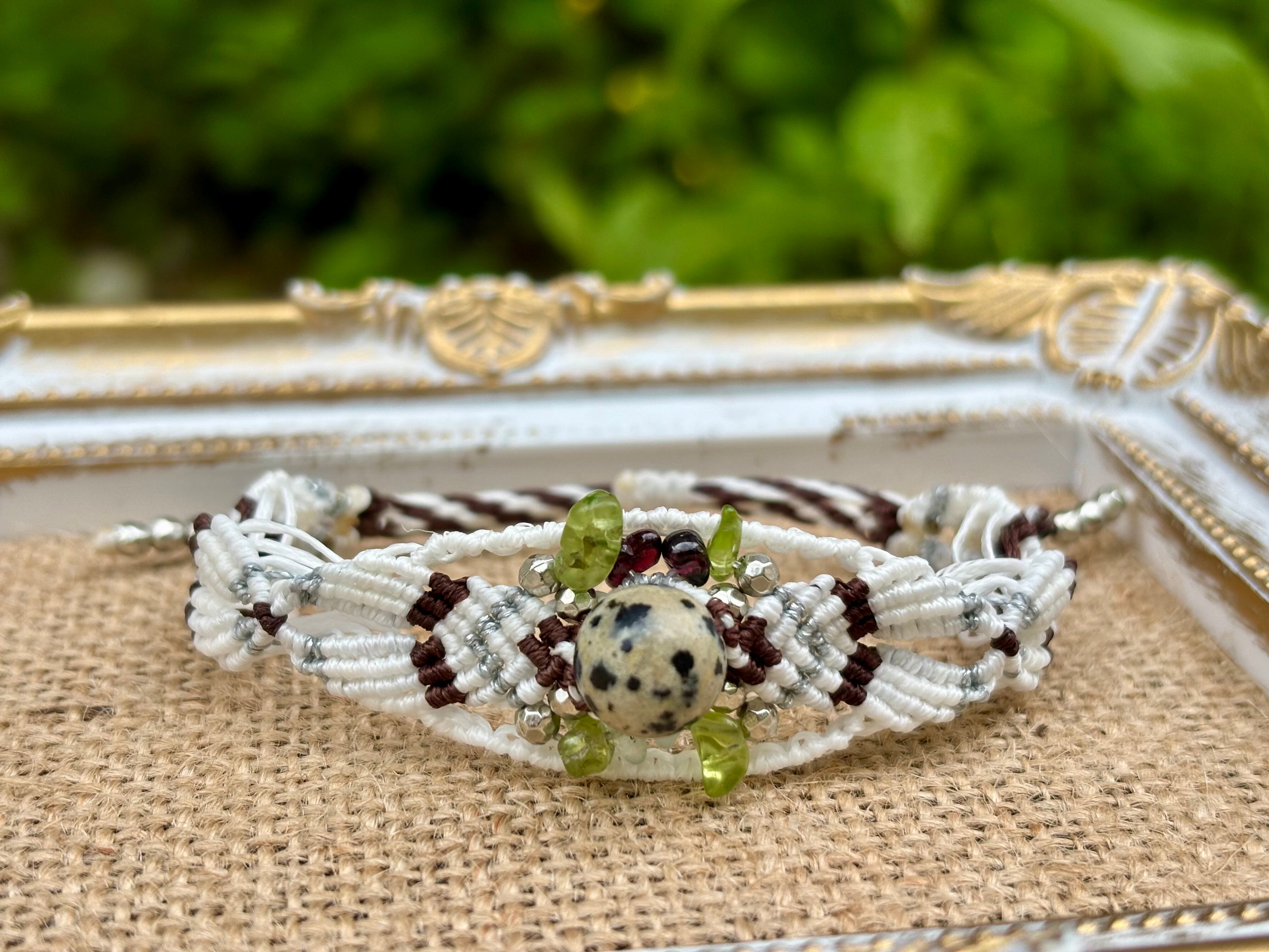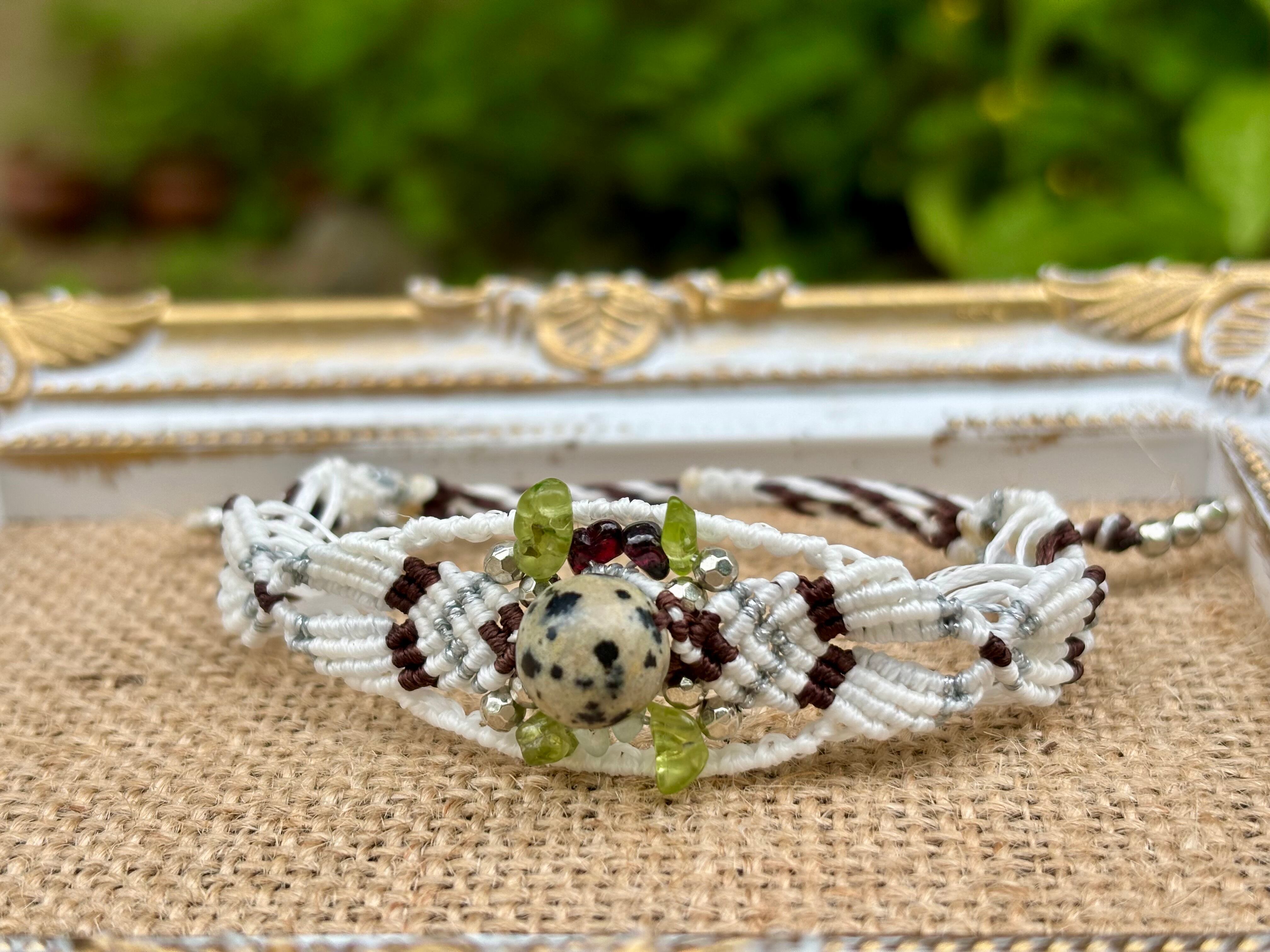 #649 World Heritage Ayuttaya (ダルメシアンジャスパー×ガーネット×ペリドット×アクアマリン マクラメ編みブレスレット)