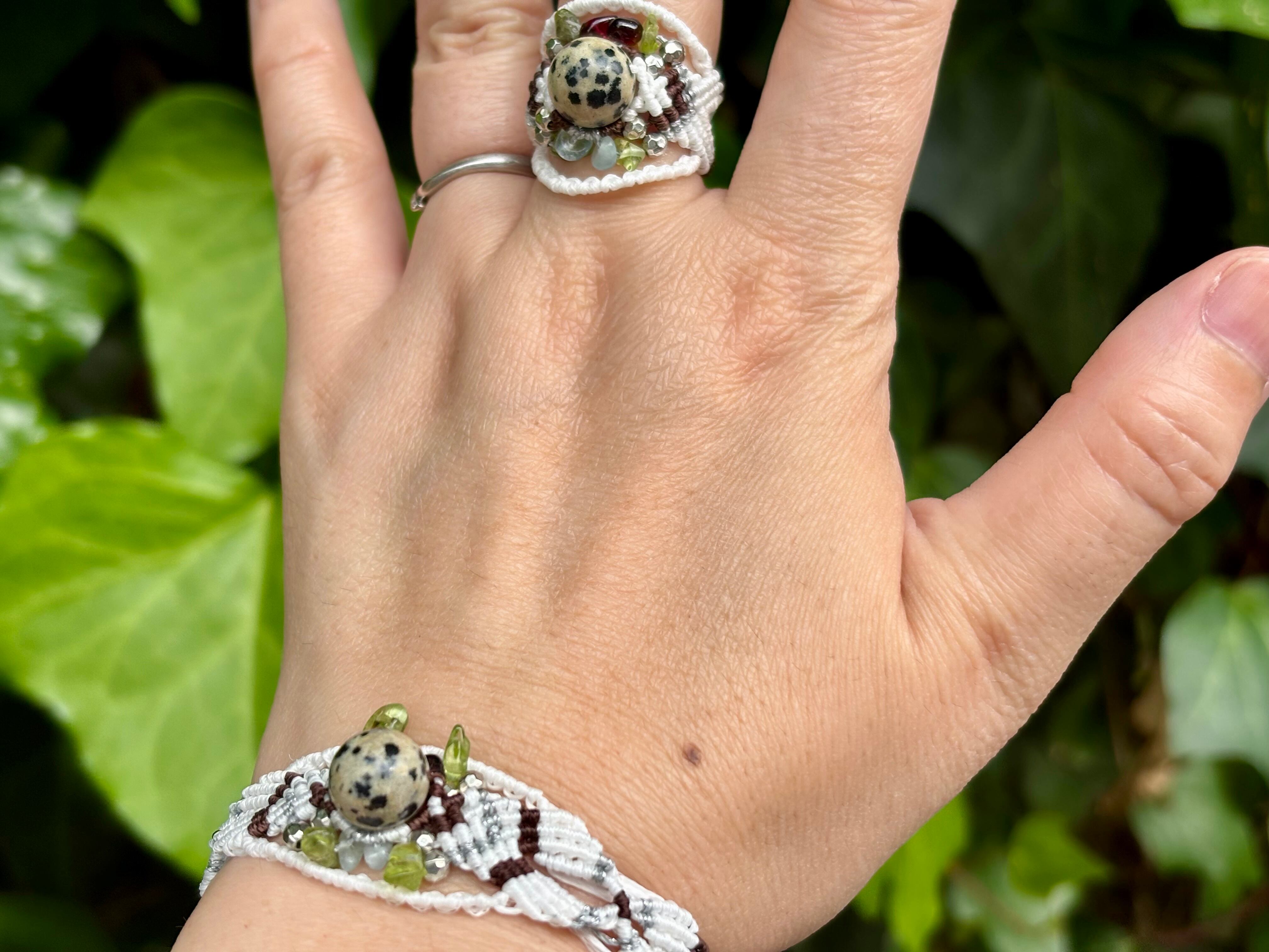 存在感が際立つ、天然のダルメシアンジャスパー、ガーネット、ペリドット、アクアマリンを巧みに編み上げたこのブレスは、タイのアユタヤからインスパイアを受けています。その独特なデザインとカラフルな石たちが、指元に神秘的な魅力を添えます。 この美しいブレスは、日常のスタイルに特別なアクセントを加え、さらなる自信と機会をもたらすことでしょう。一つ一つ丁寧に手作りされたため、どこにもない唯一の存在感を楽しんでいただけます。