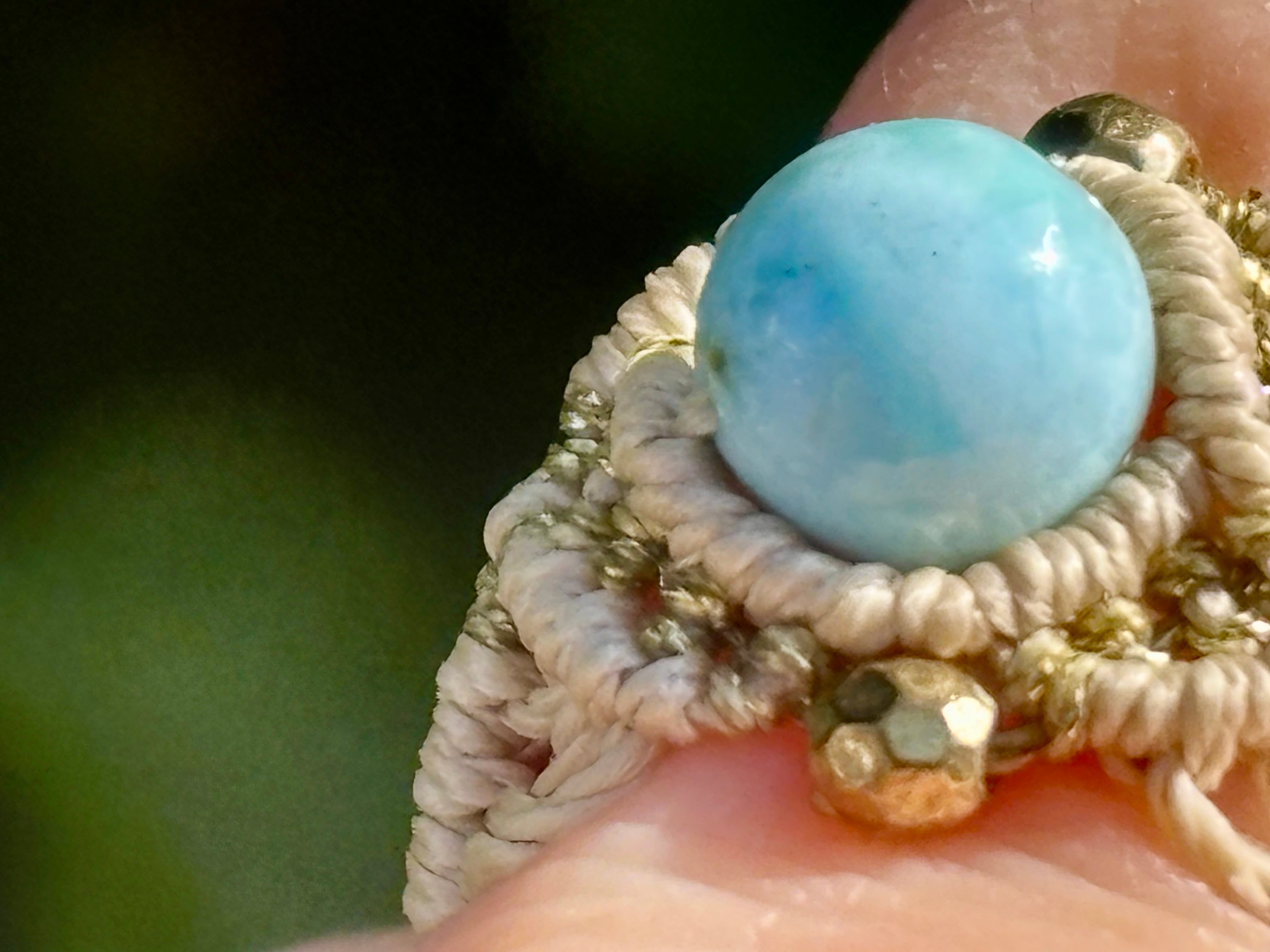 天然のラリマーが一粒、しっかりと編み込まれたマクラメリングは、シンプルながらも特別感を漂わせます。