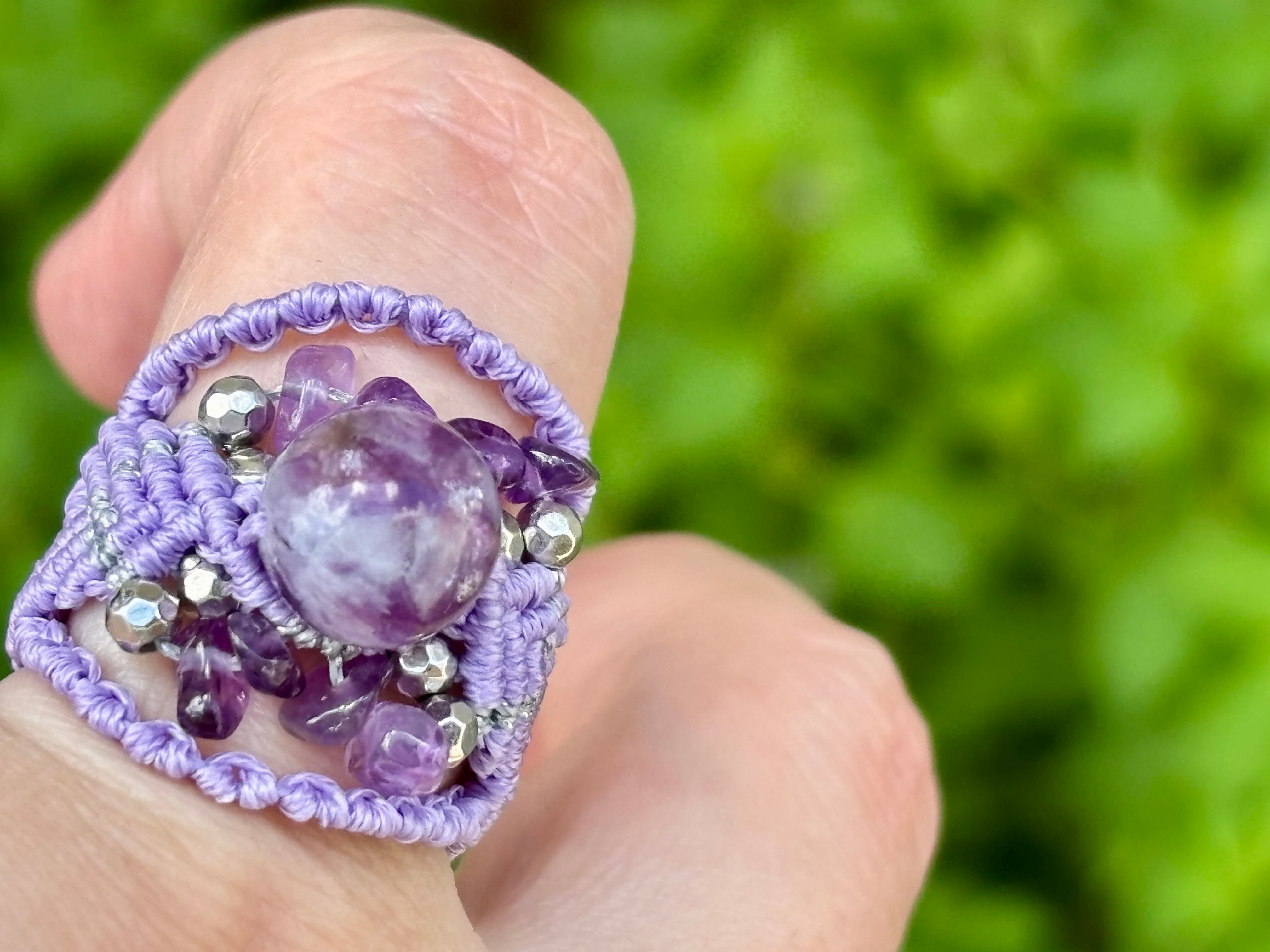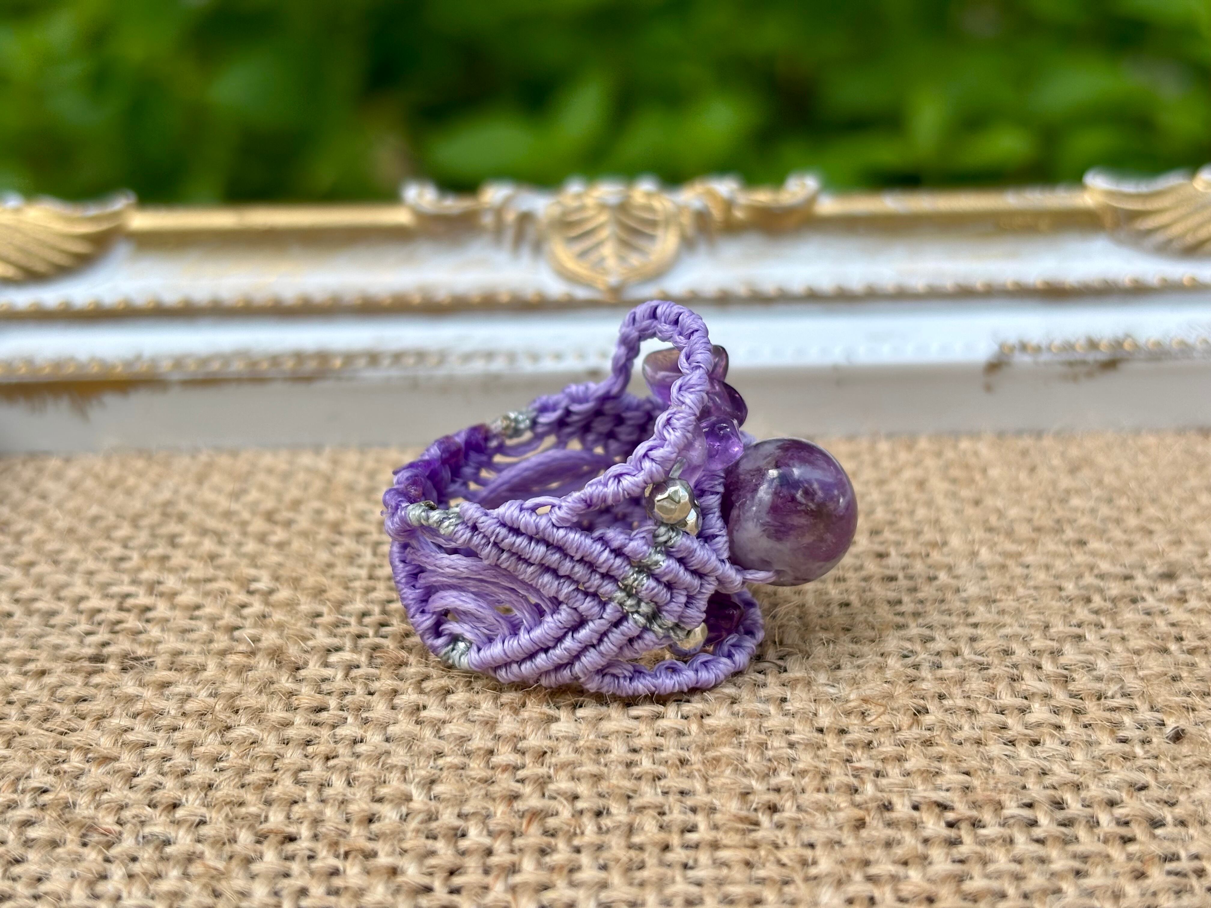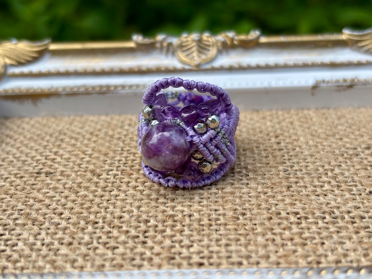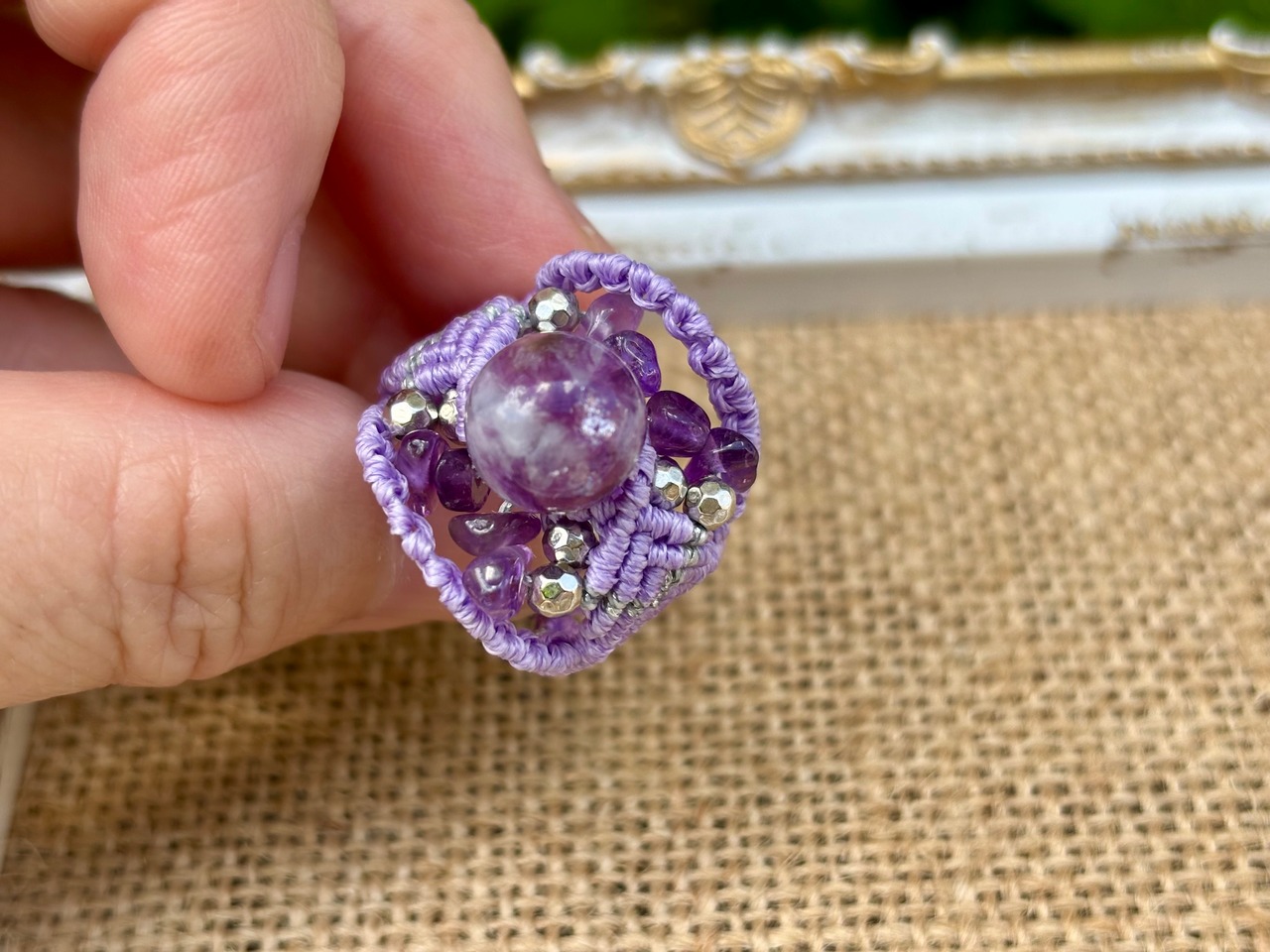 #713極上レピドライトシリカ5A! (レピドライトシリカ×アメジスト マクラメ編みリング/指輪)