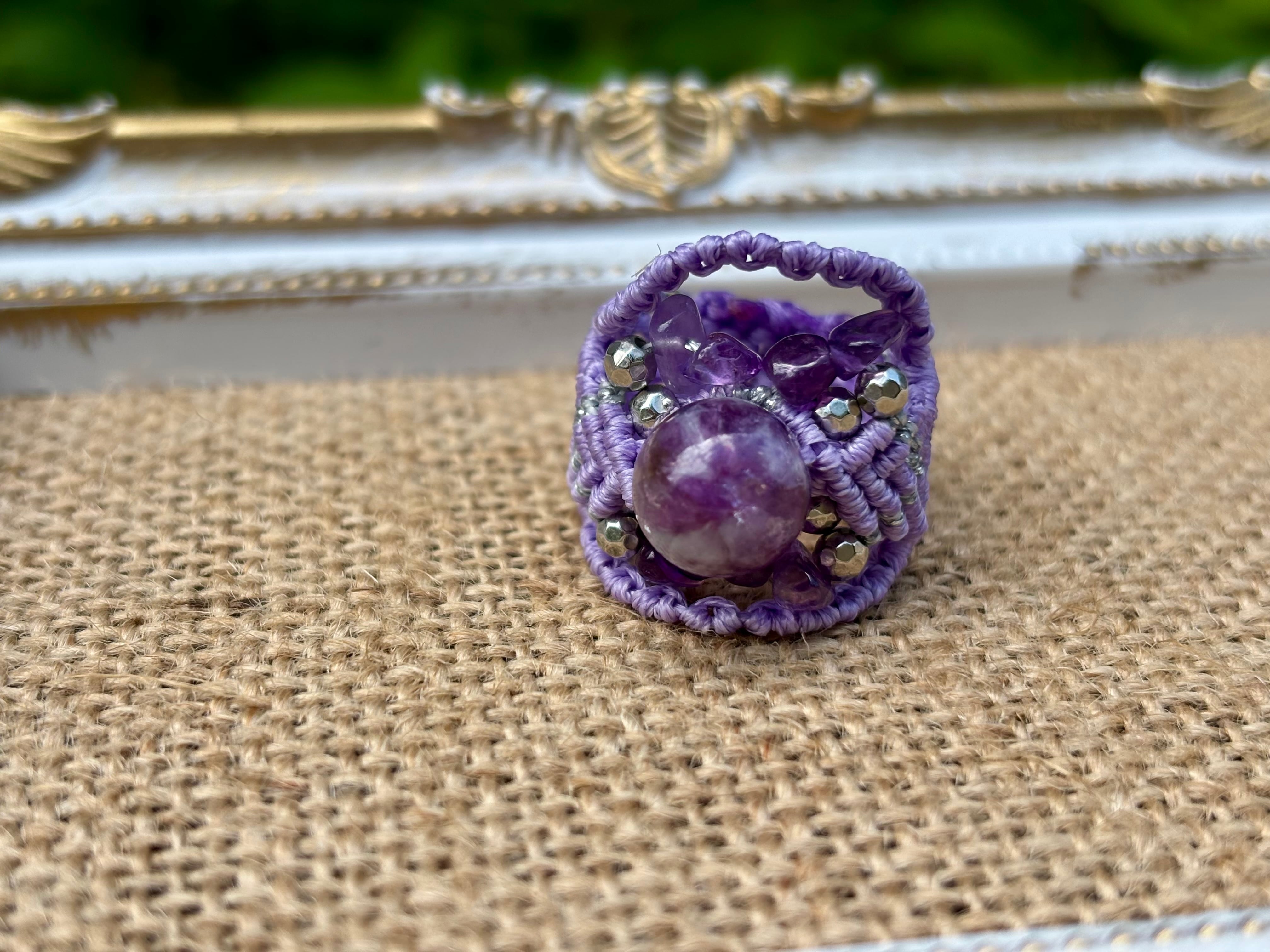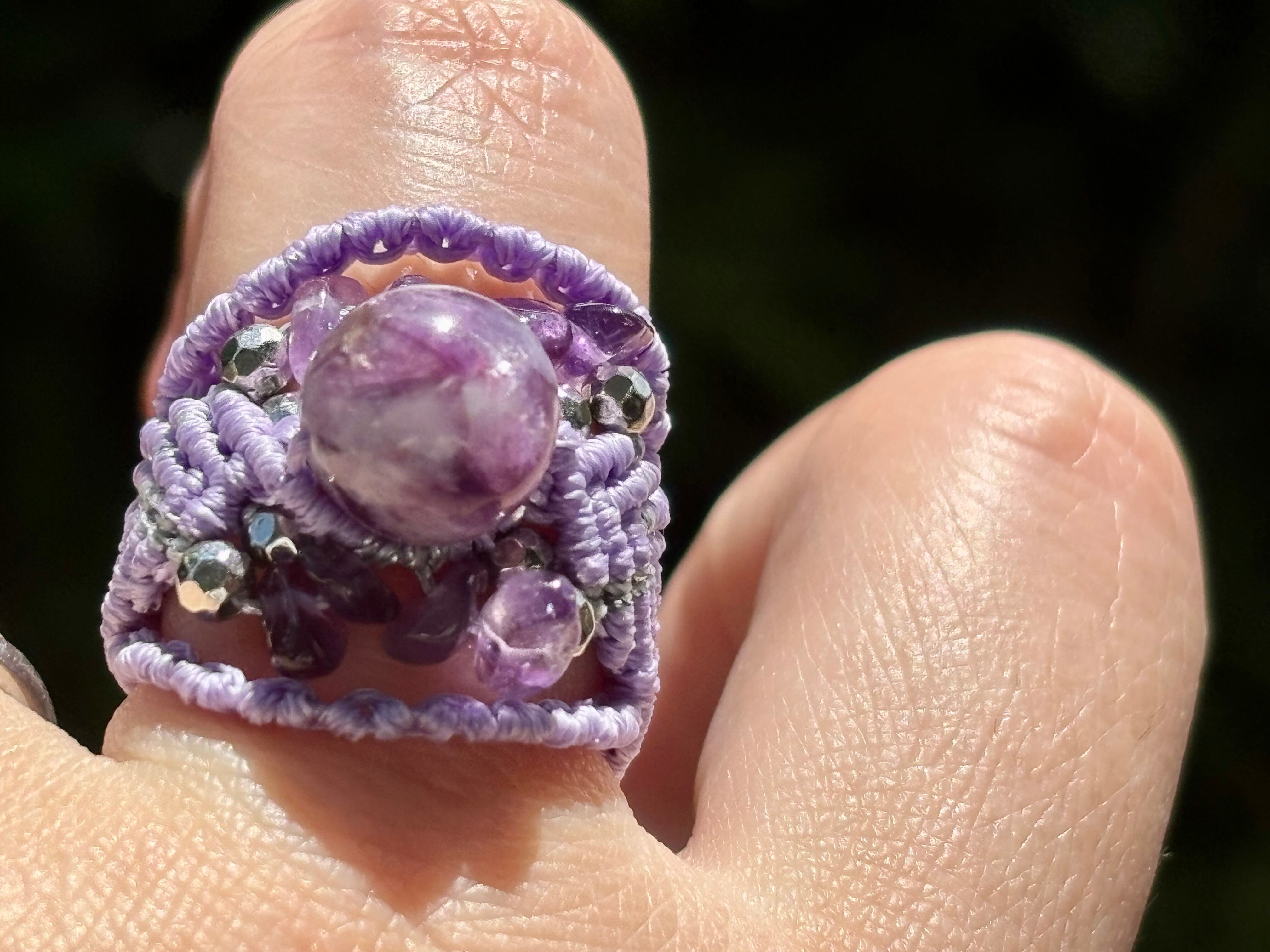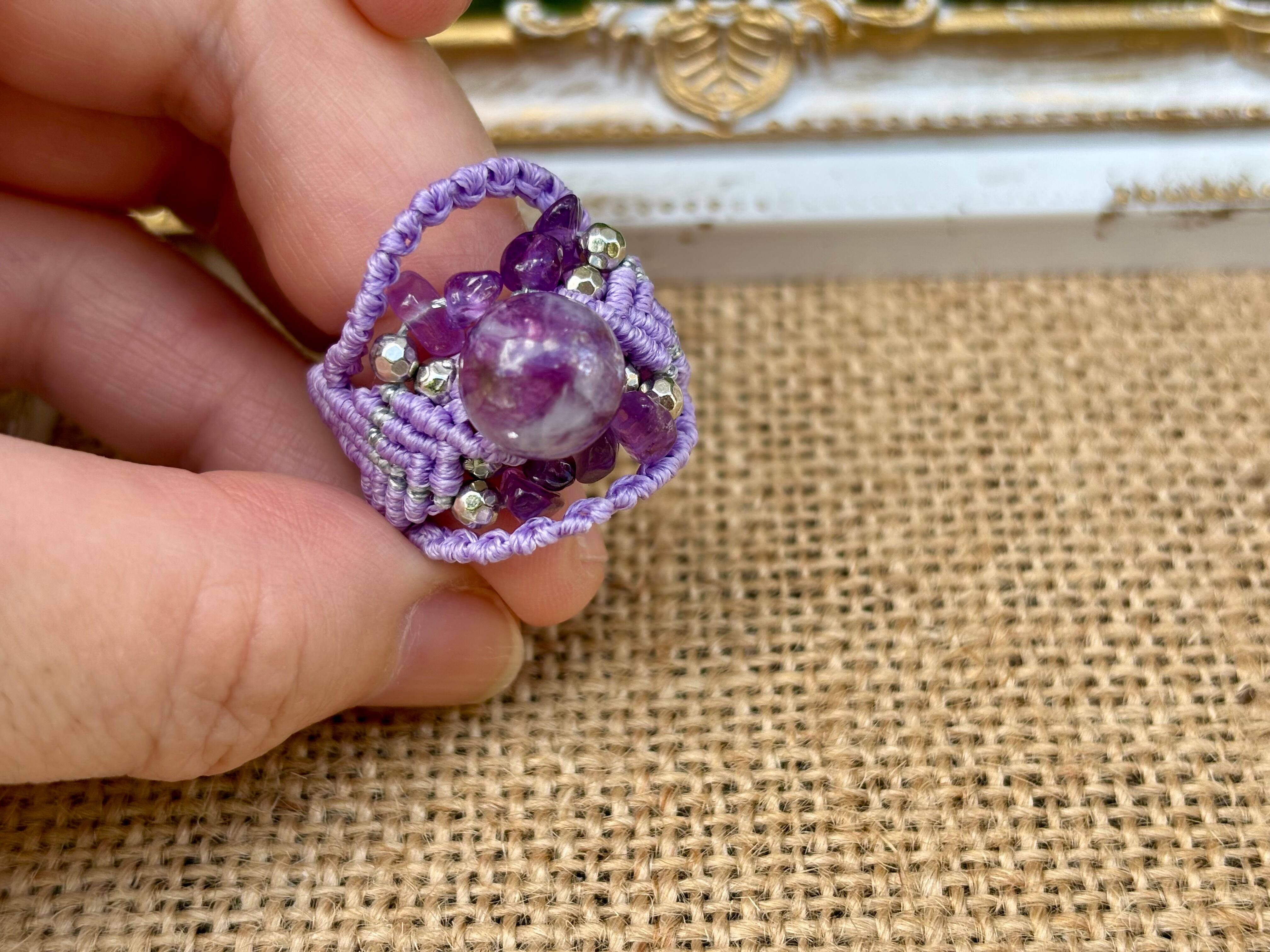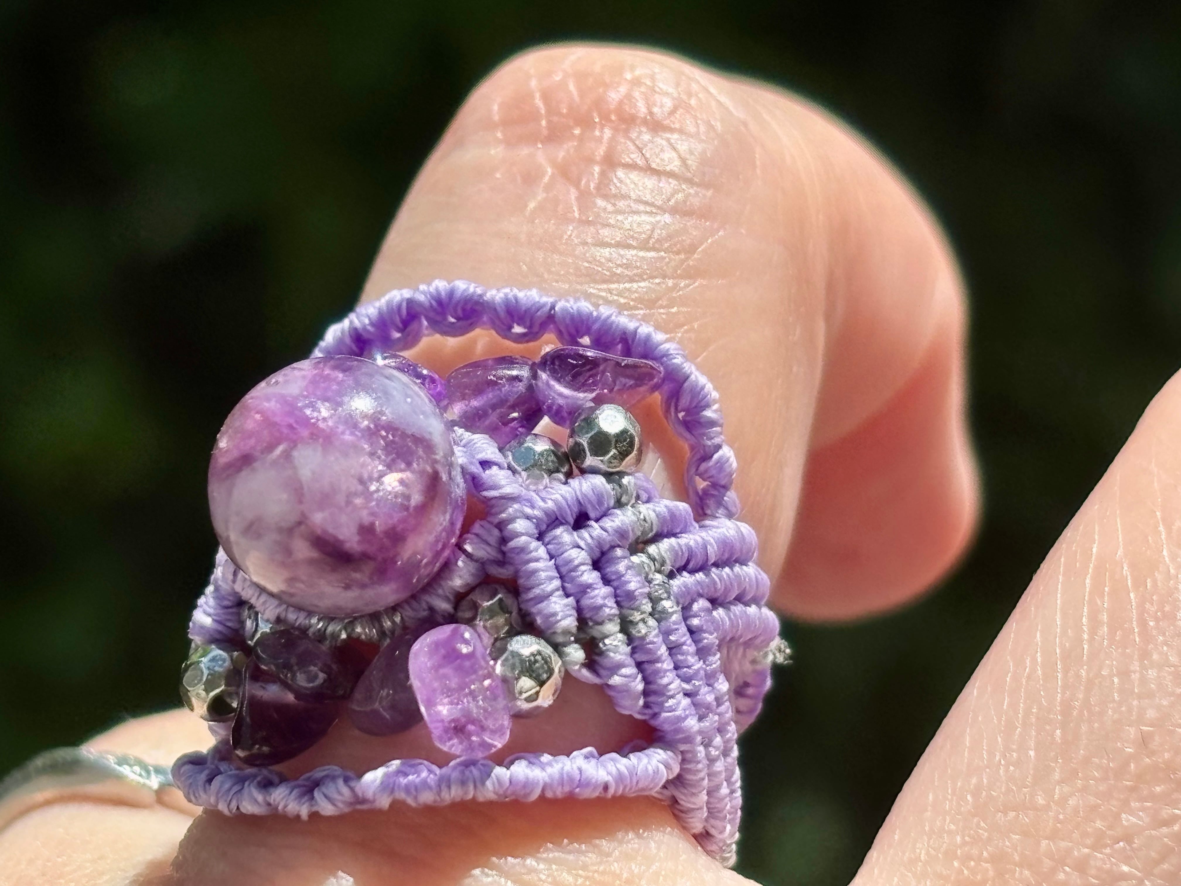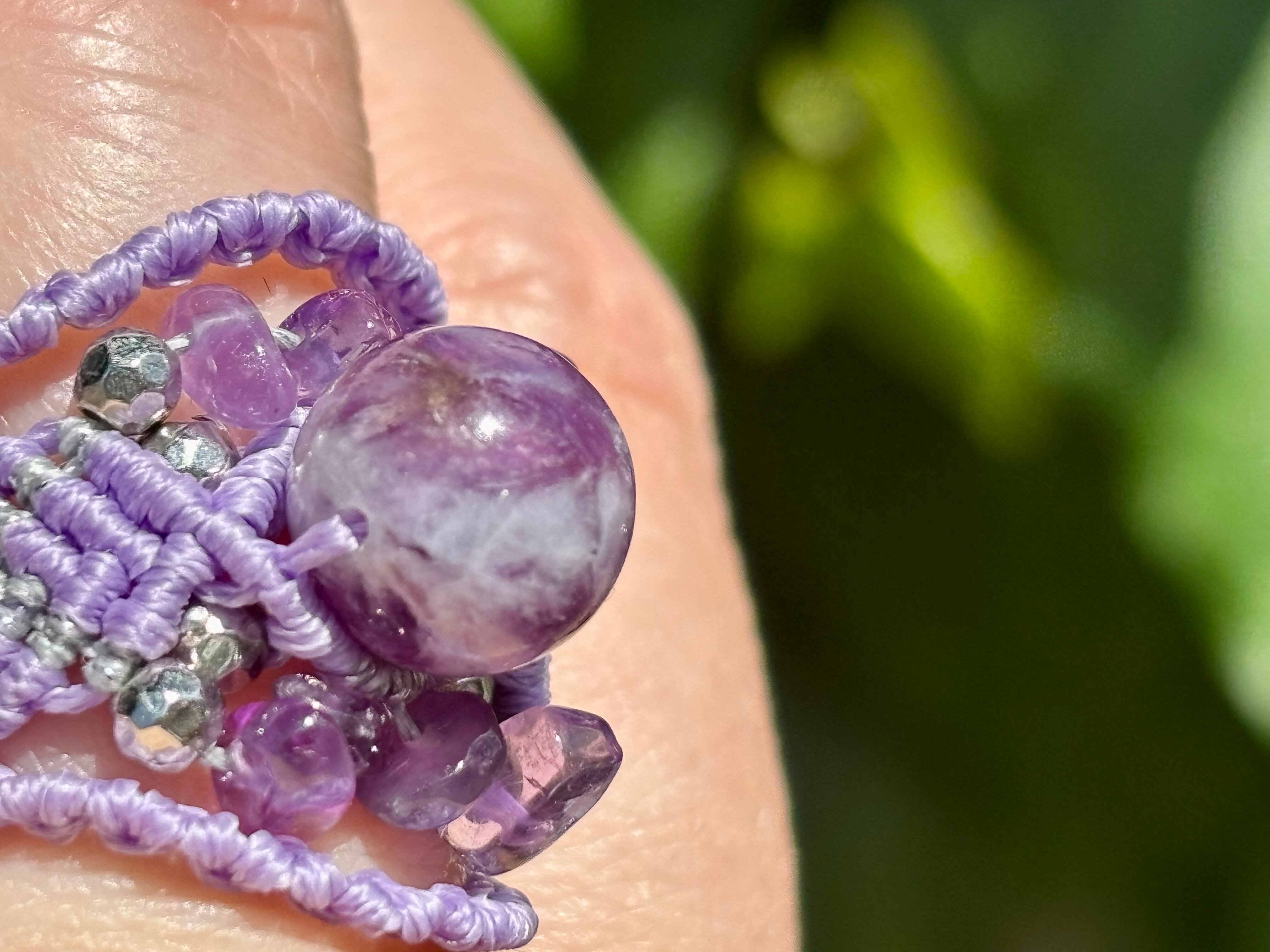 #713極上レピドライトシリカ5A! (レピドライトシリカ×アメジスト マクラメ編みリング/指輪)