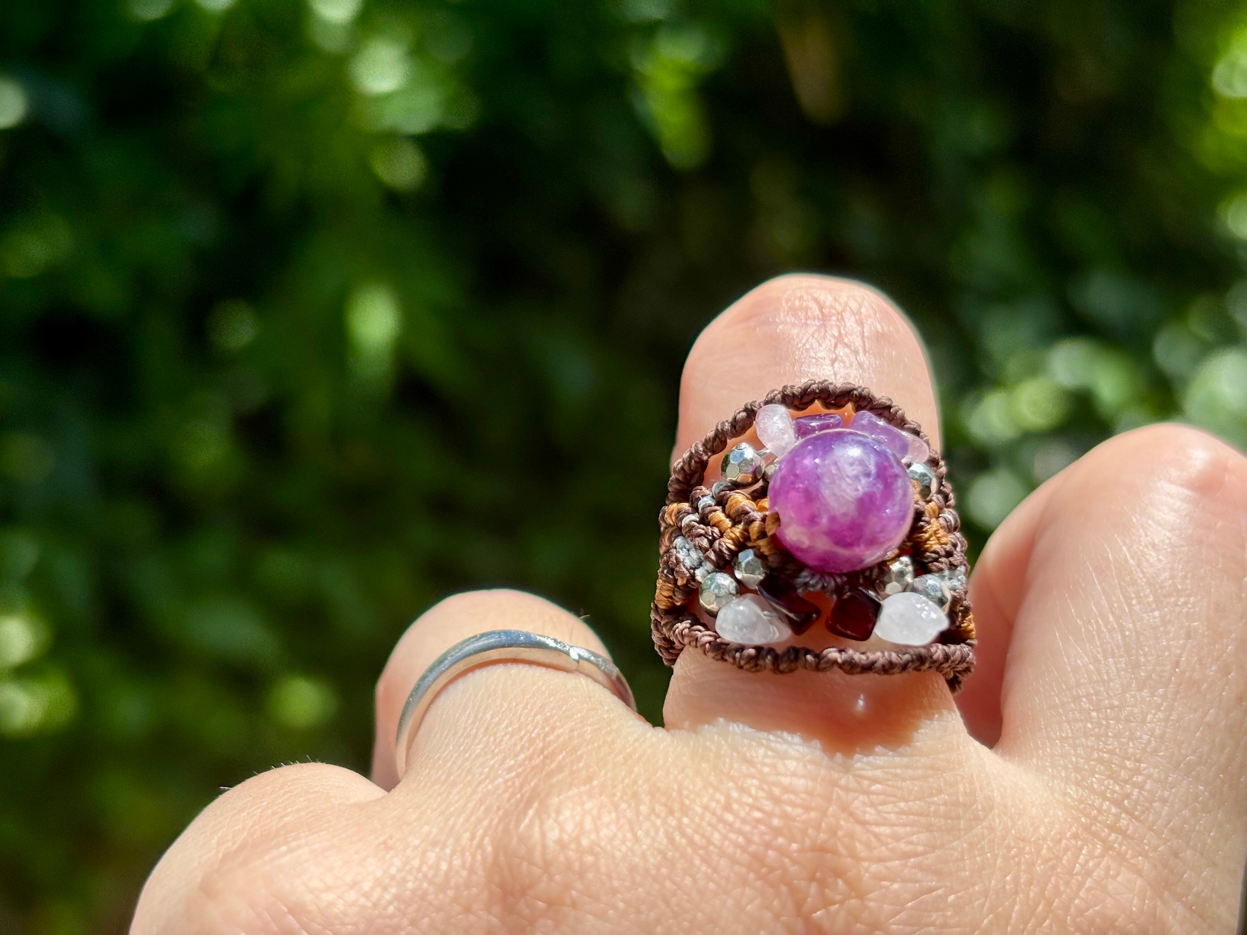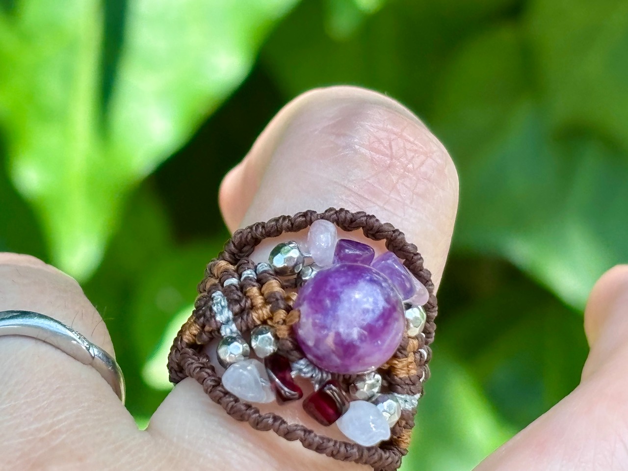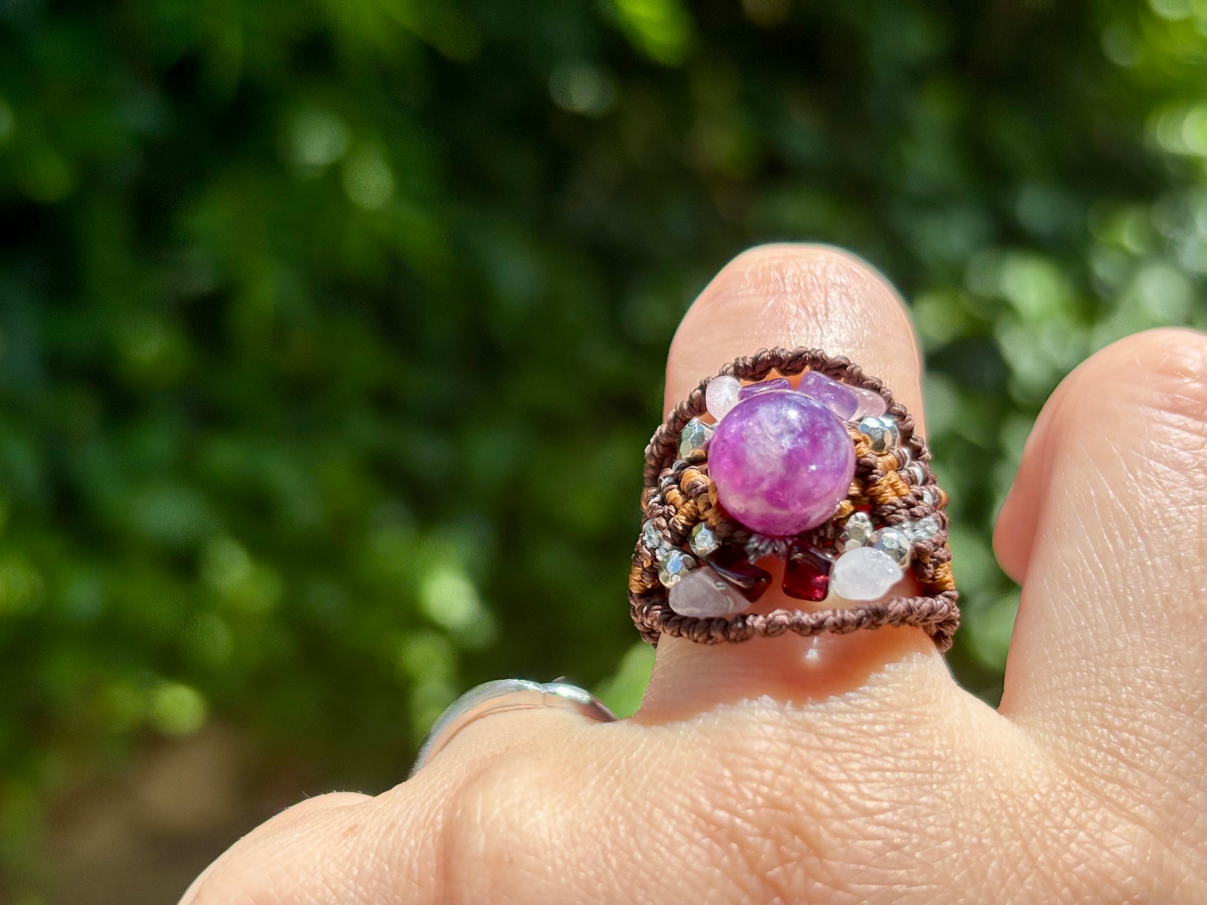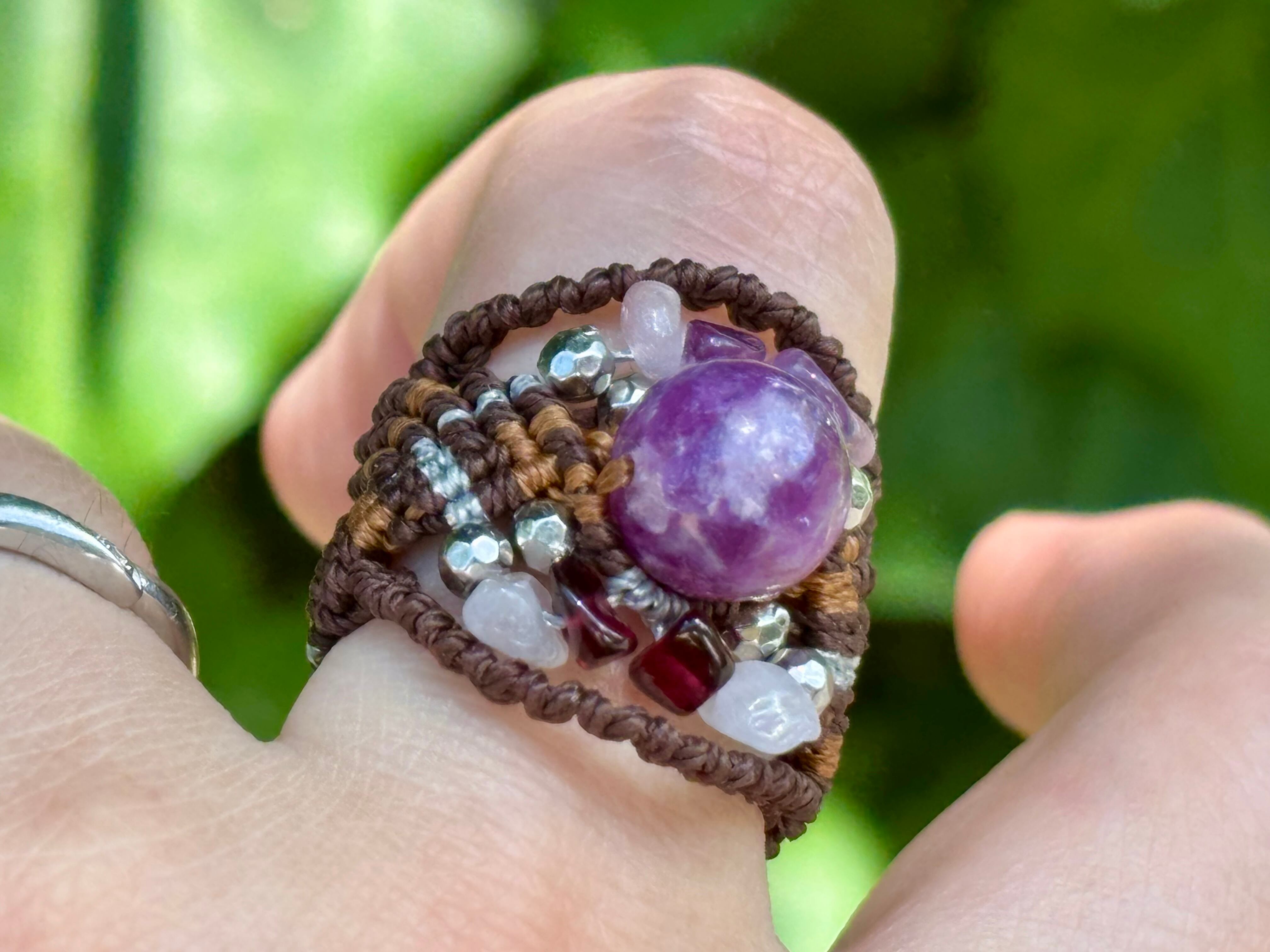 #715極上レピドライトシリカ5A! (レピドライトシリカ×アメジスト×ガーネット×ローズクォーツ マクラメ編みリング/指輪)