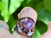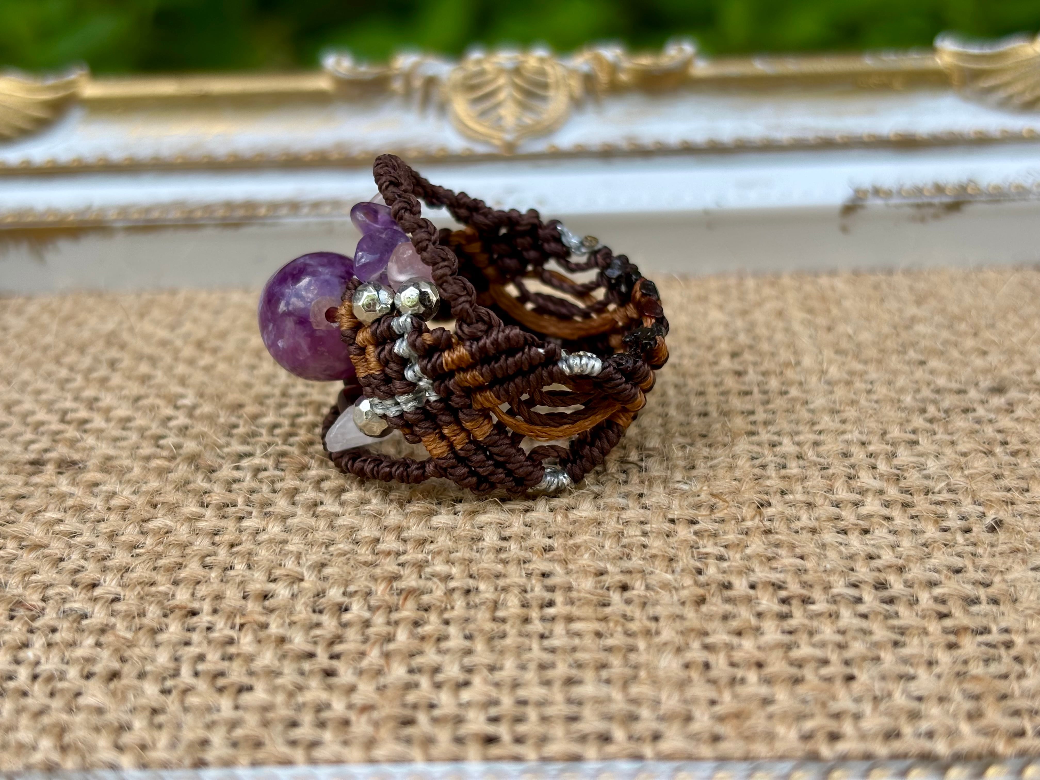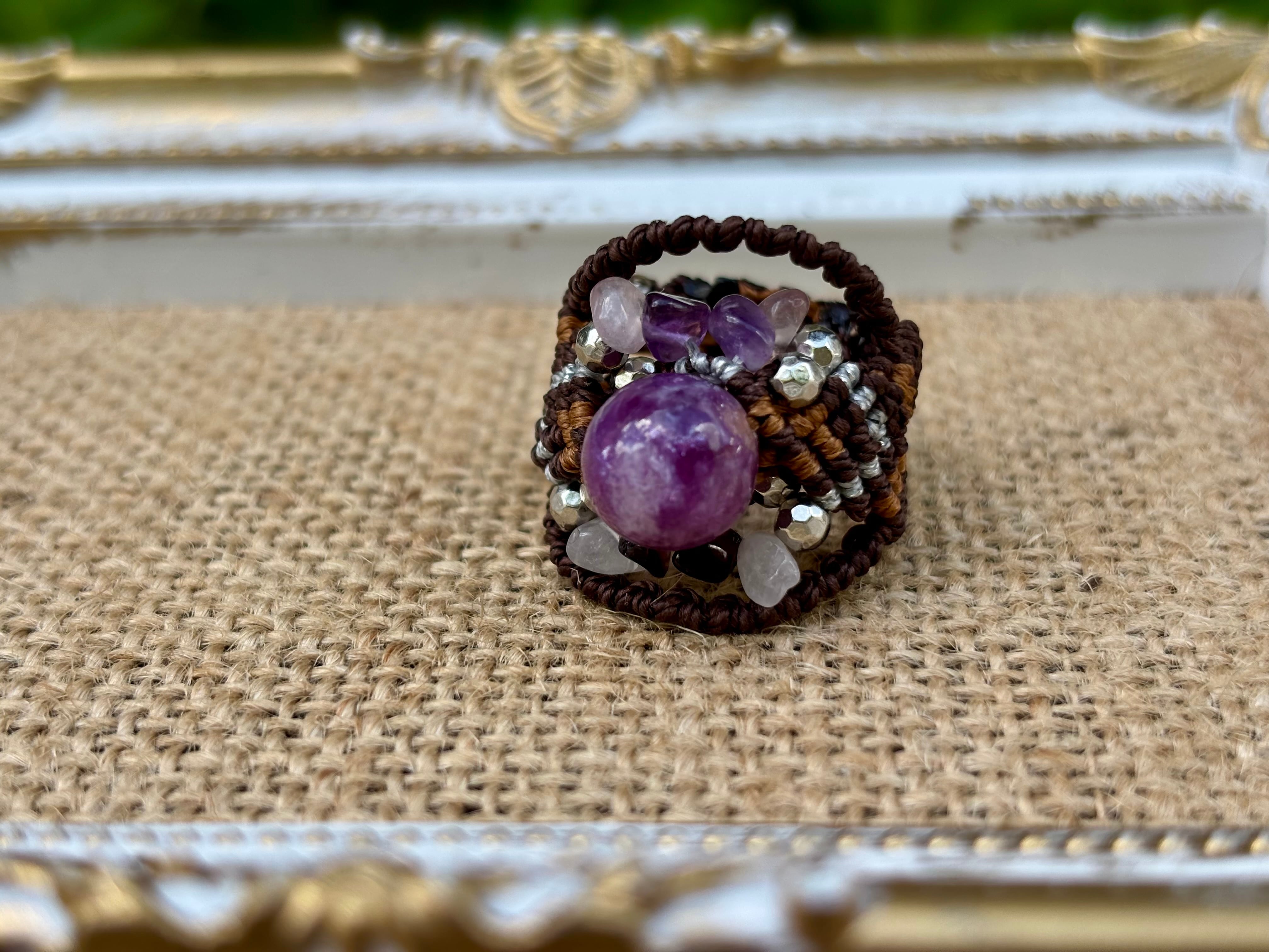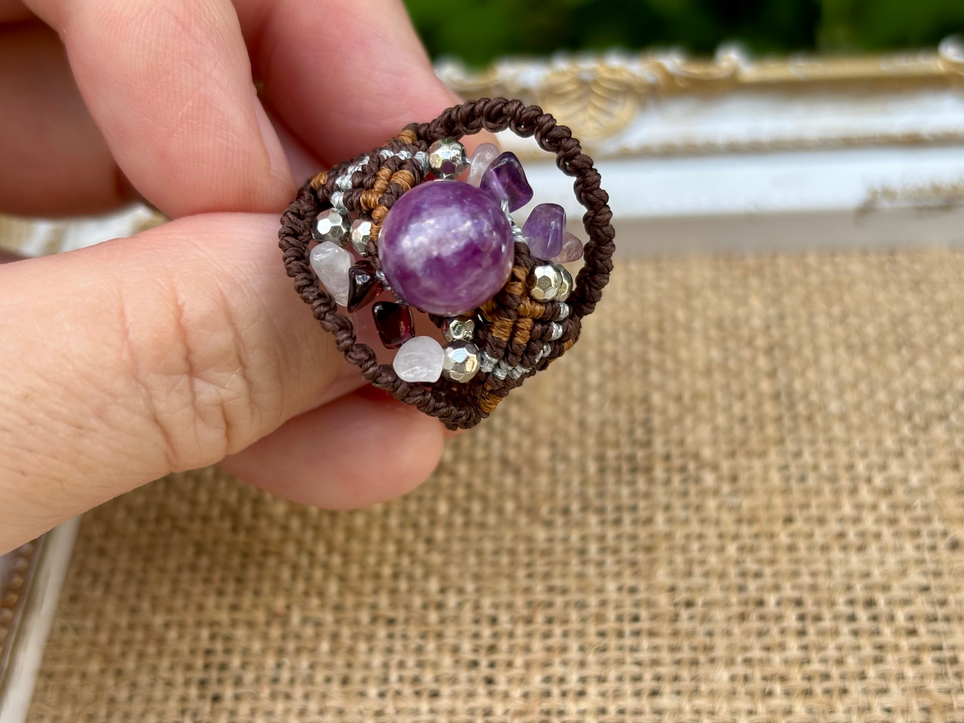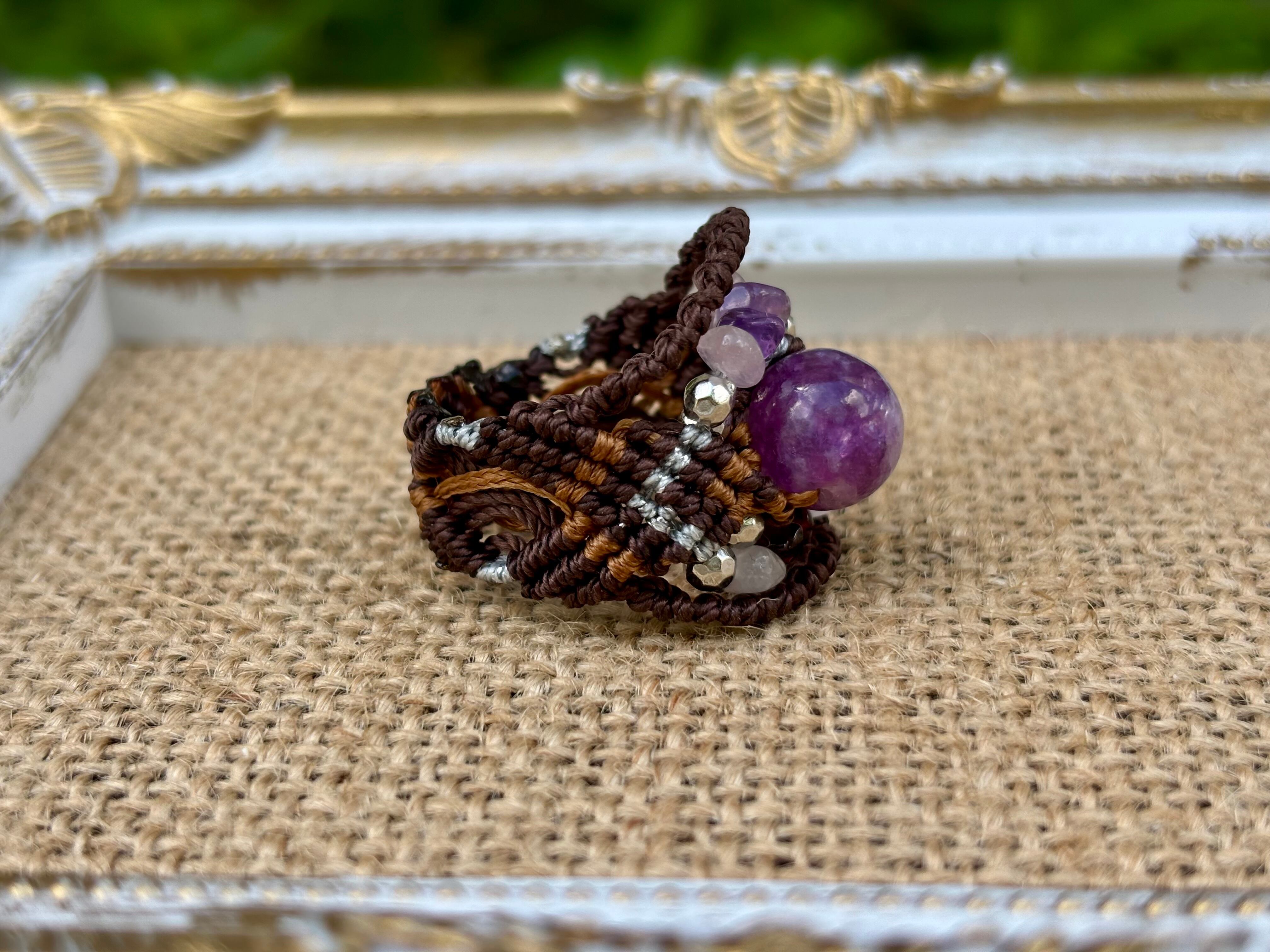 #715極上レピドライトシリカ5A! (レピドライトシリカ×アメジスト×ガーネット×ローズクォーツ マクラメ編みリング/指輪)