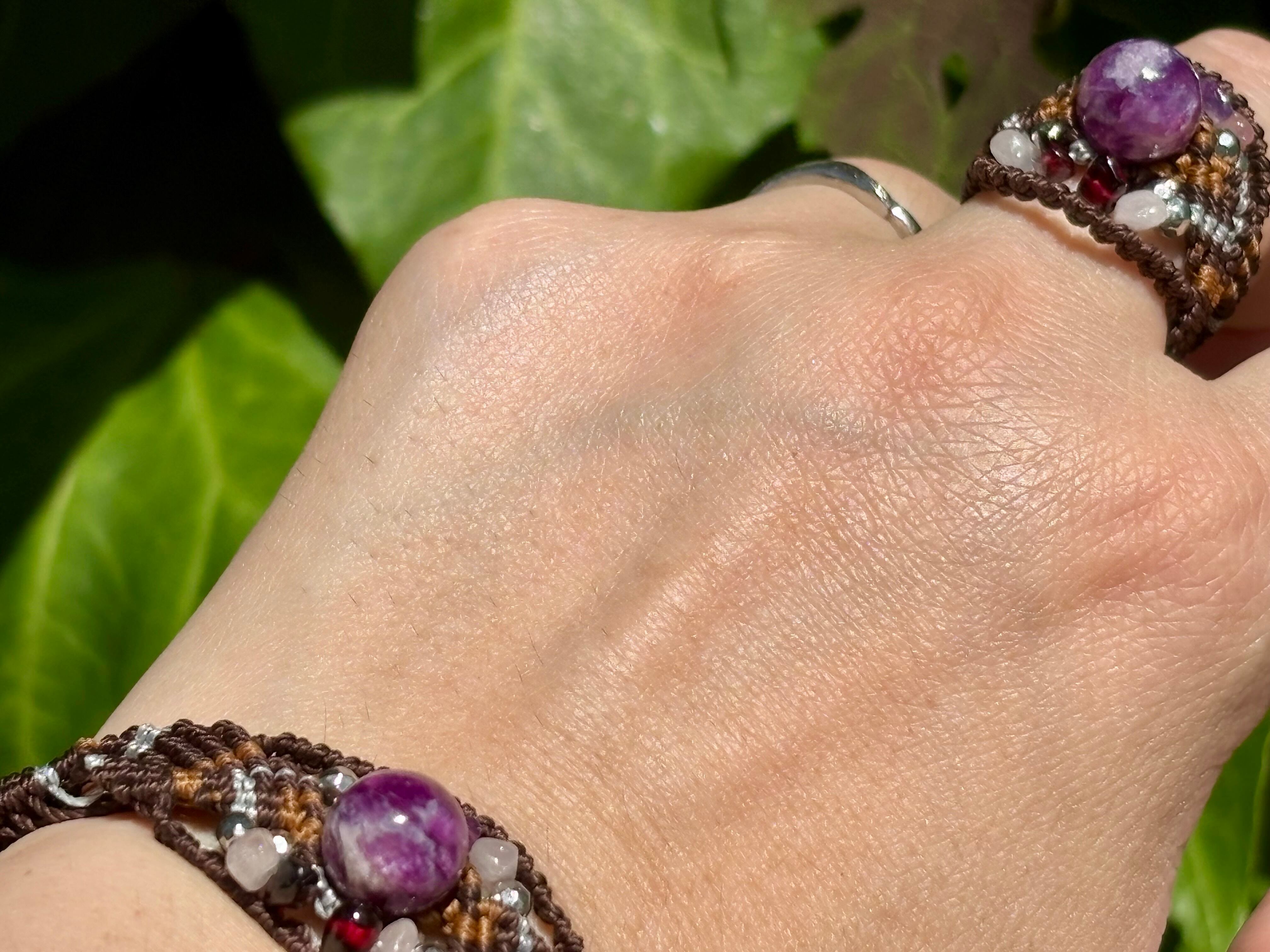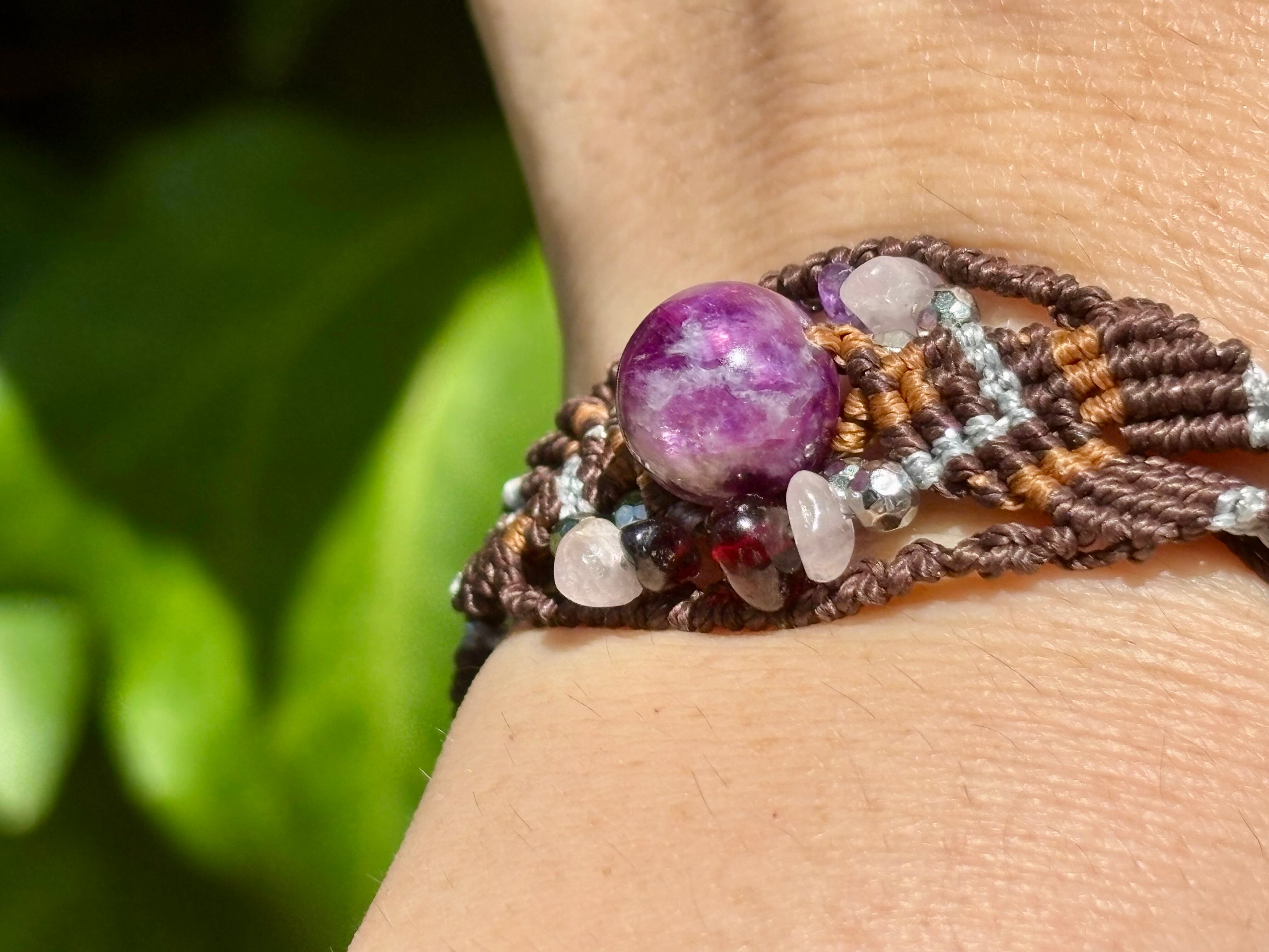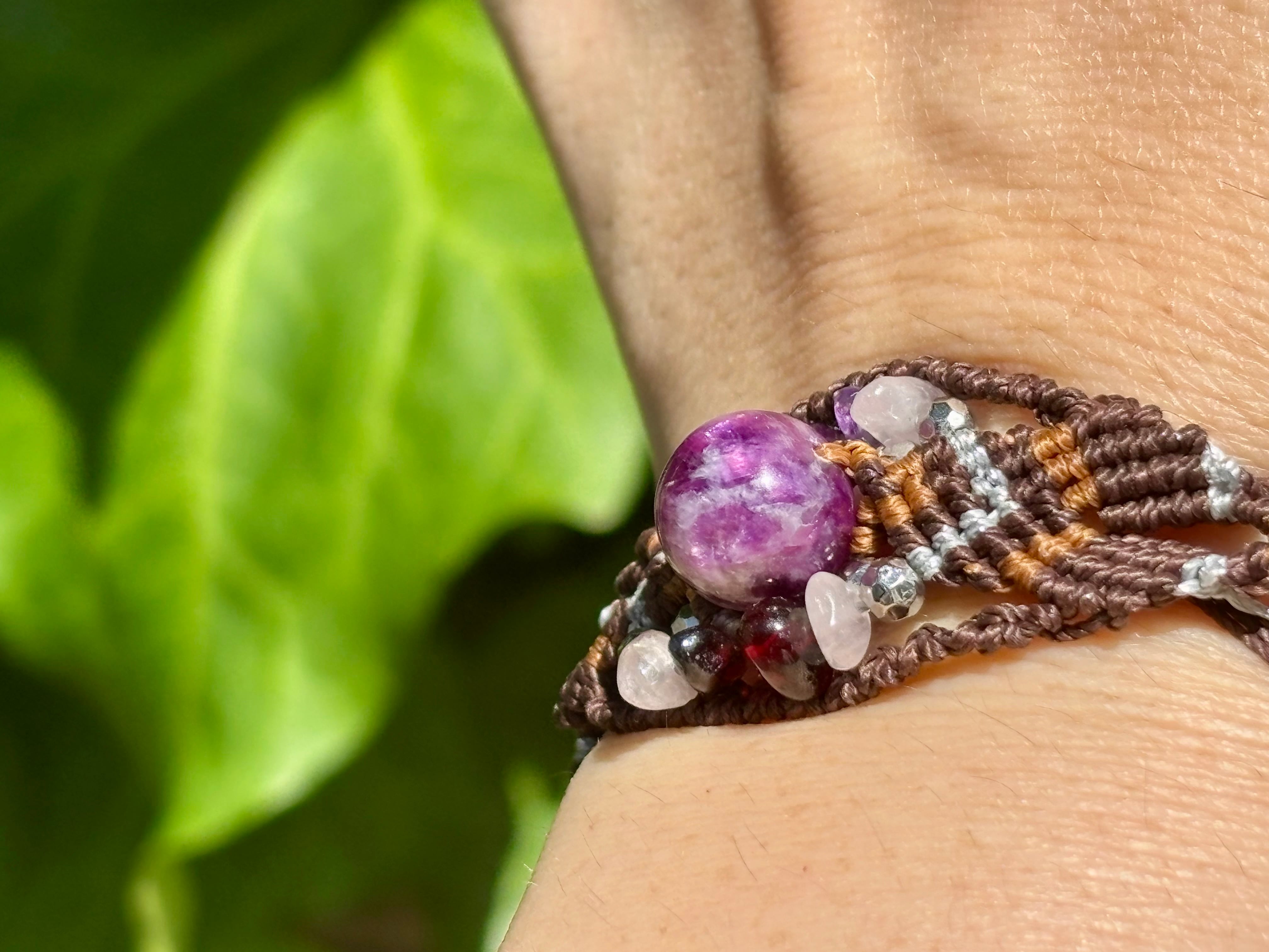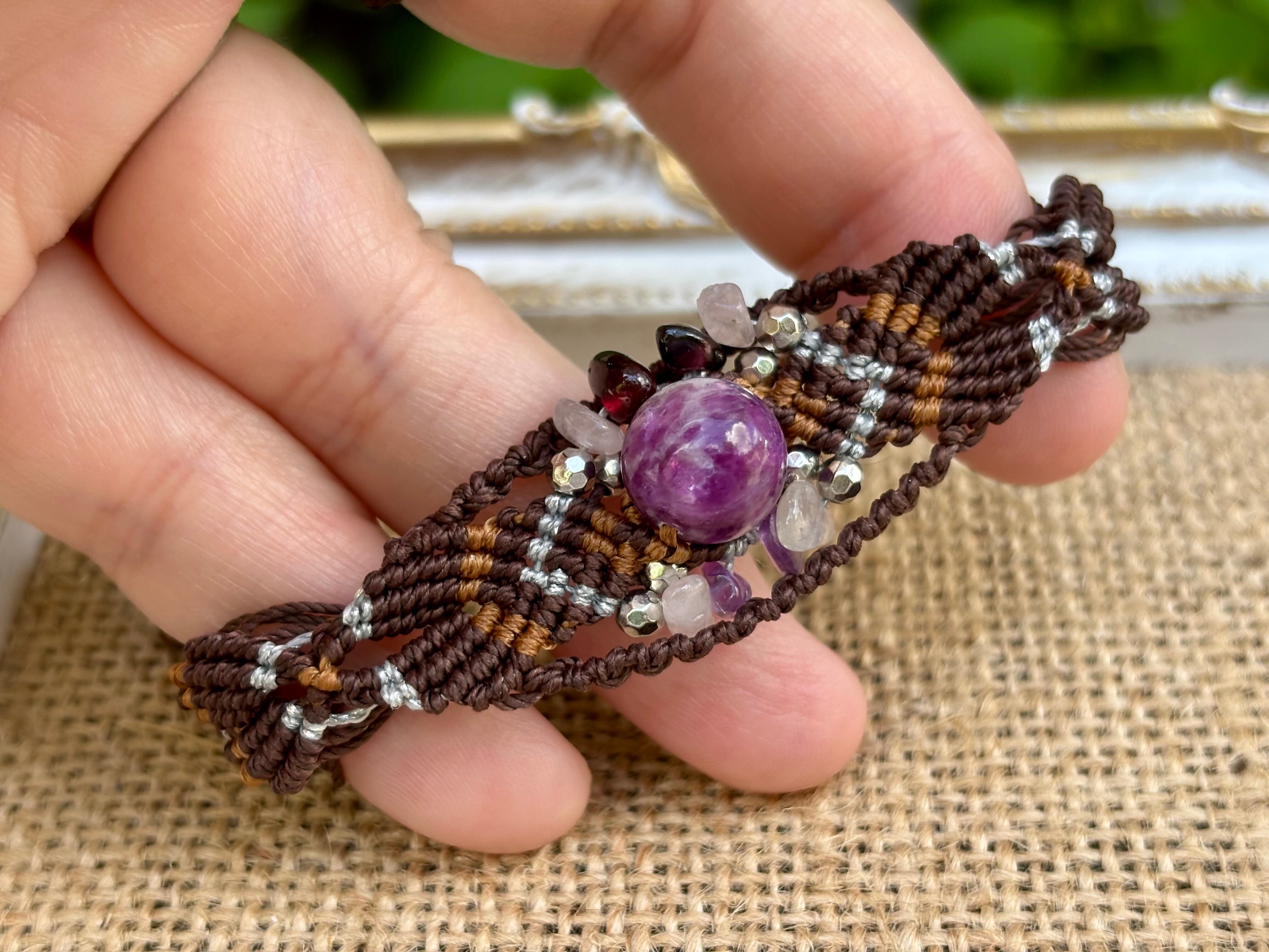 #716極上レピドライトシリカ5A! (レピドライトシリカ×アメジスト×ガーネット×ローズクォーツ マクラメ編みブレスレット)