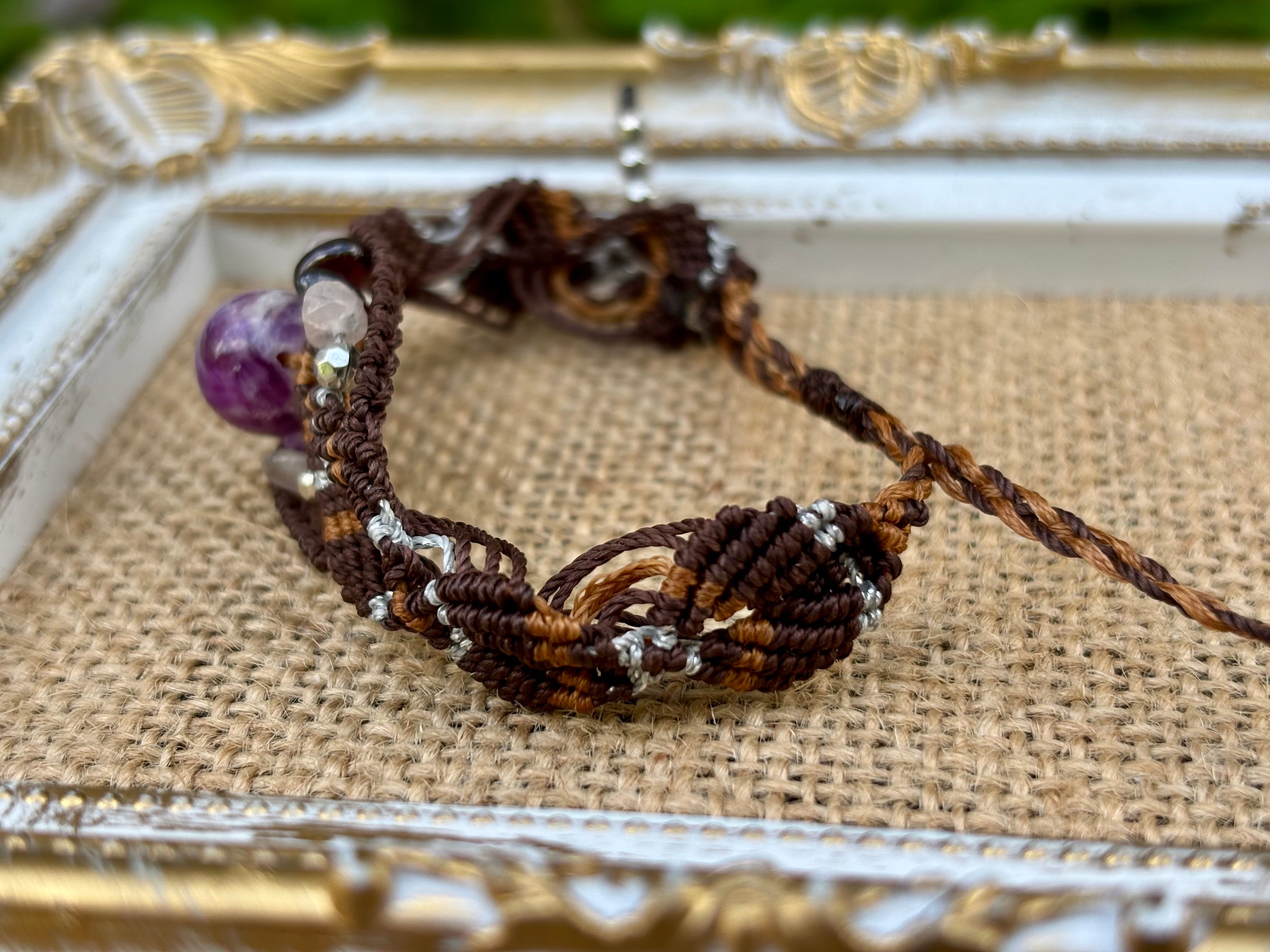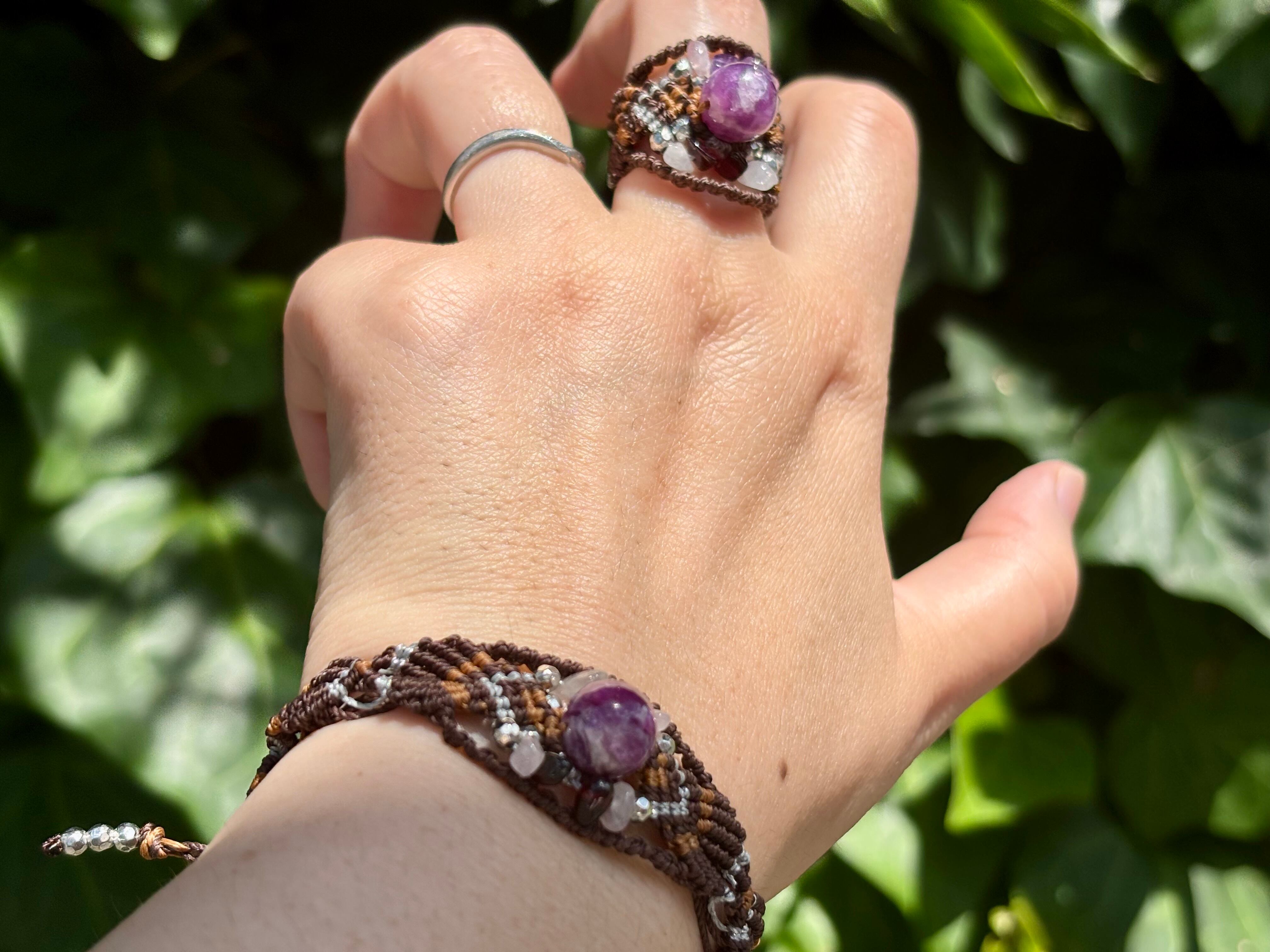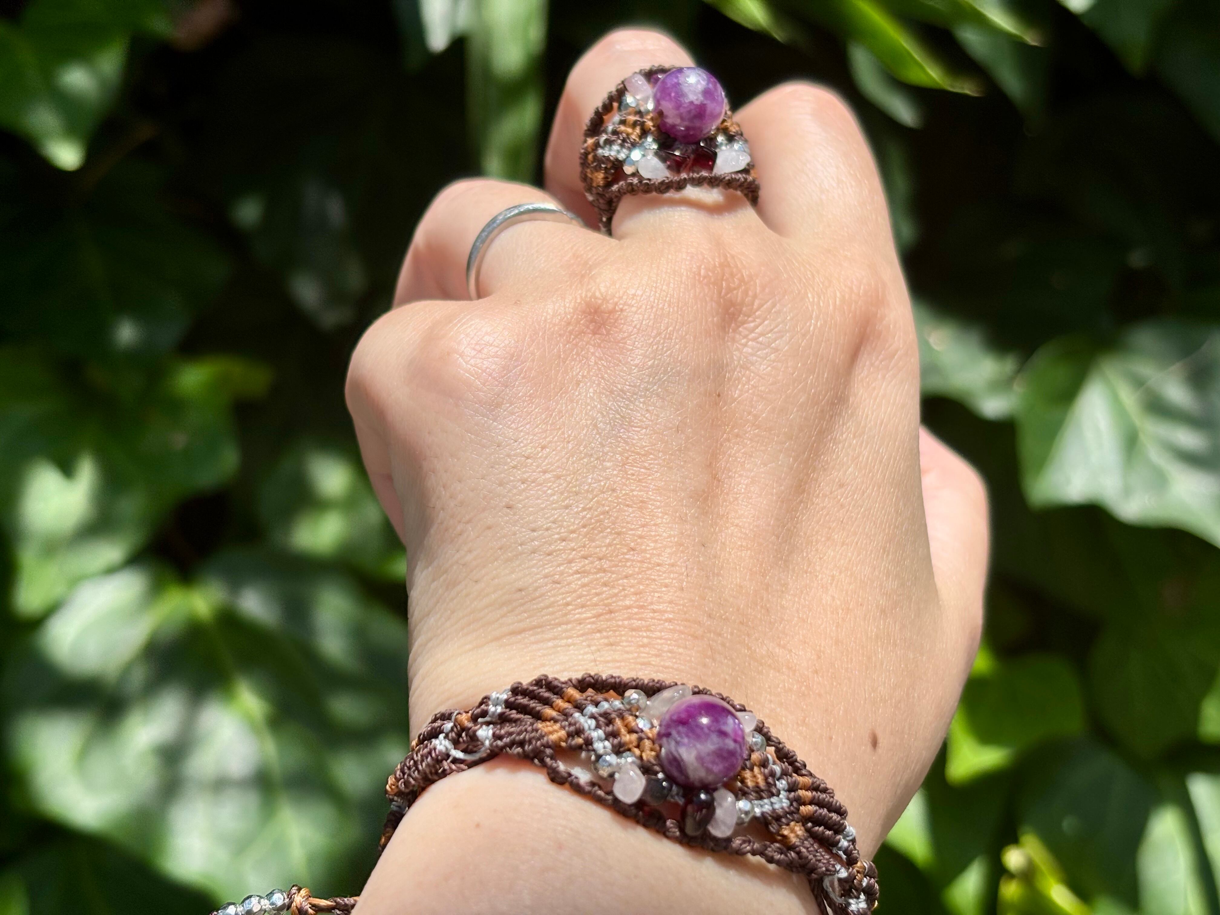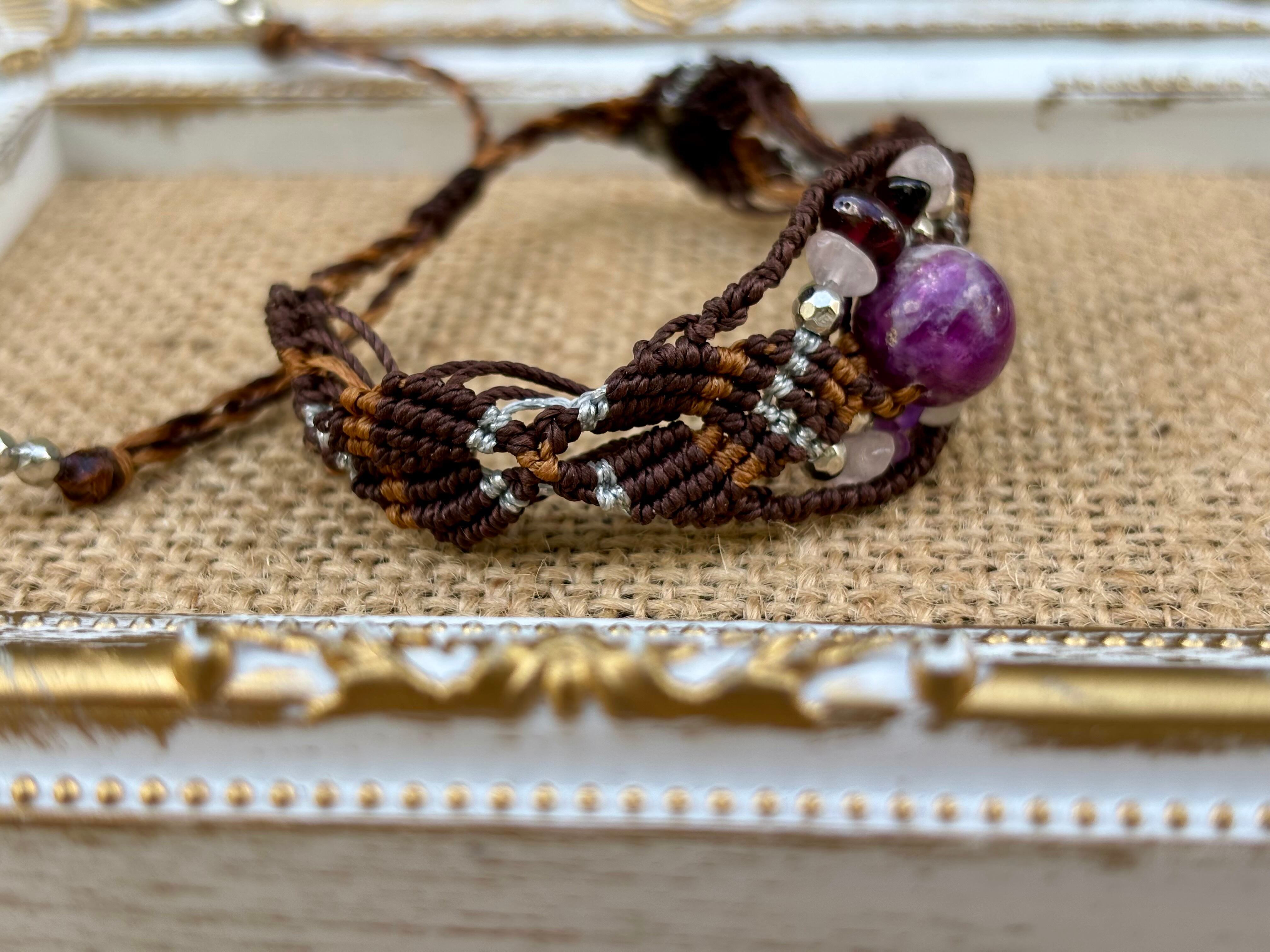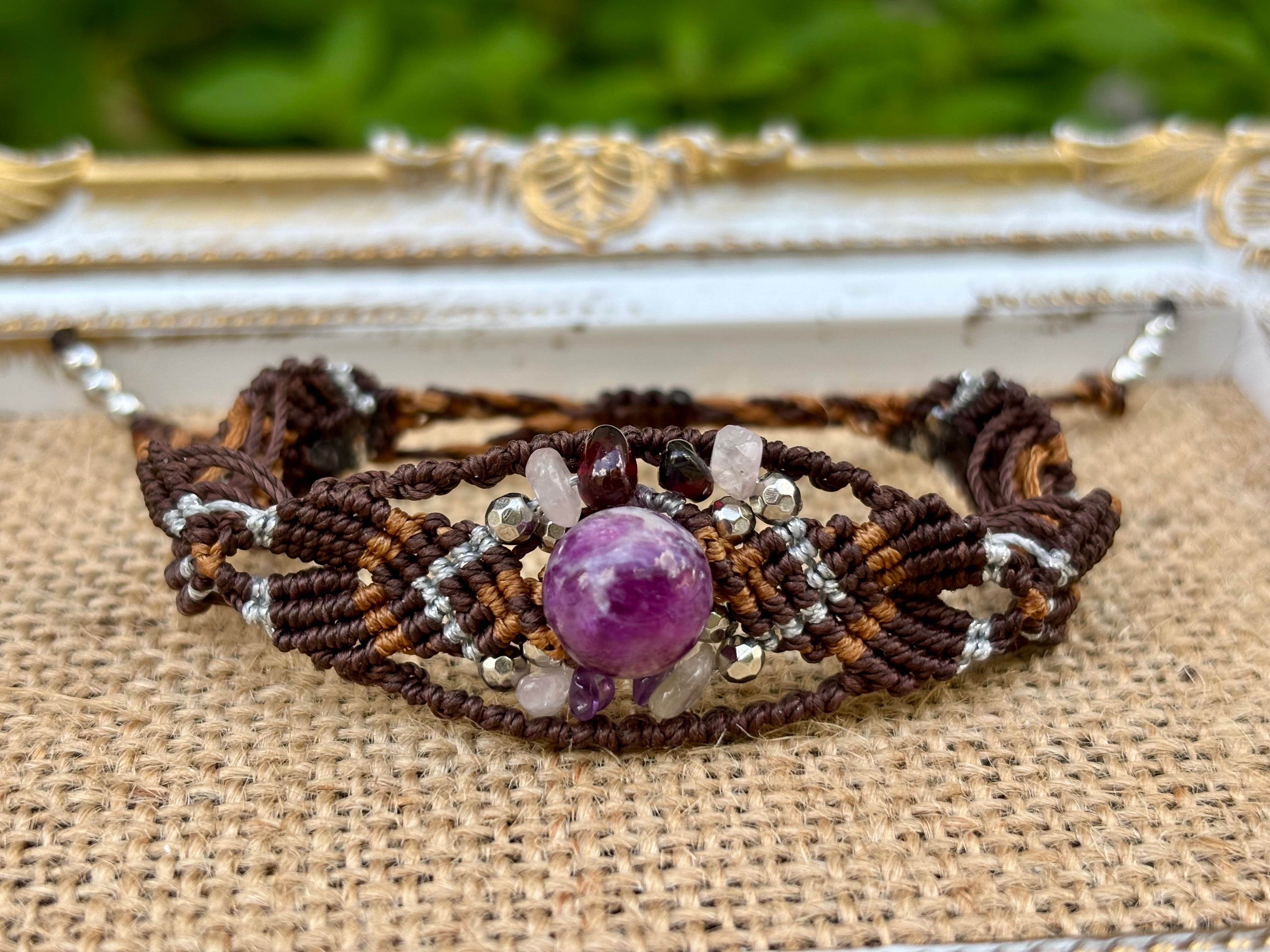 #716極上レピドライトシリカ5A! (レピドライトシリカ×アメジスト×ガーネット×ローズクォーツ マクラメ編みブレスレット)