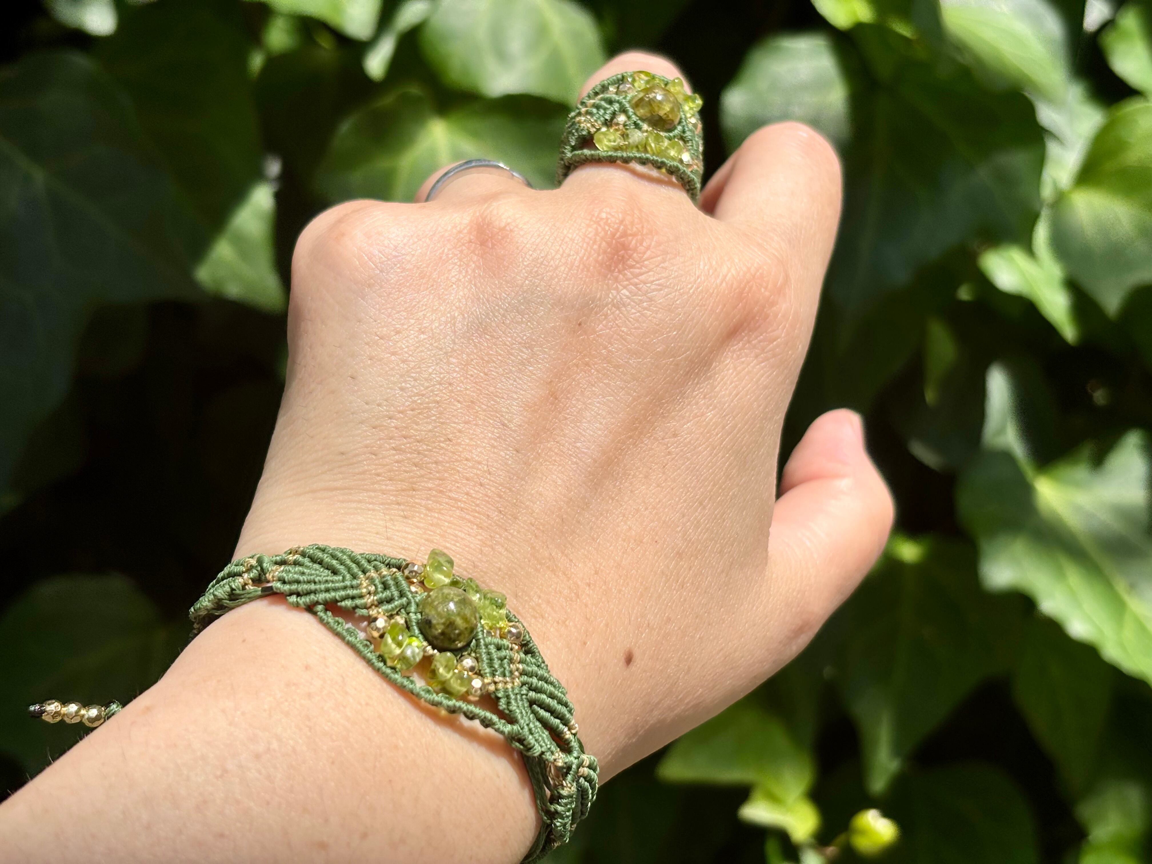 独自のデザインで仕上げられたマクラメ編みブレスレットは希少な高品質3Aペリドットを使用し、美しい編み模様が天然石が持つ個性を引き立てています。ペリドットは心の安定をサポートする石とされています。このリングを身に着けることで、心を豊かにし、毎日をより美しく彩るサポートをします!