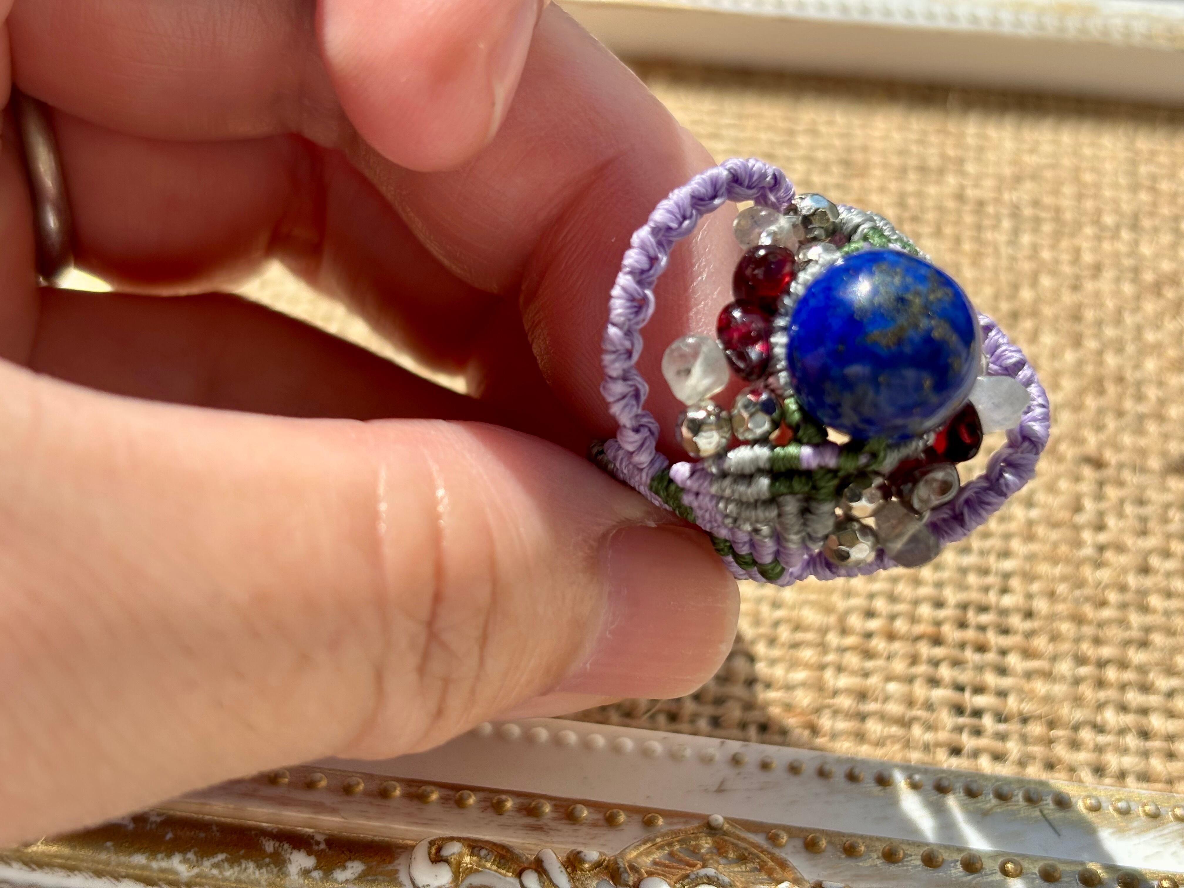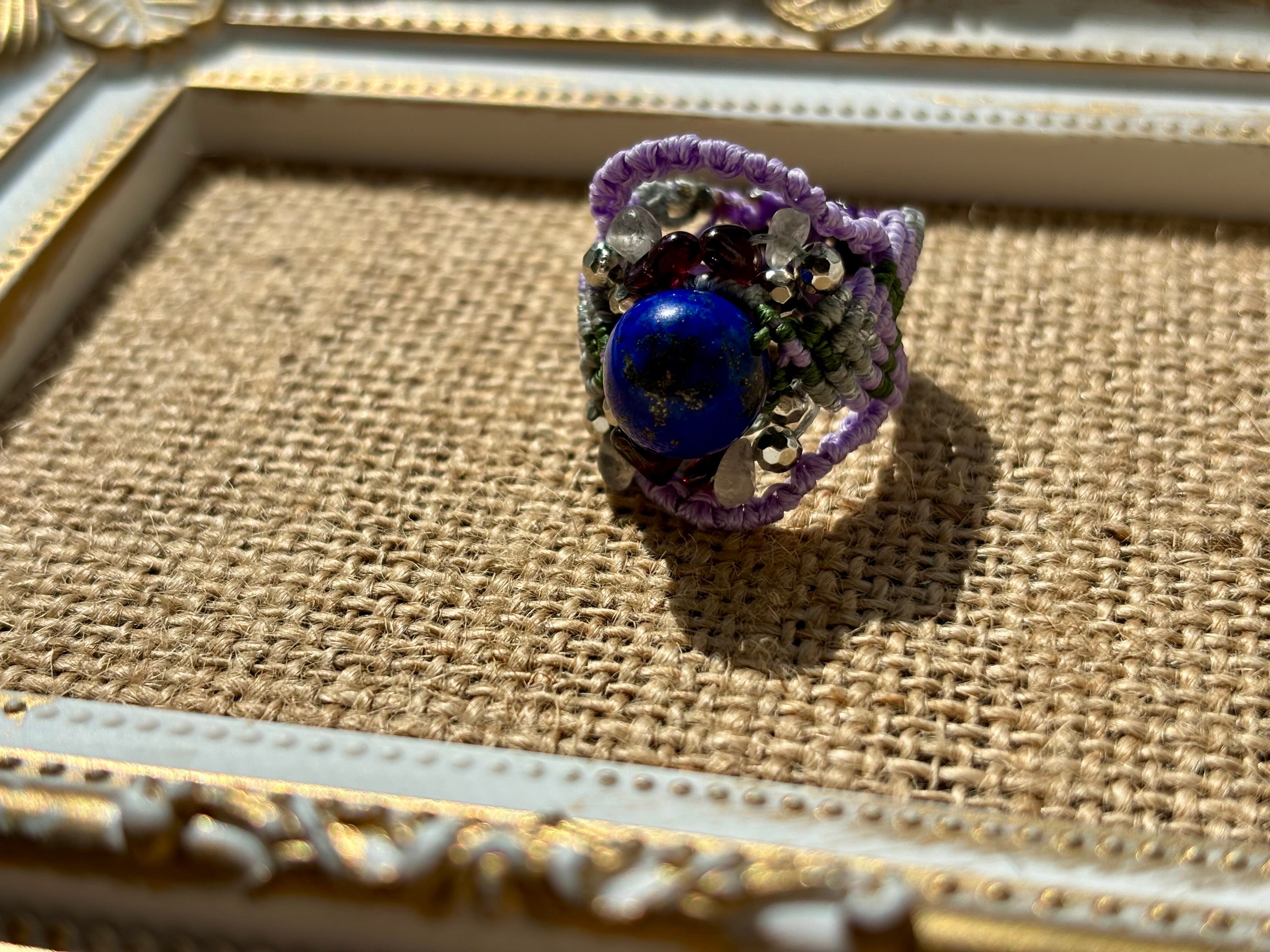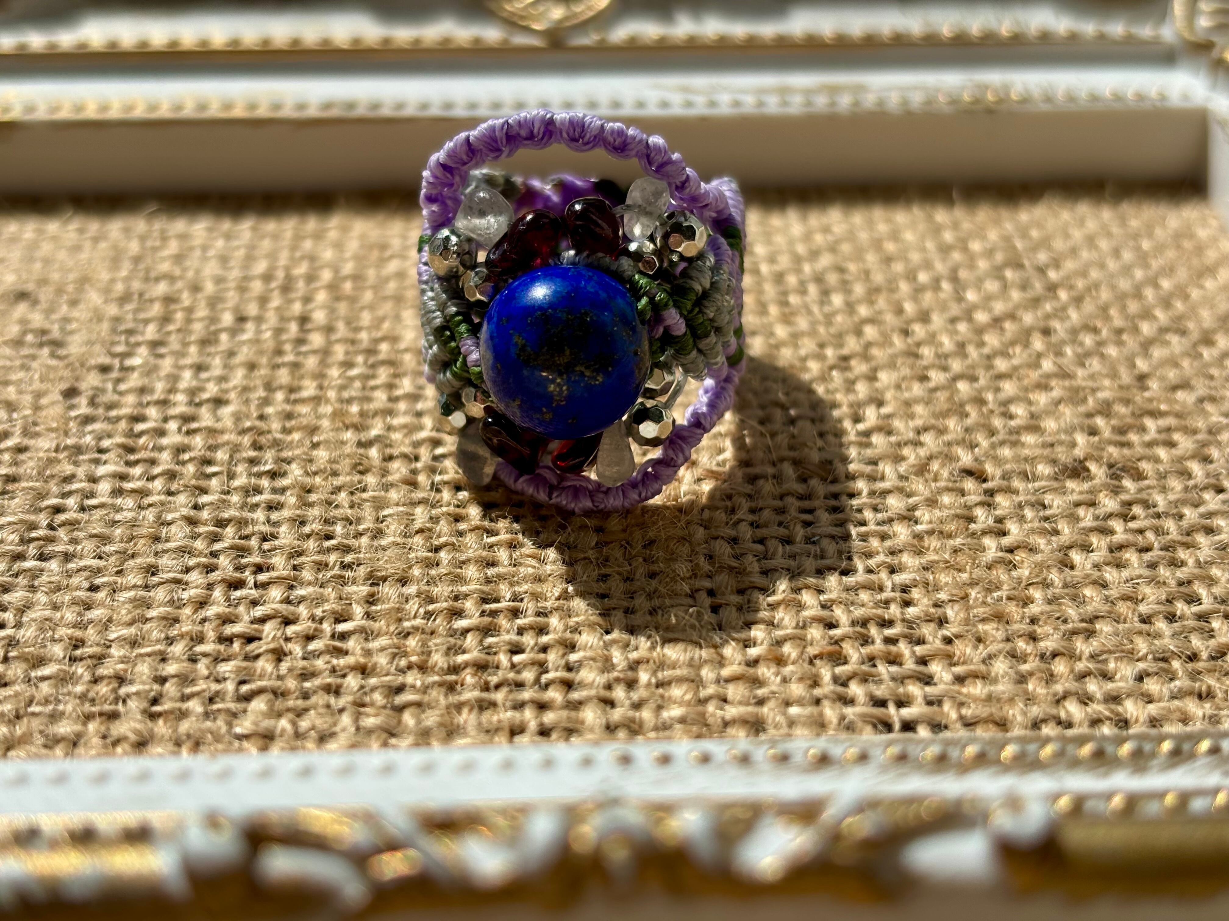 #748天然ラピスラズリ⭐︎(ラピスラズリ×ラブラドライト×ガーネット マクラメ編みリング/指輪)
