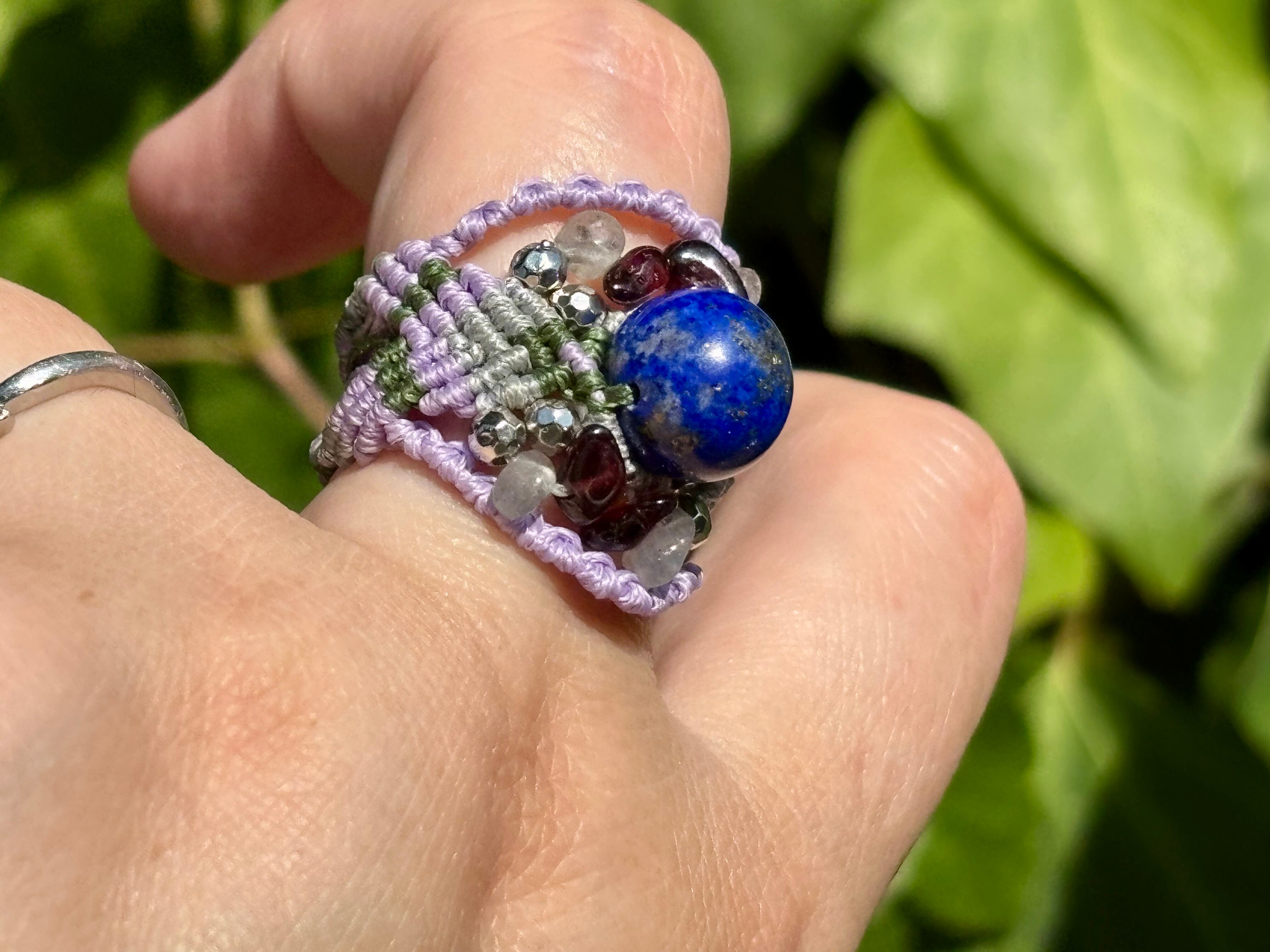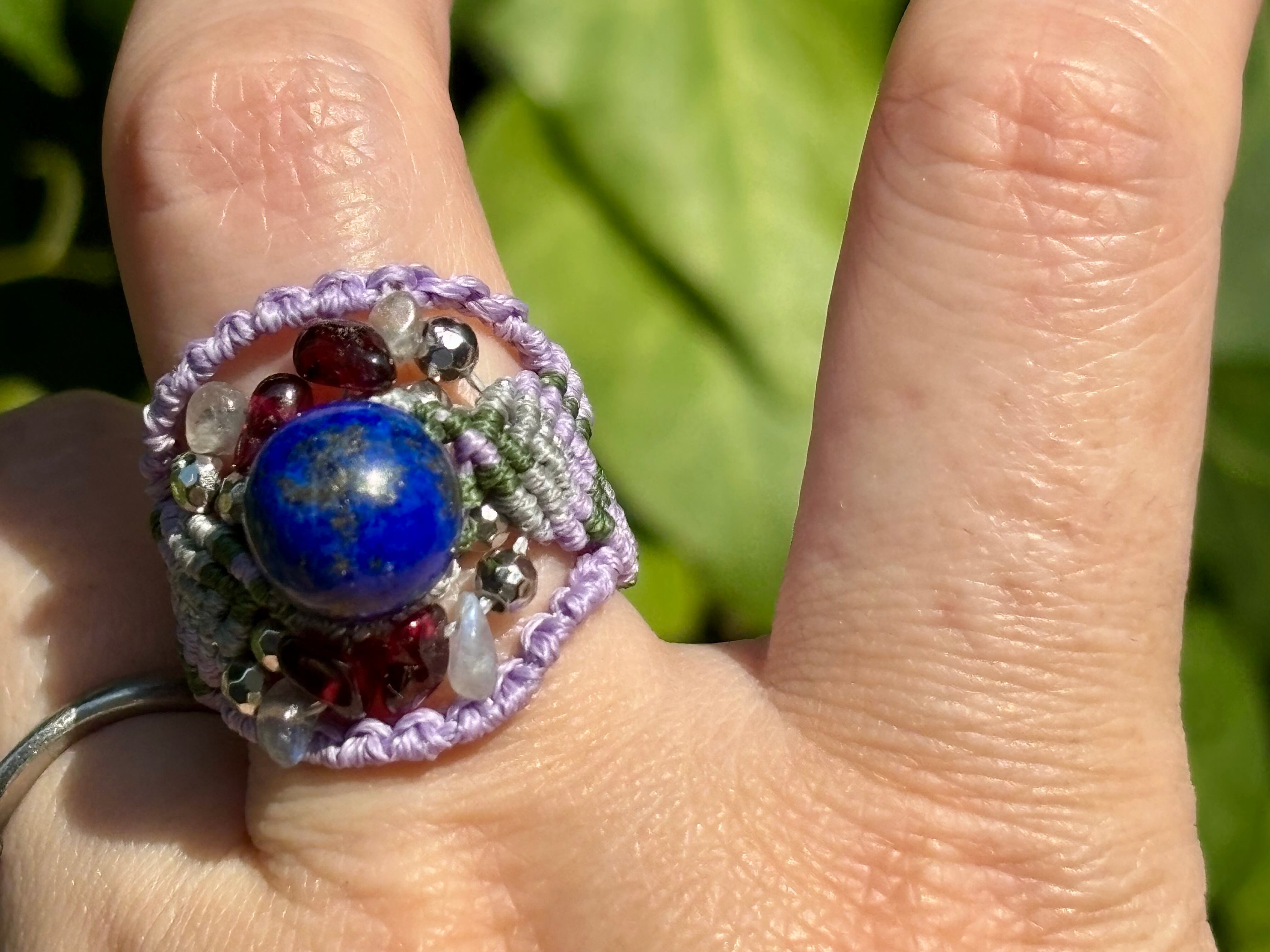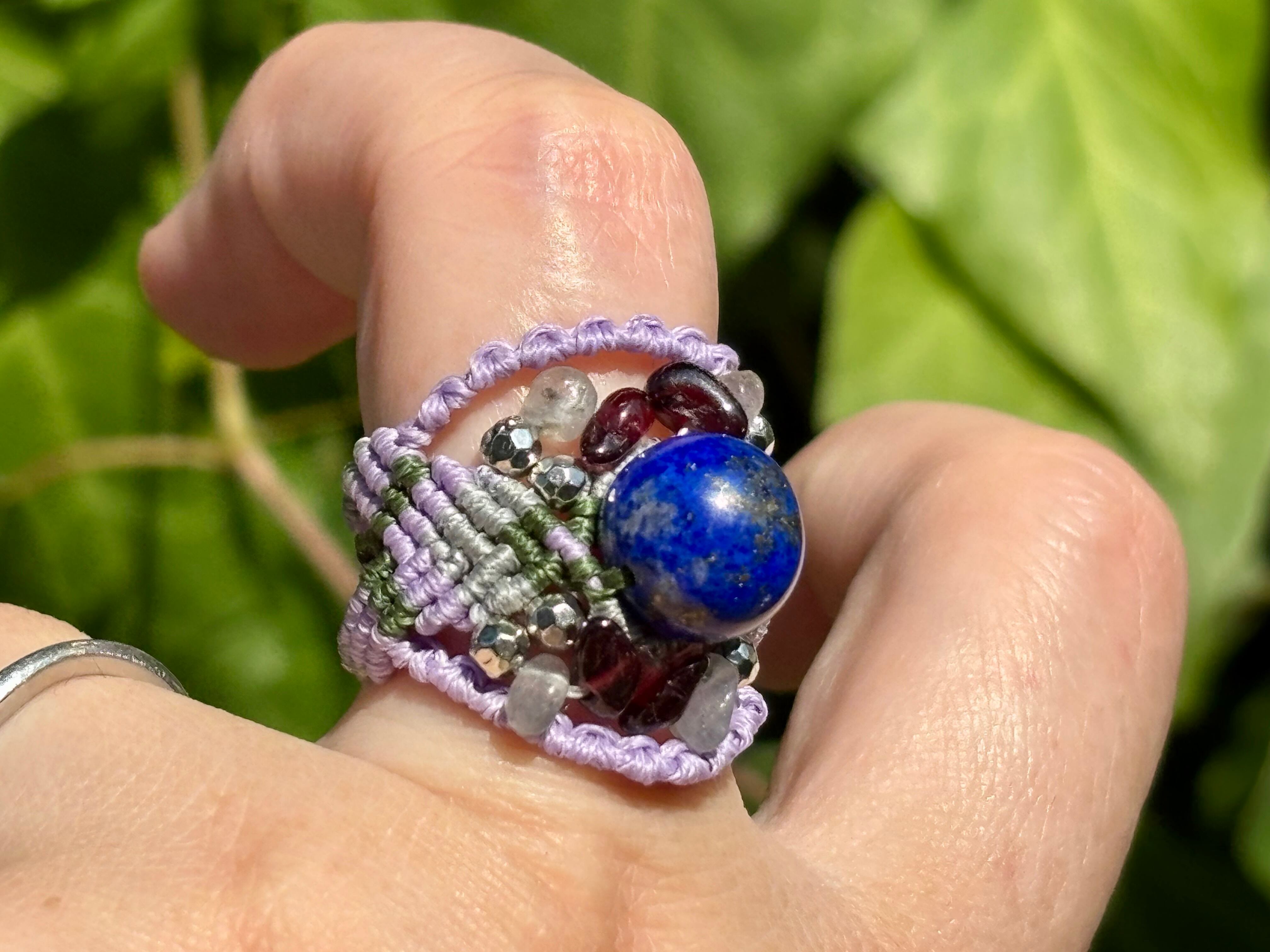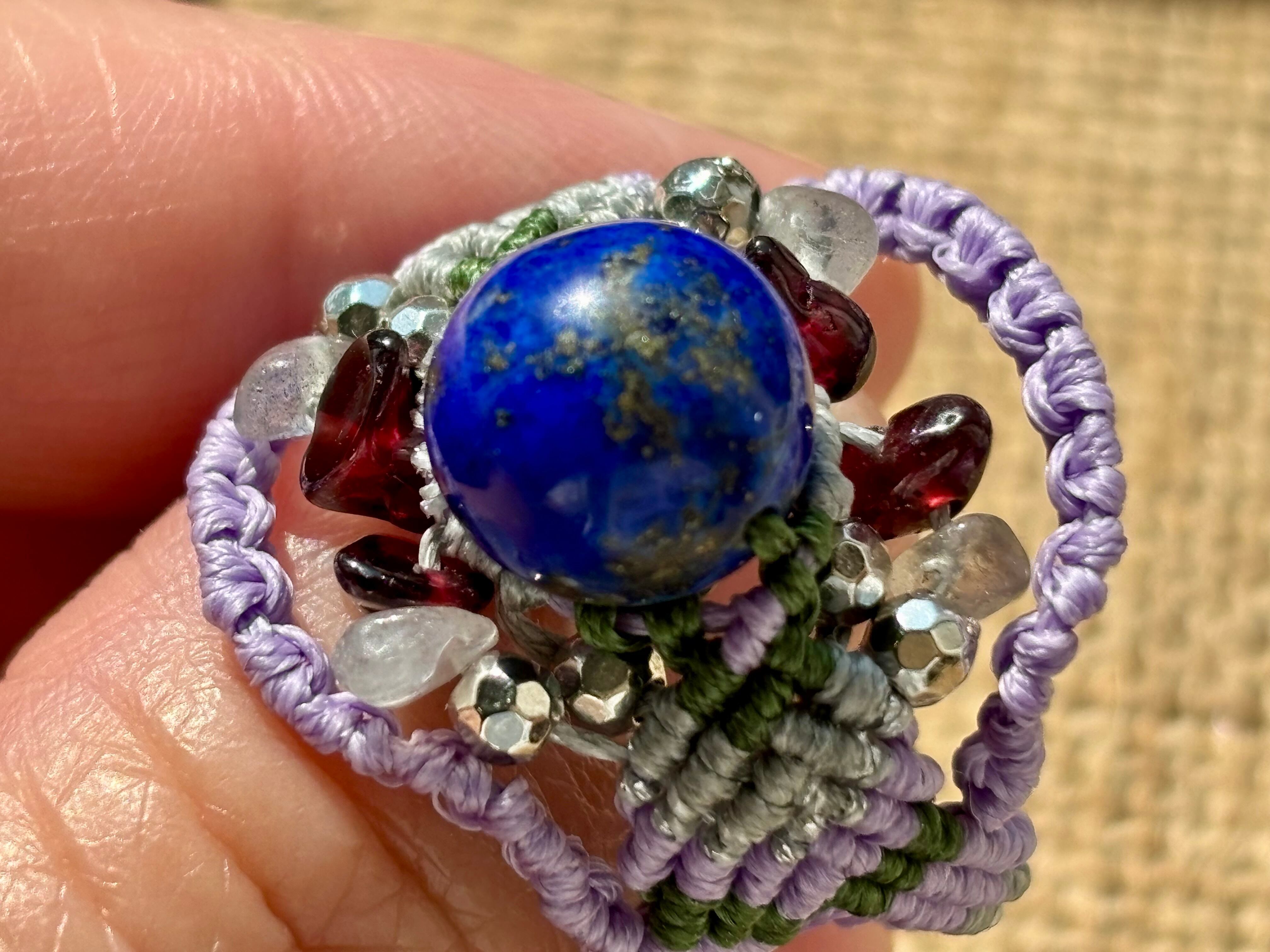 #748天然ラピスラズリ⭐︎(ラピスラズリ×ラブラドライト×ガーネット マクラメ編みリング/指輪)