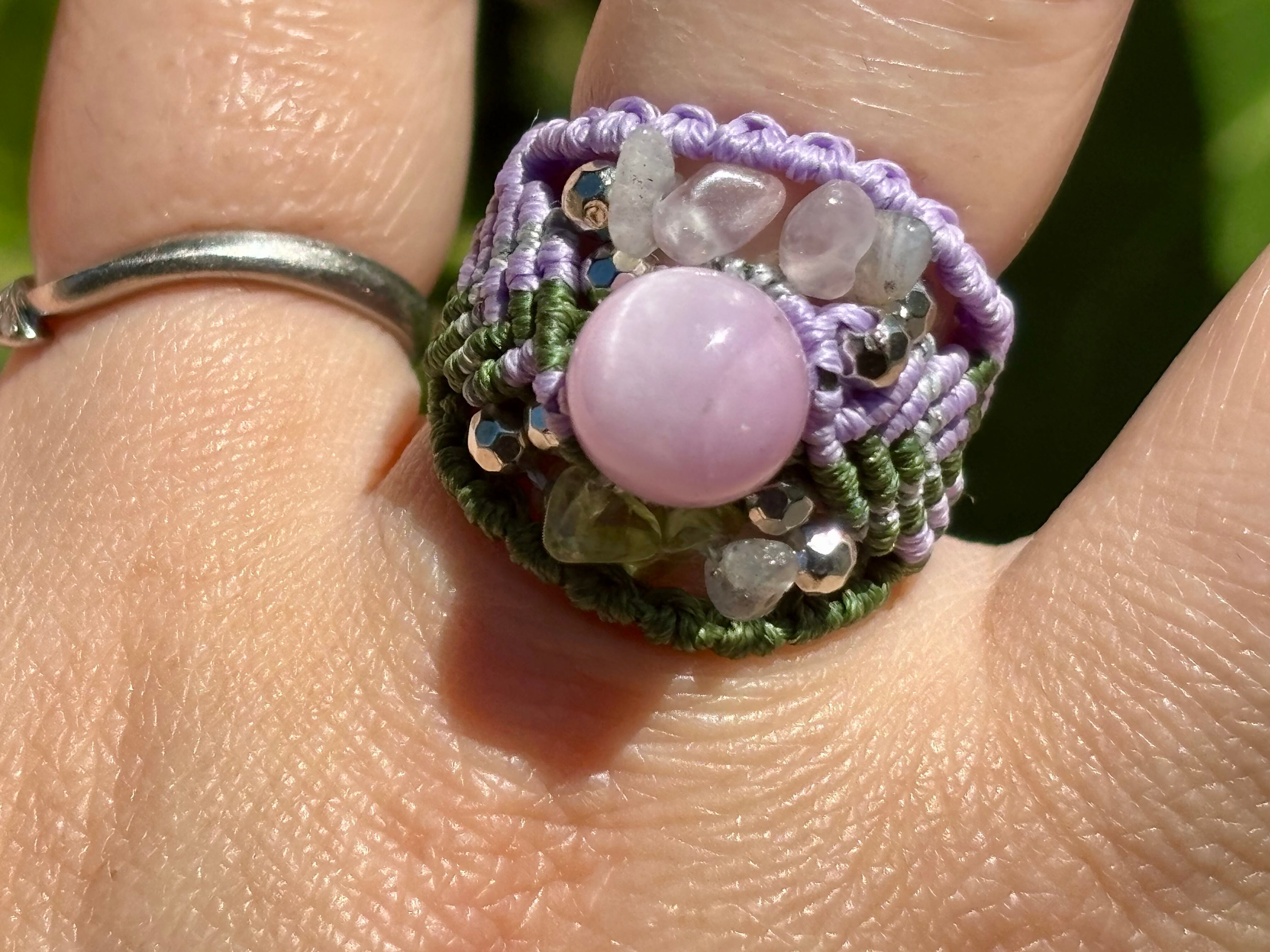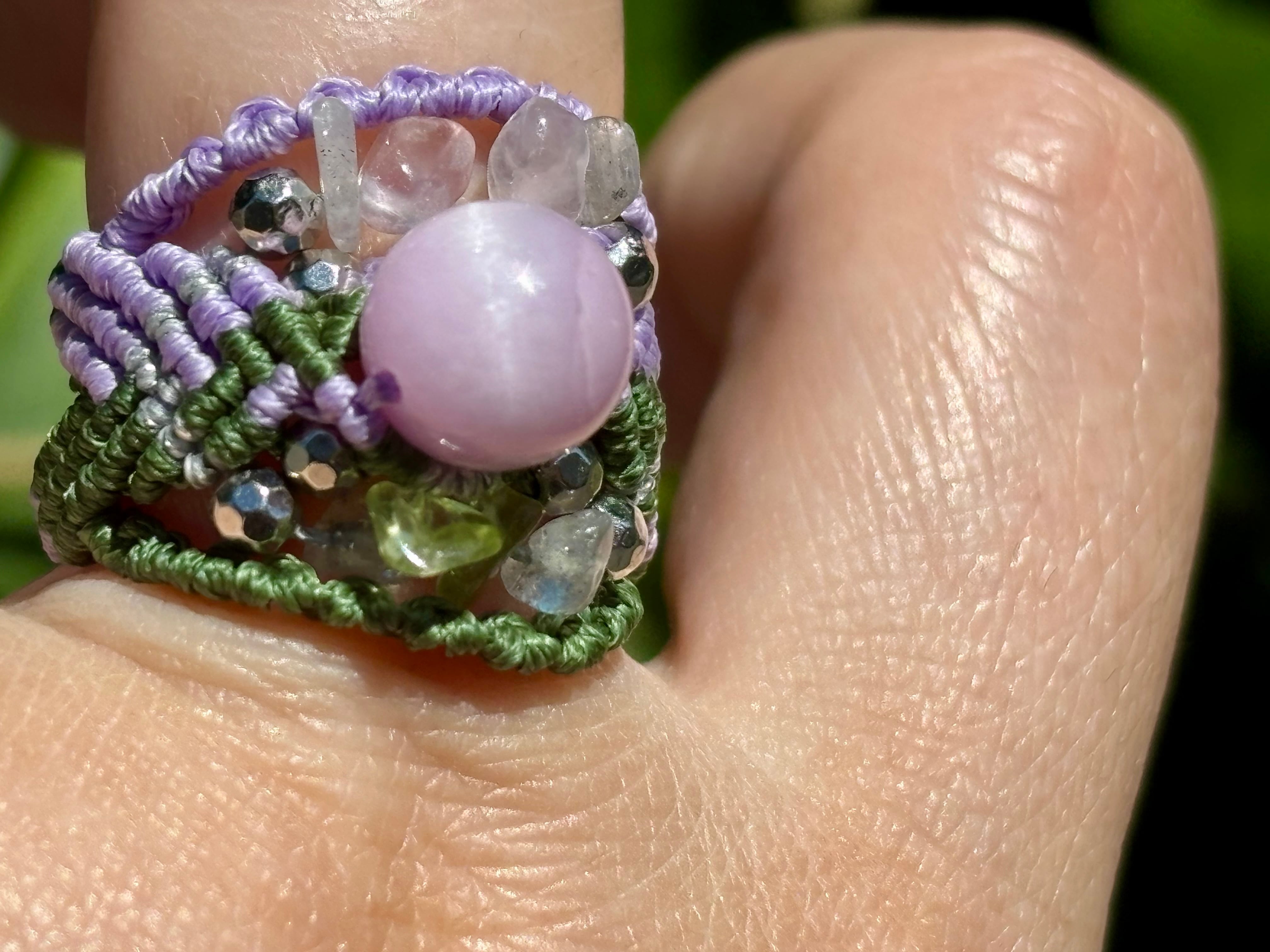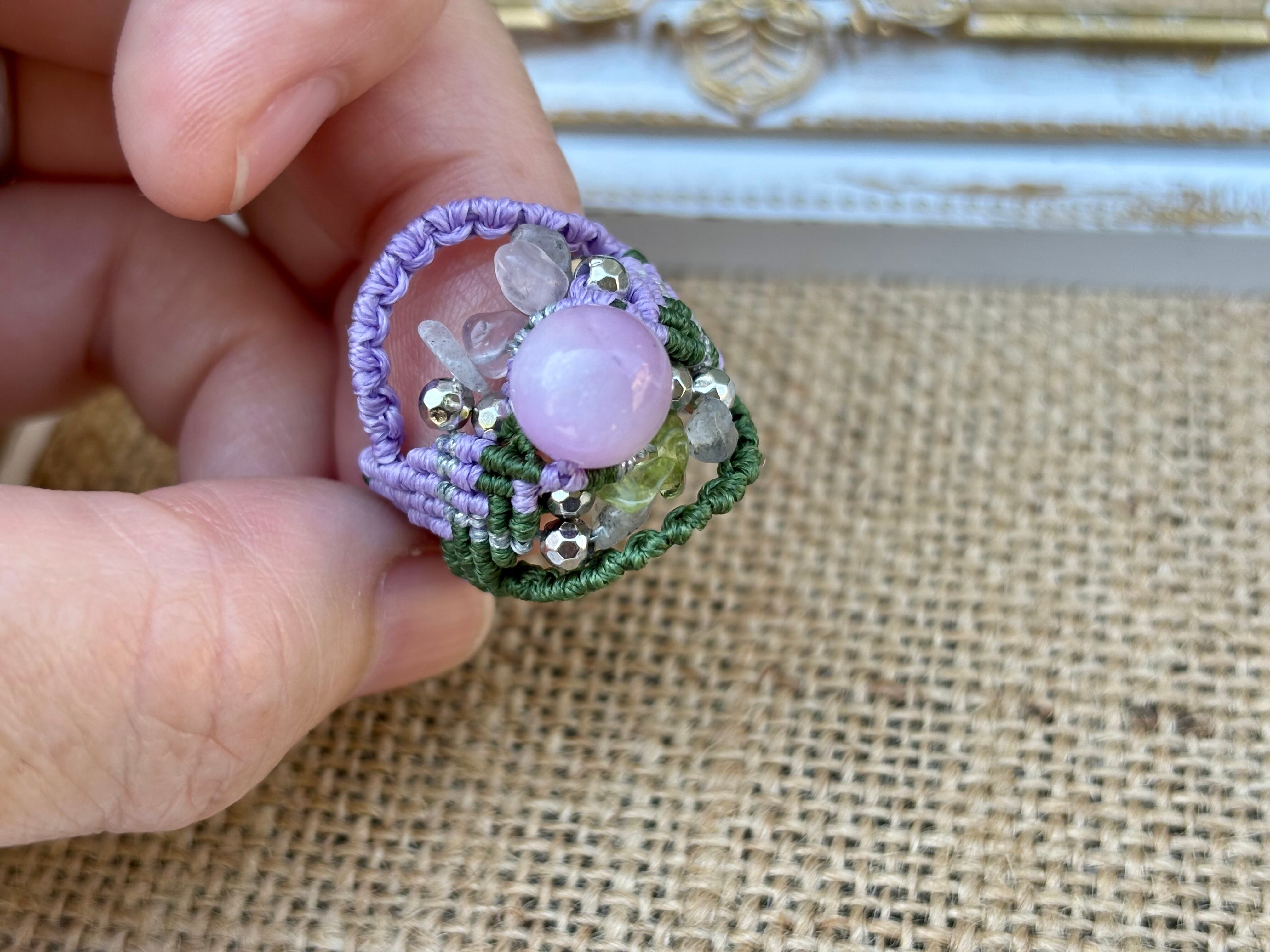 #755ふわきゃわクンツァイト♡(クンツァイト×ラブラドライト×ペリドット×ローズクォーツ マクラメ編みリング/指輪)