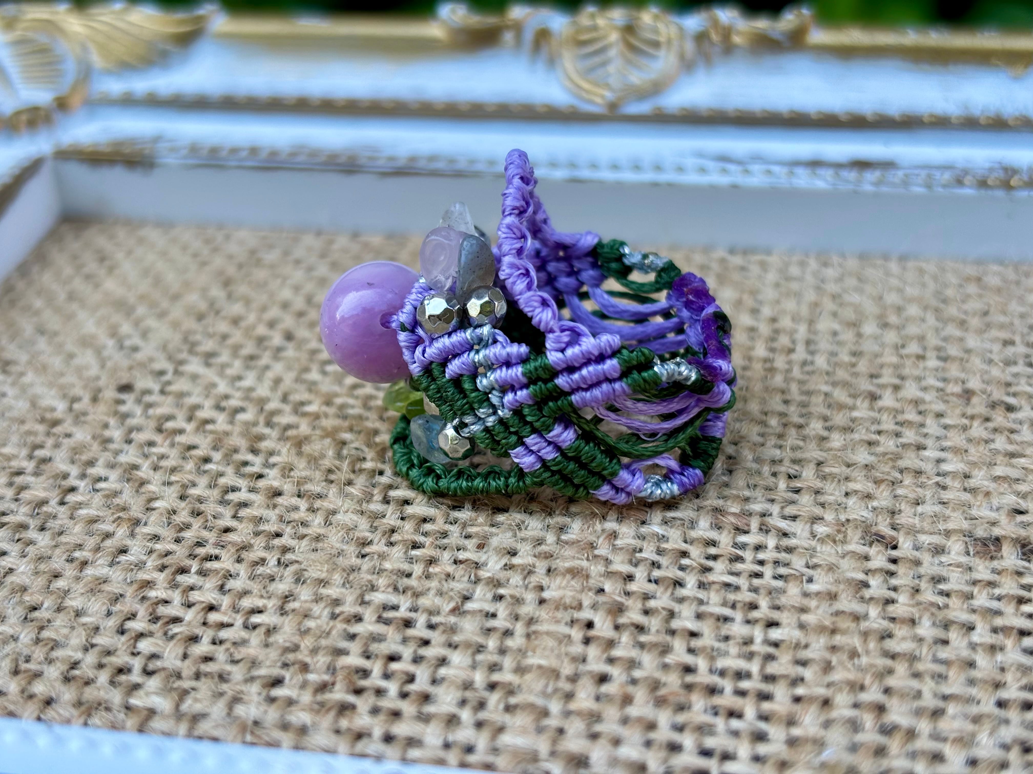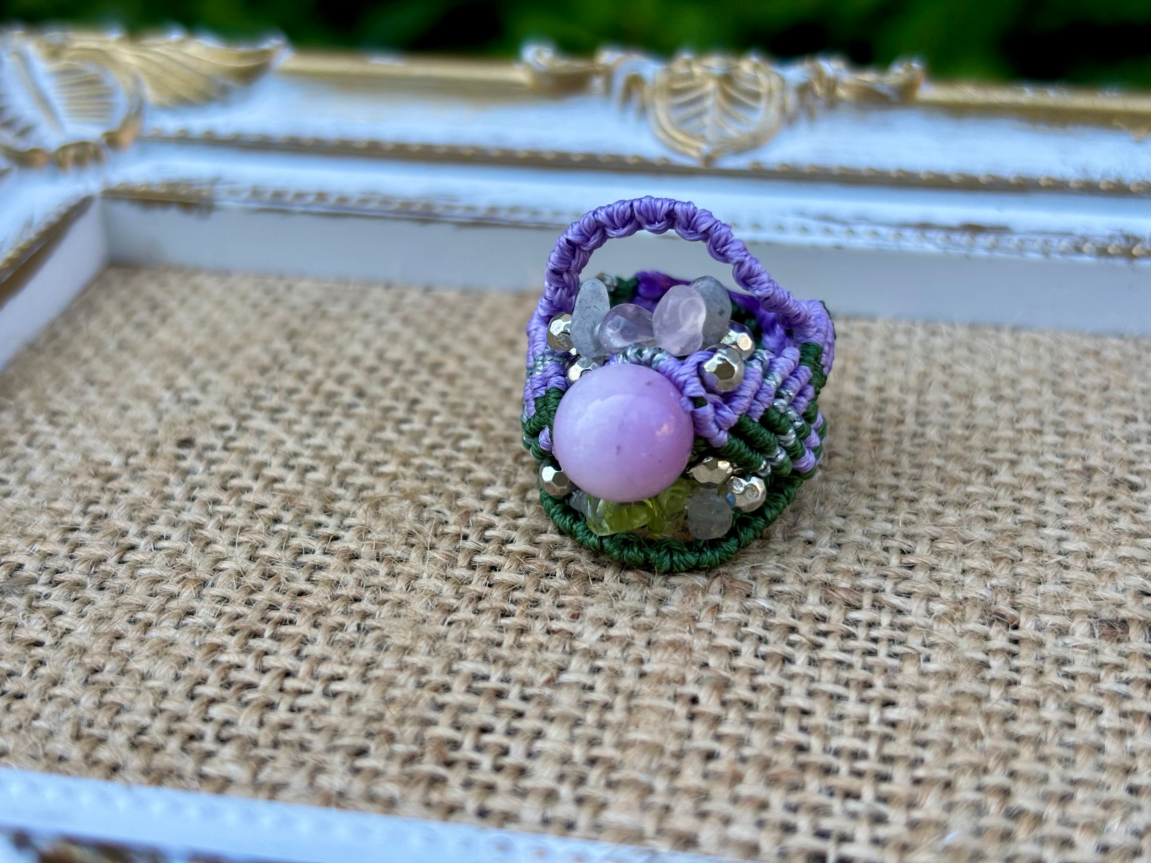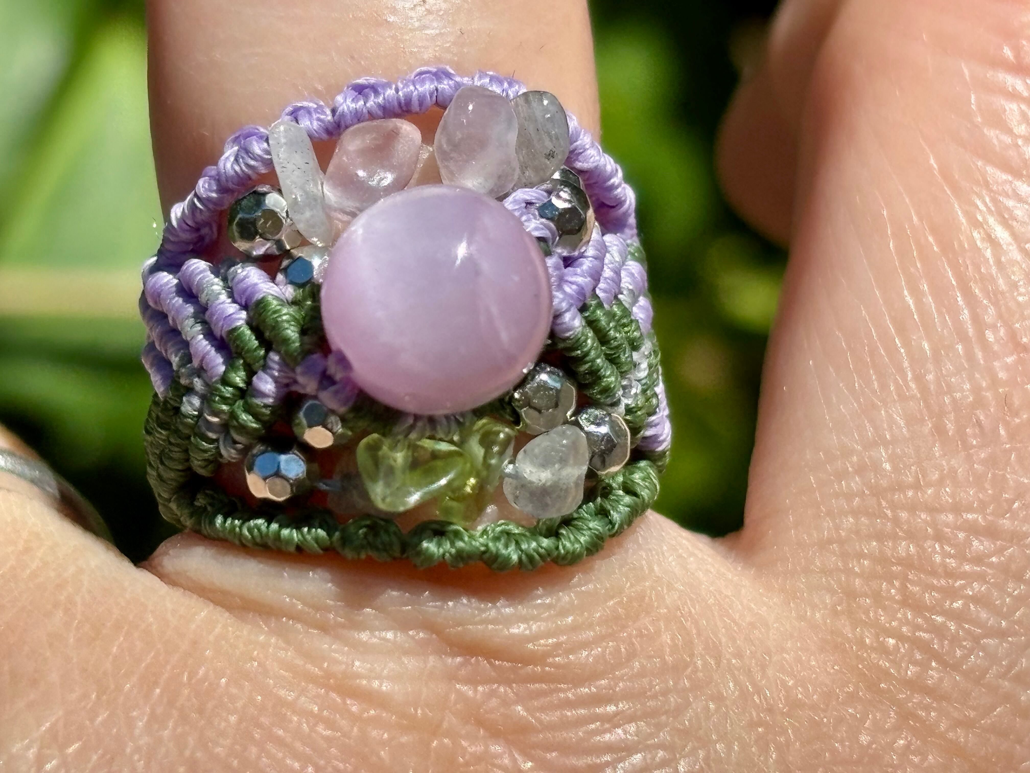 #755ふわきゃわクンツァイト♡(クンツァイト×ラブラドライト×ペリドット×ローズクォーツ マクラメ編みリング/指輪)