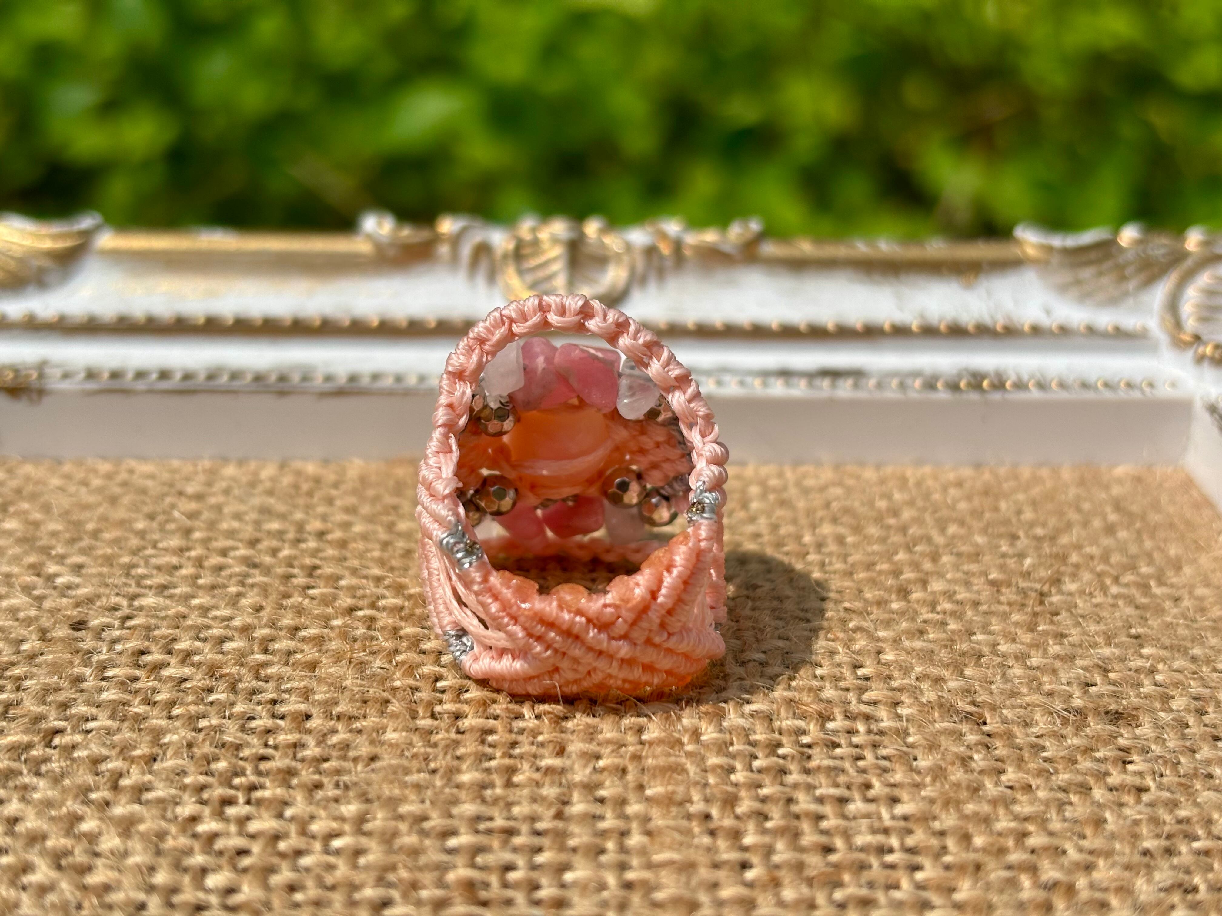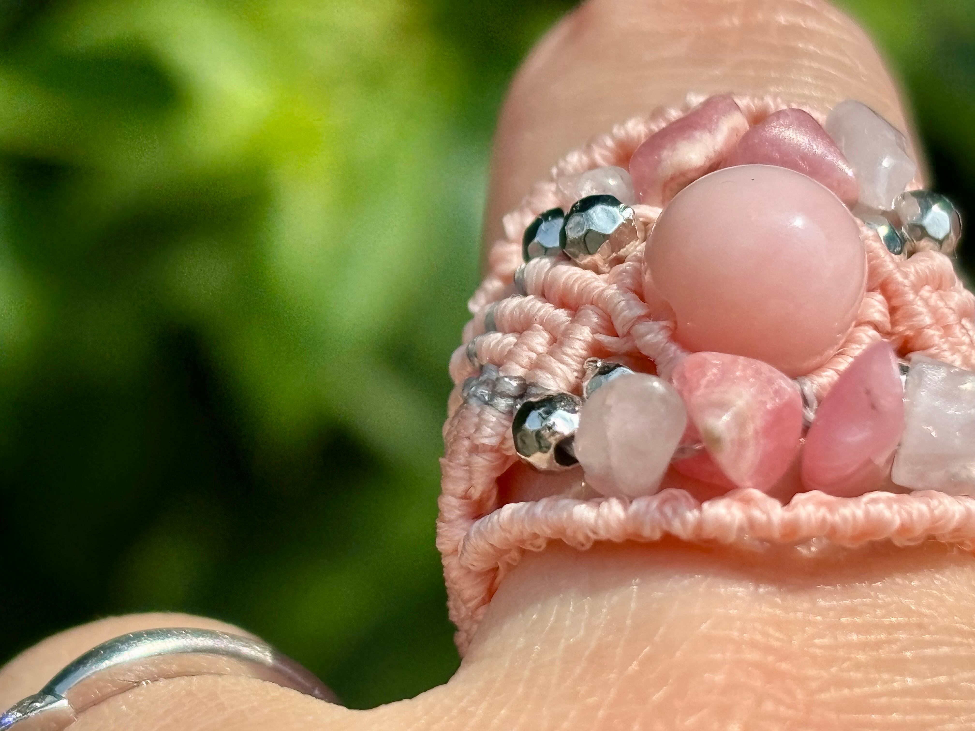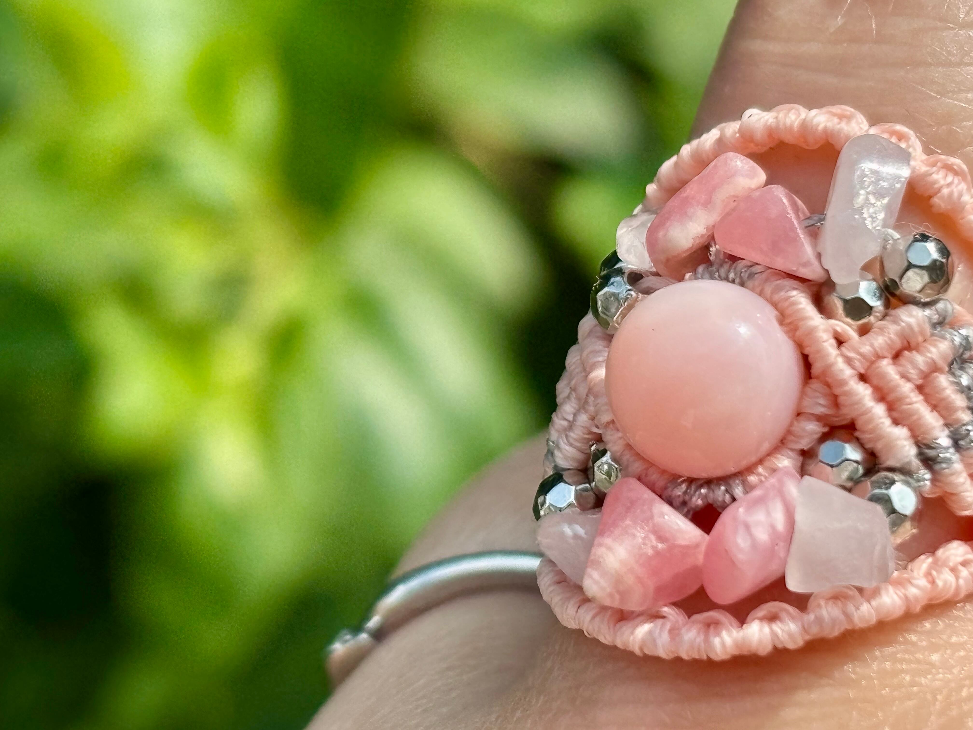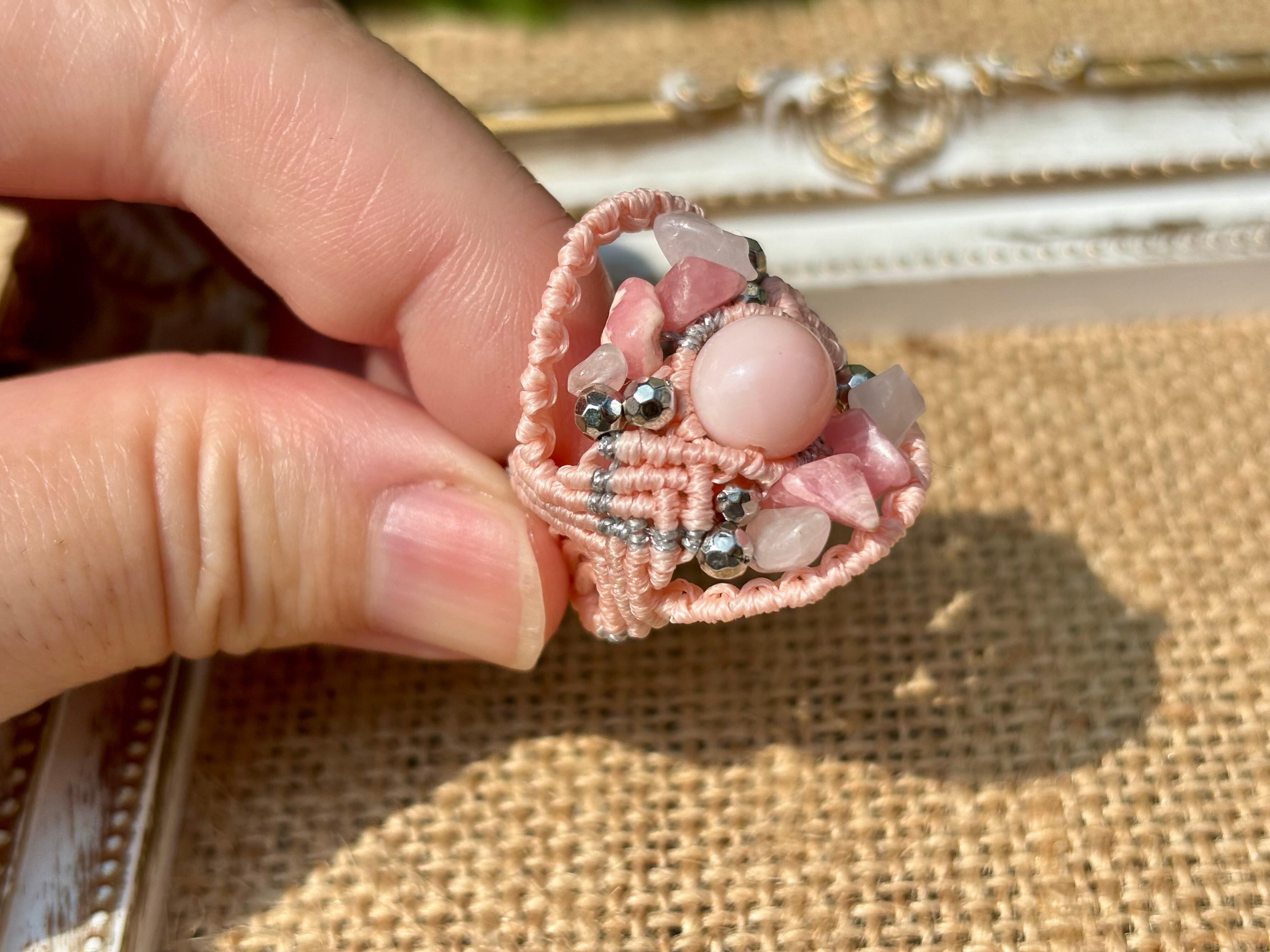 #779最高級ピンクオパール5A♡(ピンクオパール×インカローズ×ローズクォーツ マクラメ編みリング/指輪)