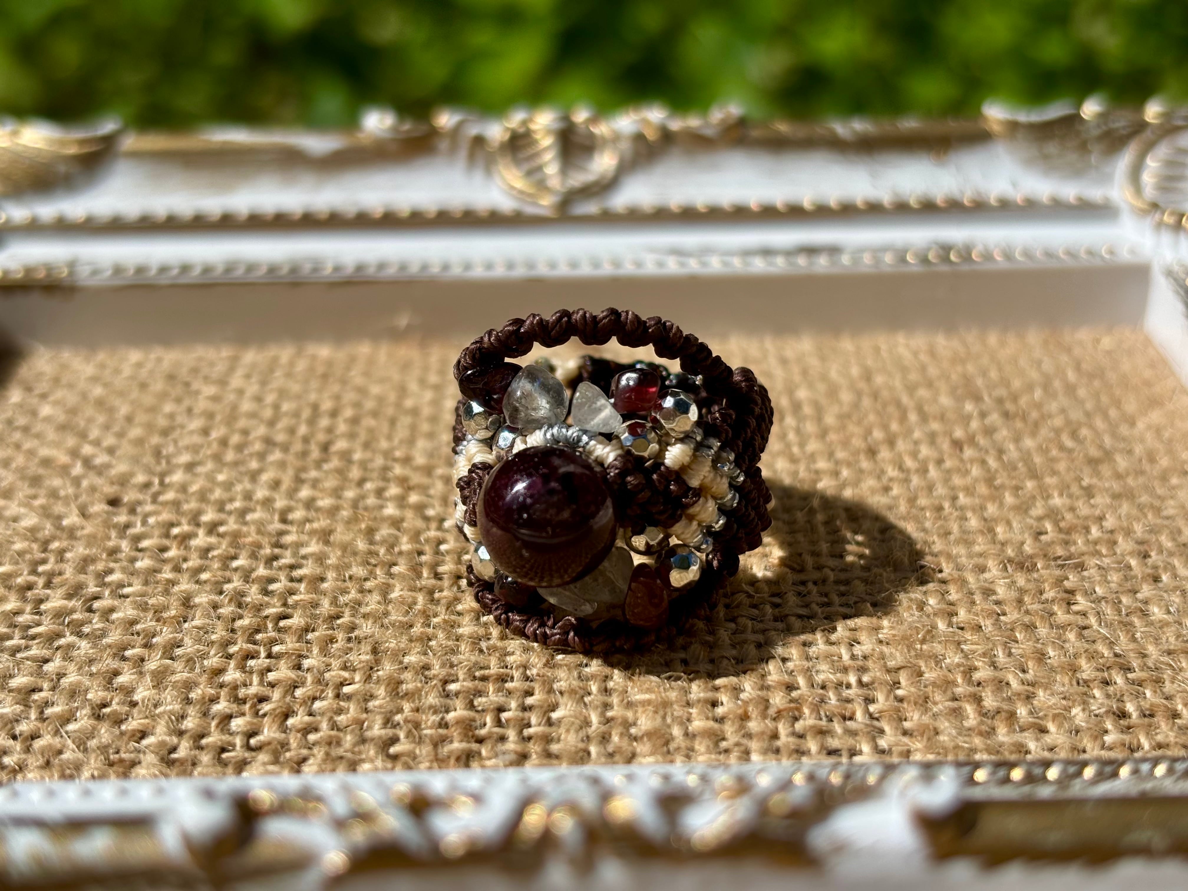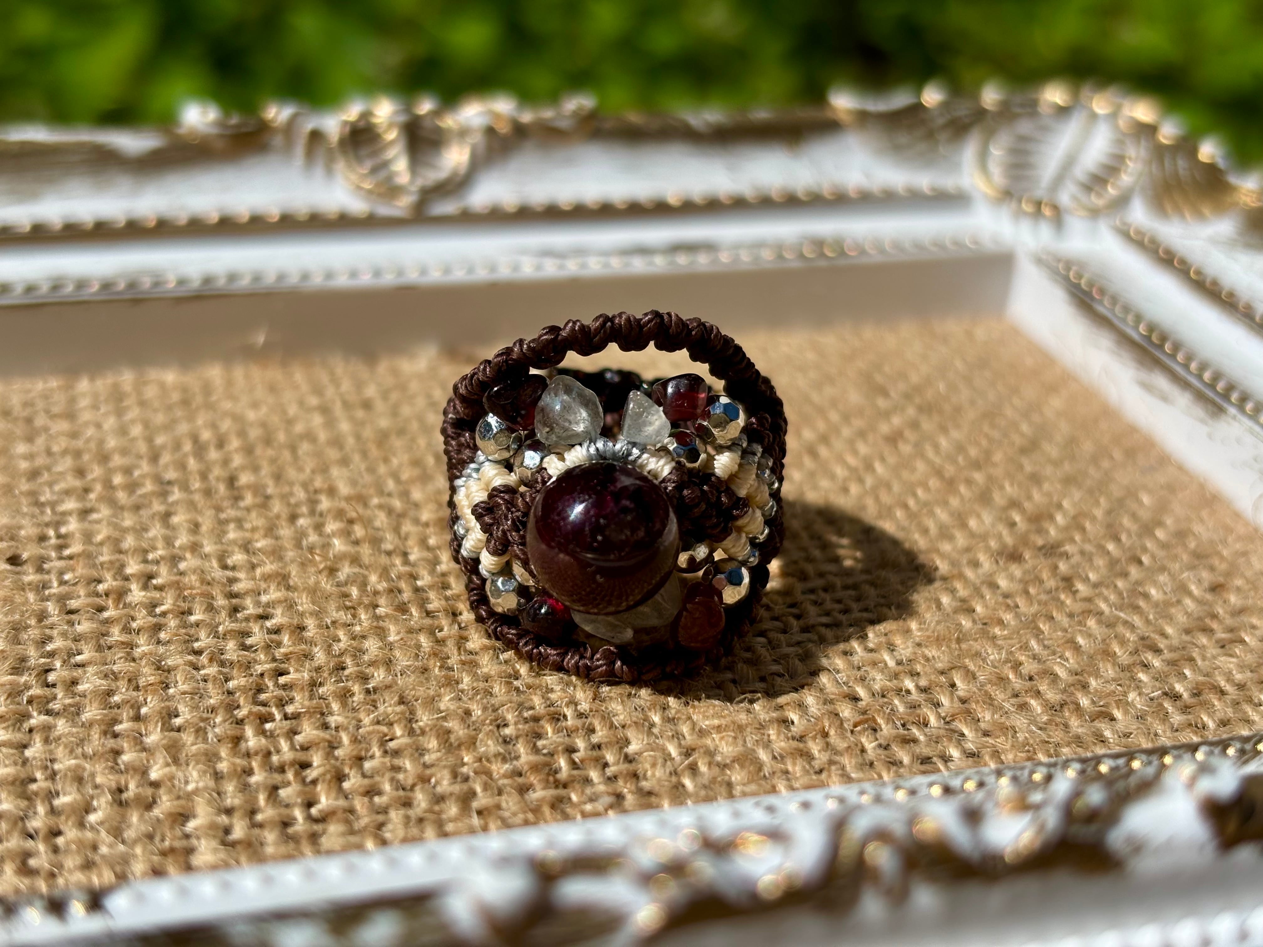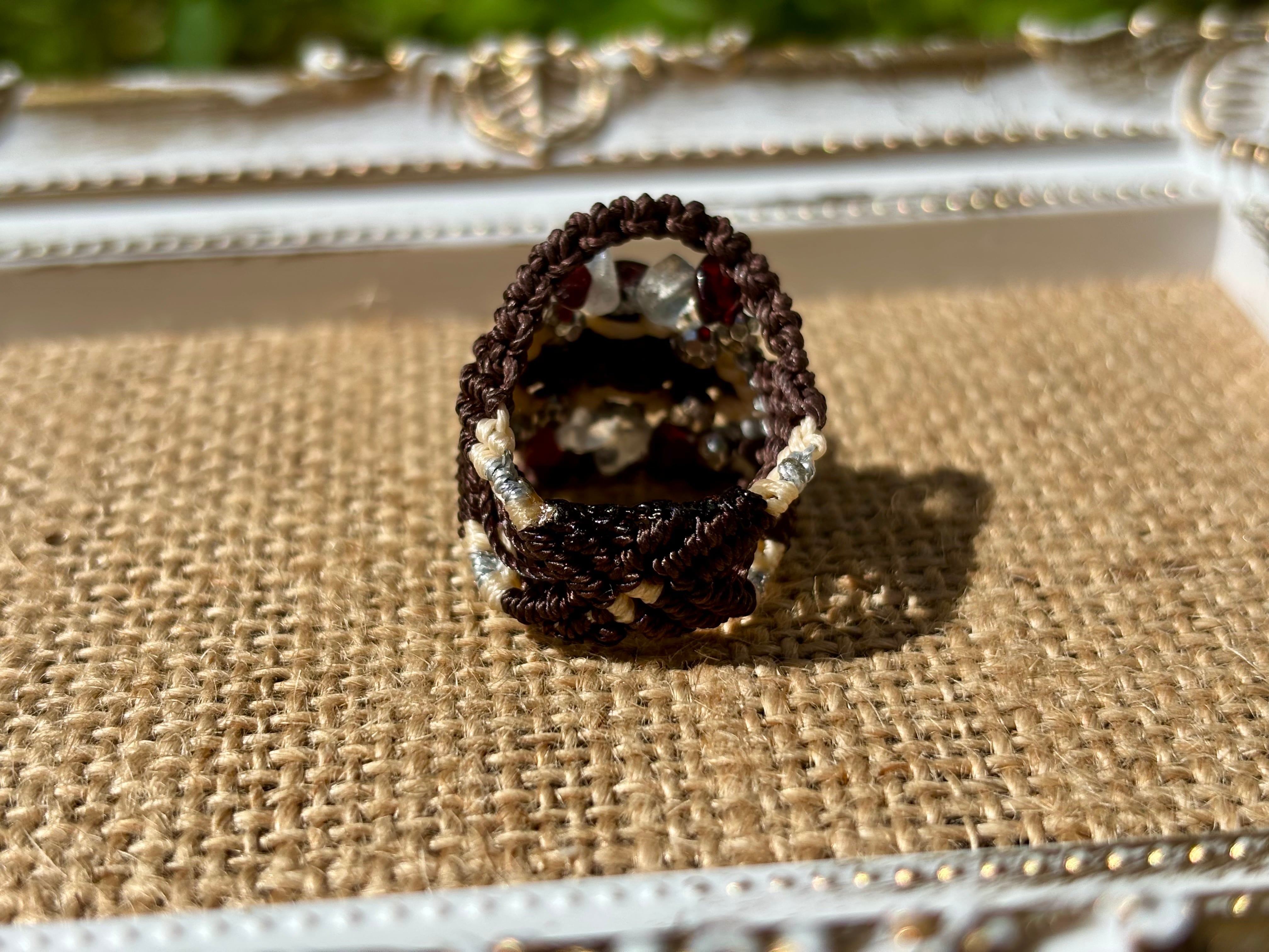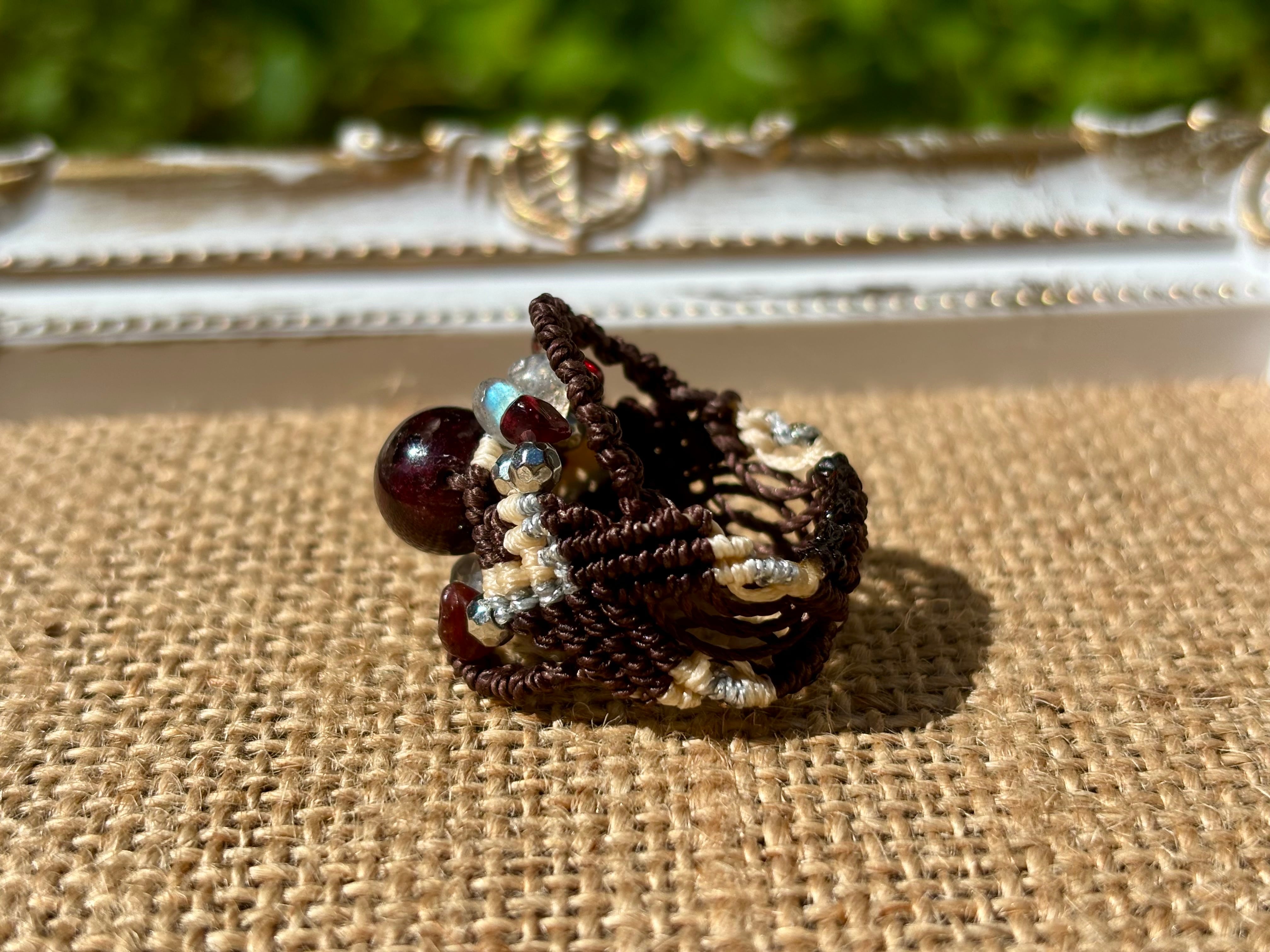 #810ブラウントルマリン一点物(ブラウントルマリン×ラブラドライト×ガーネット マクラメ編みリング/指輪)
