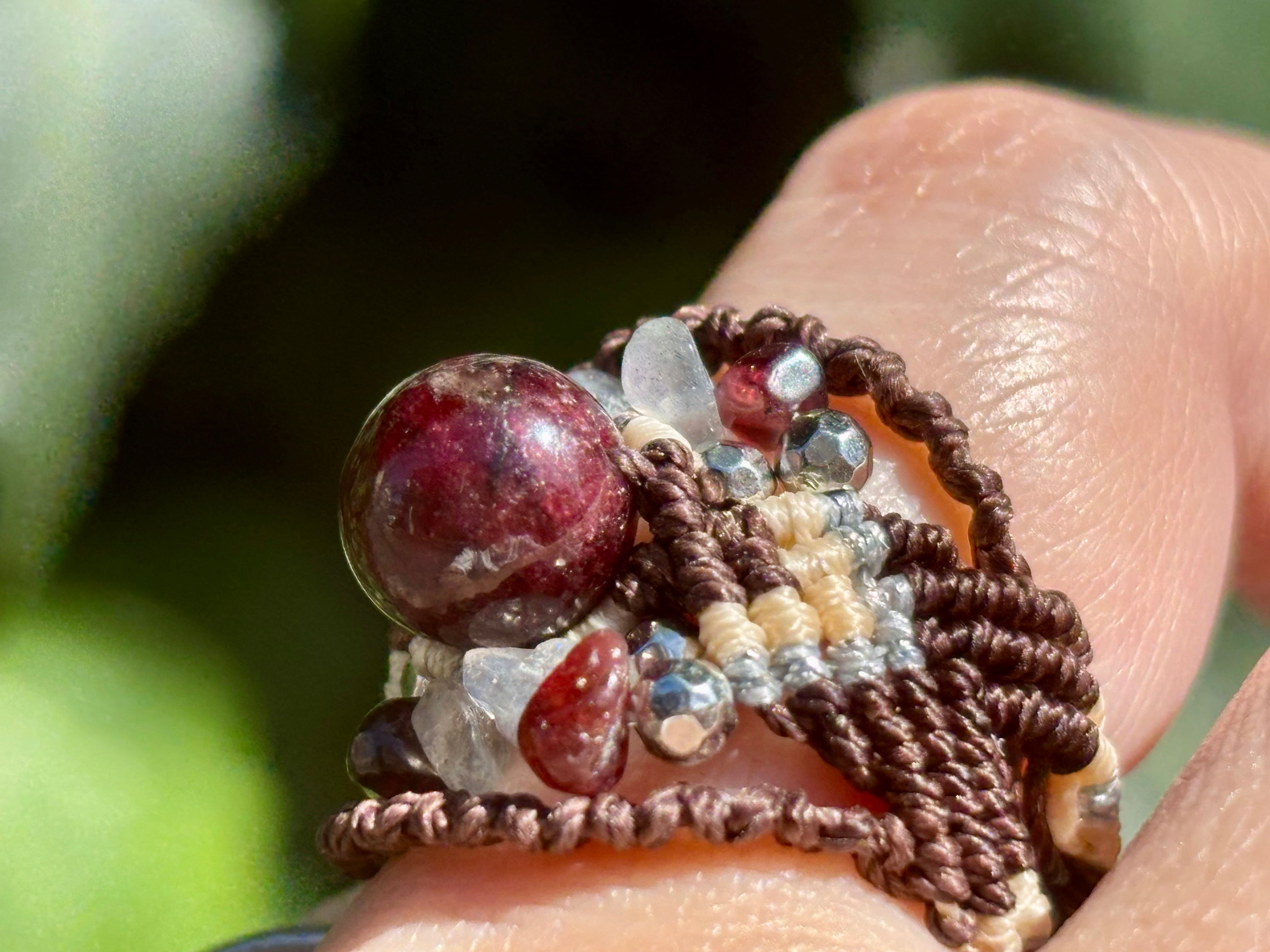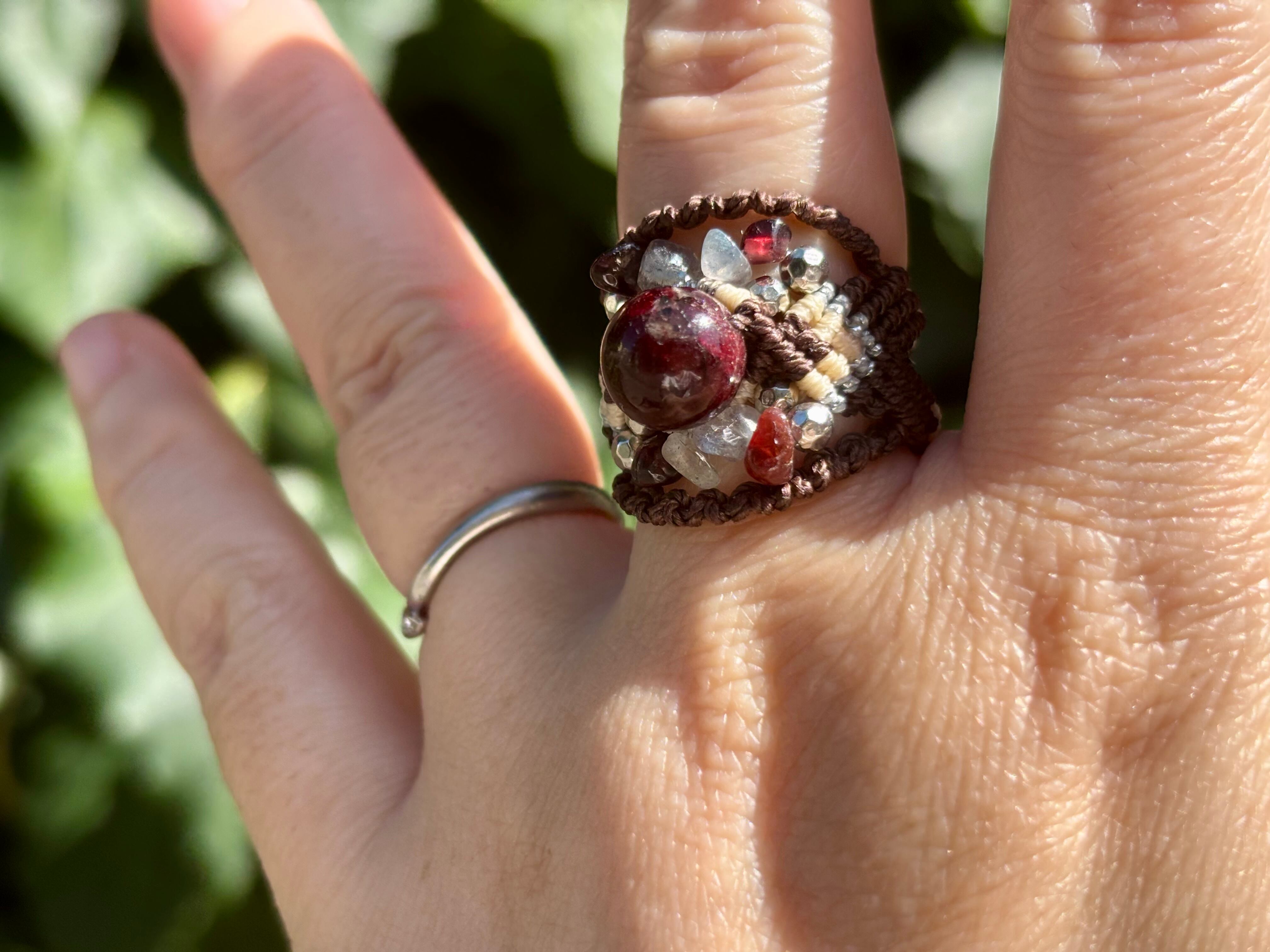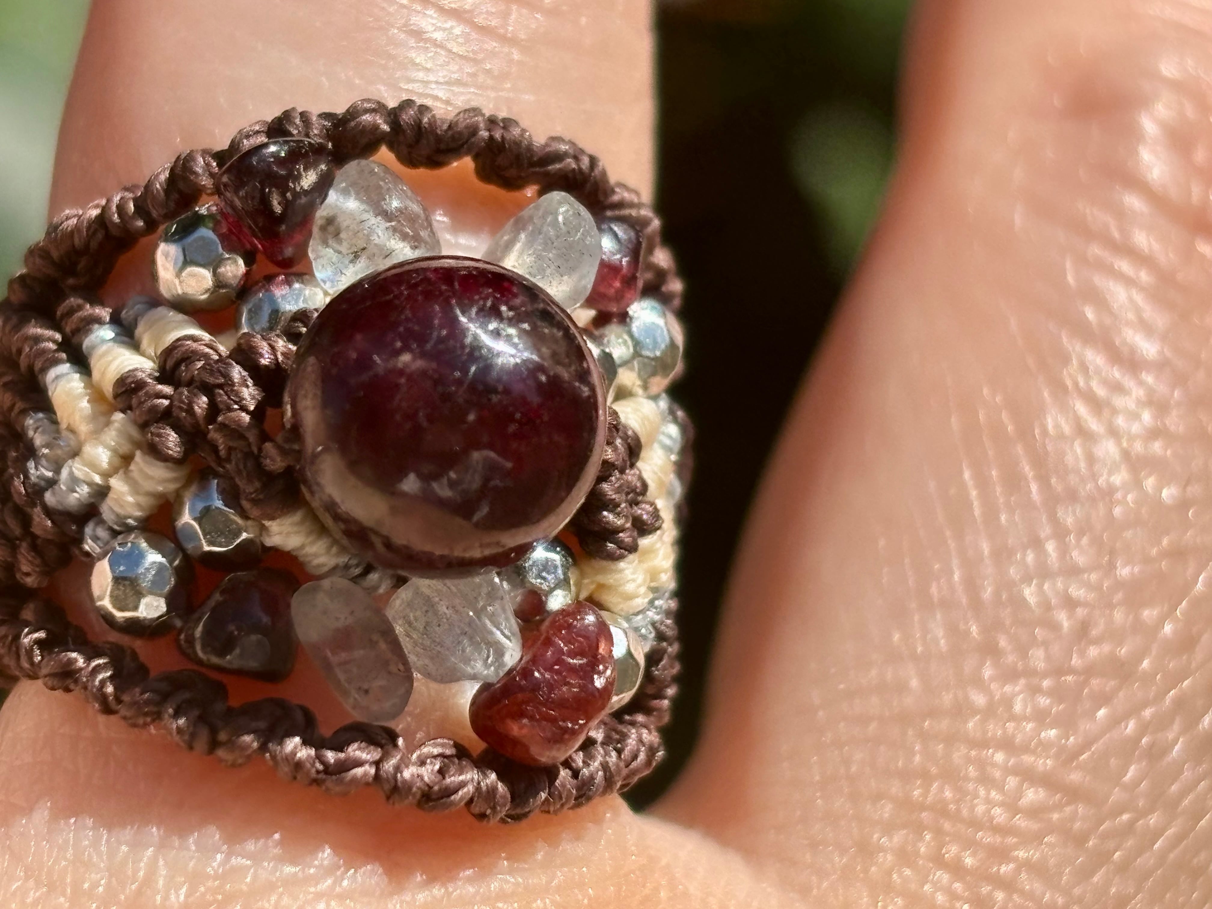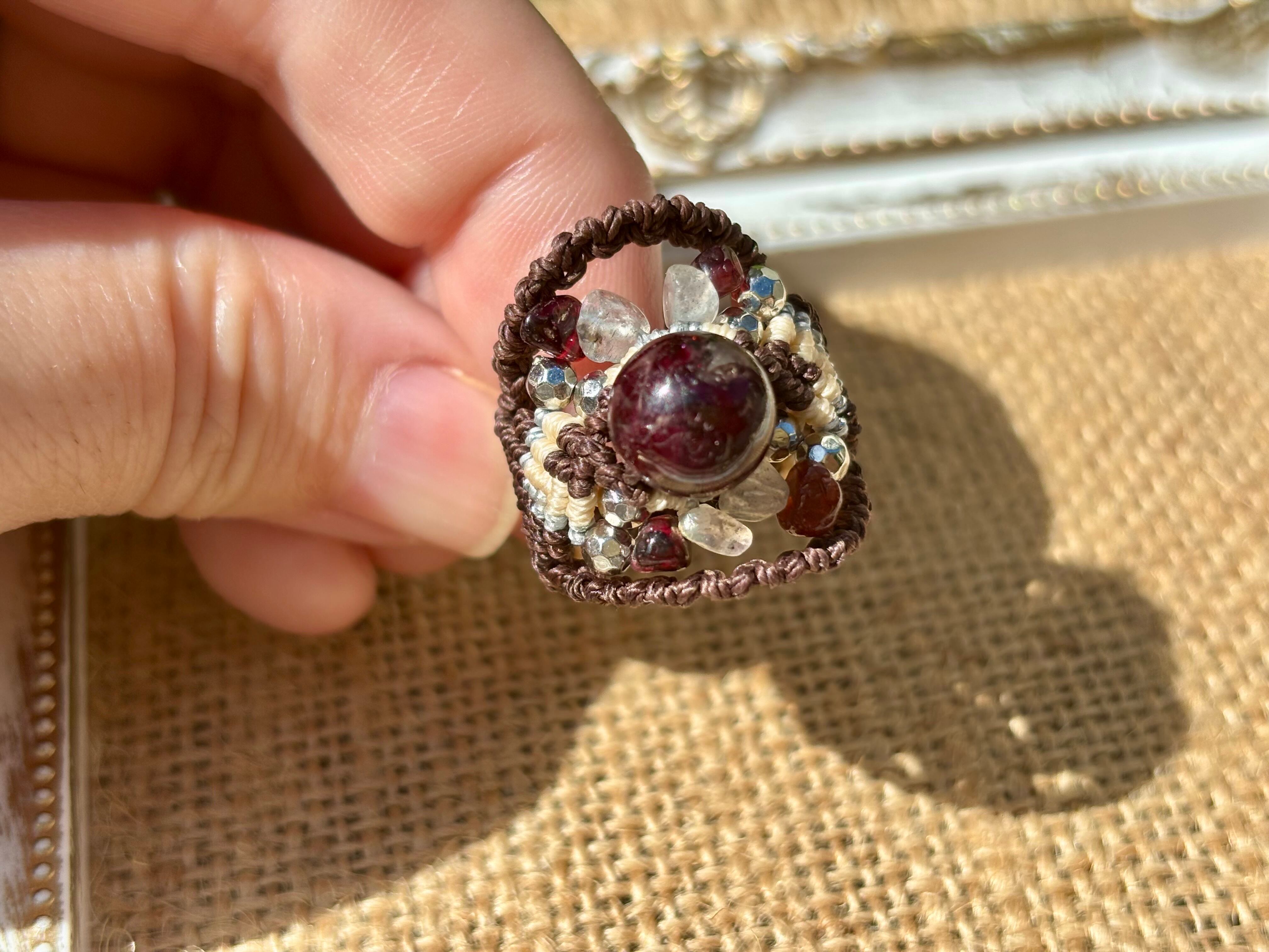 #810ブラウントルマリン一点物(ブラウントルマリン×ラブラドライト×ガーネット マクラメ編みリング/指輪)