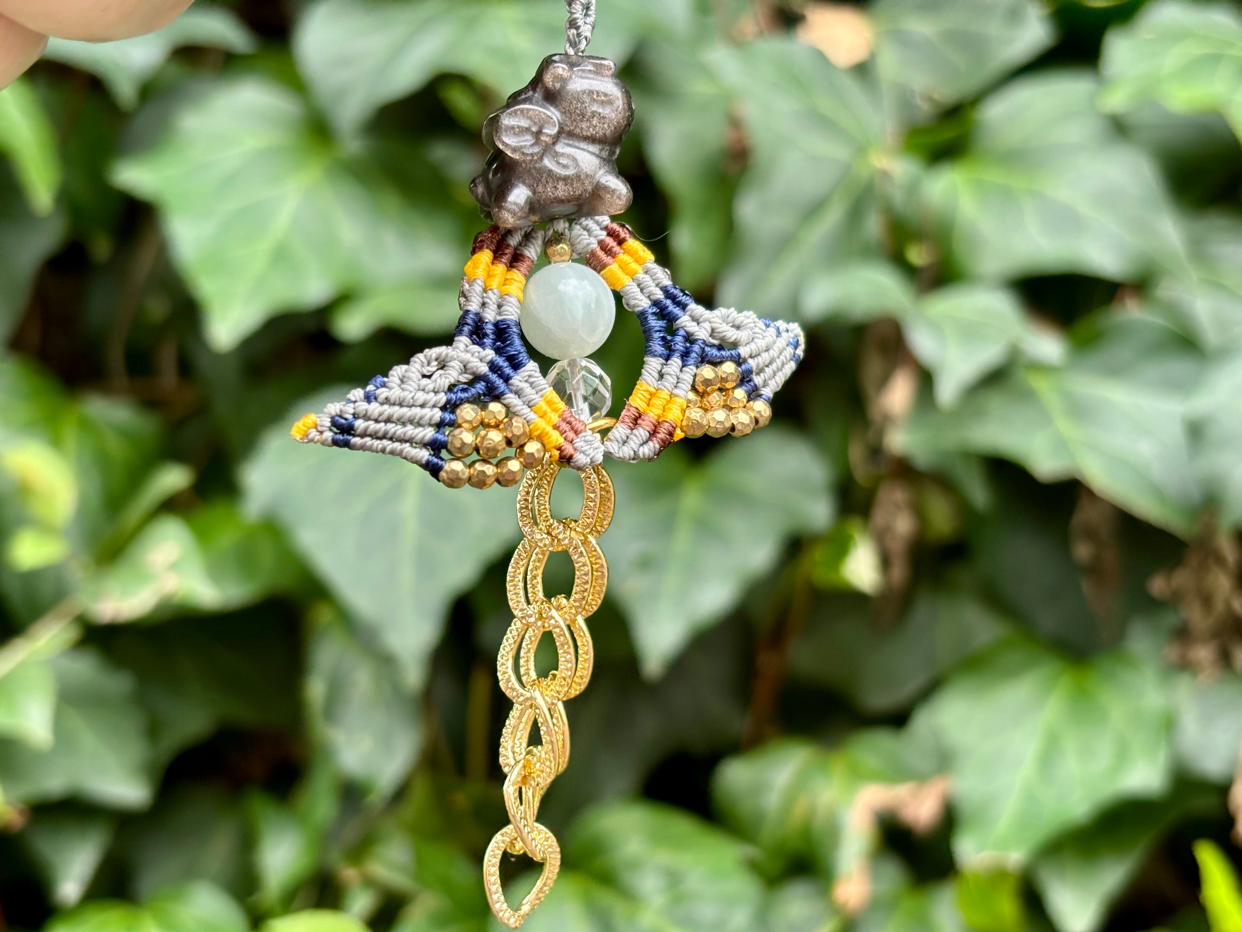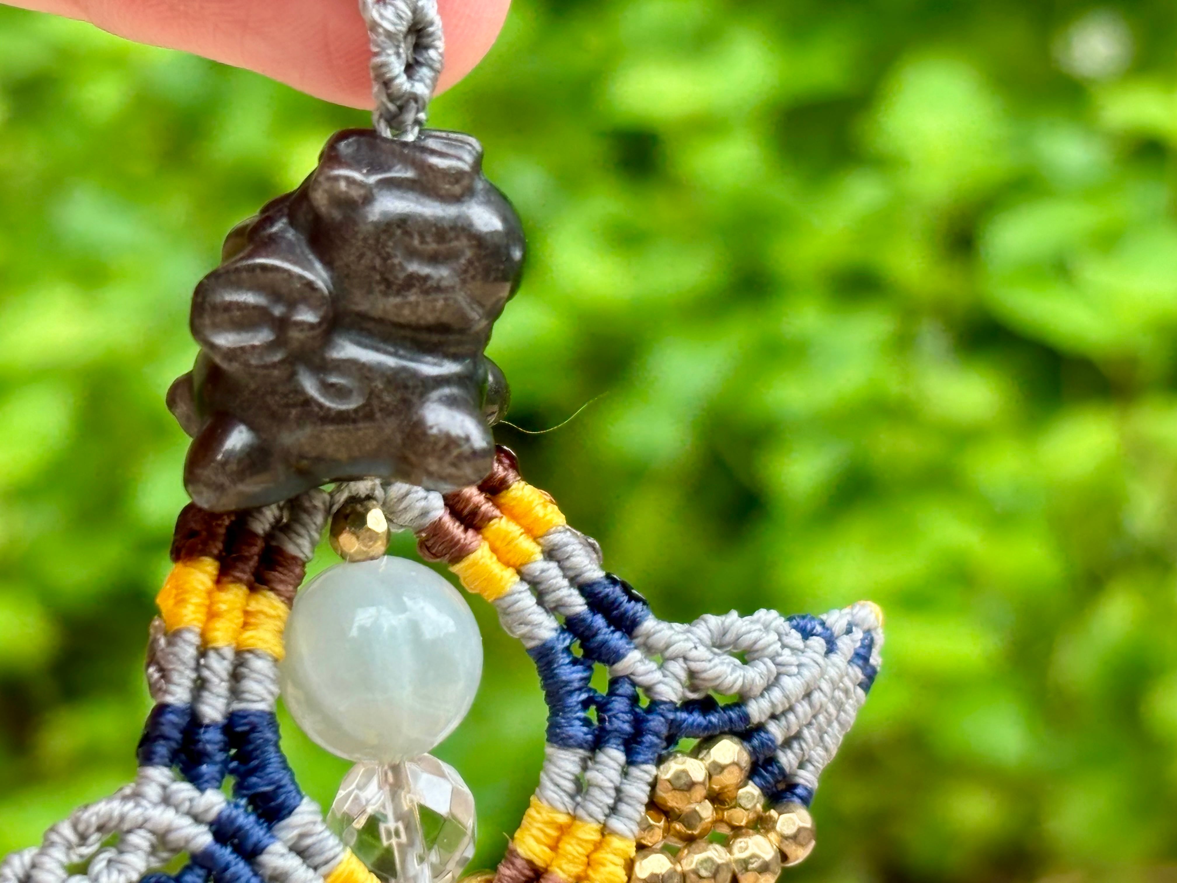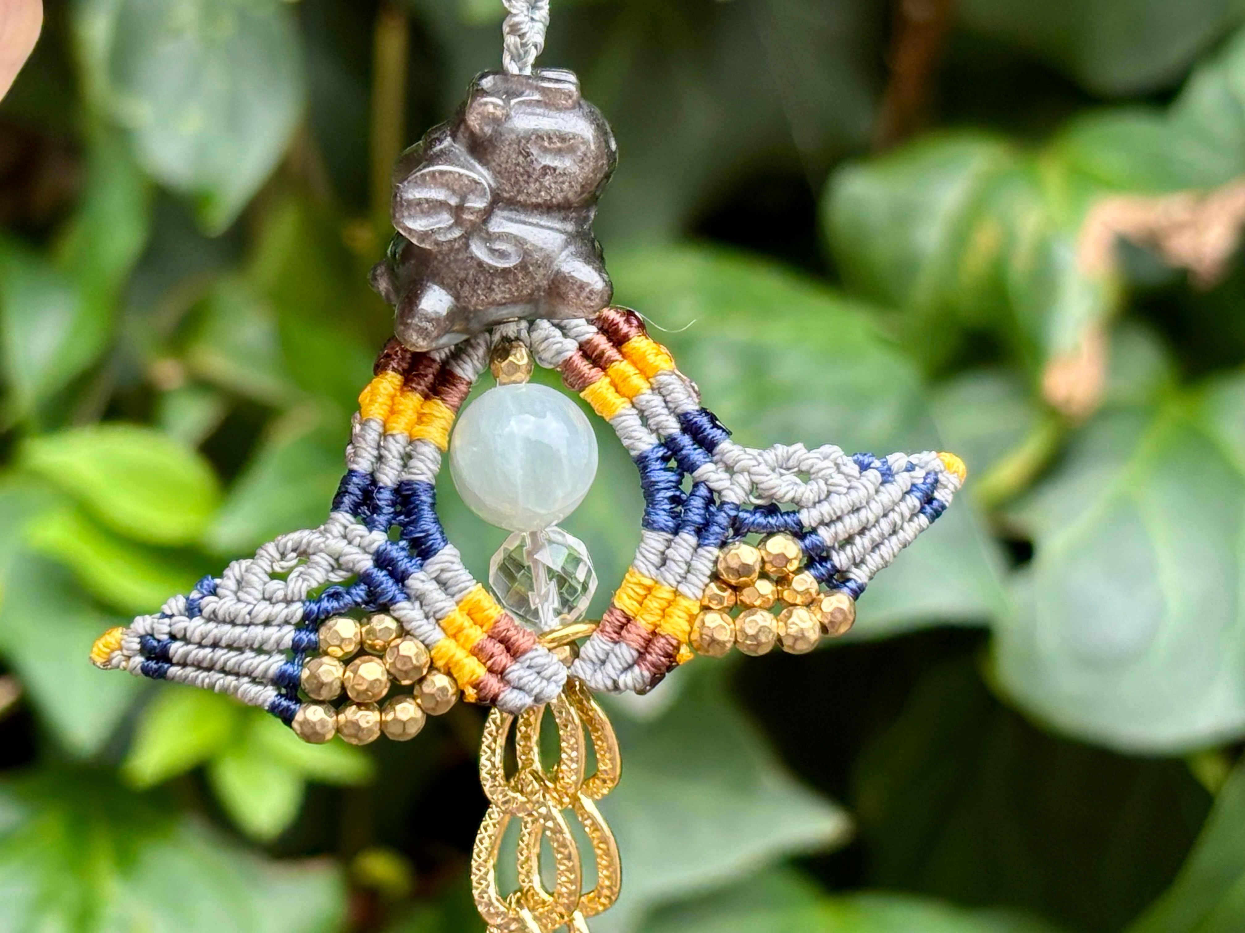 #828 干支『午』シルバーオブシディアン一点物(シルバーオブシディアン×翡翠×水晶 マクラメ編みチャーム/キーホルダー)