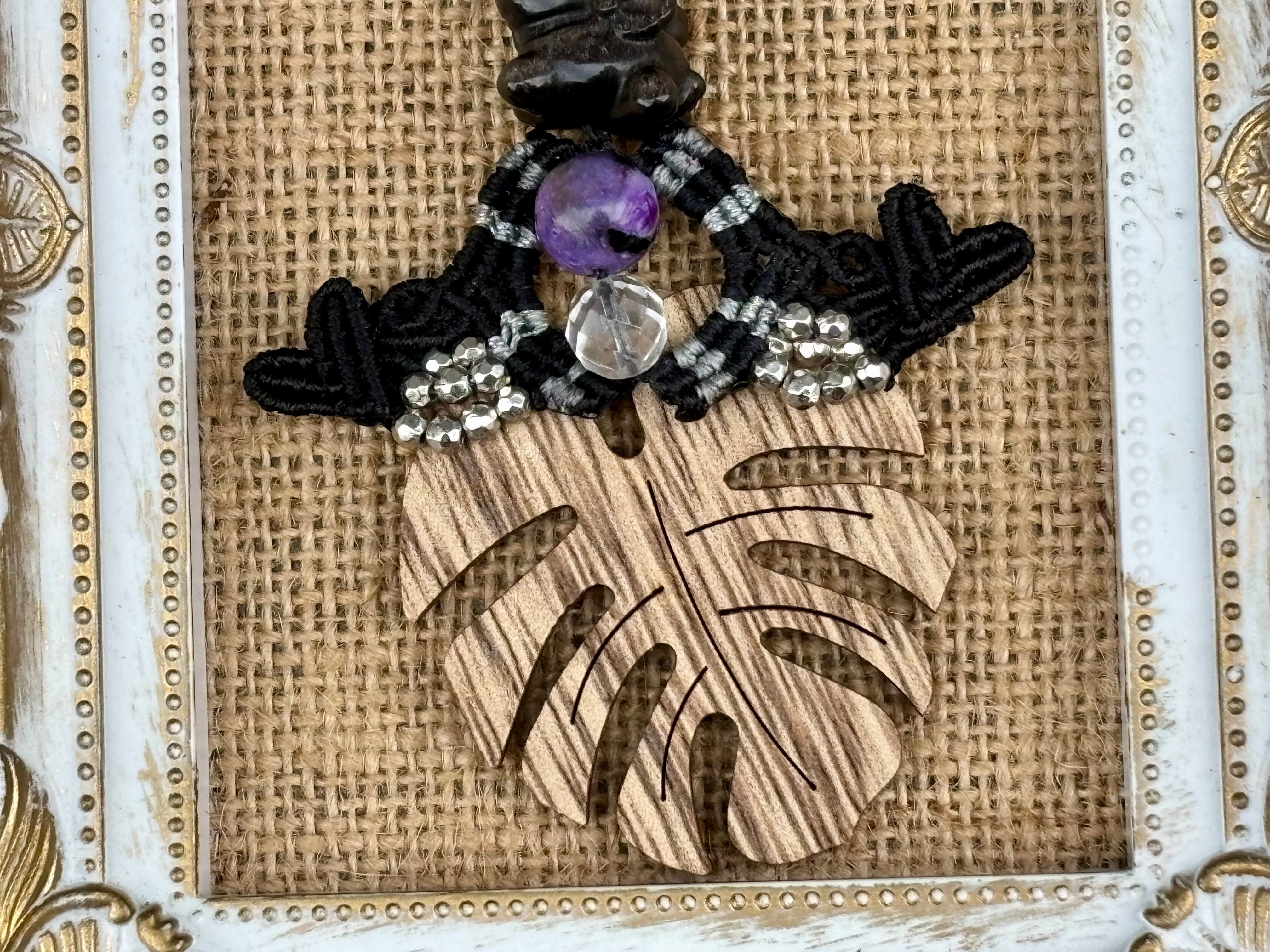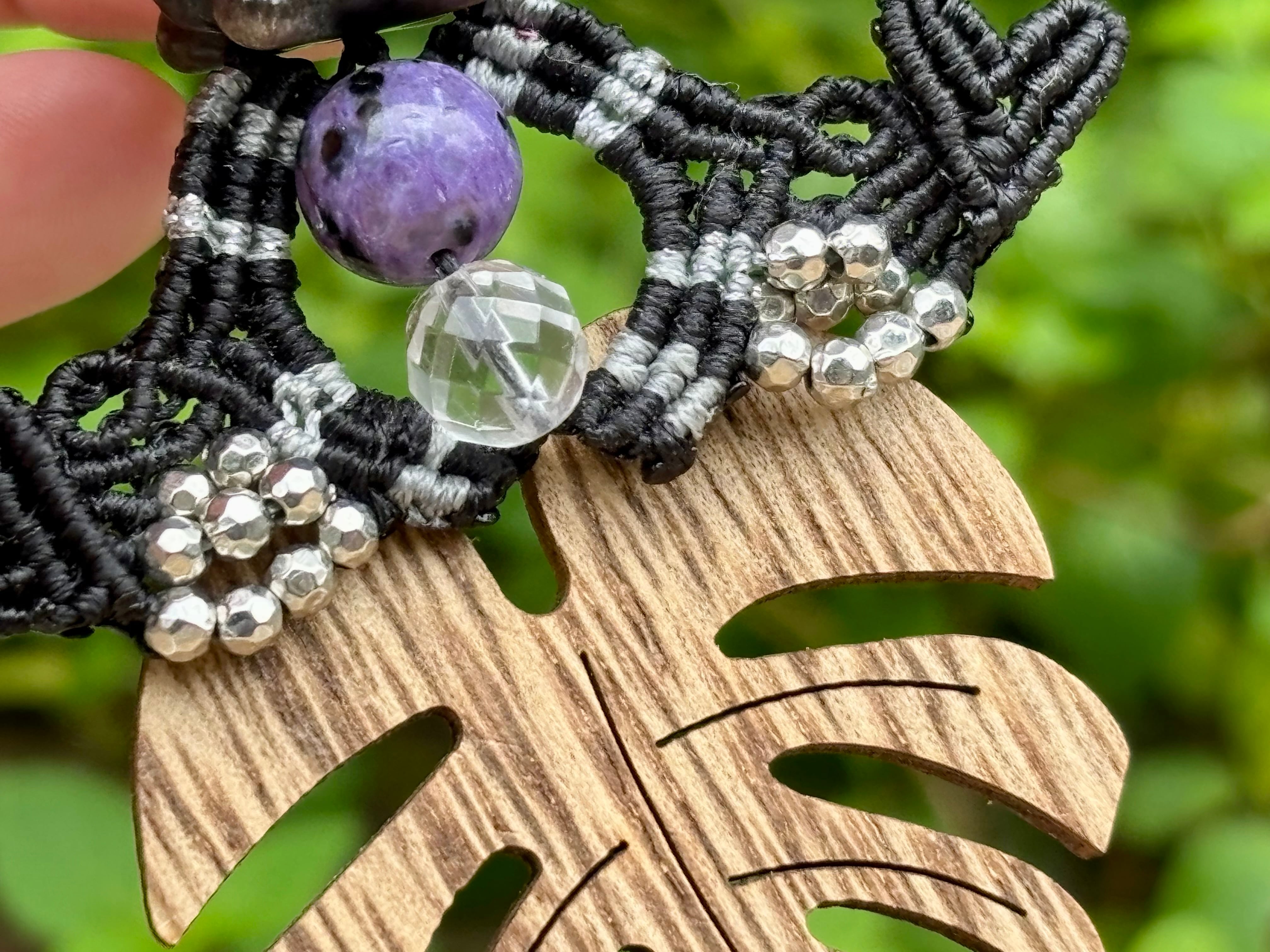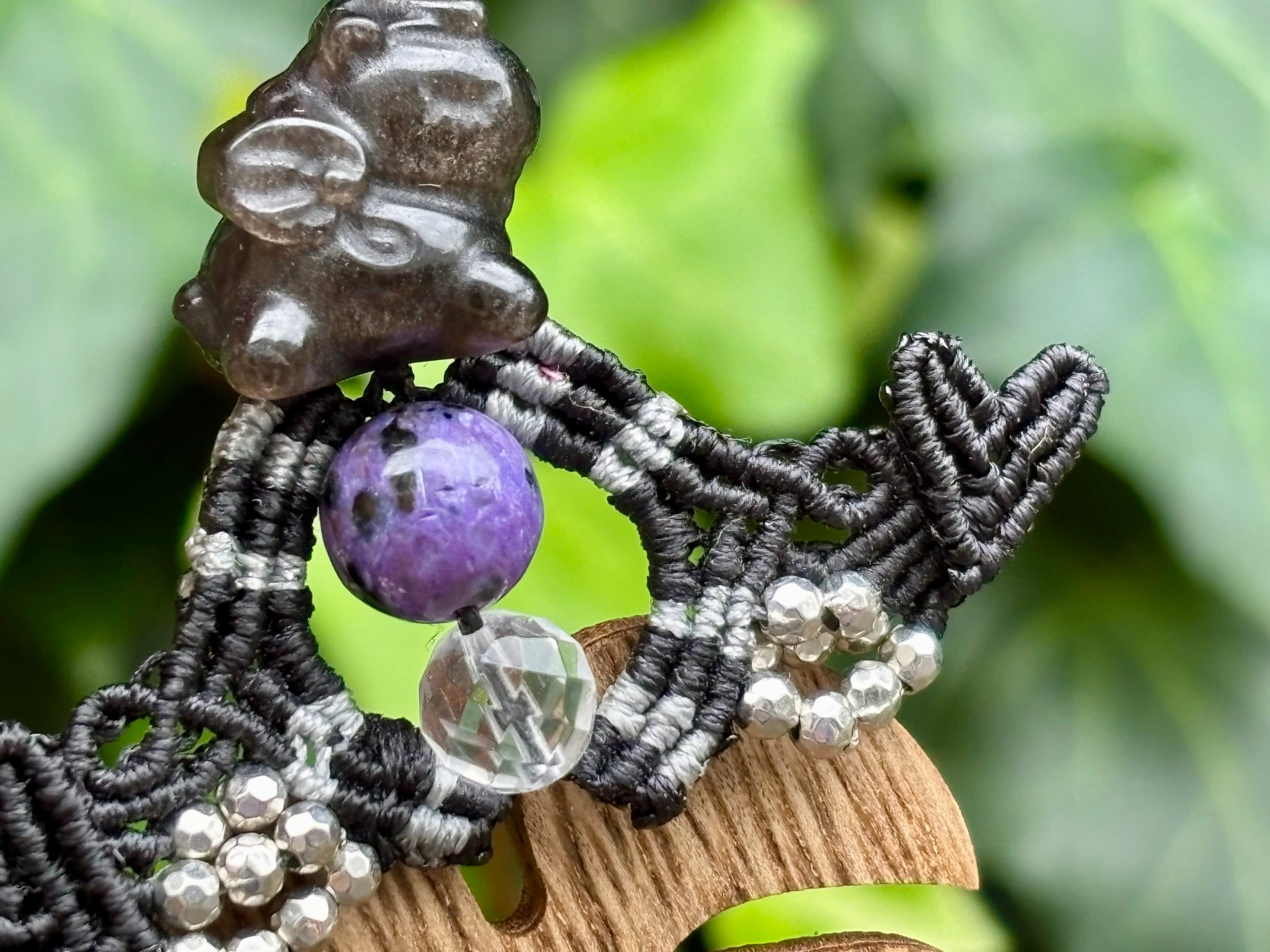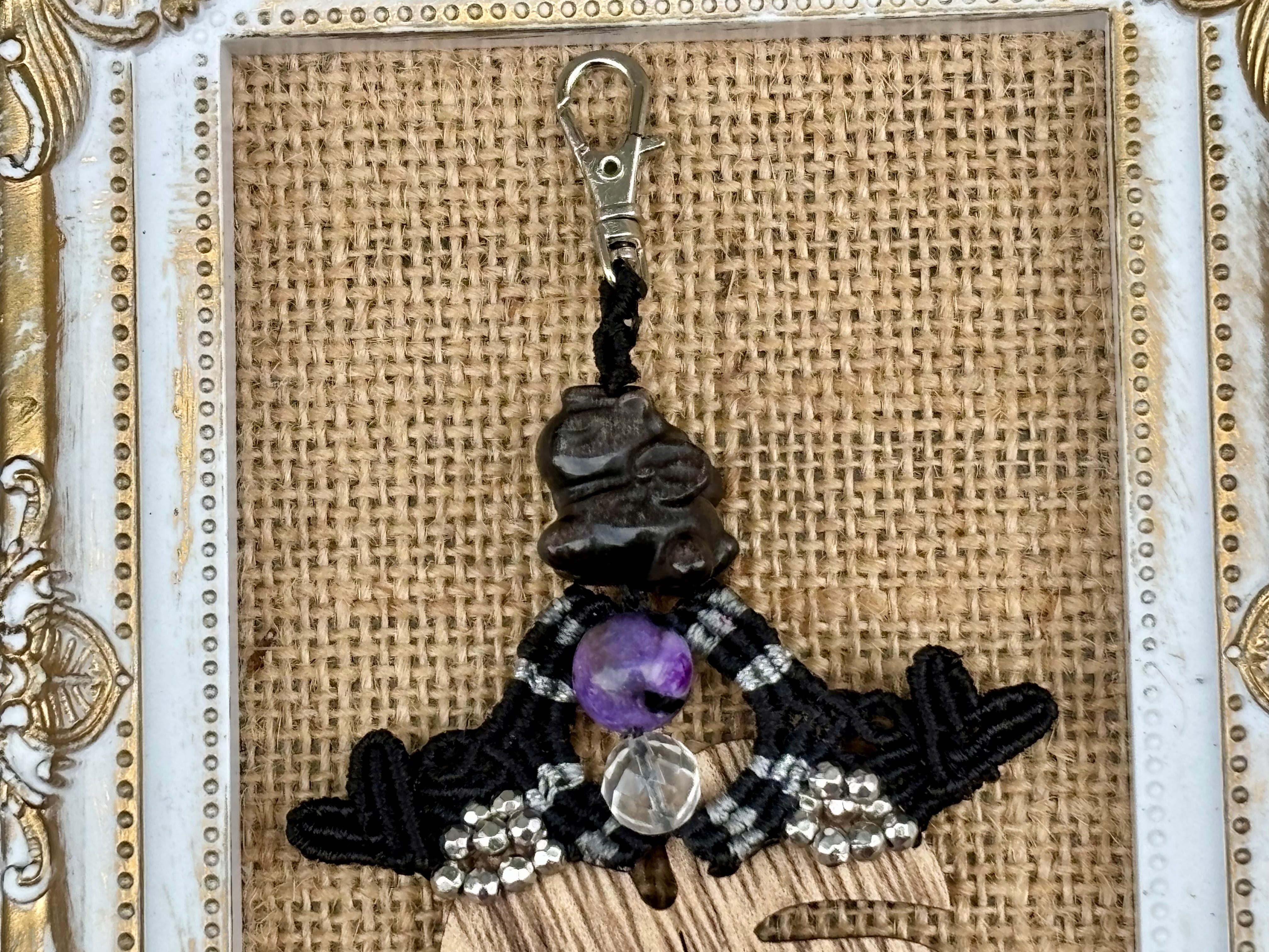 #830 干支『午』シルバーオブシディアン 一点物(シルバーオブシディアン×ブラックチャロアイト×水晶 マクラメ編みチャーム/キーホルダー)