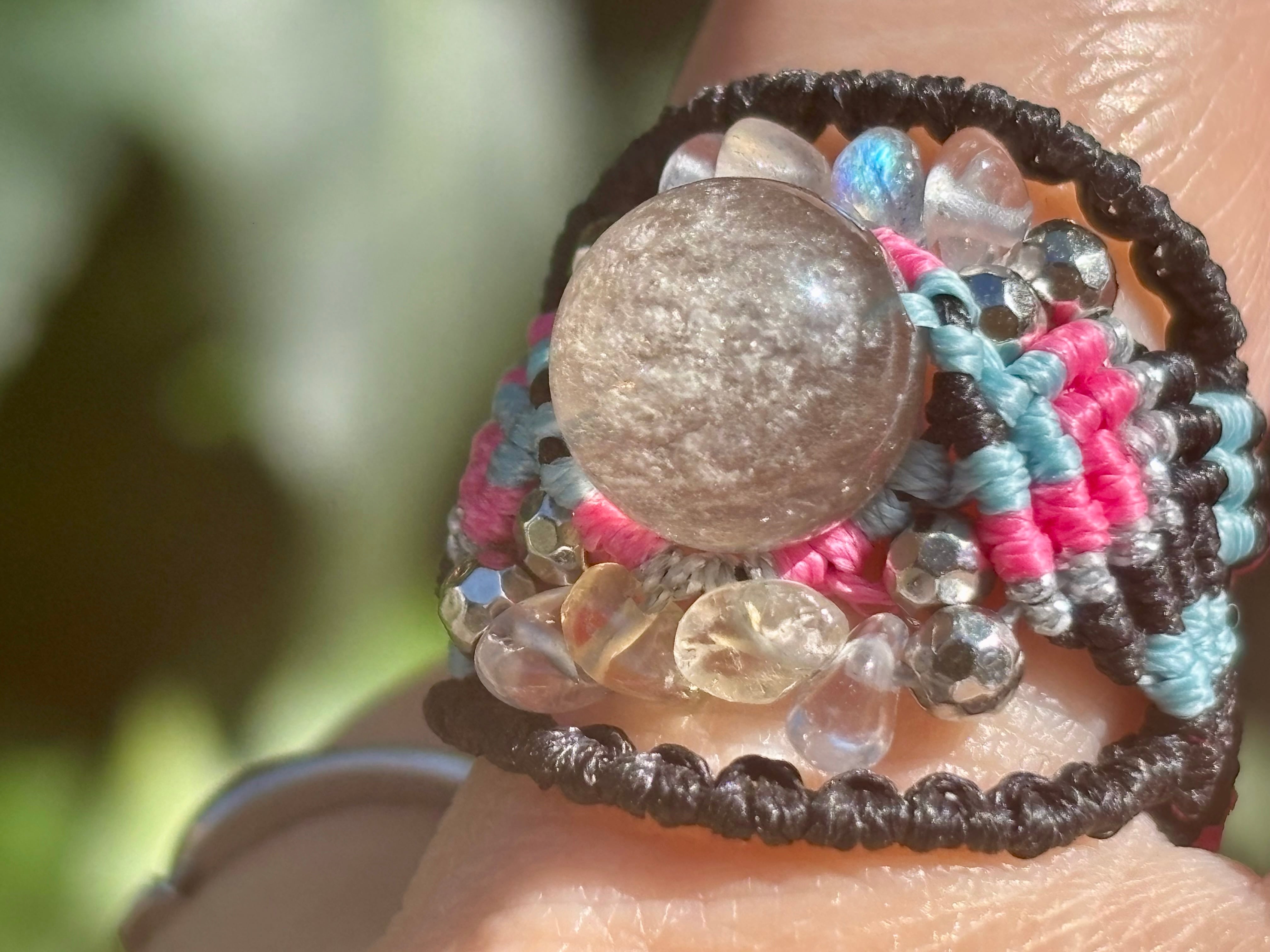 #838超希少⭐︎スモーキーリビアングラス(スモーキーリビアングラス×ラブラドライト×シトリン×水晶 マクラメ編みリング/指輪)