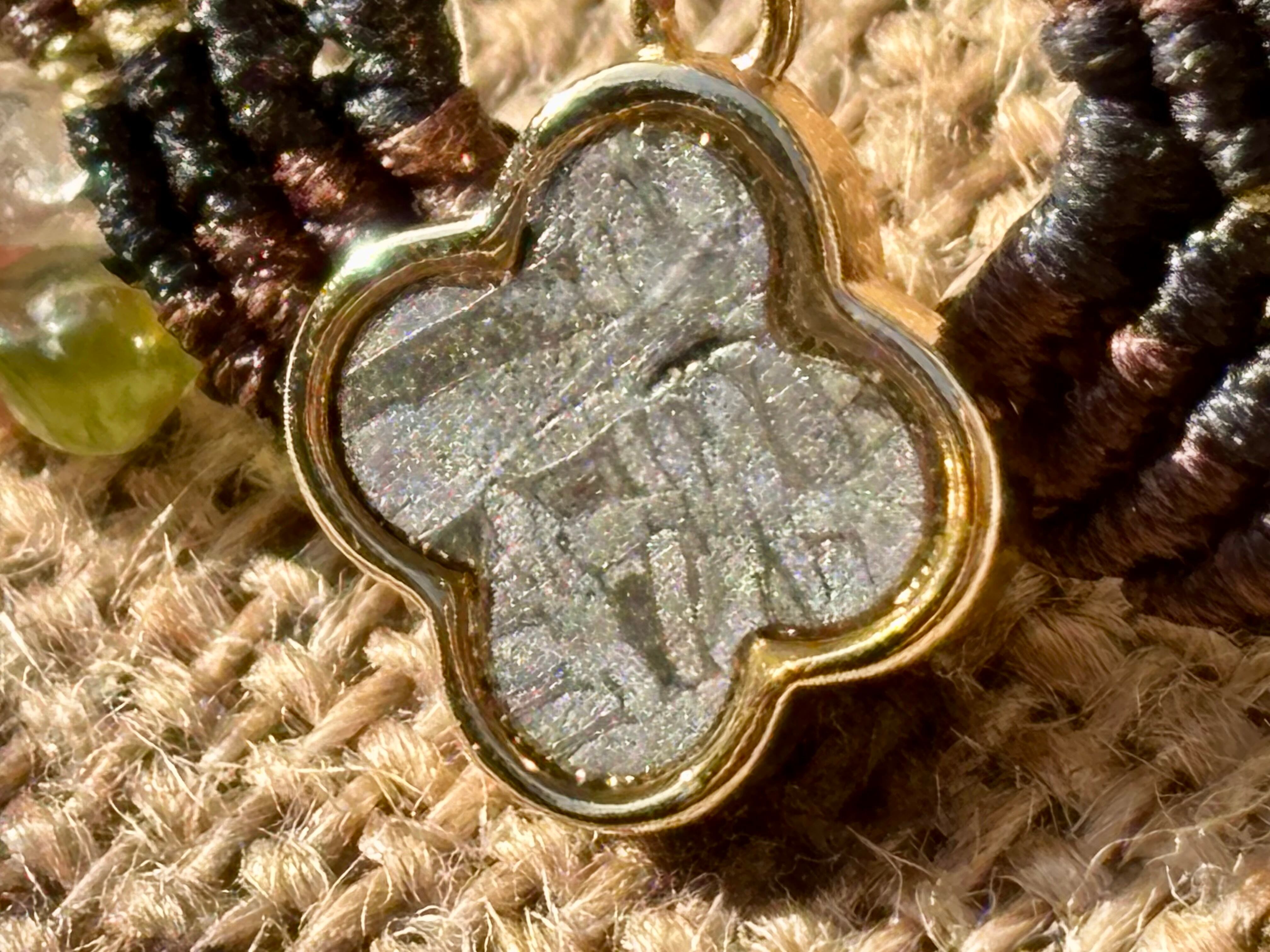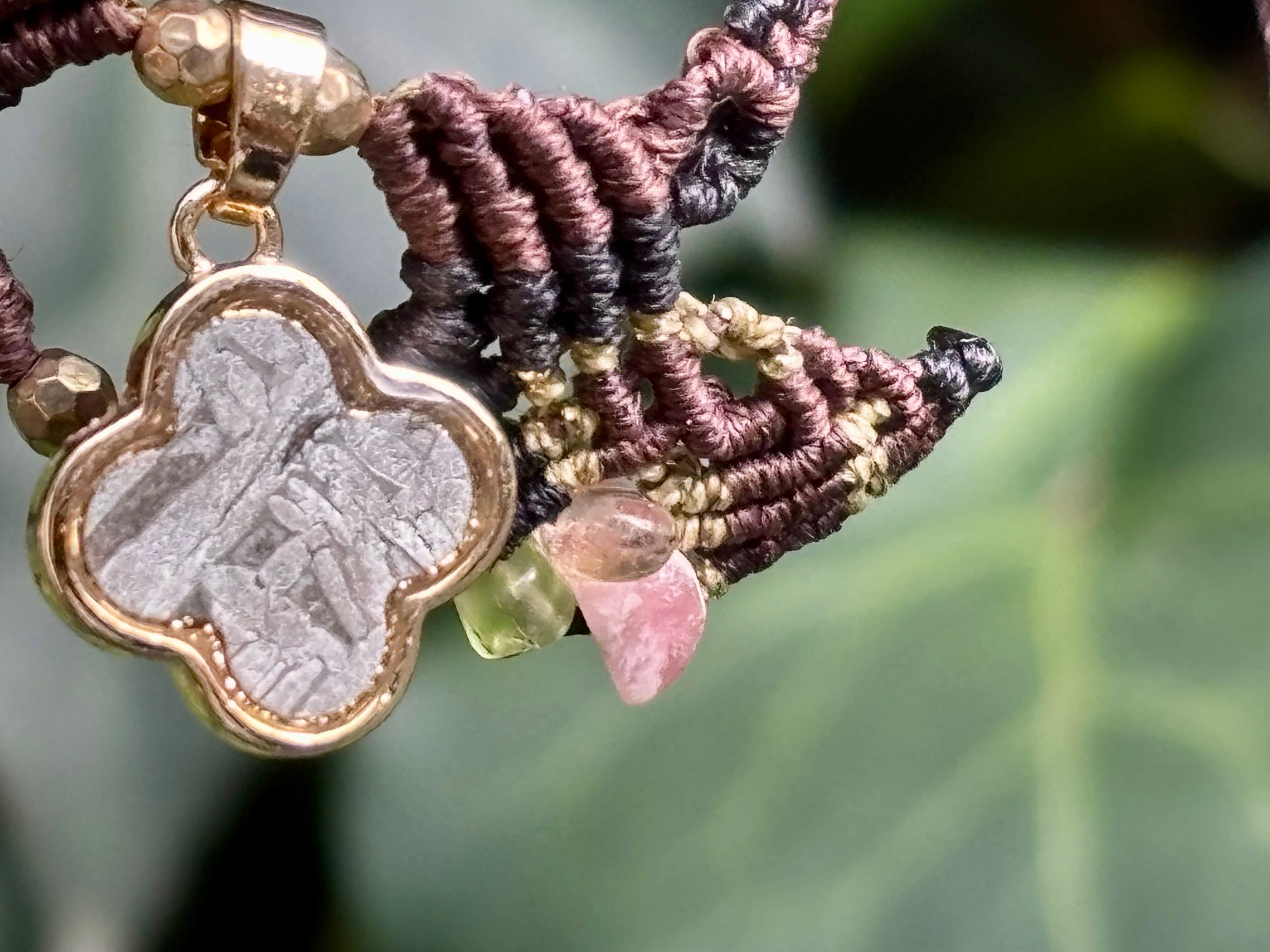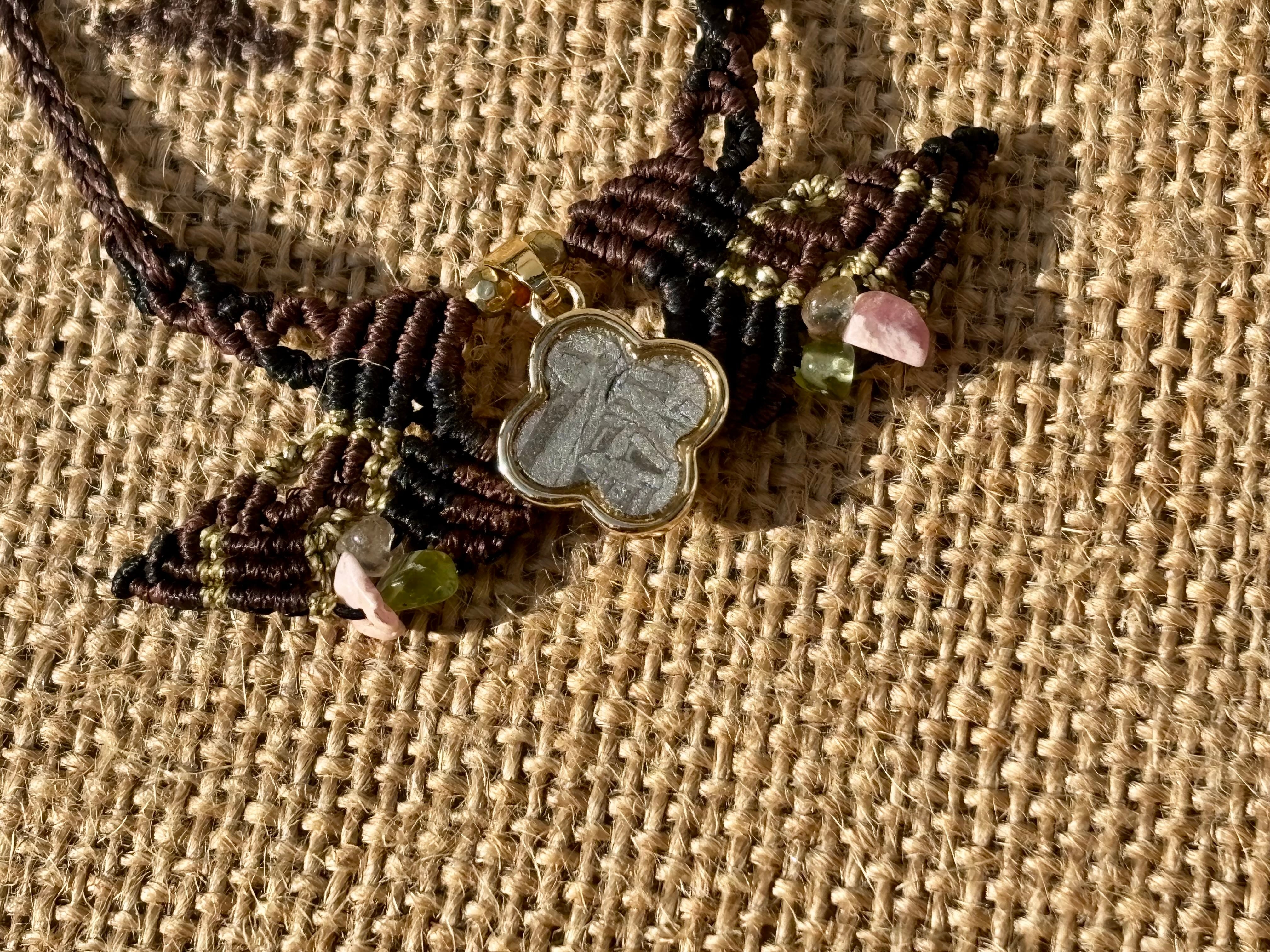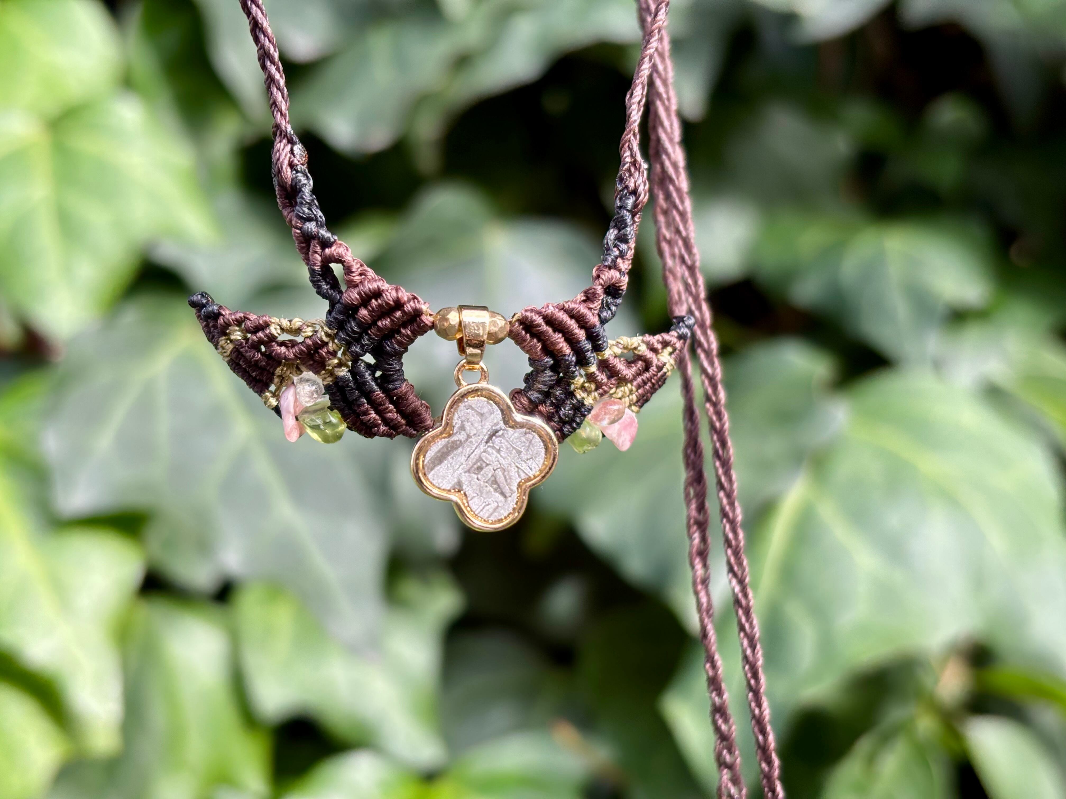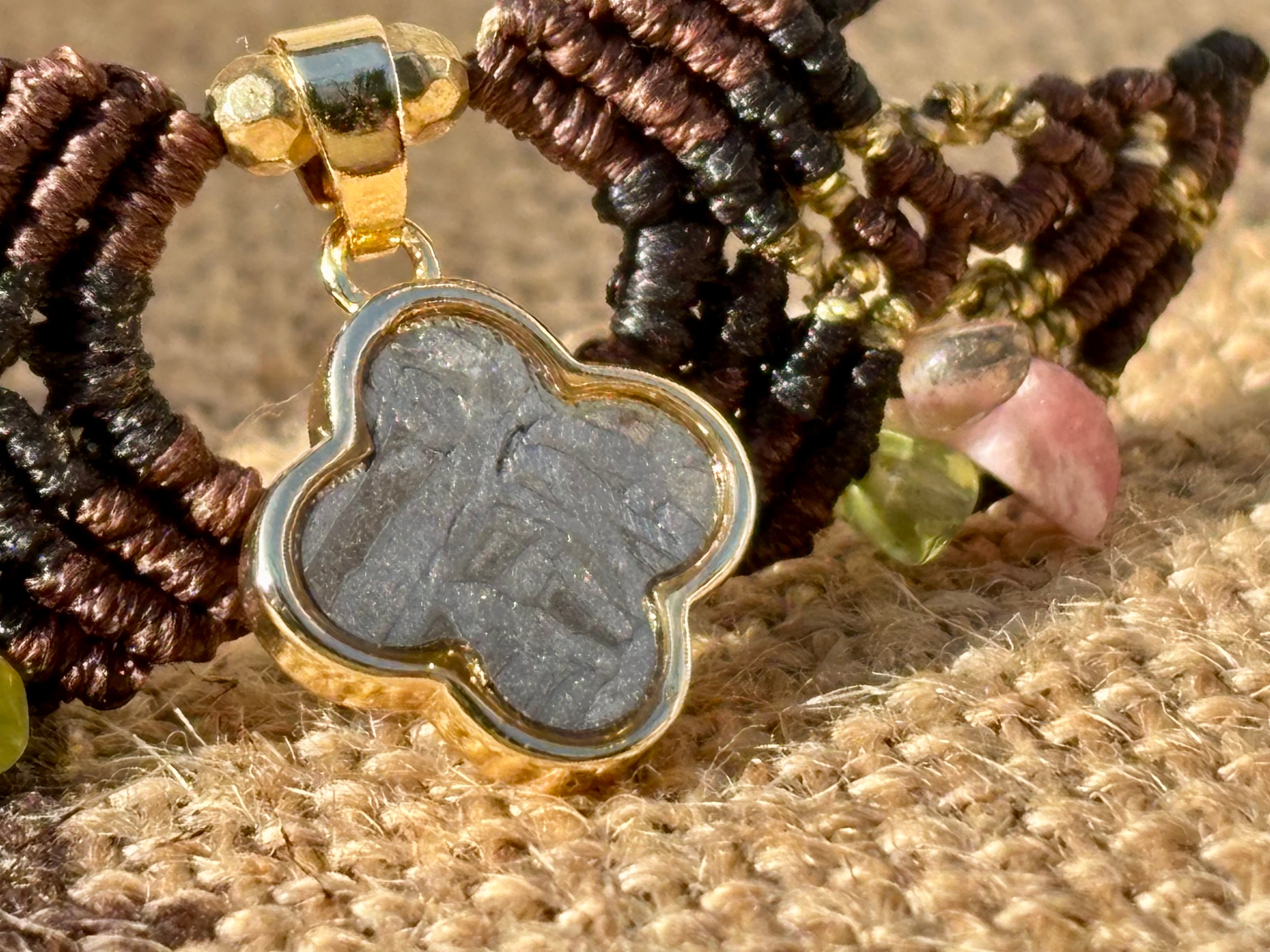 #843再販限定1点!!宇宙からの幸運♡アルタイ隕石(アルタイ隕石四葉型×インカローズ×ペリドット×シトリン×ヘマタイト マクラメ編みネックレス)