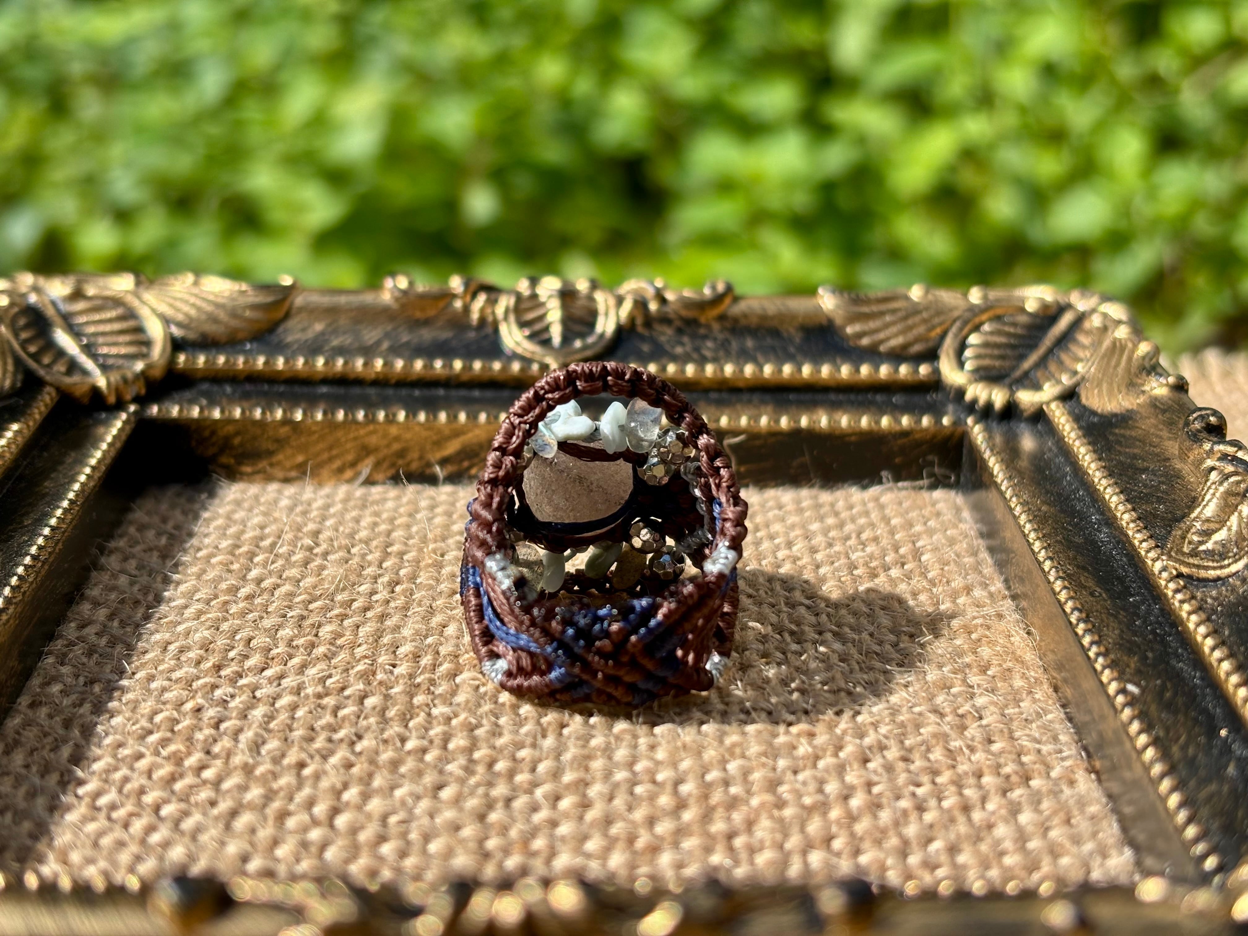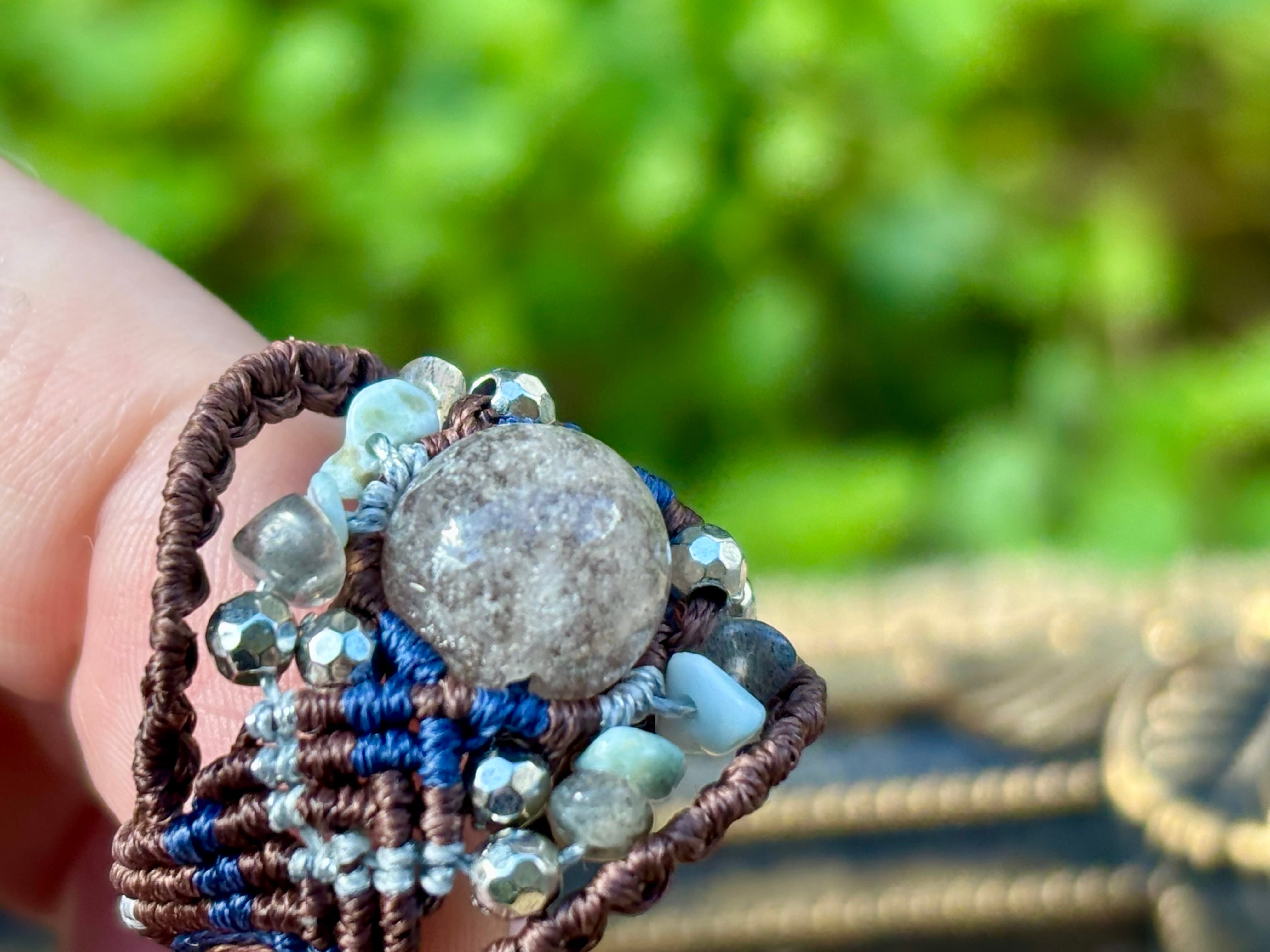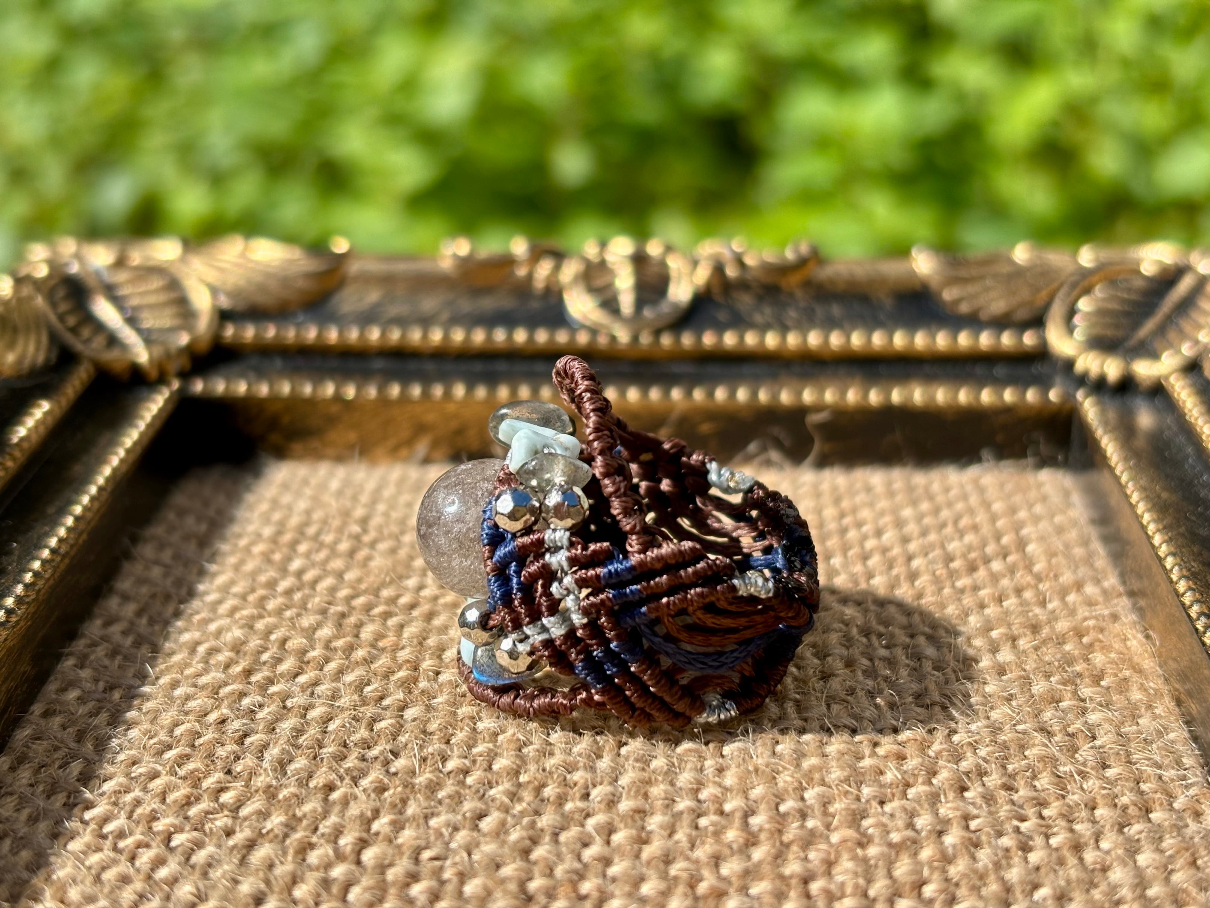 #844超希少⭐︎スモーキーリビアングラス(スモーキーリビアングラス×ラブラドライト×ラリマー マクラメ編みリング/指輪)