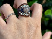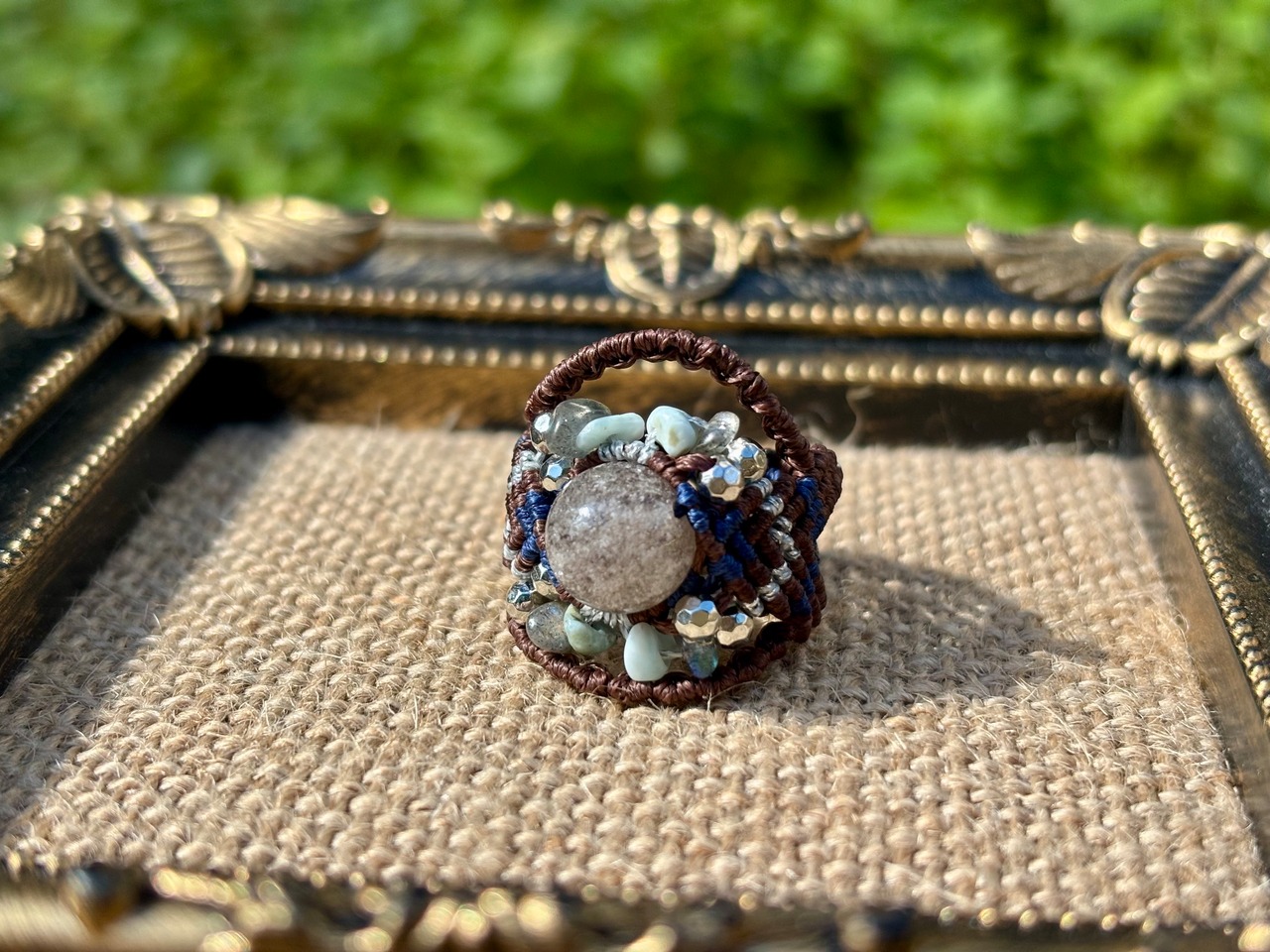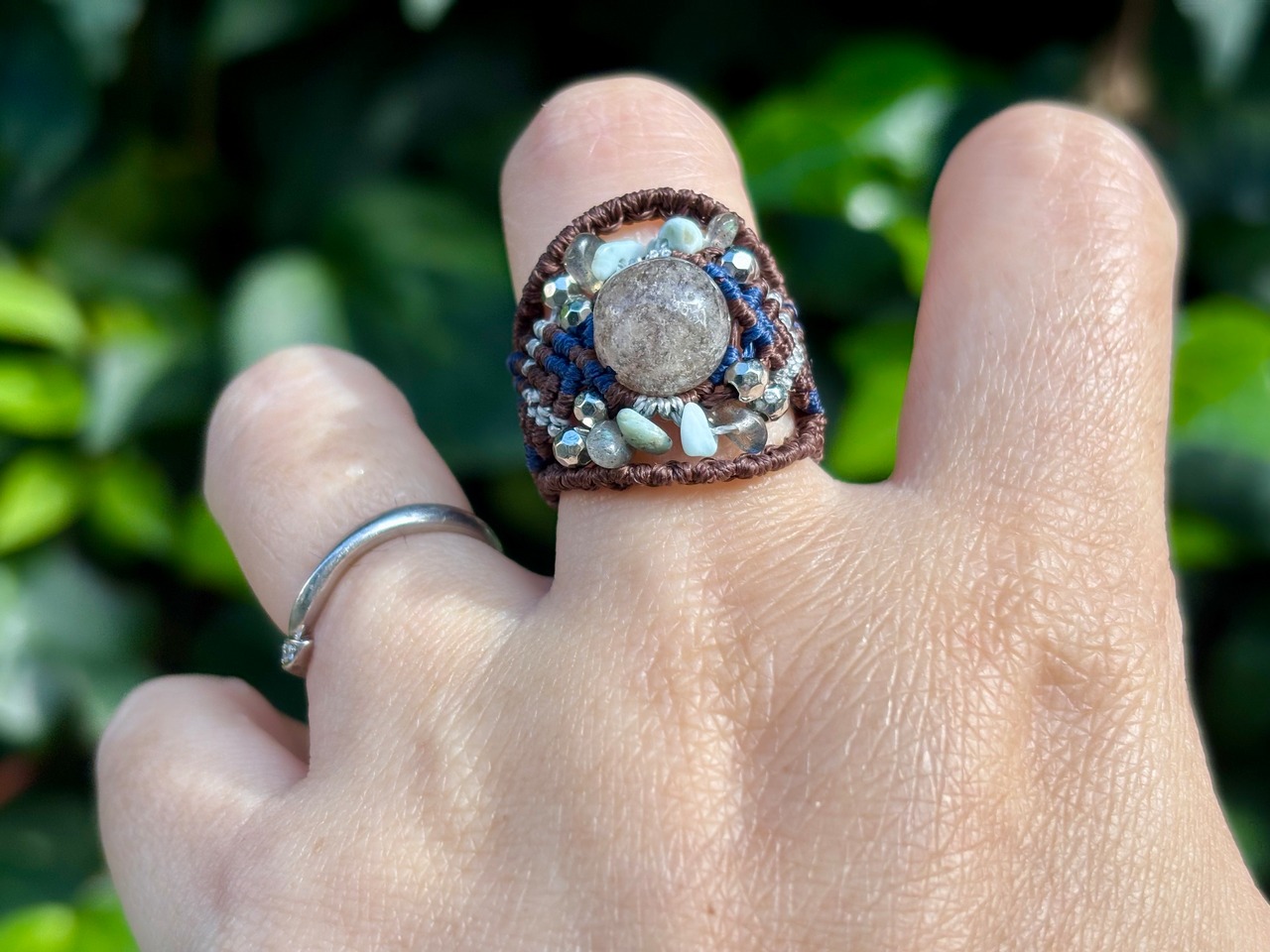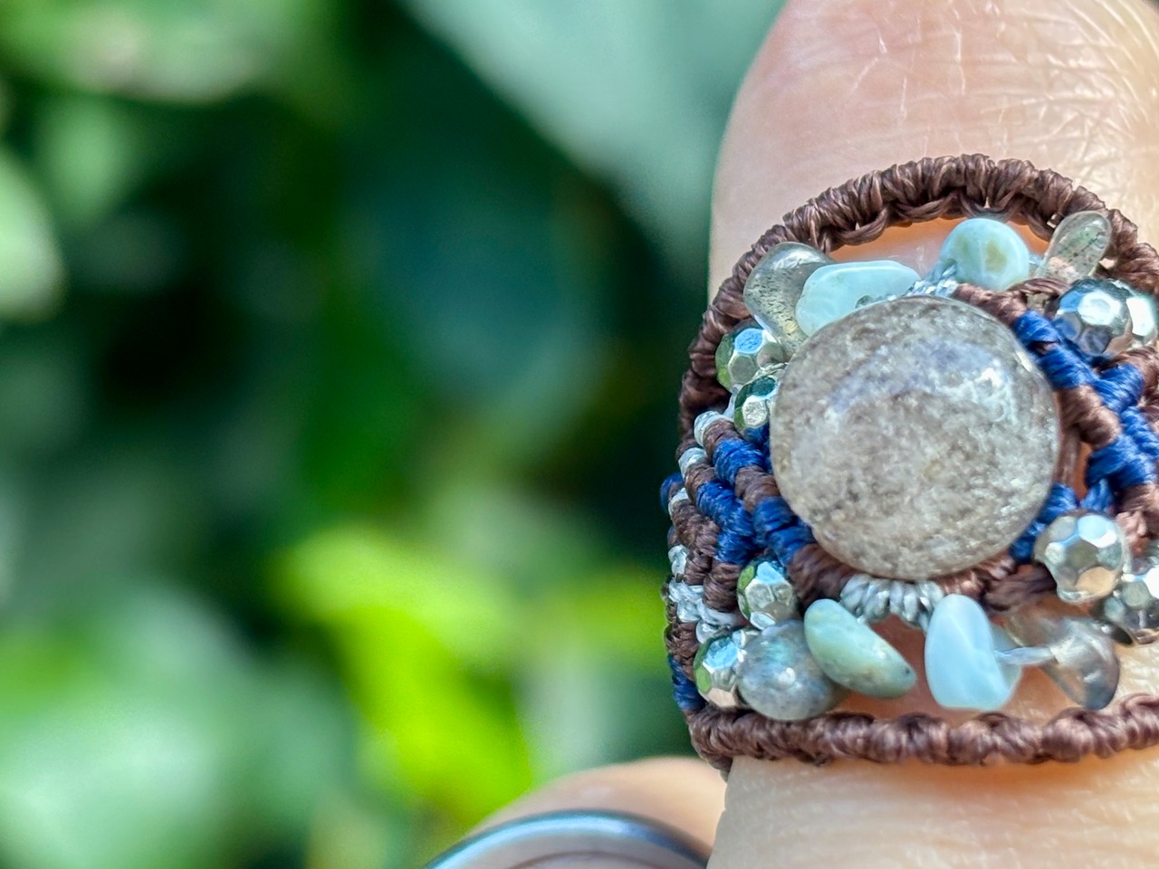 #844超希少⭐︎スモーキーリビアングラス(スモーキーリビアングラス×ラブラドライト×ラリマー マクラメ編みリング/指輪)