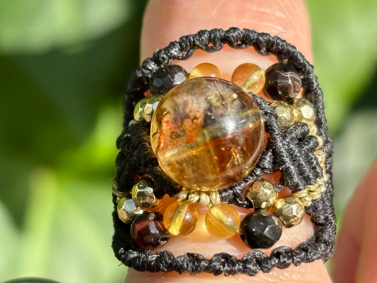 #850天然ライモナイトインシトリン一点物(ライモナイトインシトリン×シトリン×オニキス マクラメ編みリング/指輪)