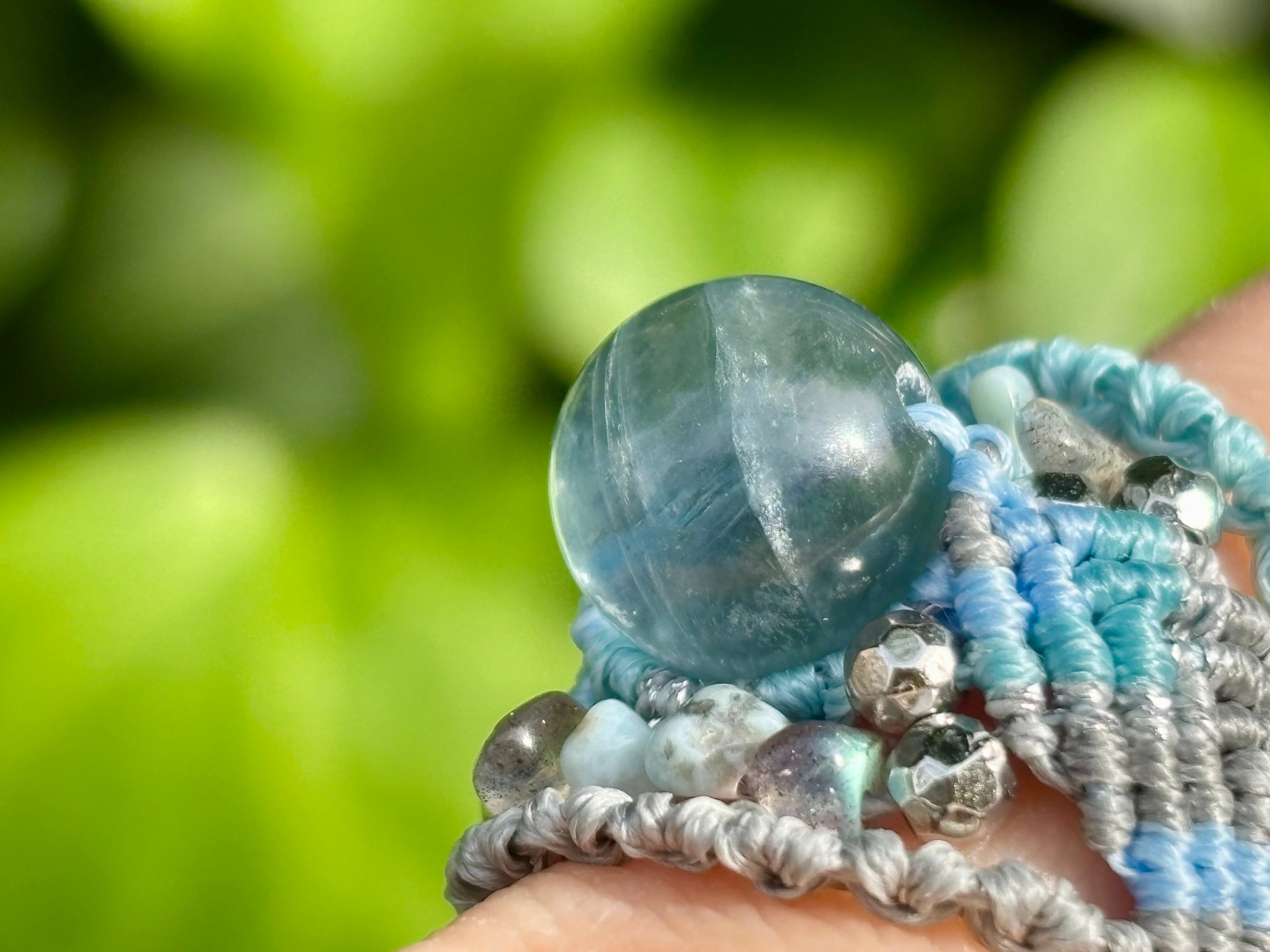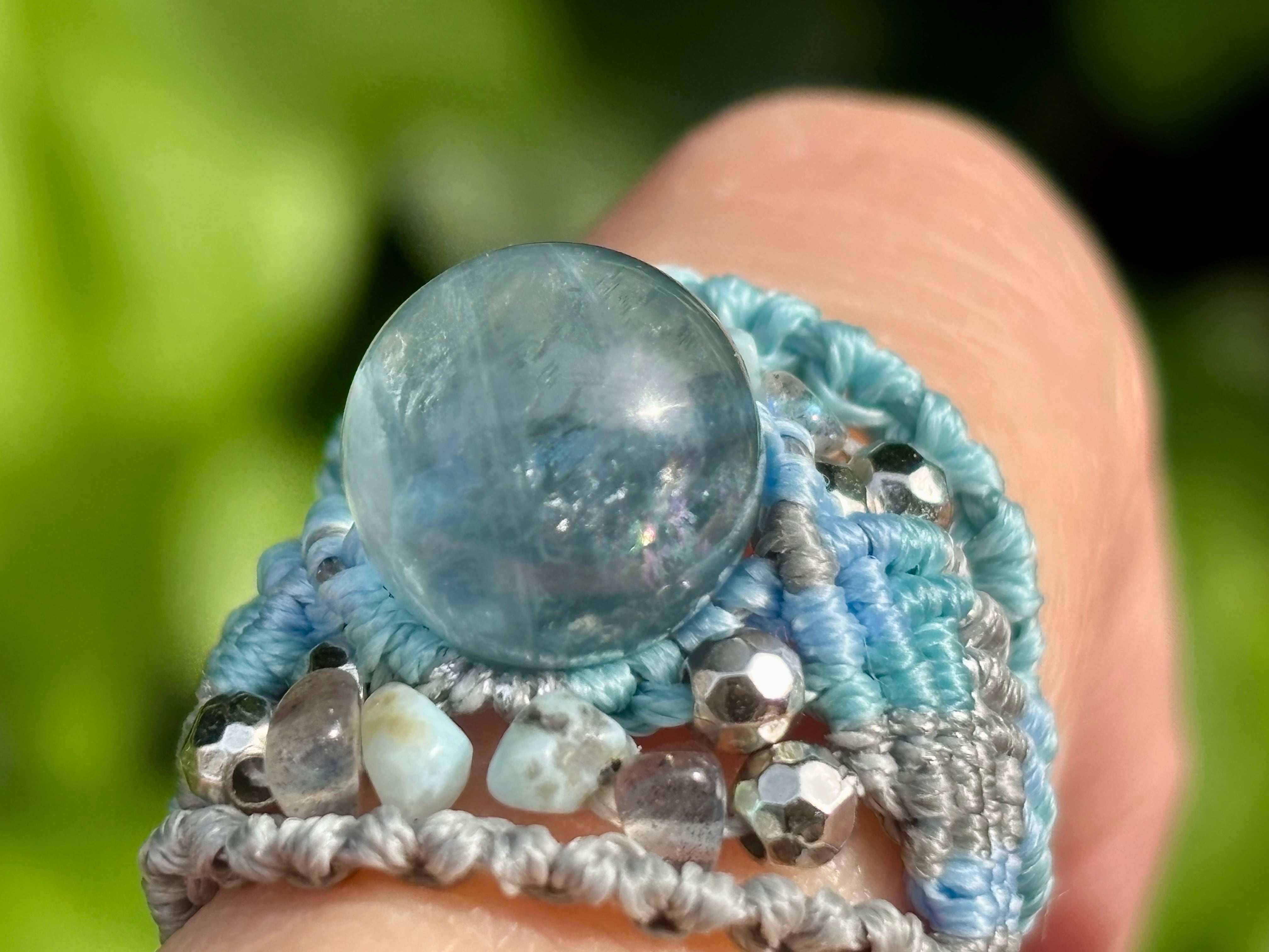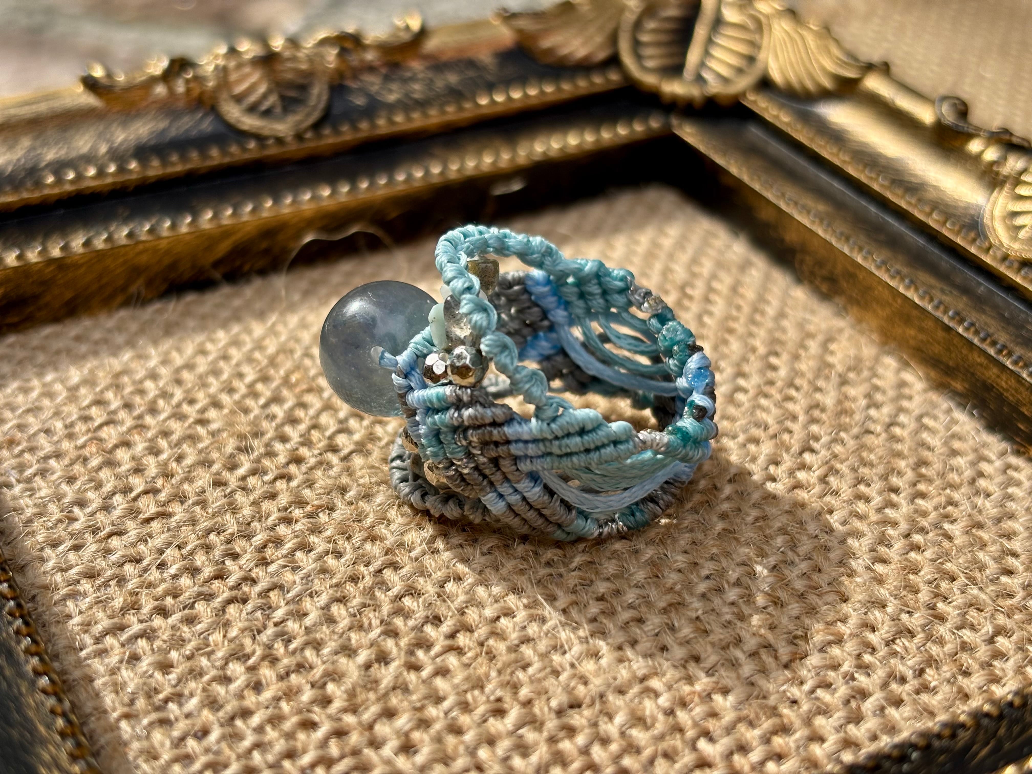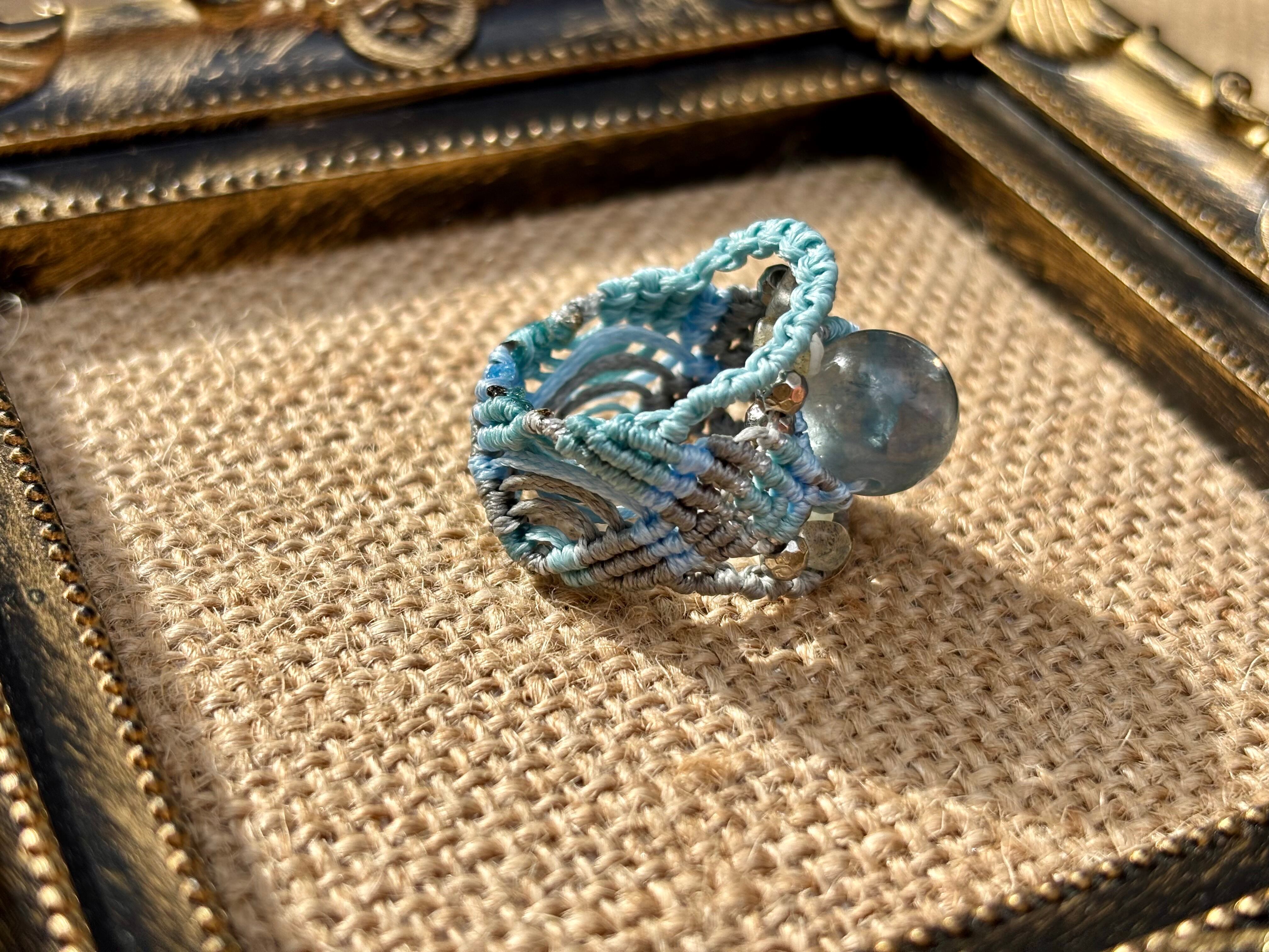 #854天然ブルーフローライト一点物(ブルーフローライト×ラリマー×ラブラドライト マクラメ編みリング/指輪)