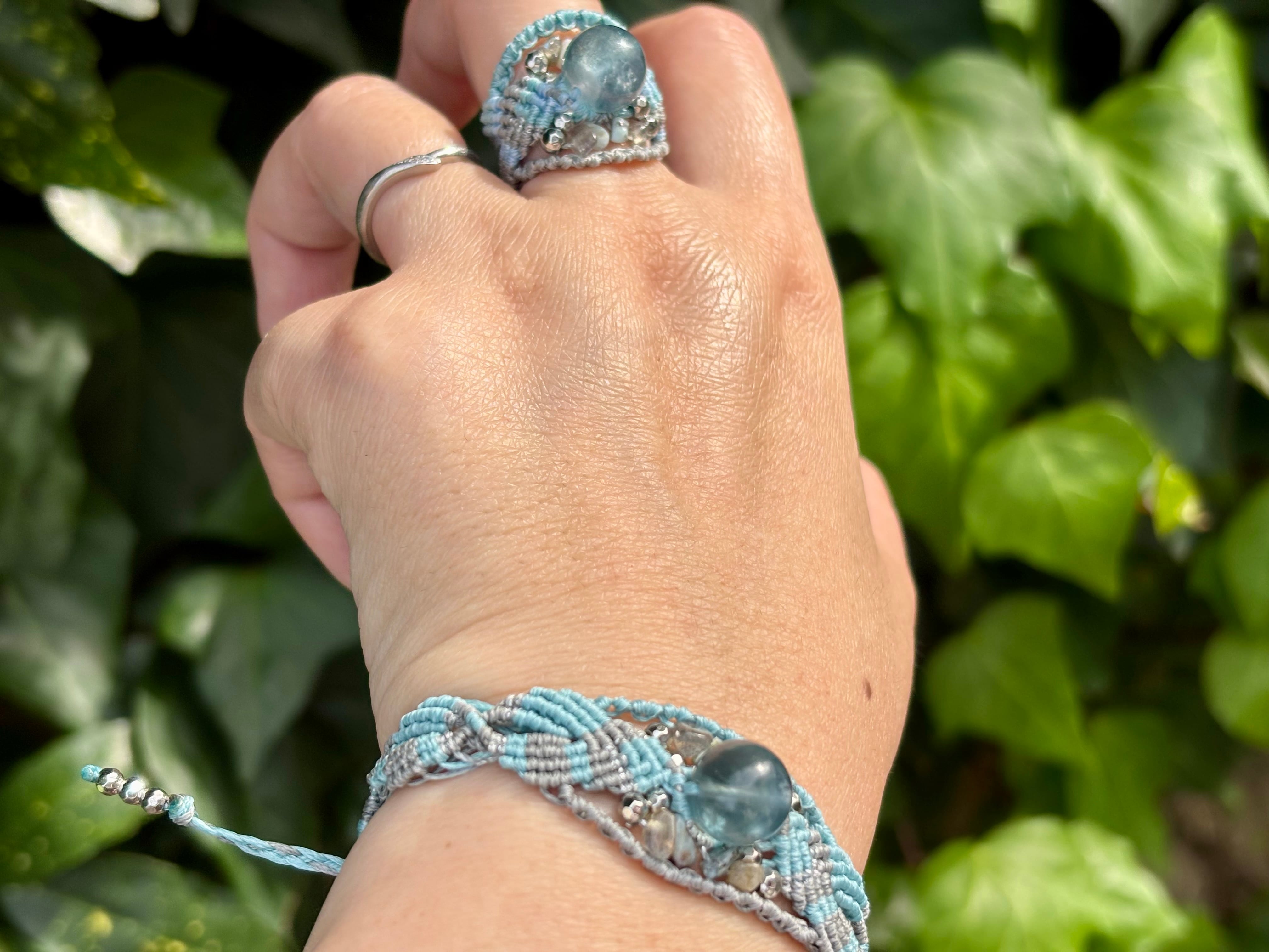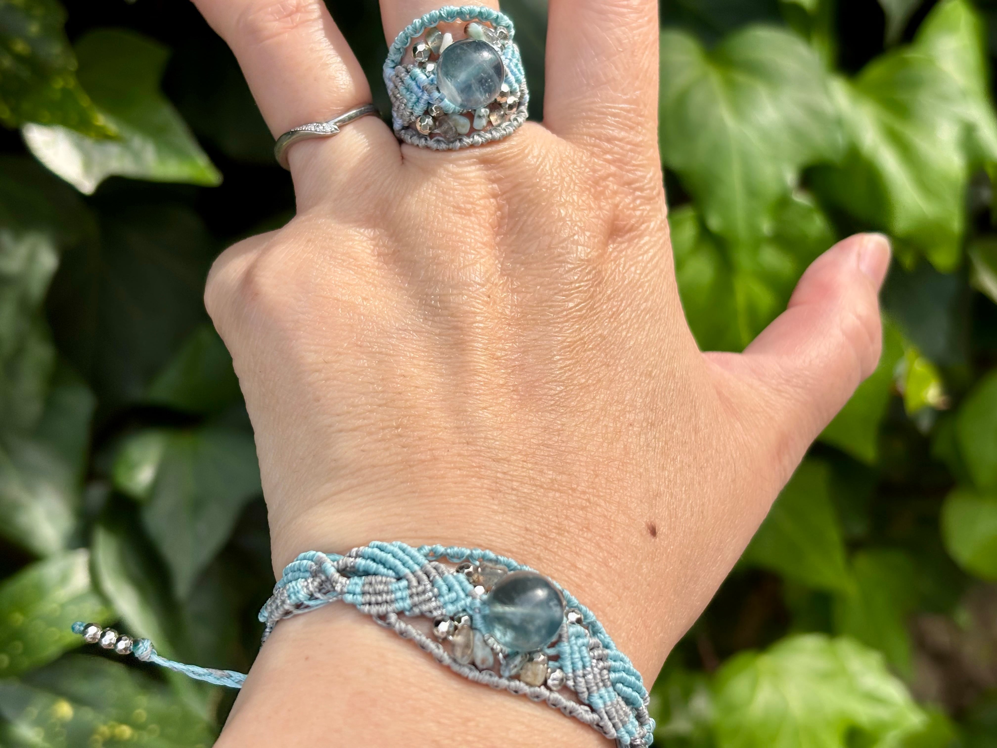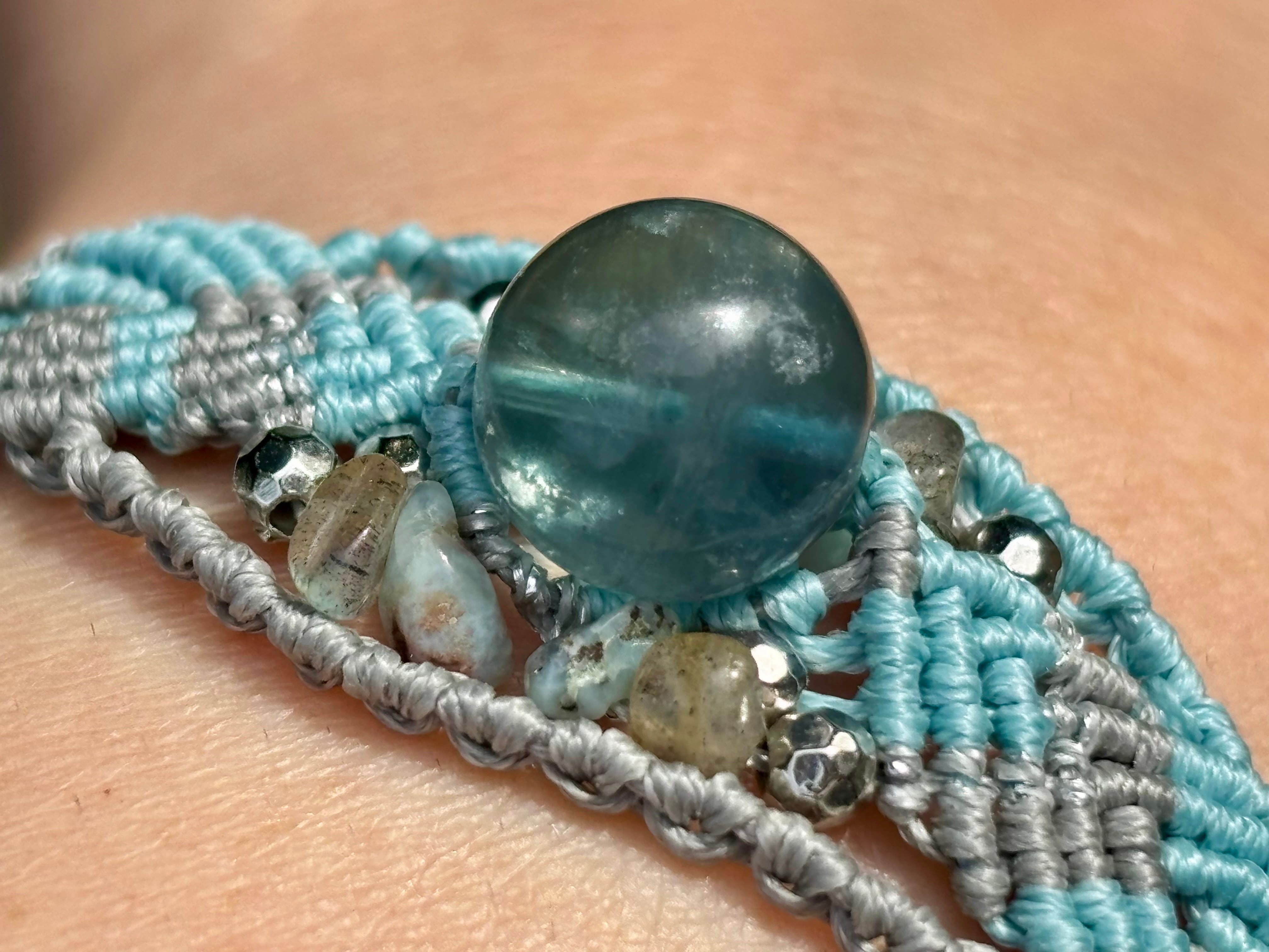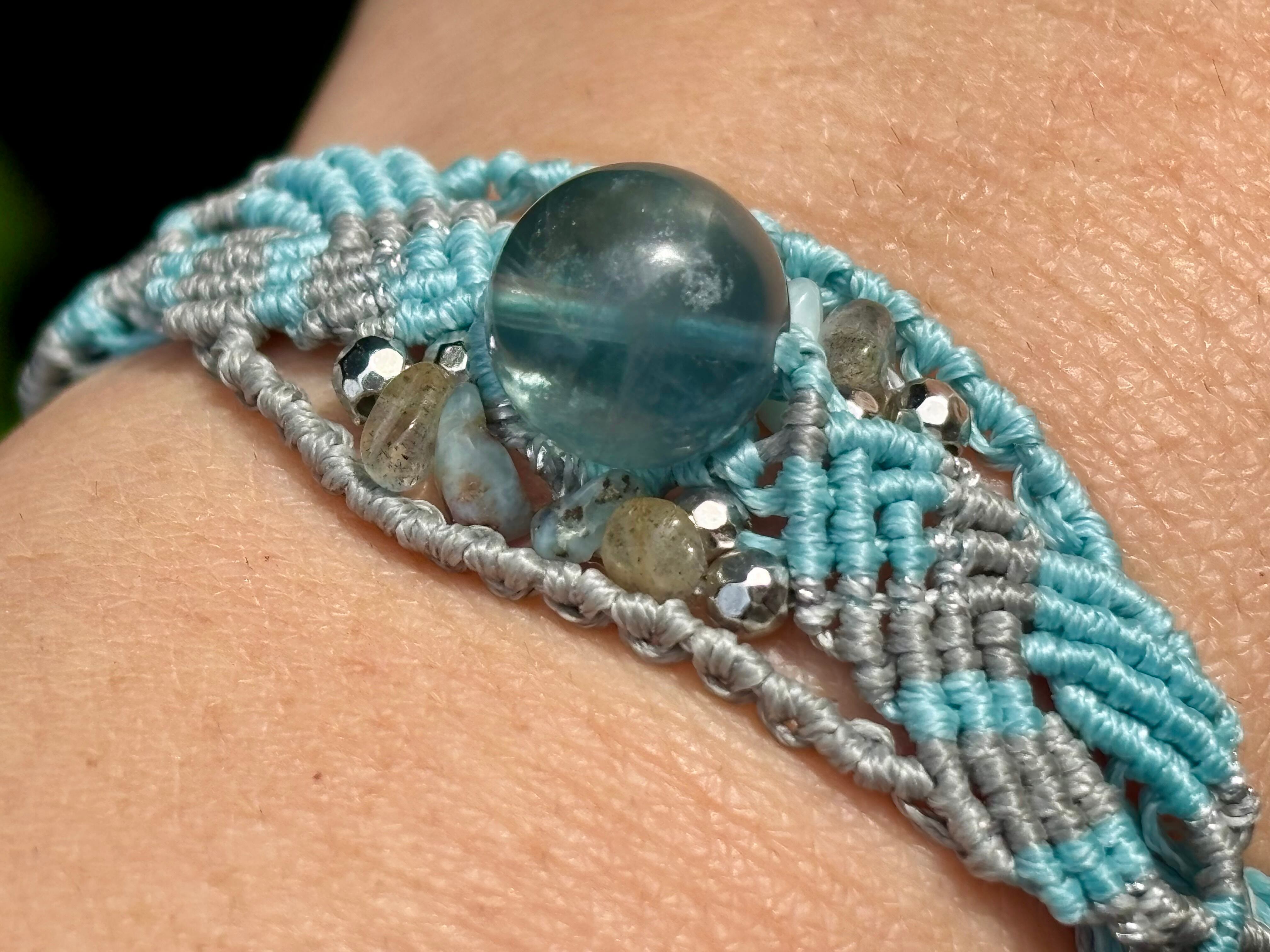 #855天然ブルーフローライト一点物(ブルーフローライト×ラリマー×ラブラドライト マクラメ編みブレスレット)