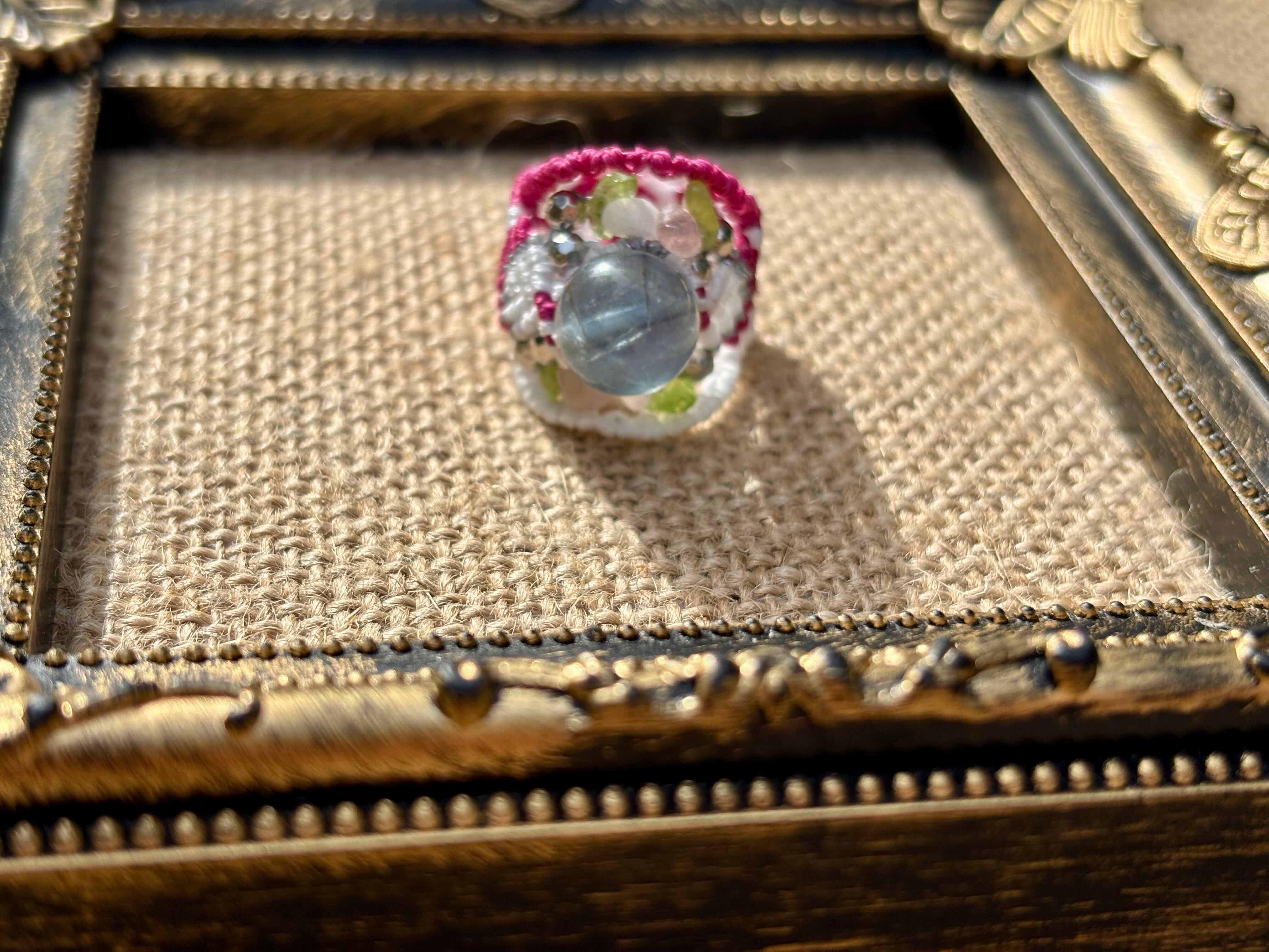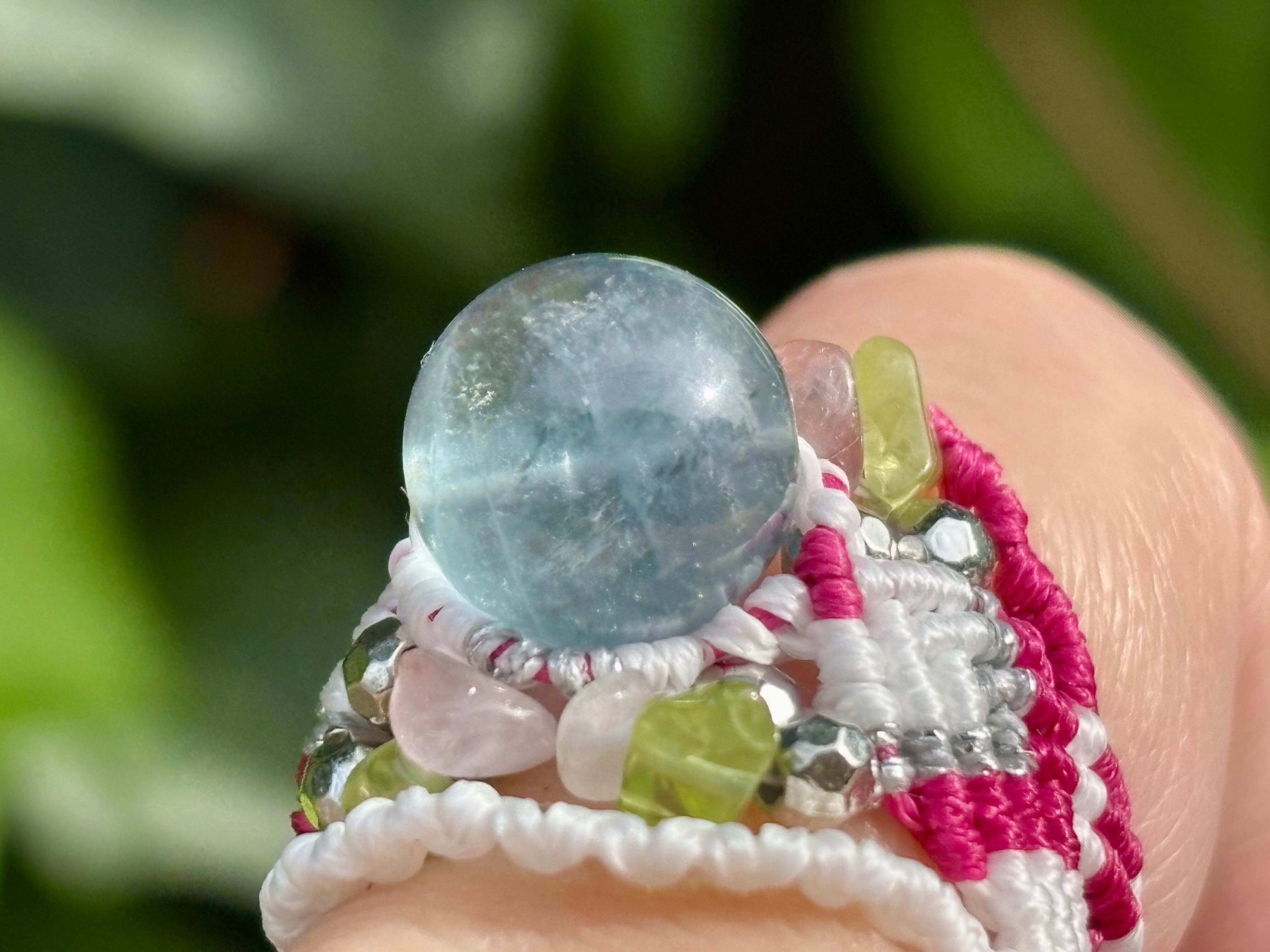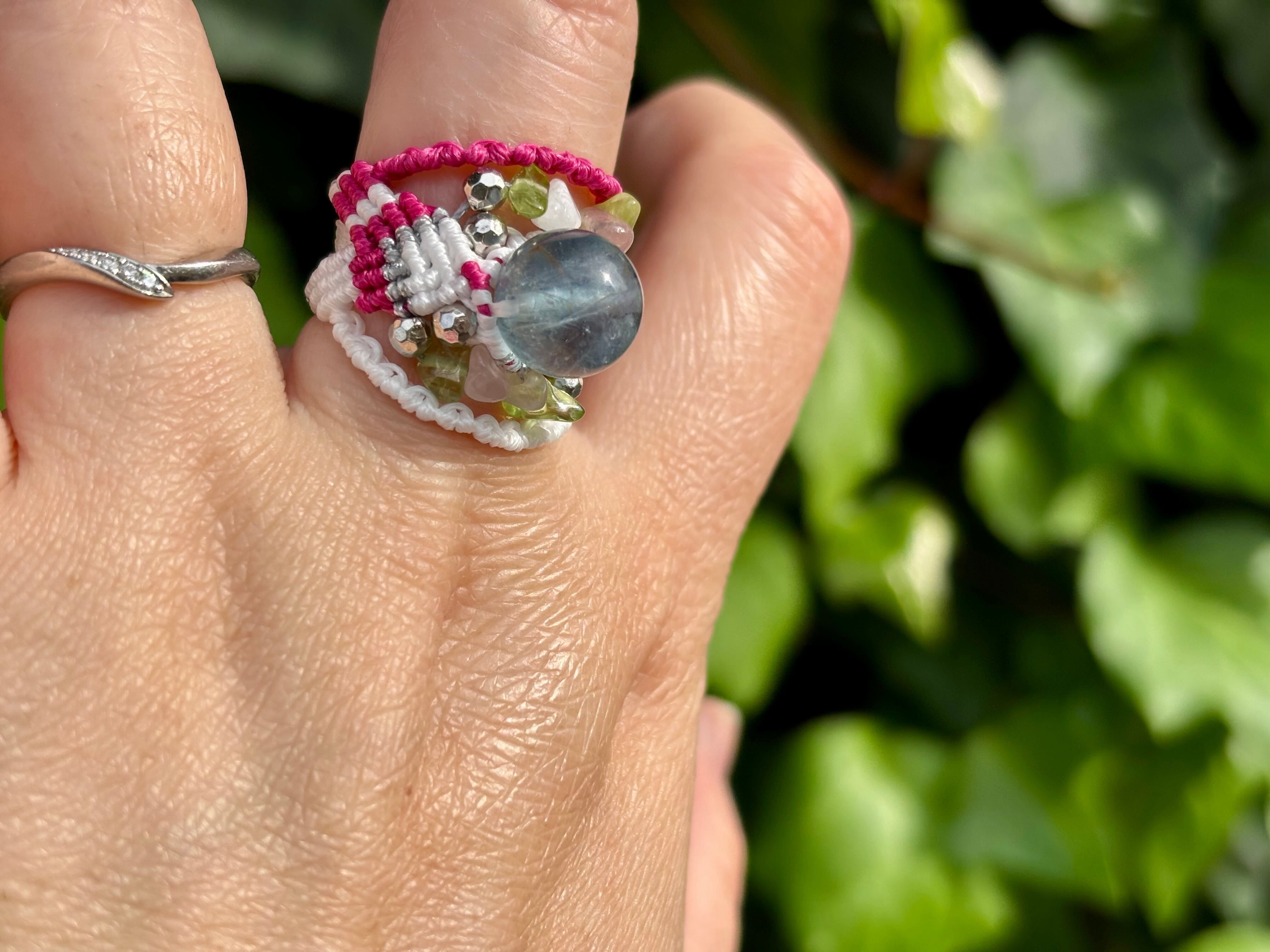 #856天然ブルーフローライト一点物(ブルーフローライト×ペリドット×ローズクォーツ マクラメ編みリング/指輪)