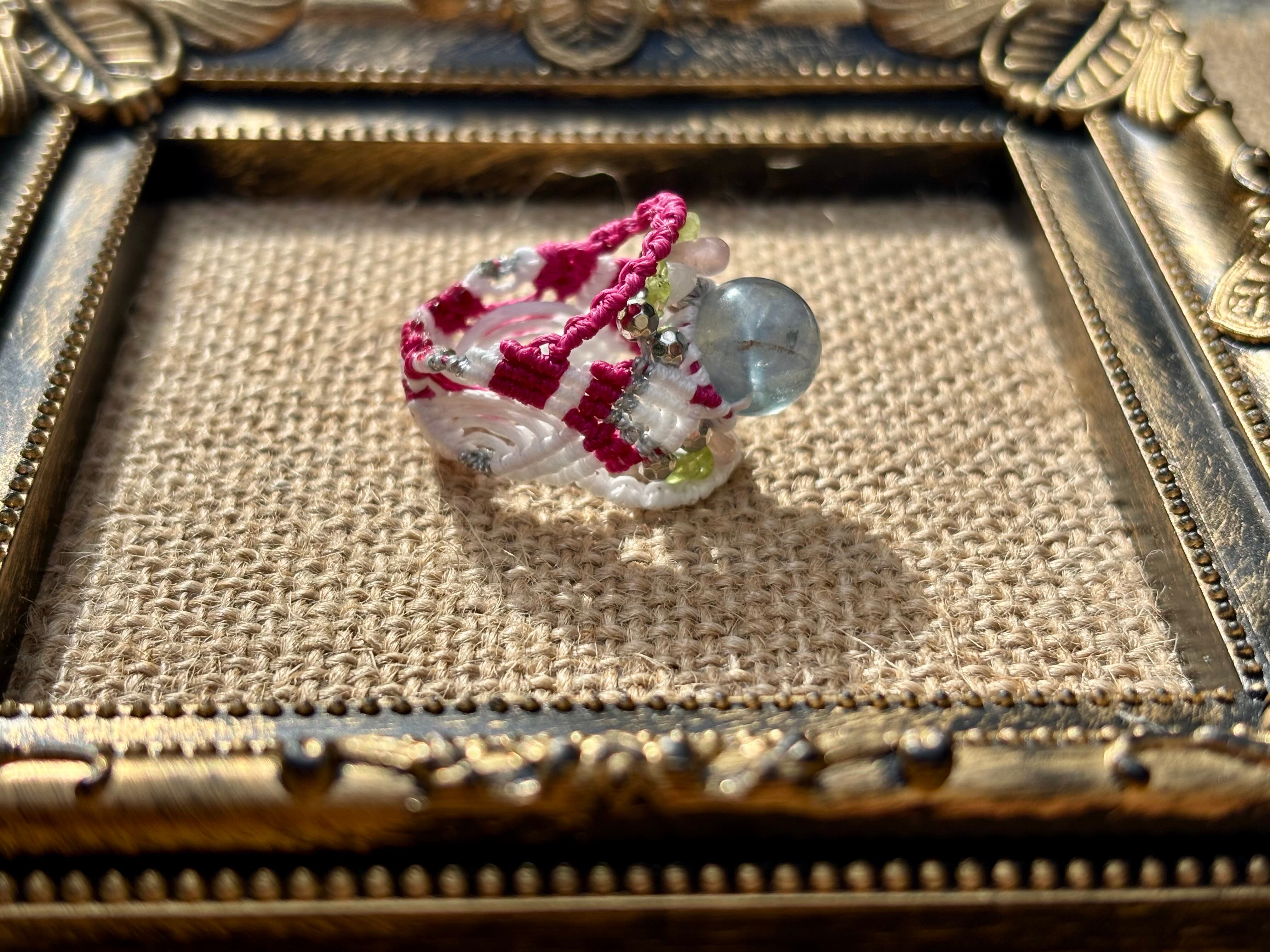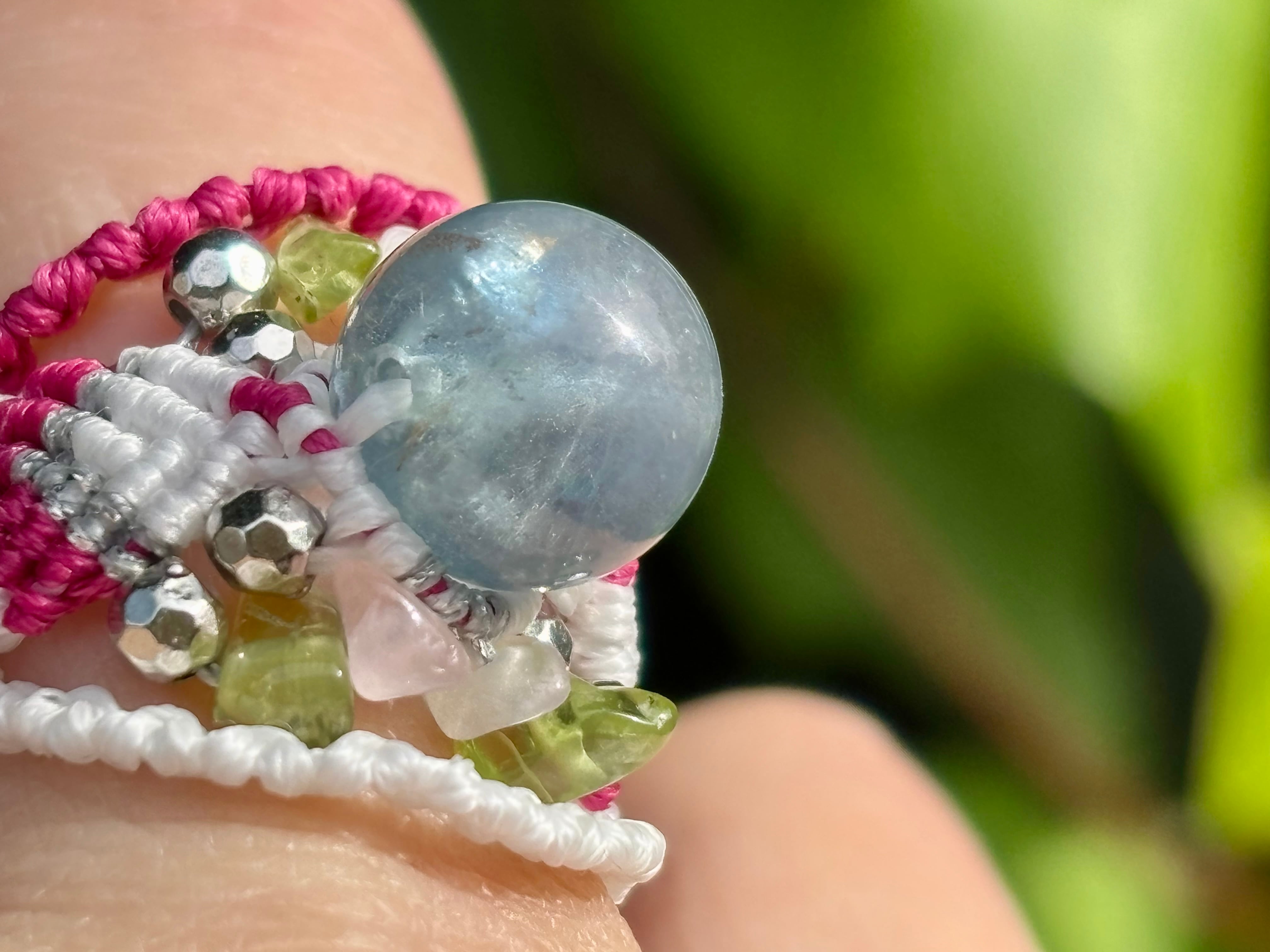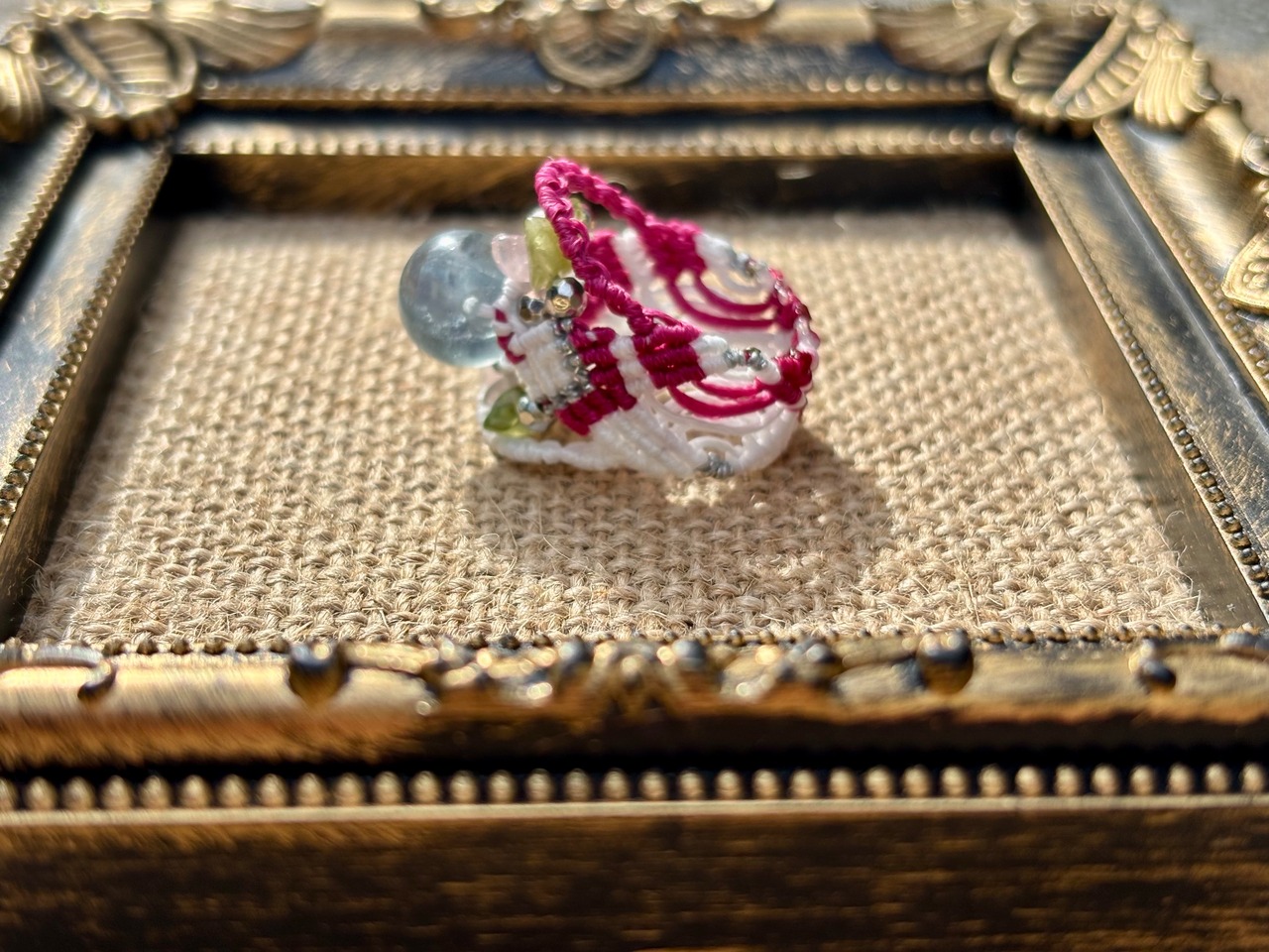 #856天然ブルーフローライト一点物(ブルーフローライト×ペリドット×ローズクォーツ マクラメ編みリング/指輪)