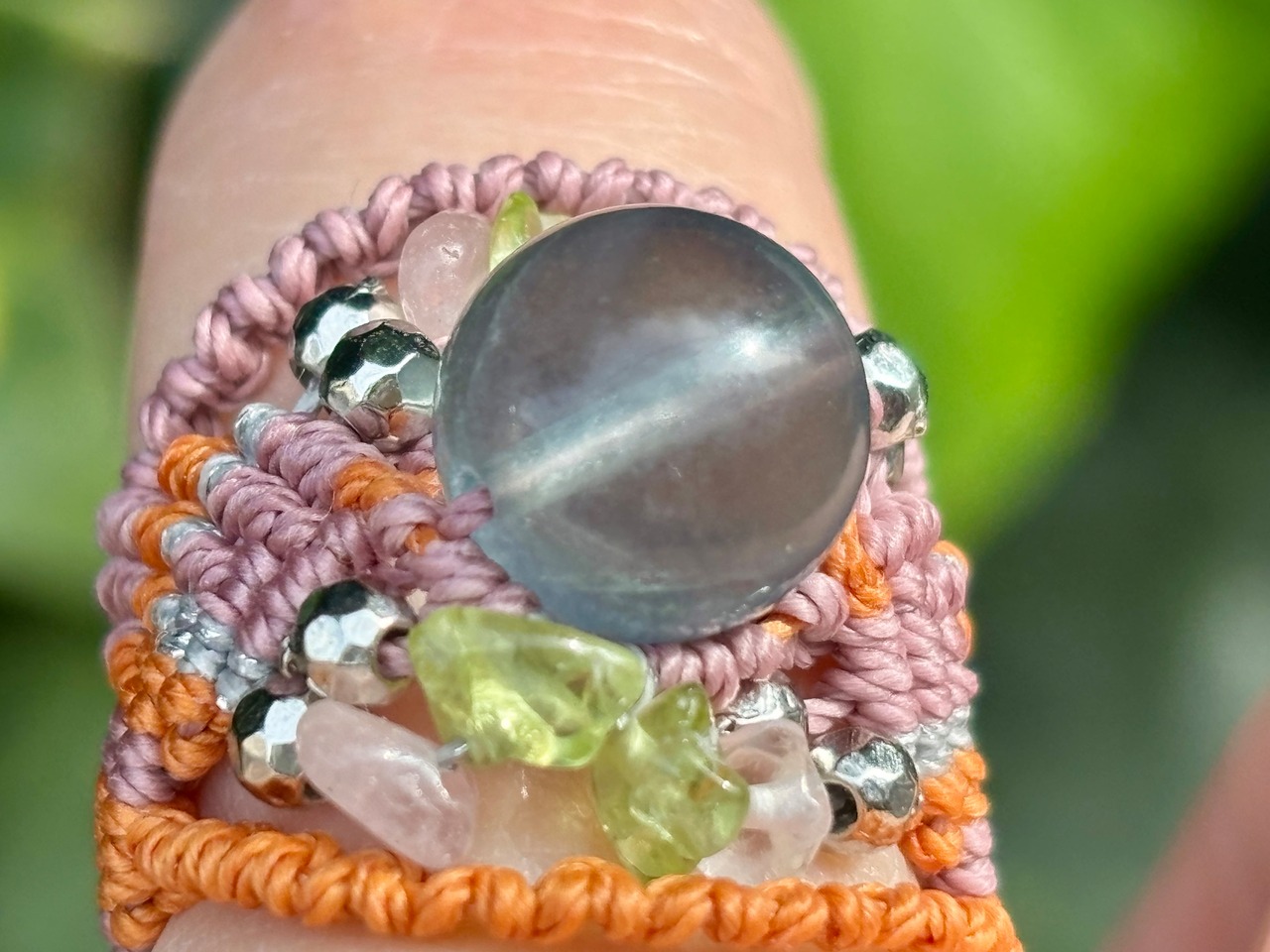 #858天然ブルーフローライト一点物(ブルーフローライト×ペリドット×ローズクォーツ マクラメ編みリング/指輪)