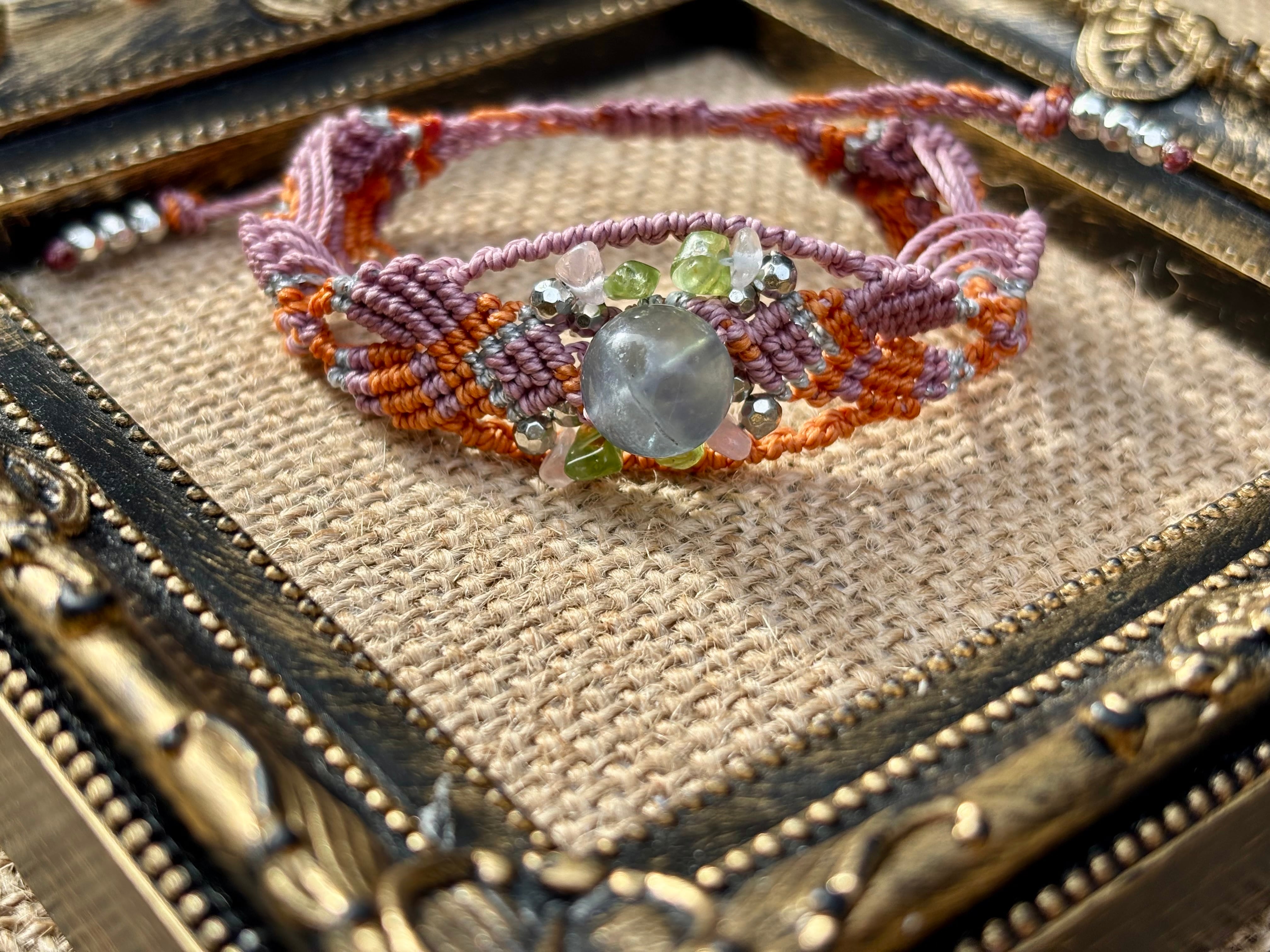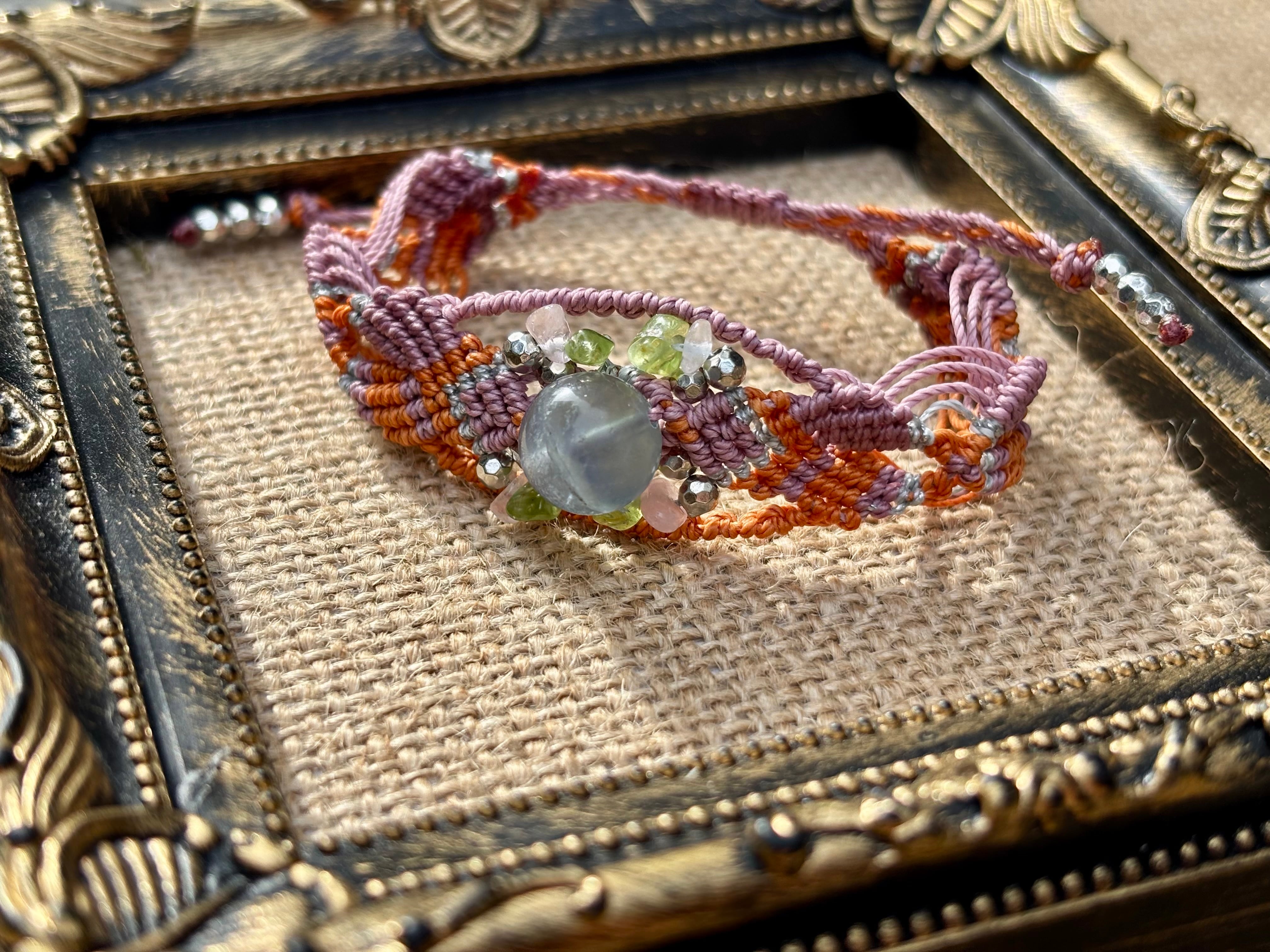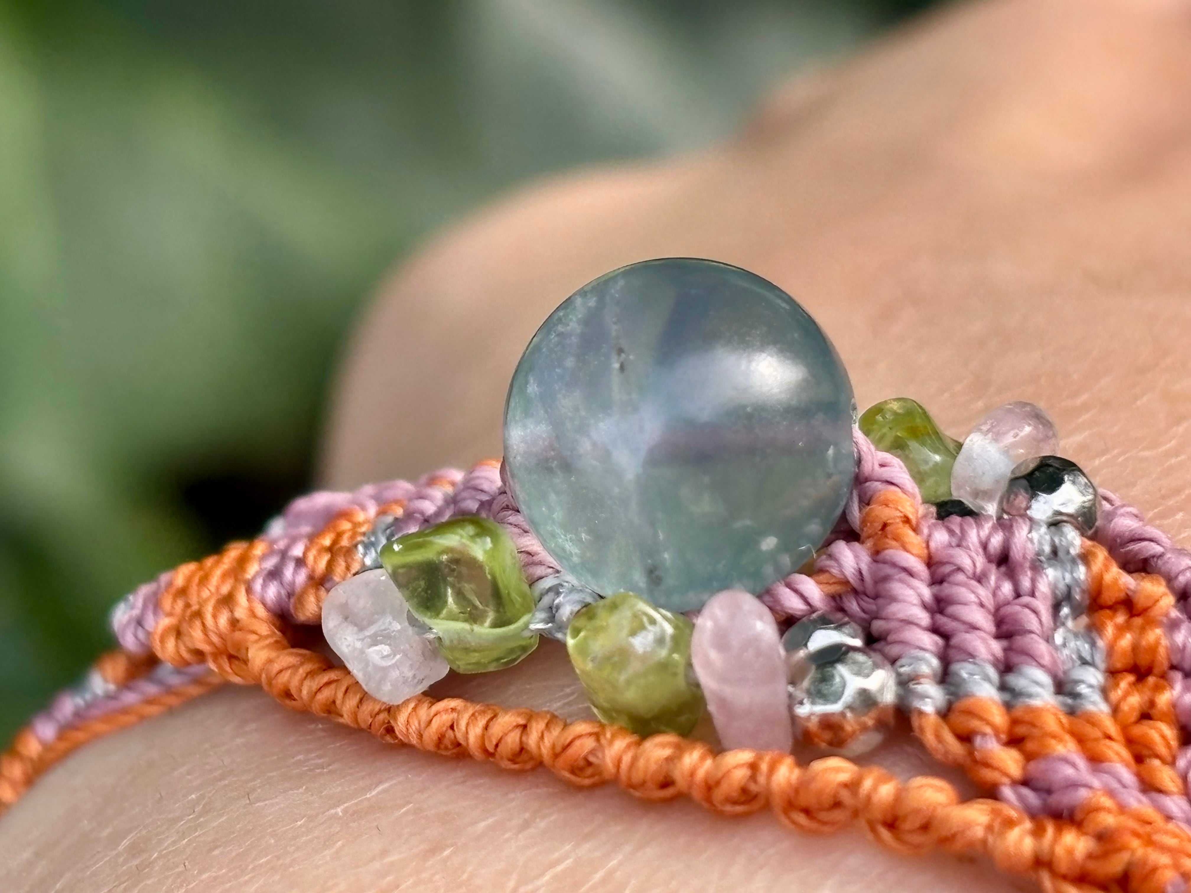 #859天然ブルーフローライト一点物(ブルーフローライト×ペリドット×ローズクォーツ マクラメ編みブレスレット)