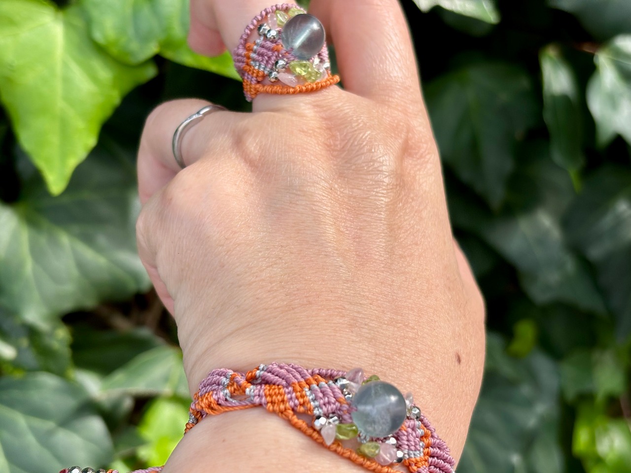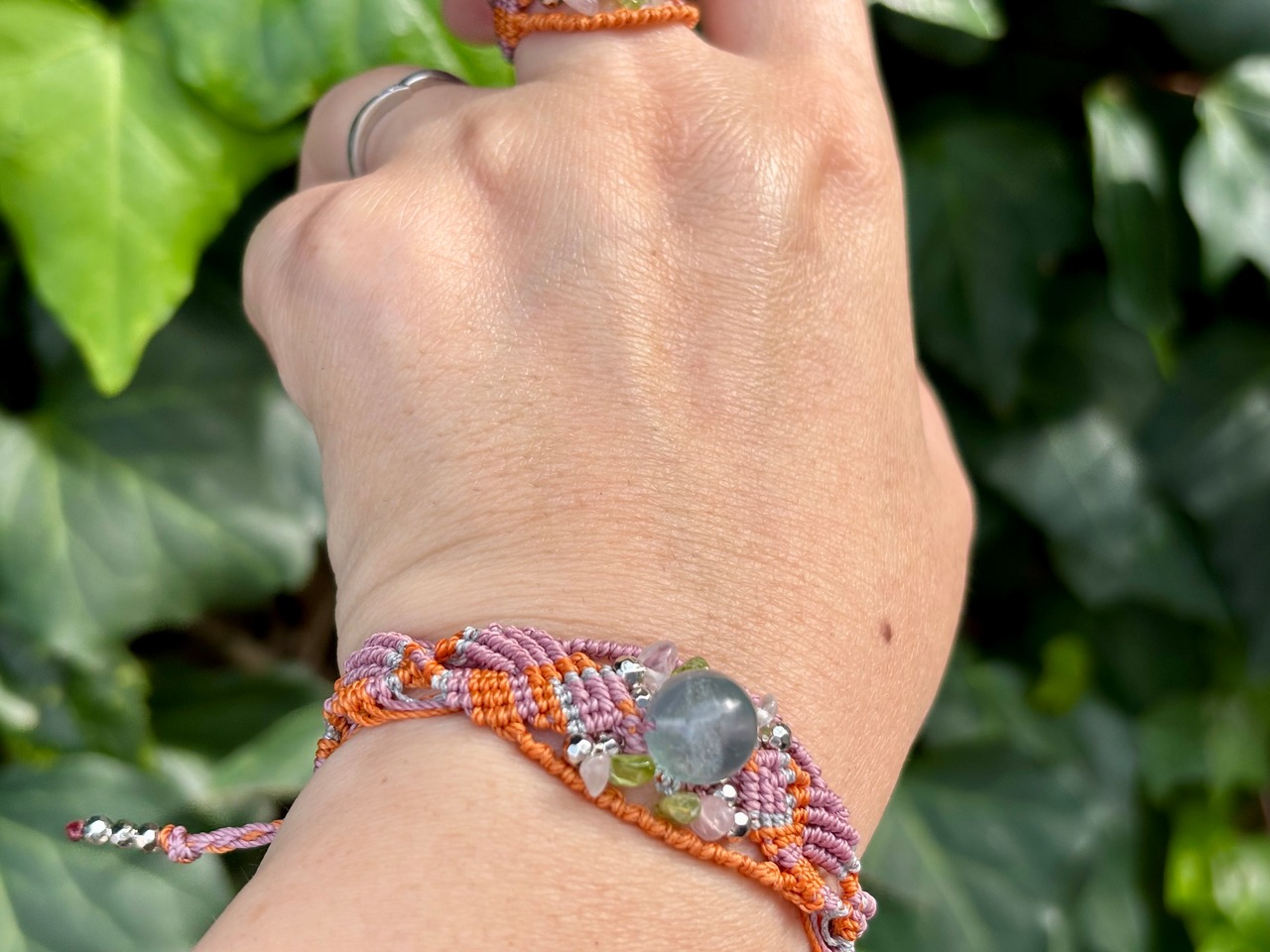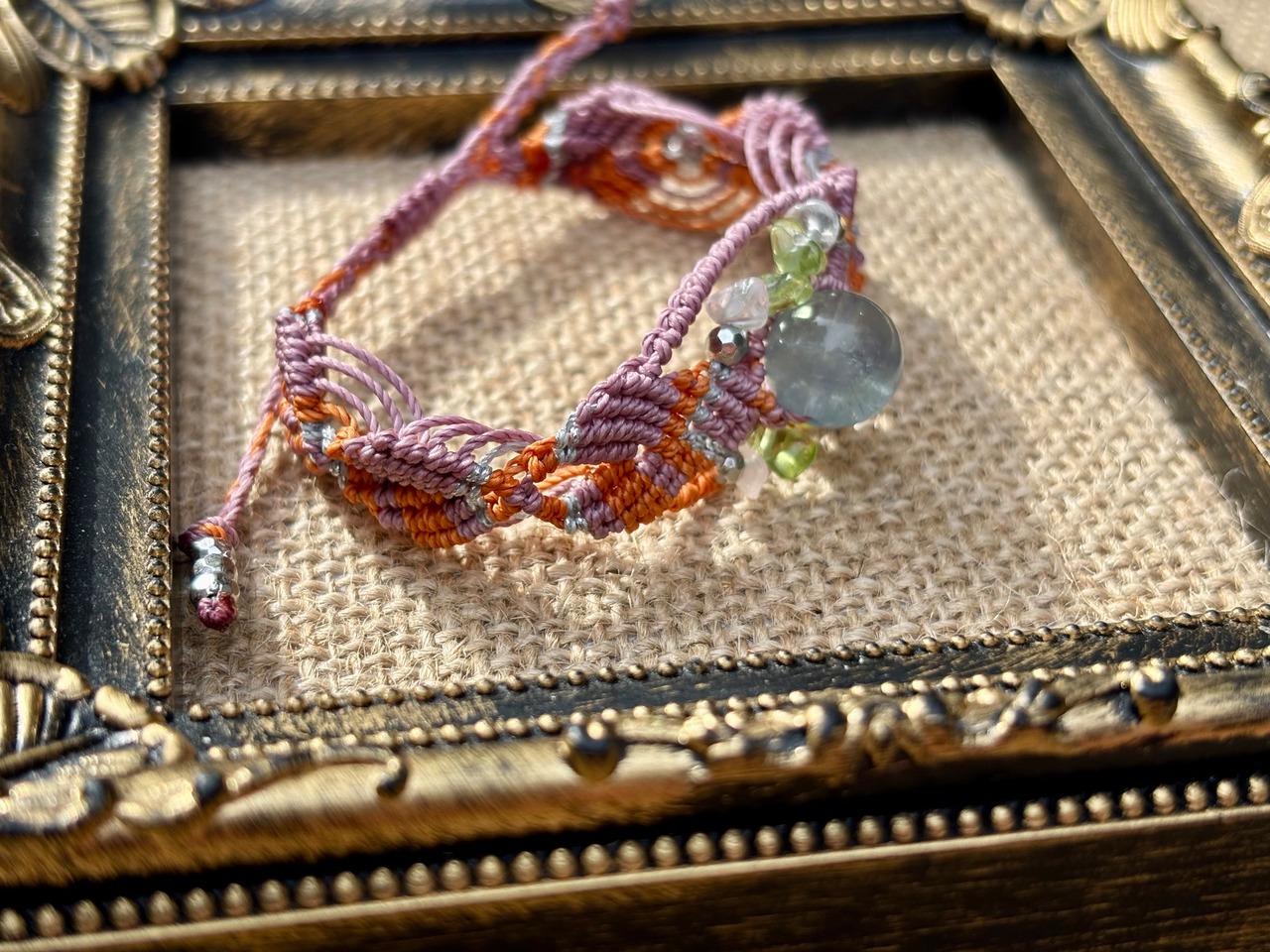 #859天然ブルーフローライト一点物(ブルーフローライト×ペリドット×ローズクォーツ マクラメ編みブレスレット)