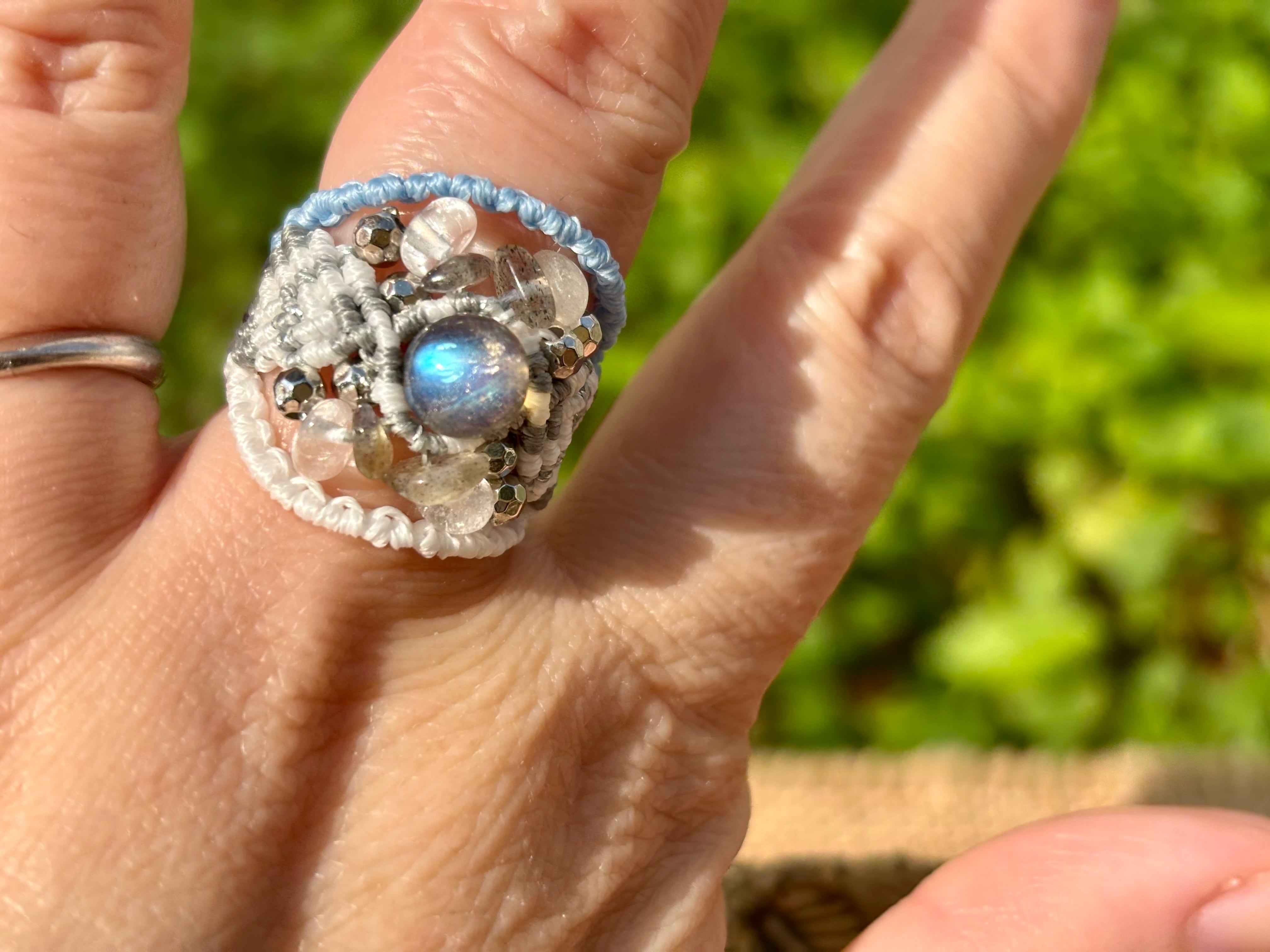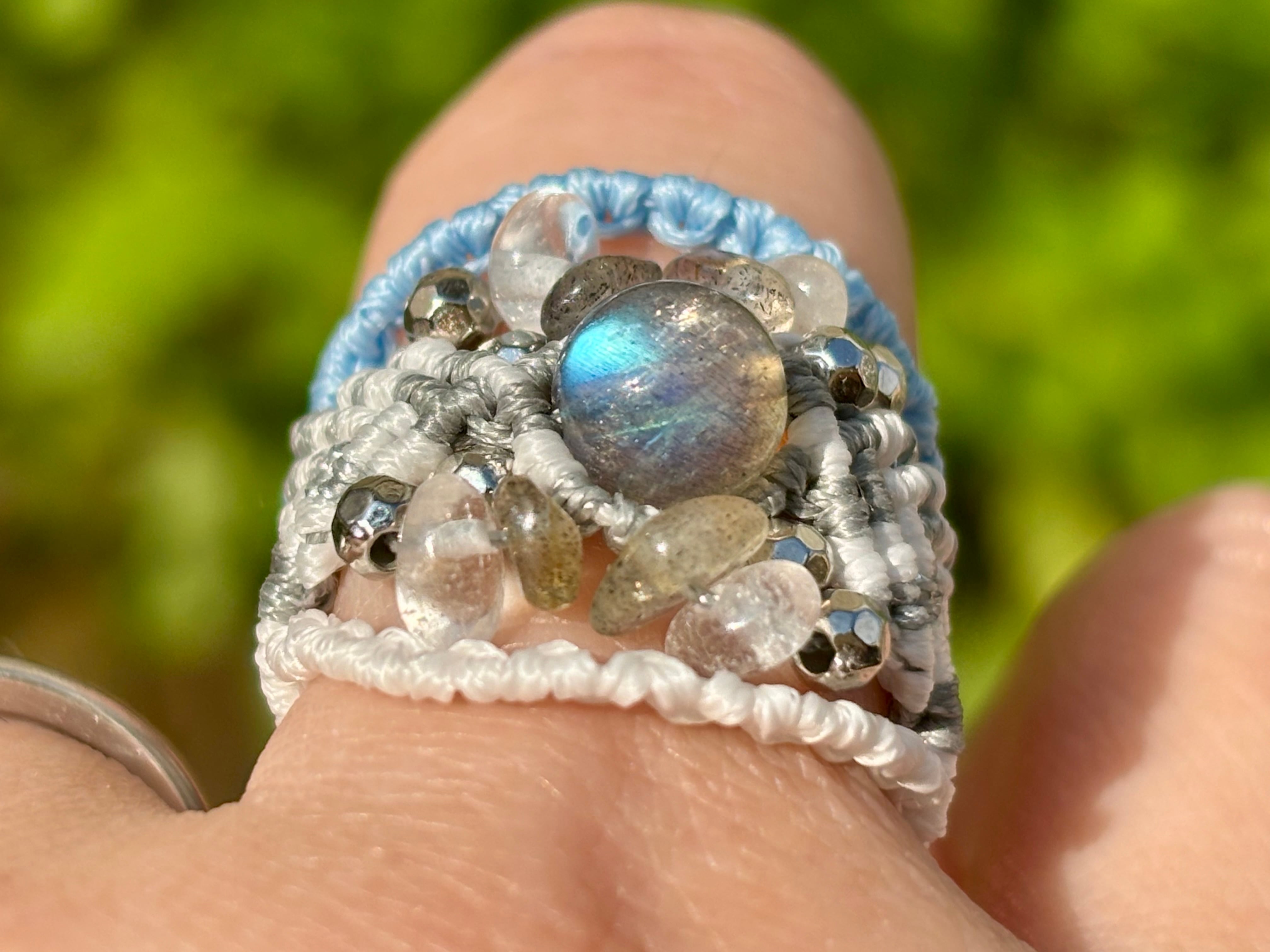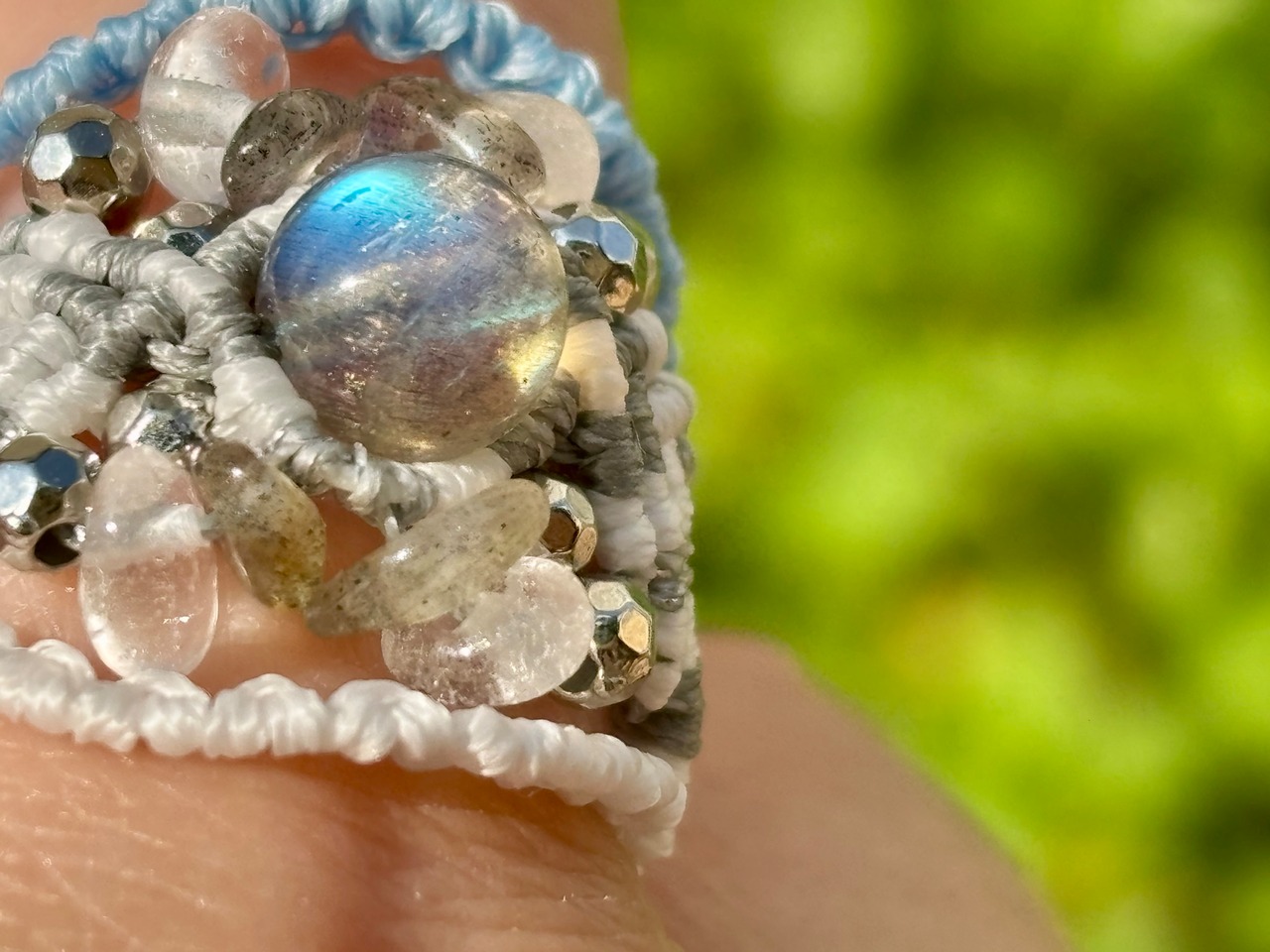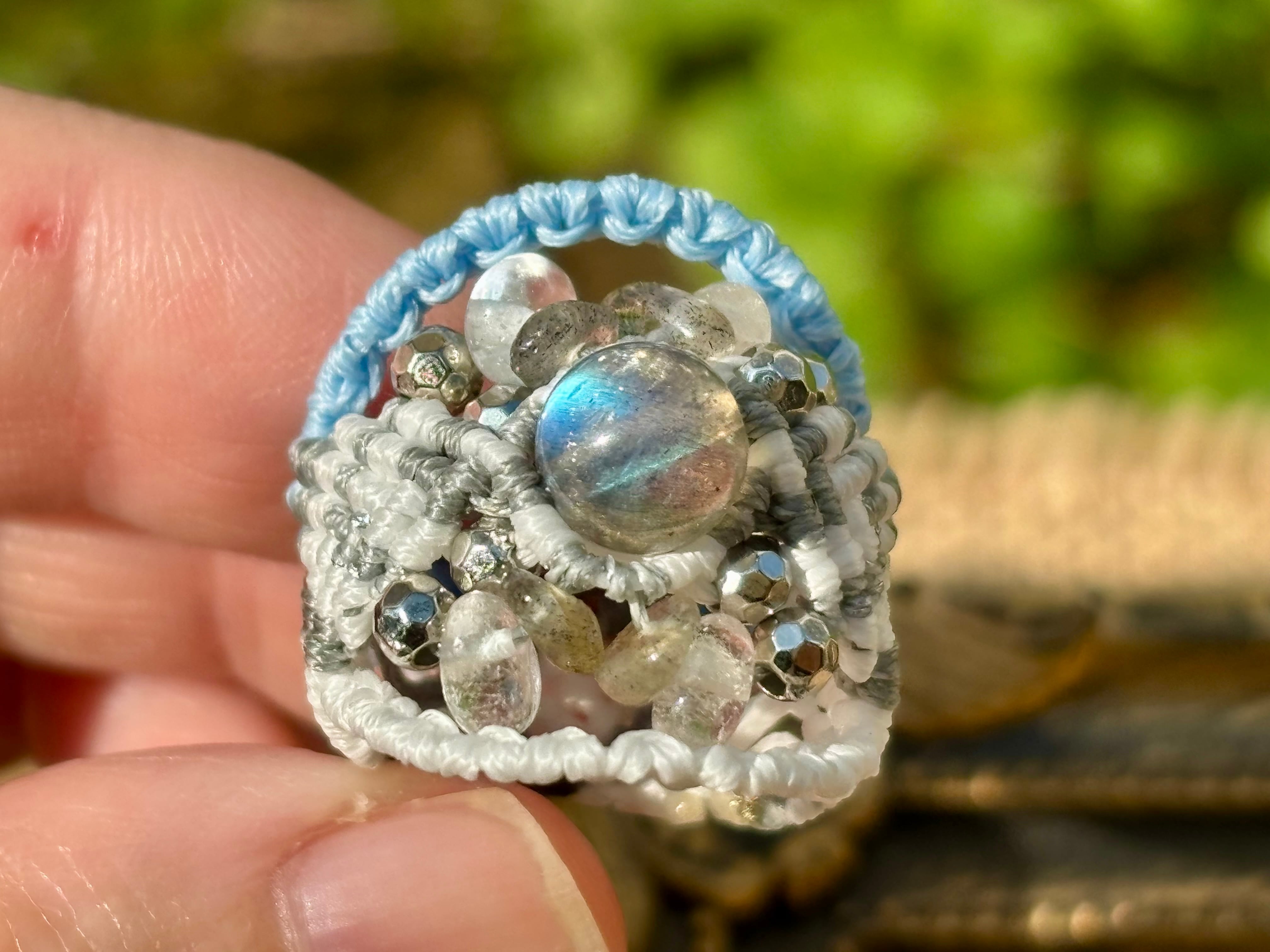 #869高品質ラブラドライト一点物(ラブラドライト×水晶 マクラメ編みリング/指輪)