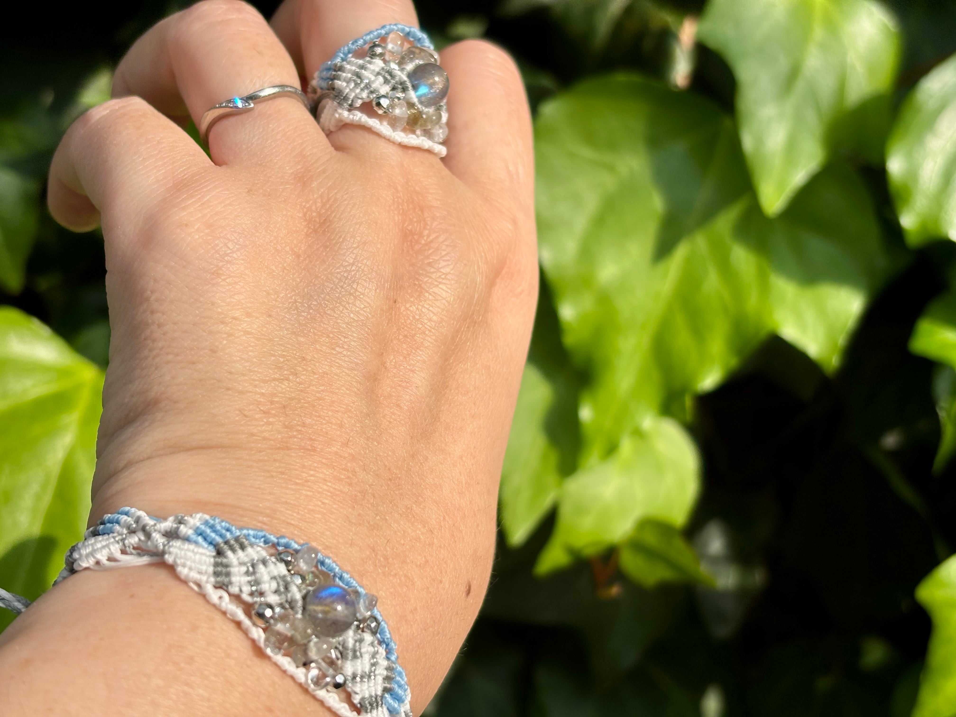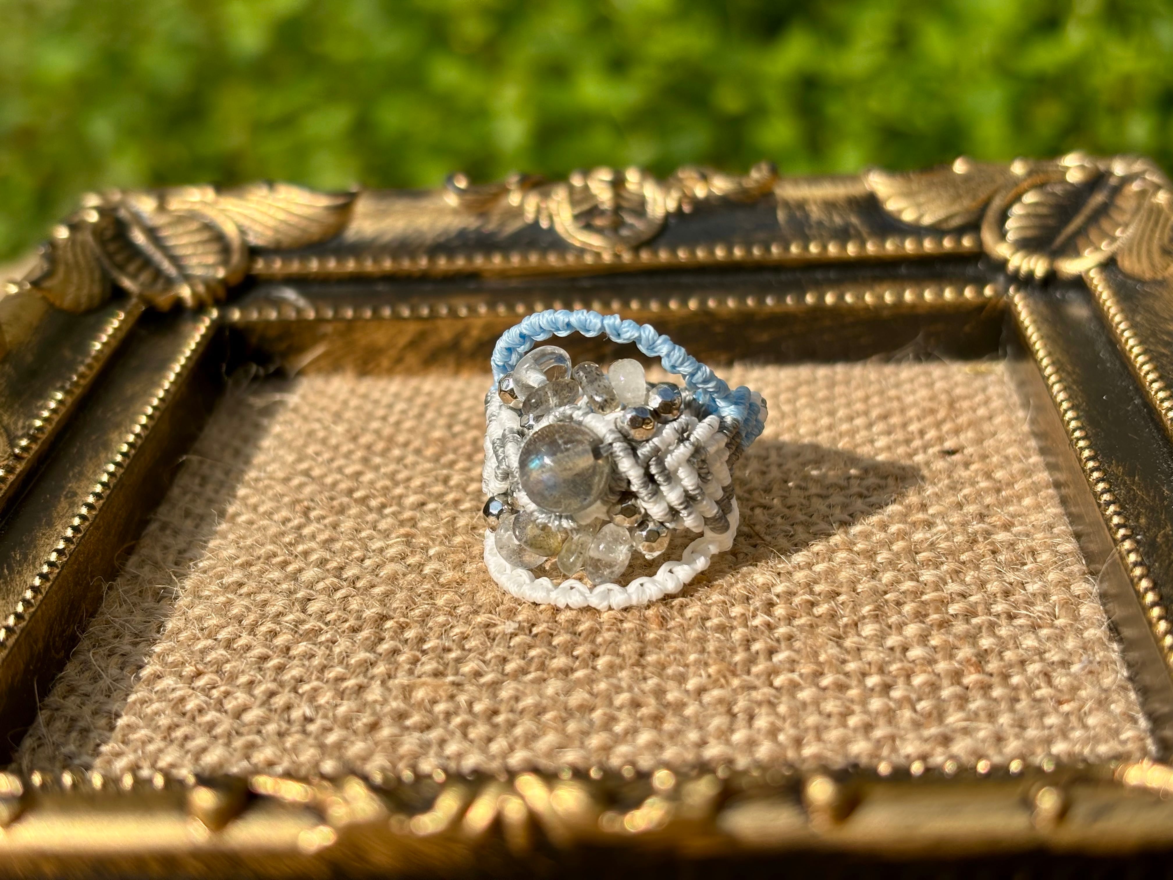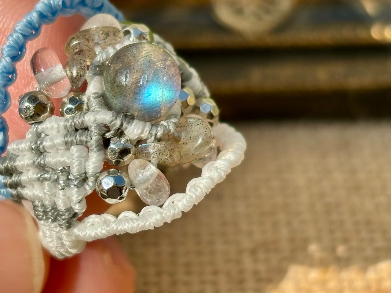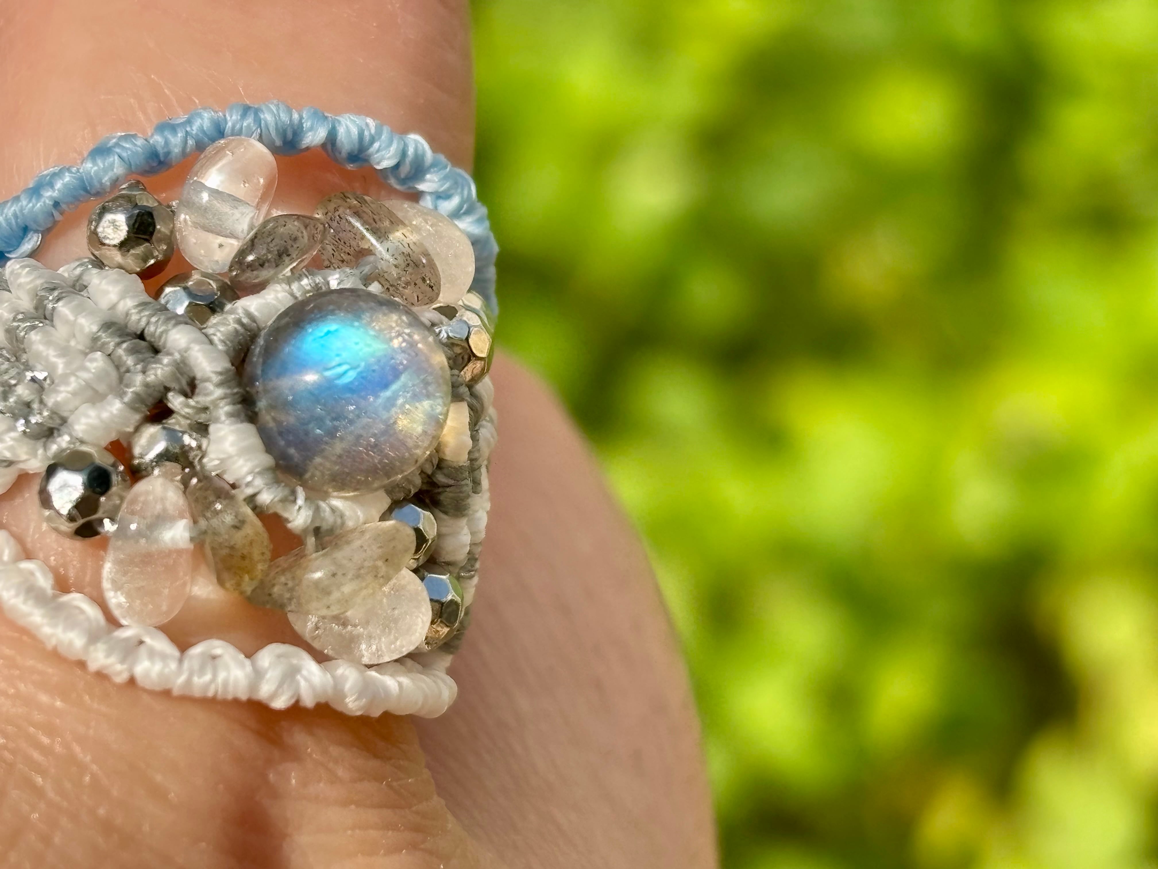 #869高品質ラブラドライト一点物(ラブラドライト×水晶 マクラメ編みリング/指輪)