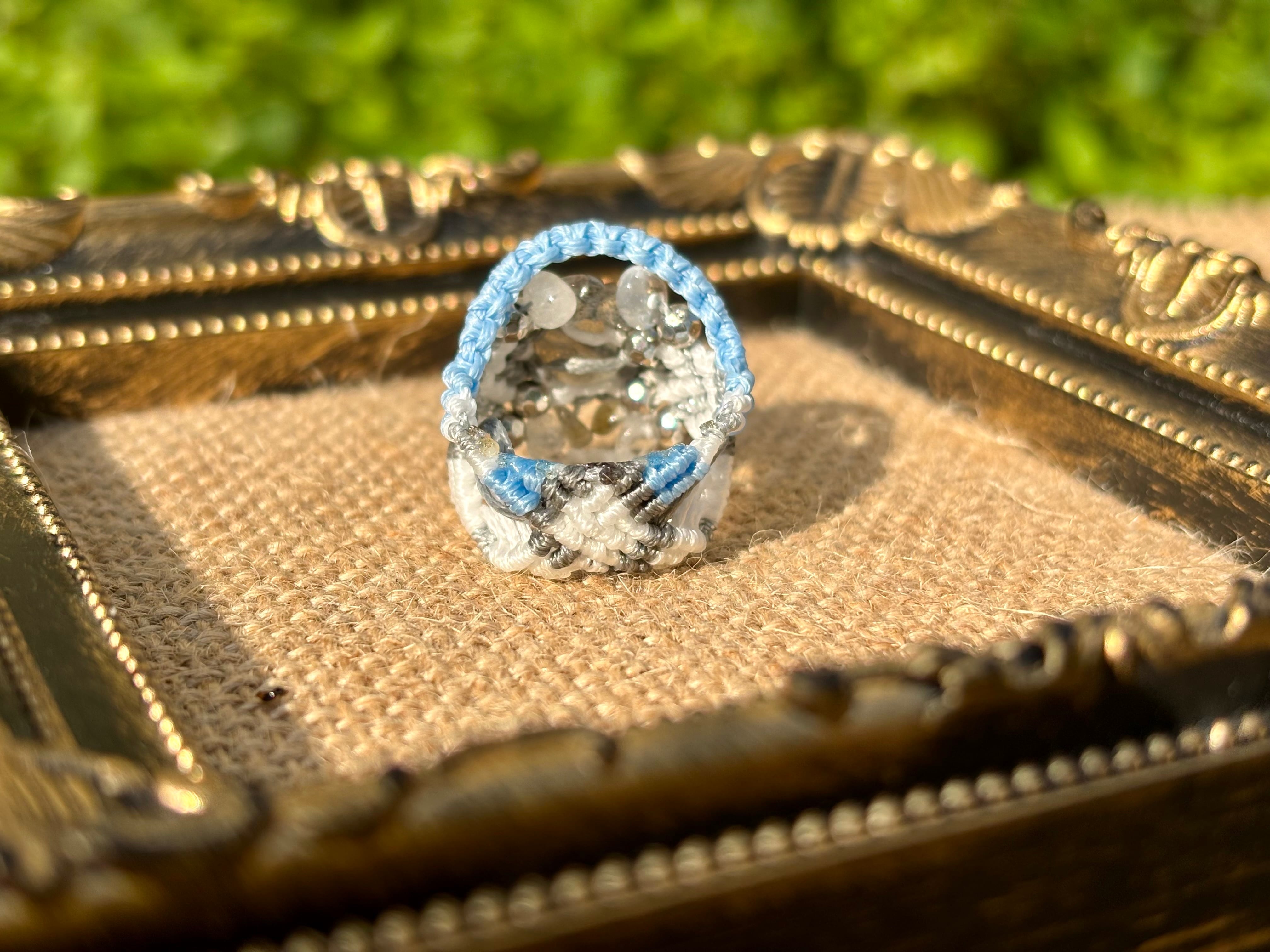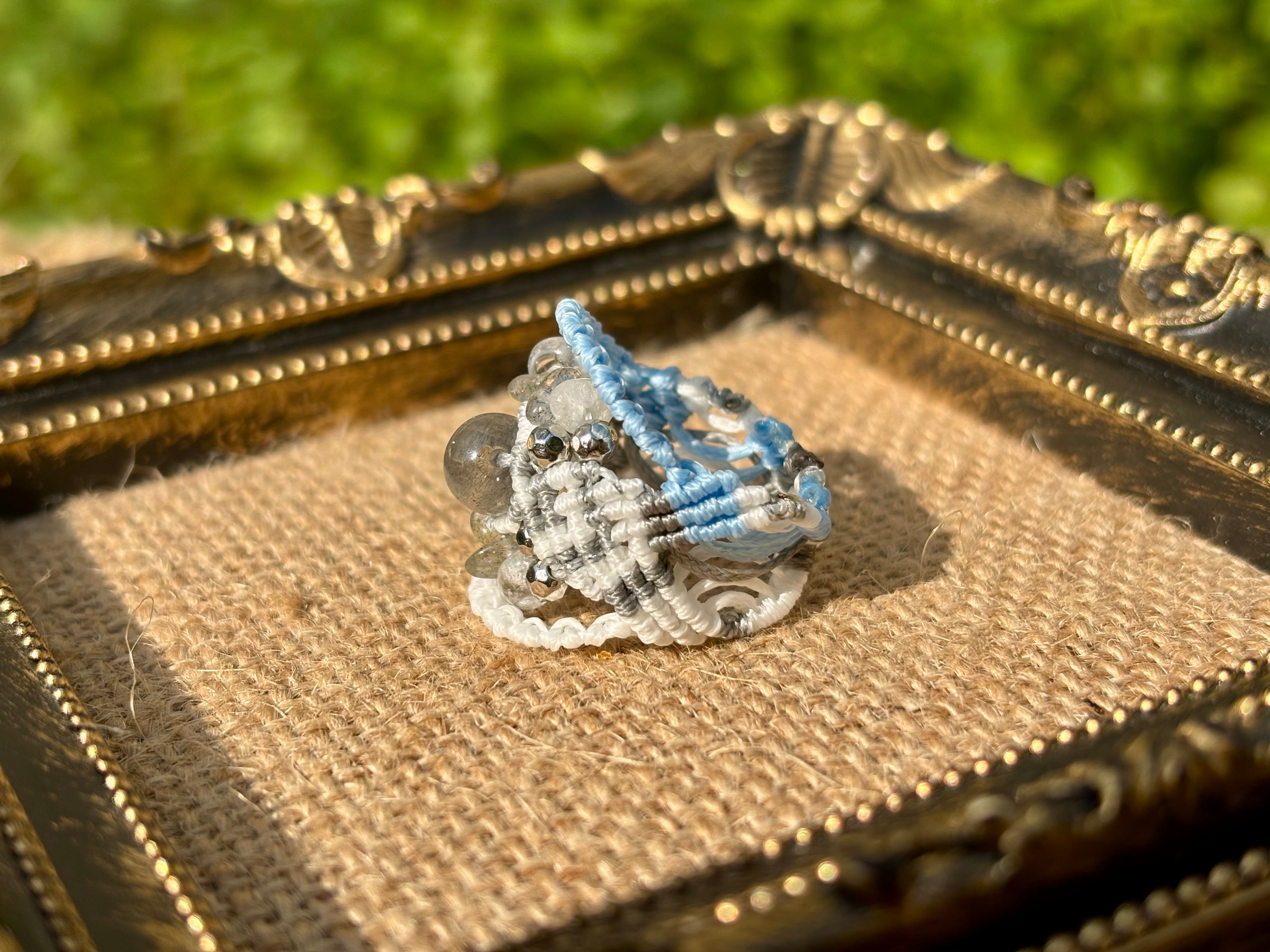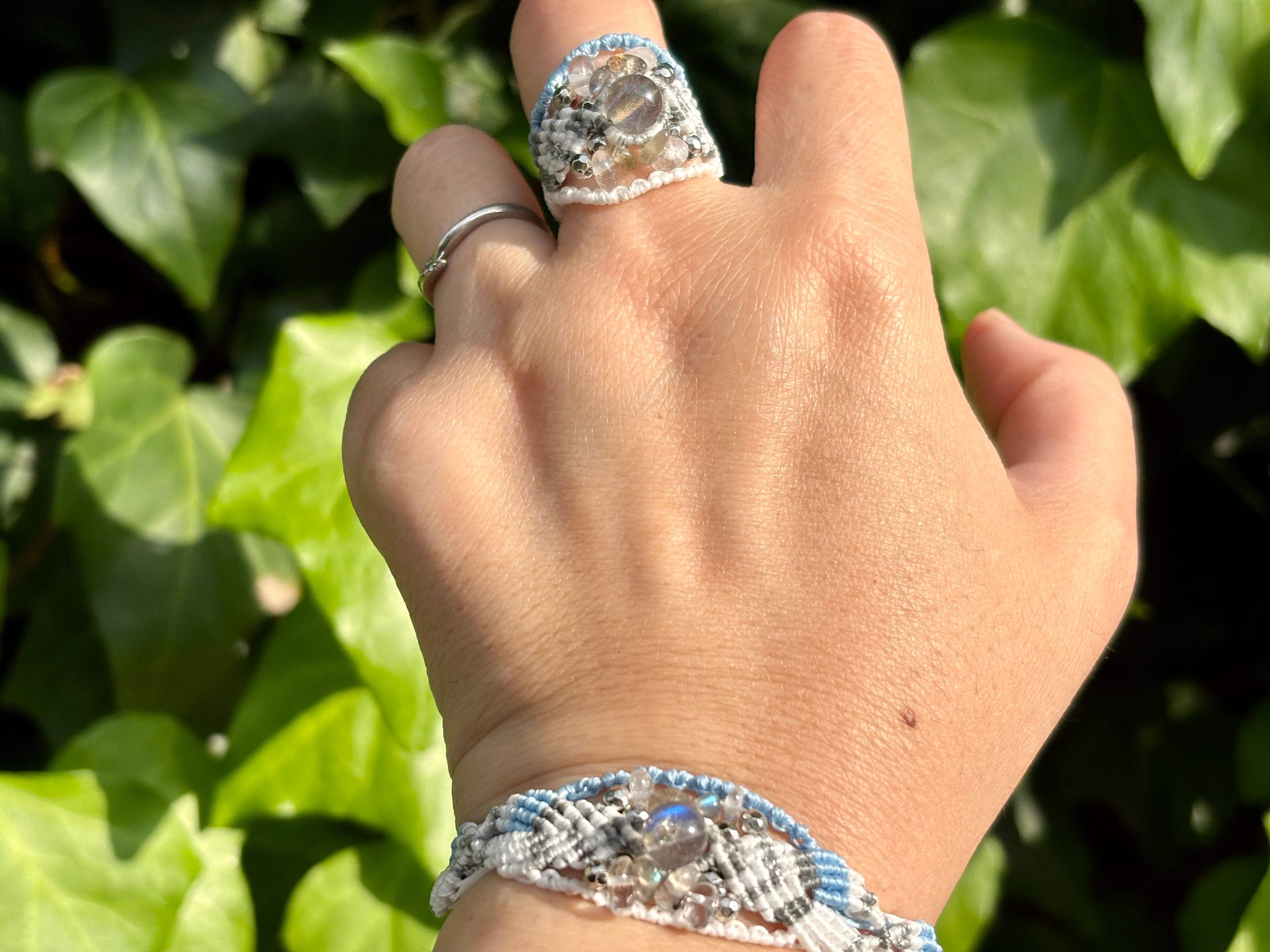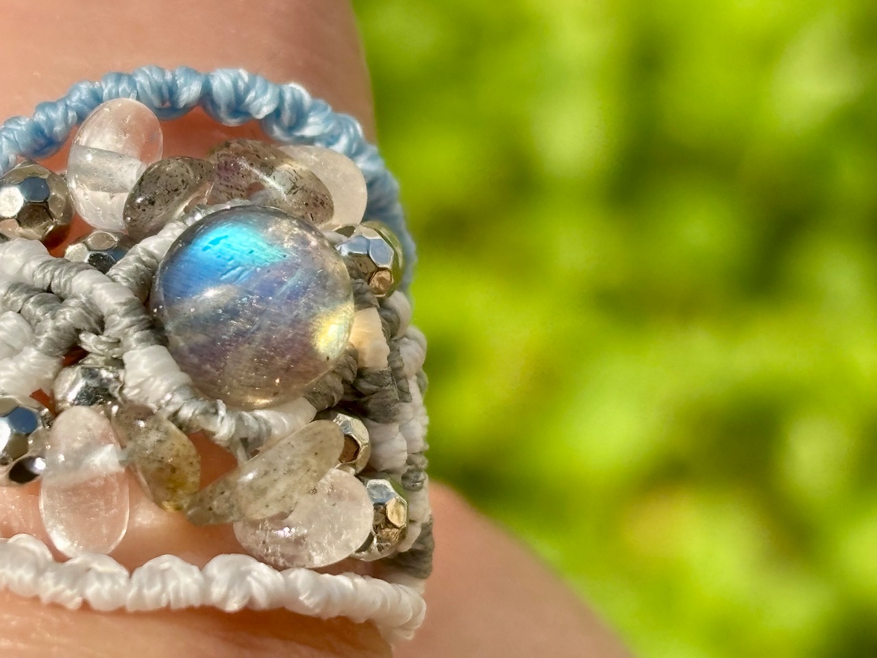 #869高品質ラブラドライト一点物(ラブラドライト×水晶 マクラメ編みリング/指輪)