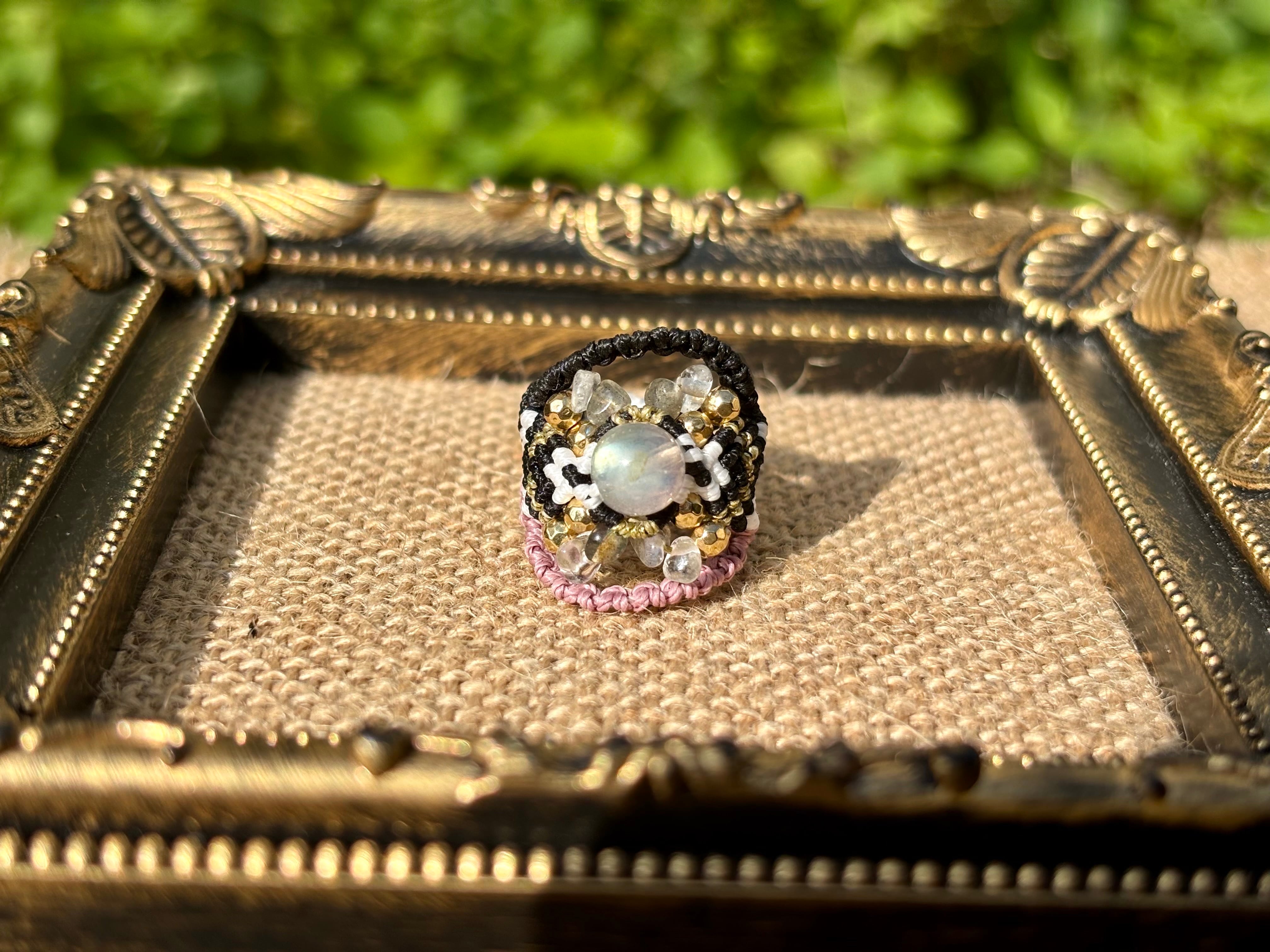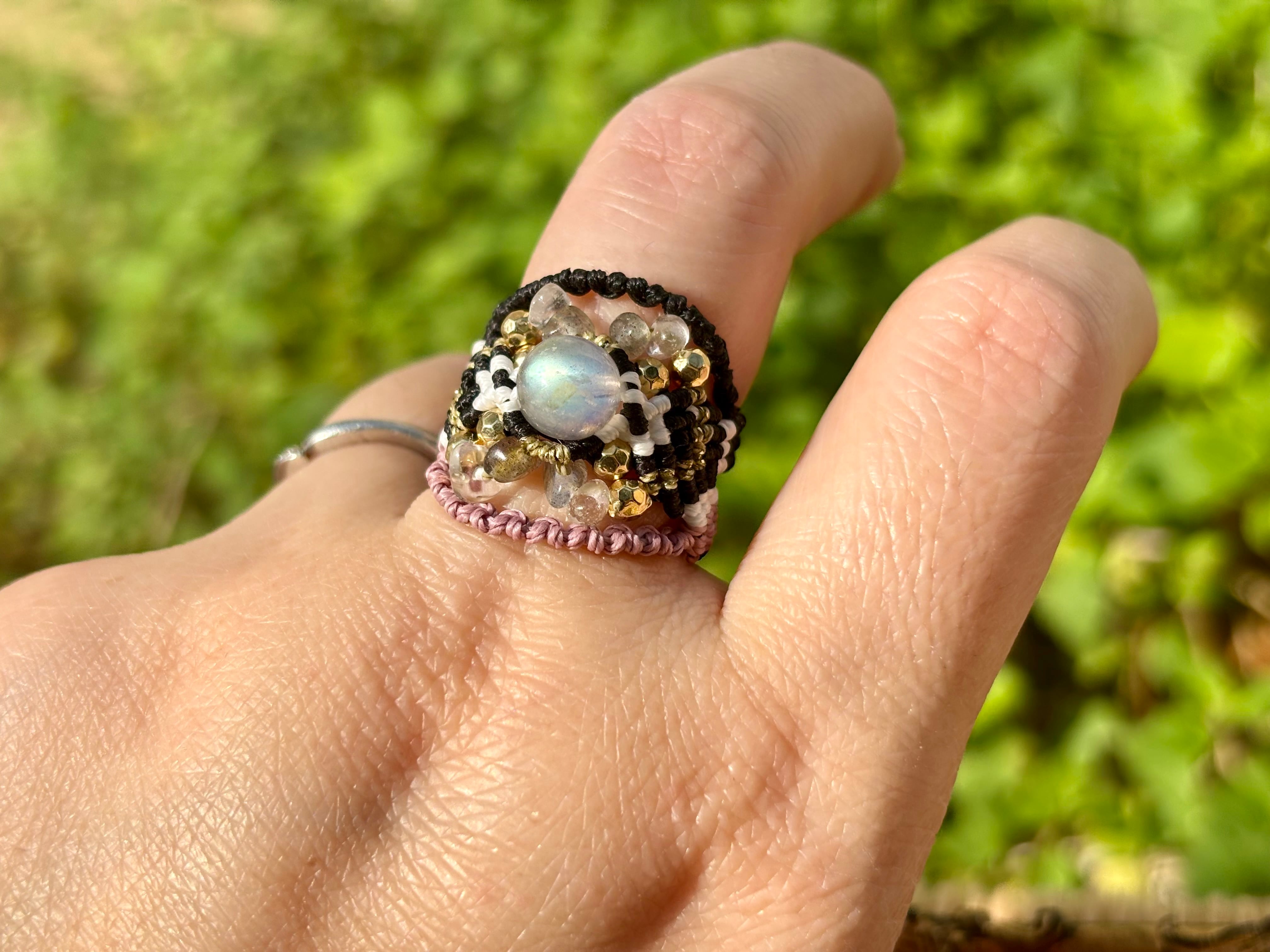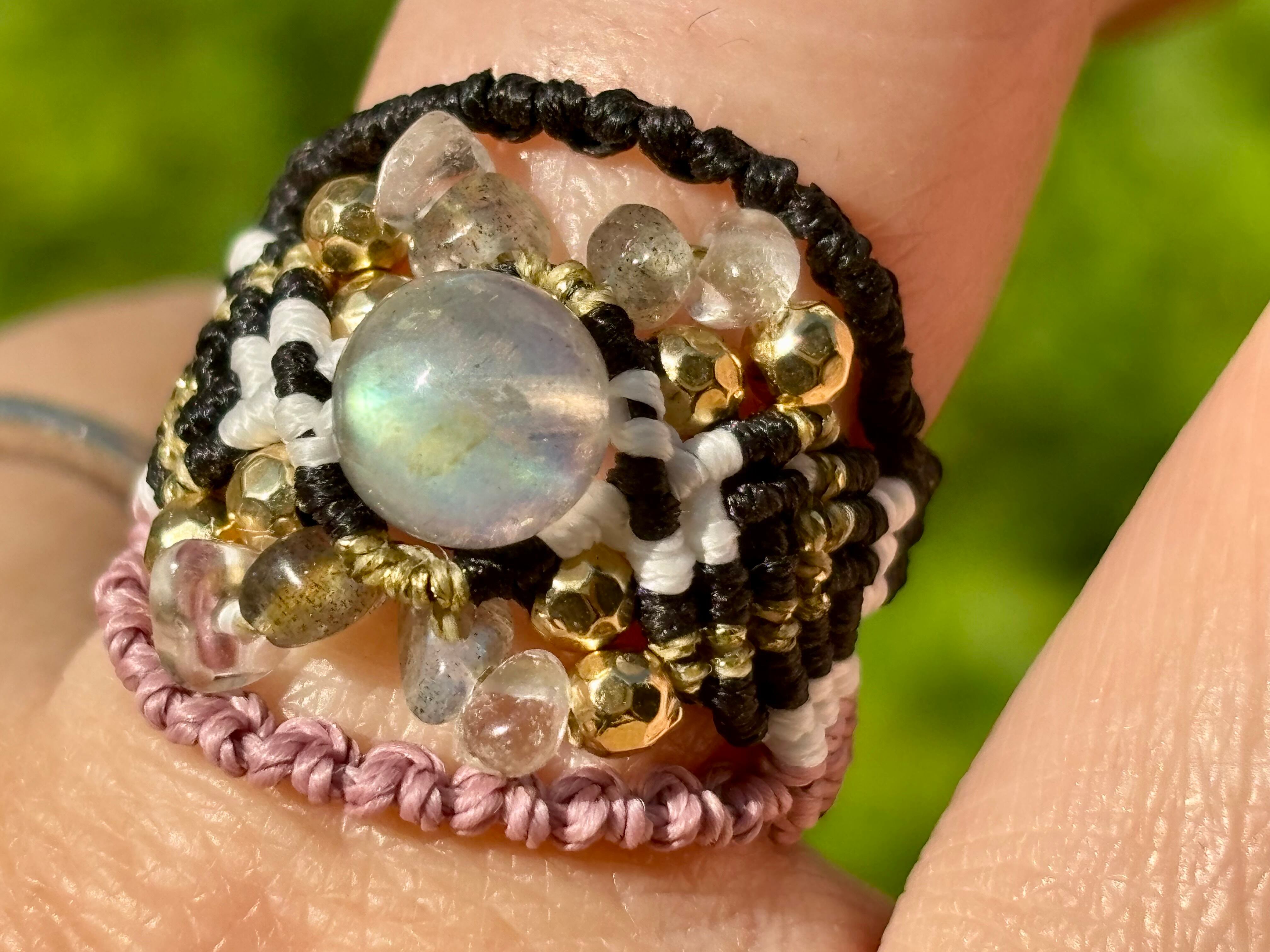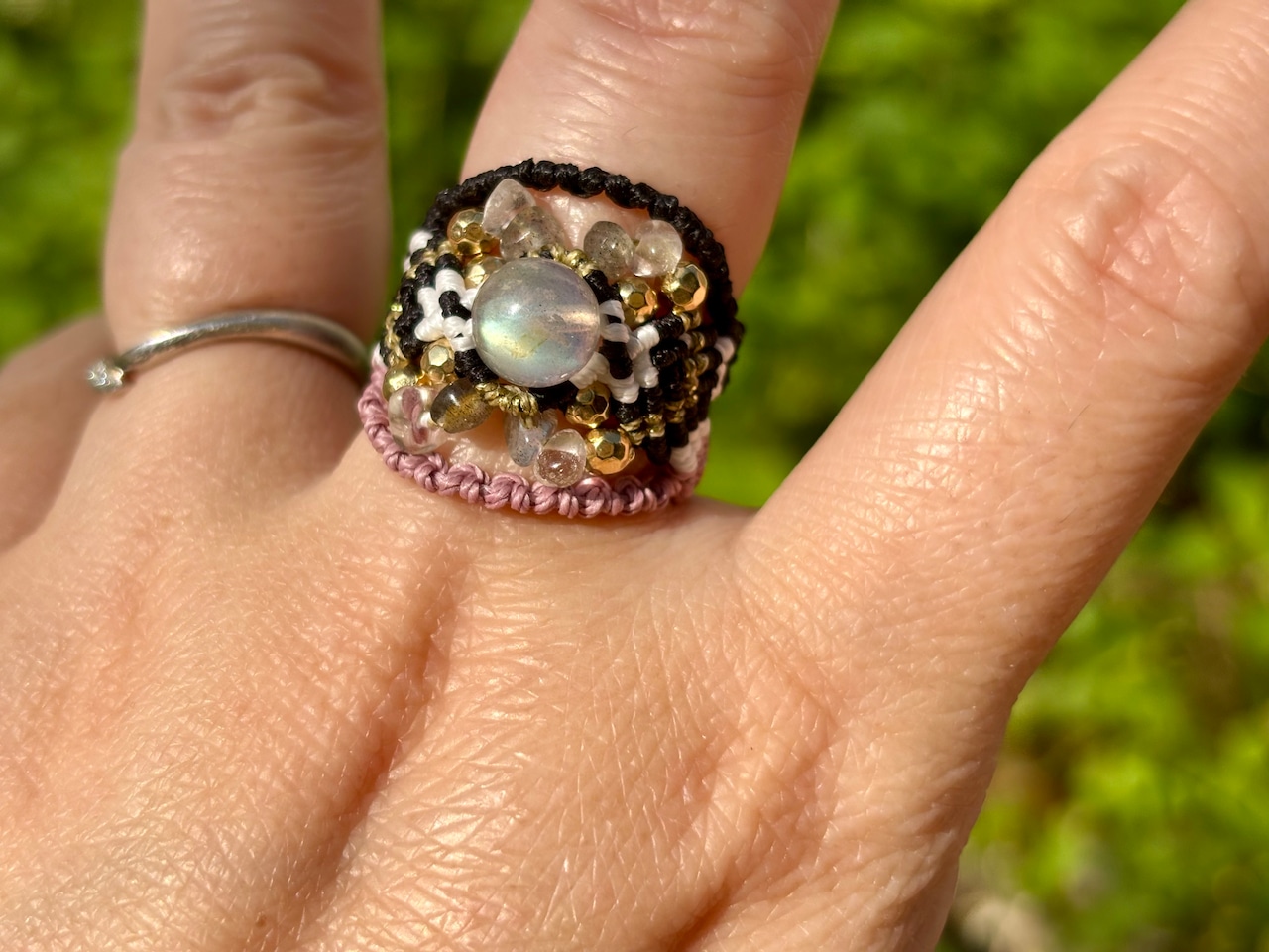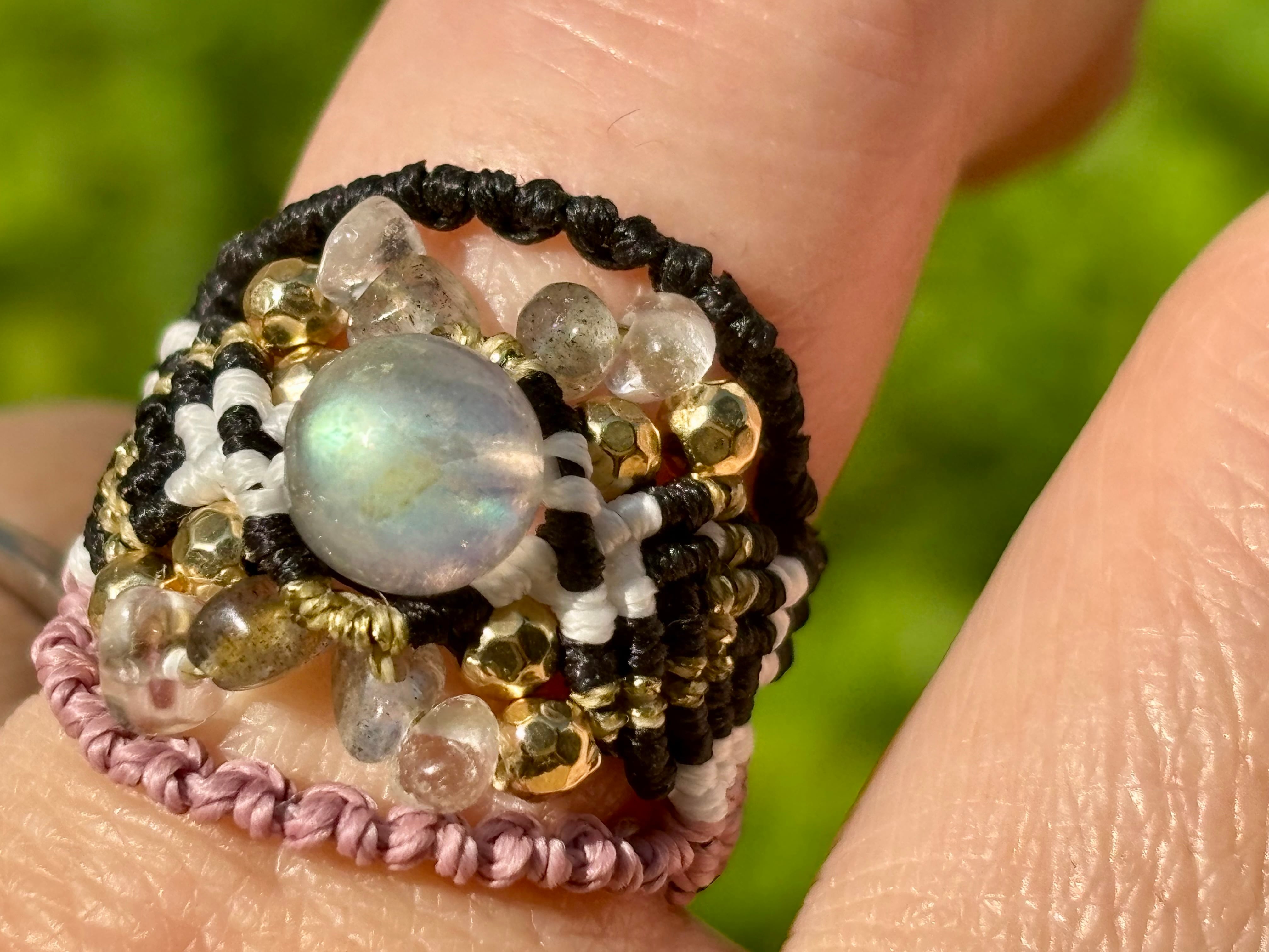 #875高品質ラブラドライト一点物(ラブラドライト×水晶 マクラメ編みリング/指輪)
