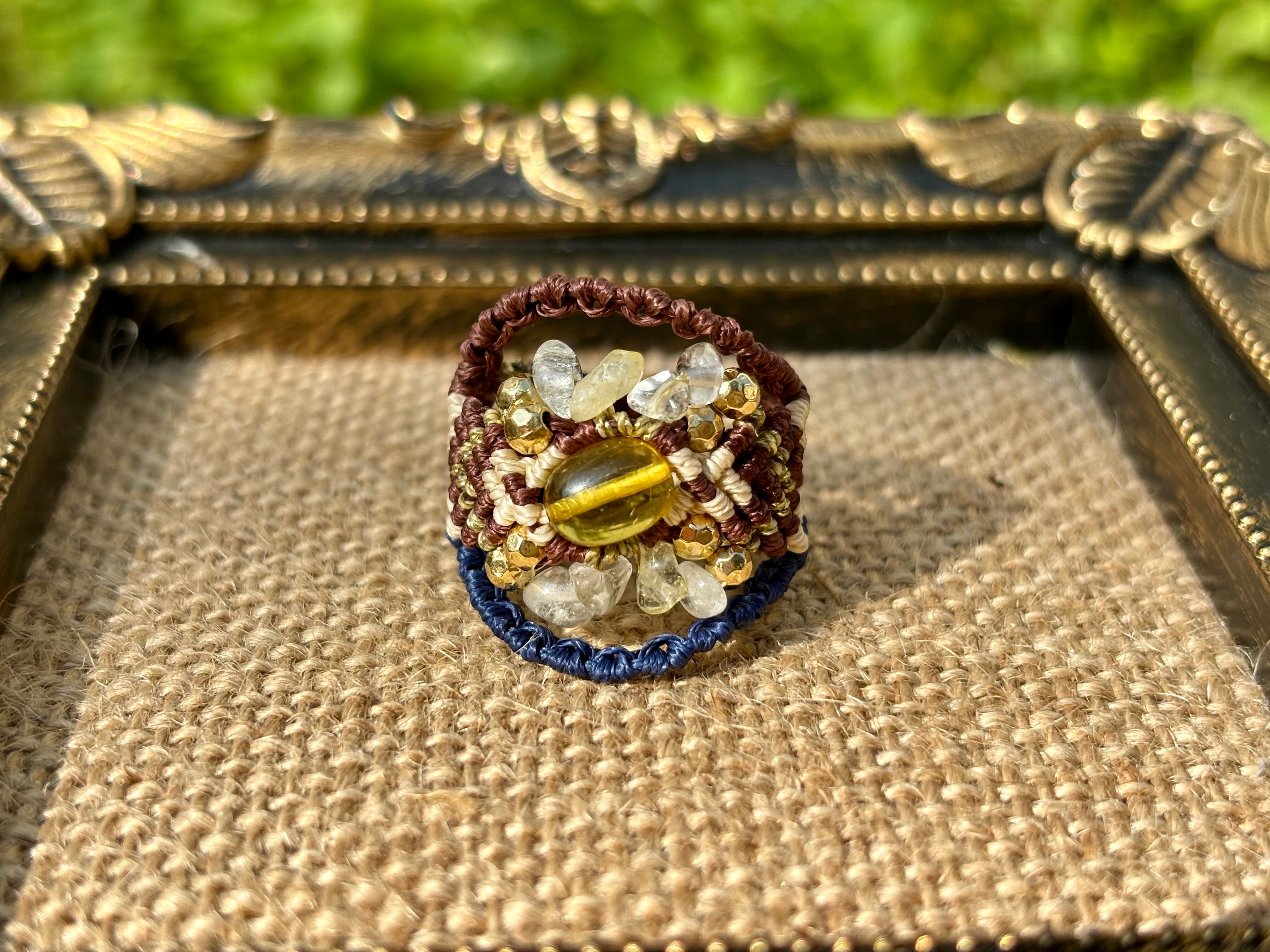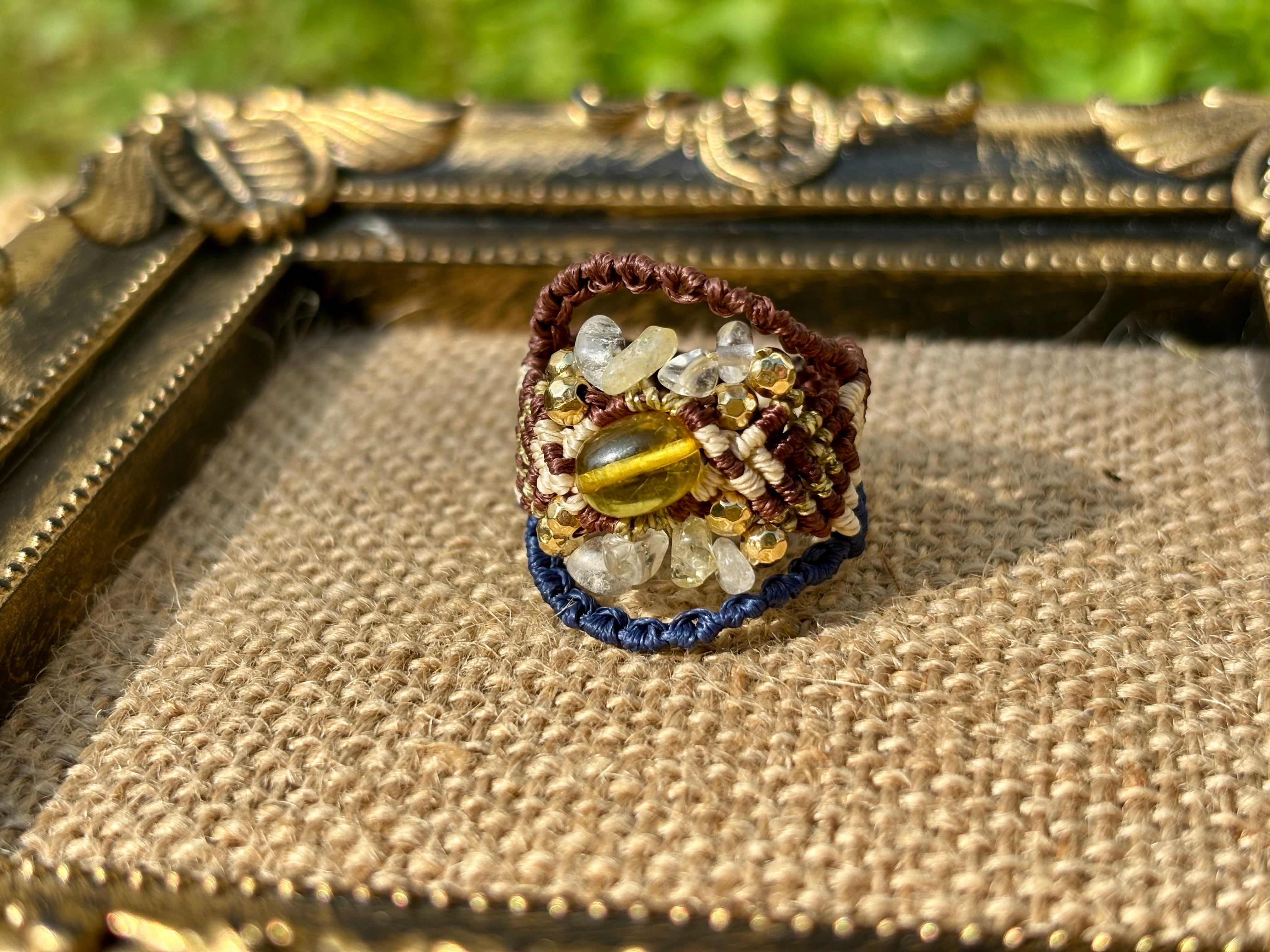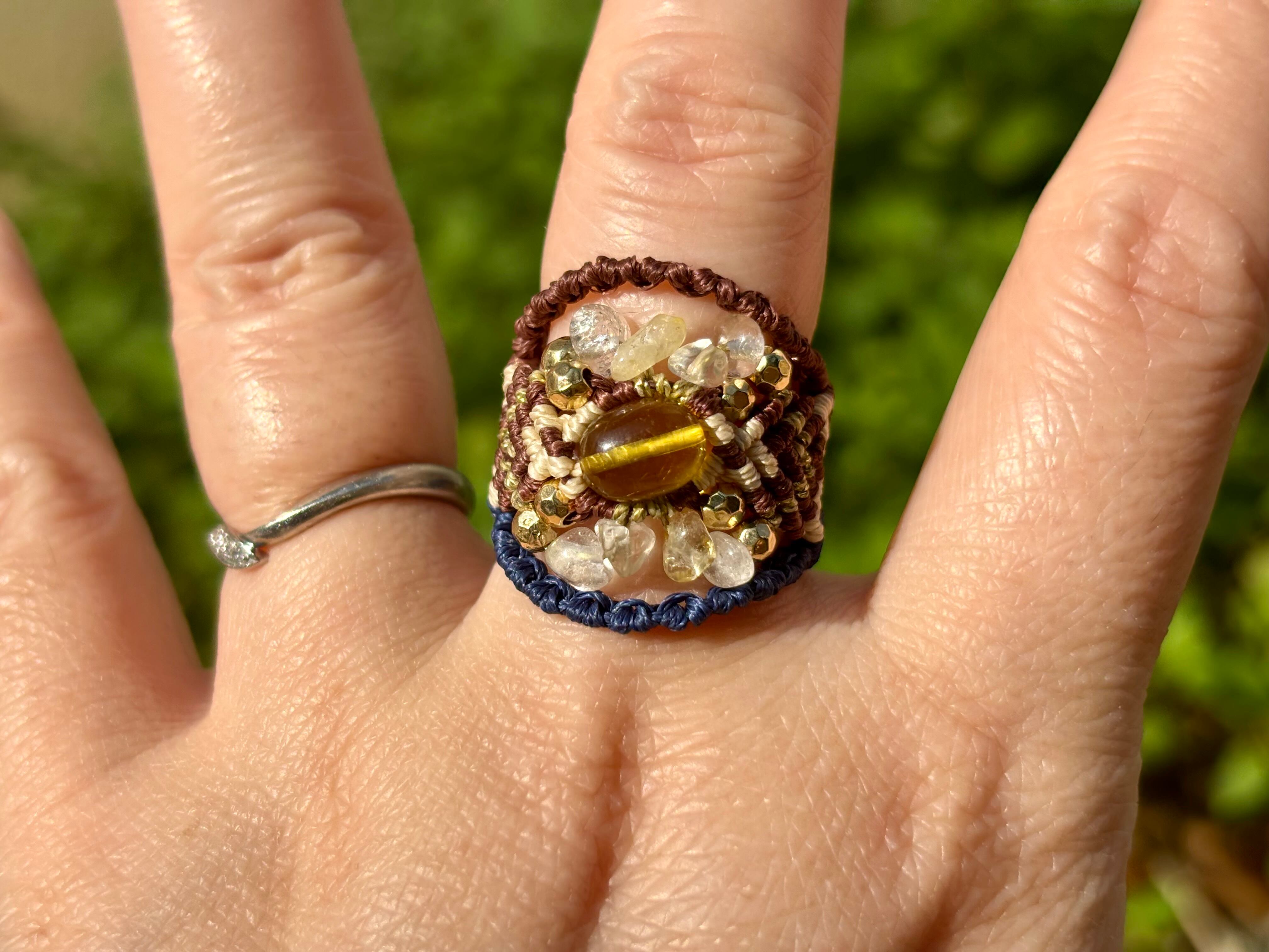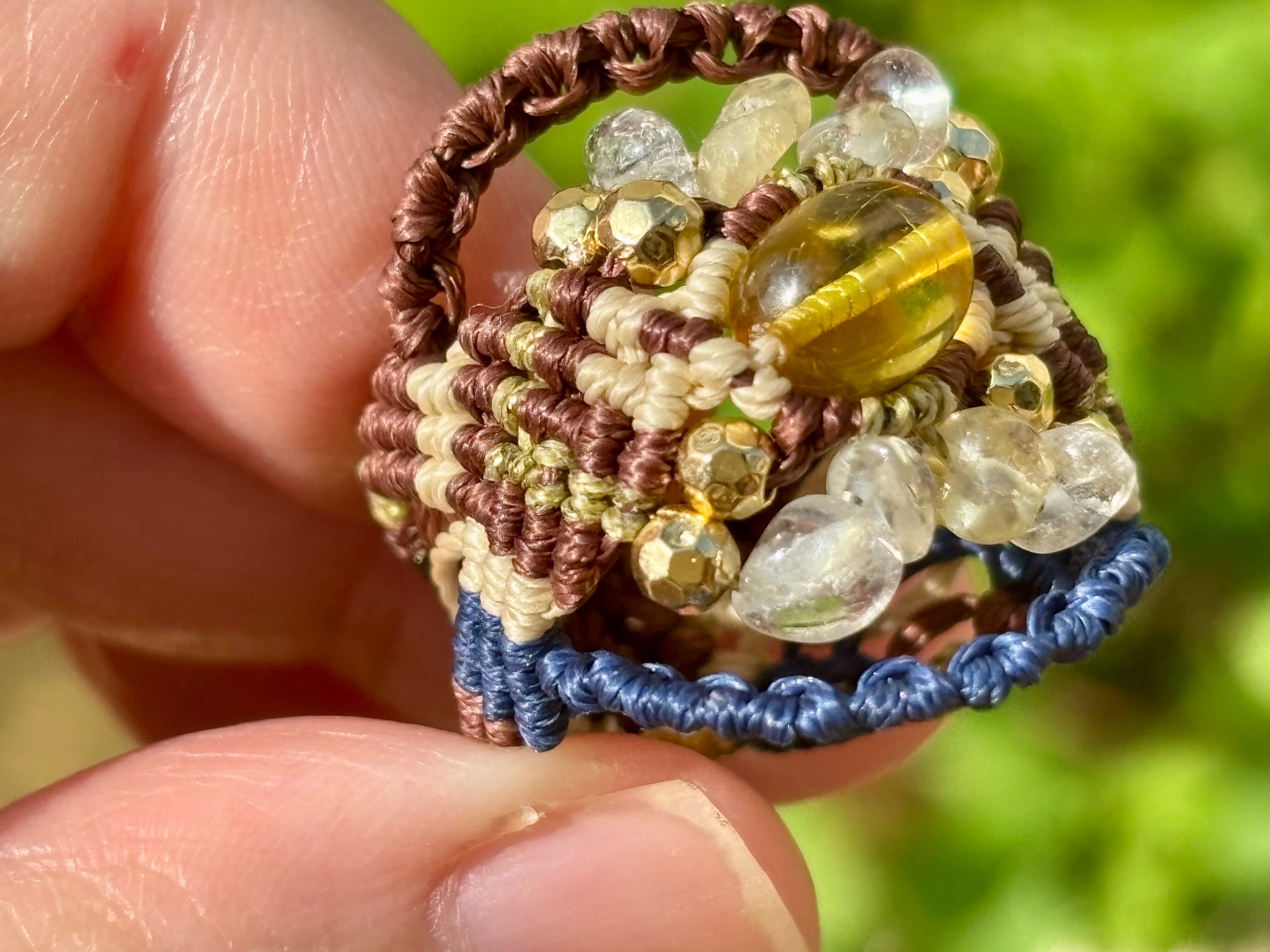 #879リトアニア産グリーンアンバー(グリーンアンバー×シトリン×水晶 マクラメ編みリング/指輪)