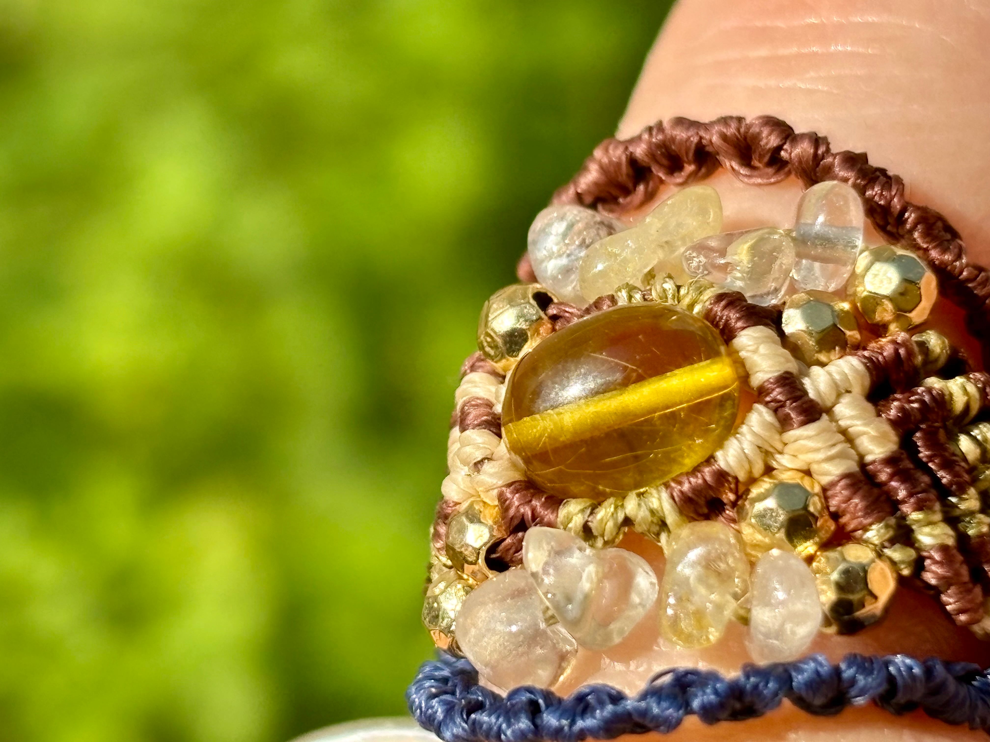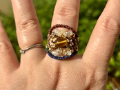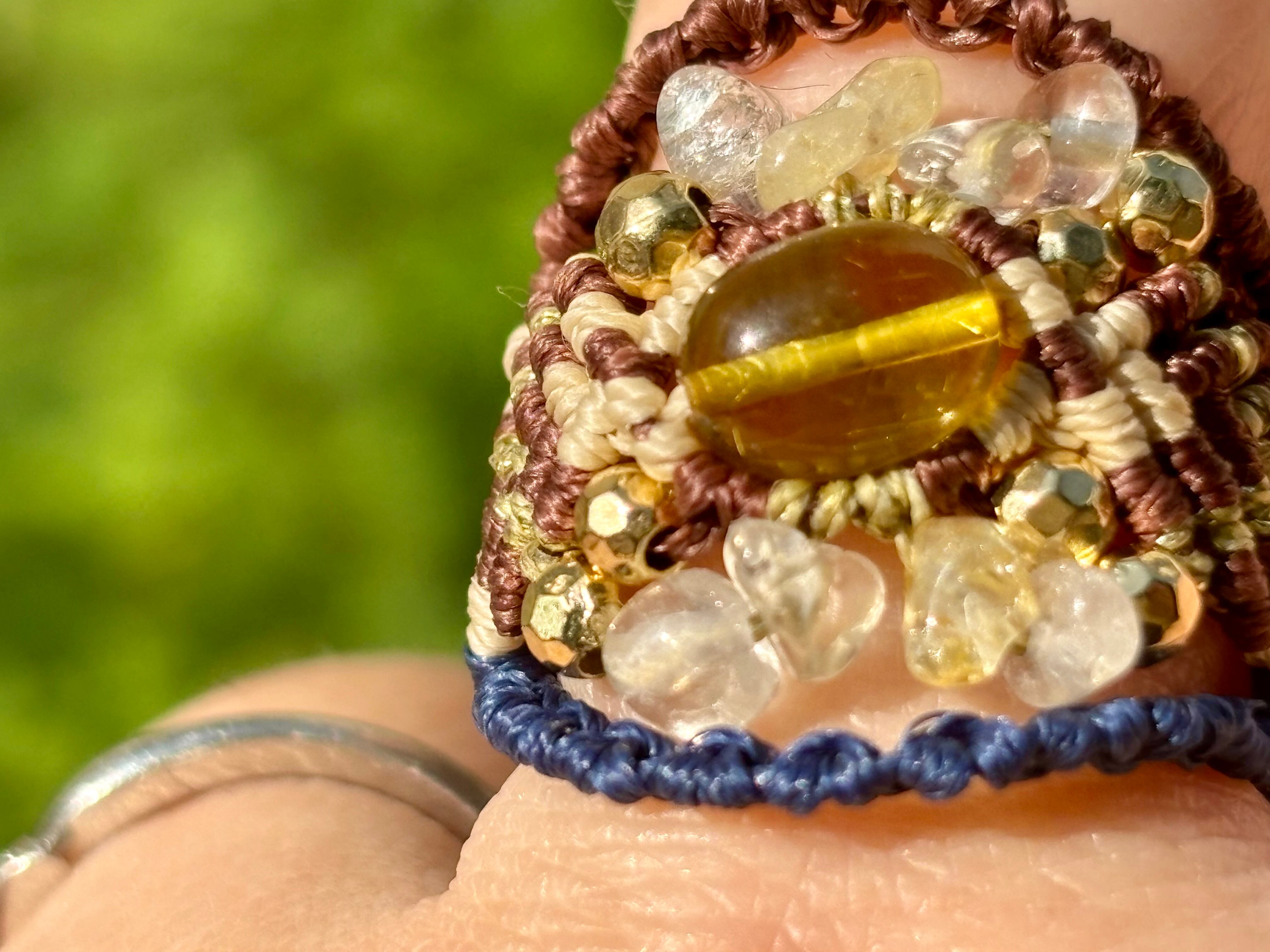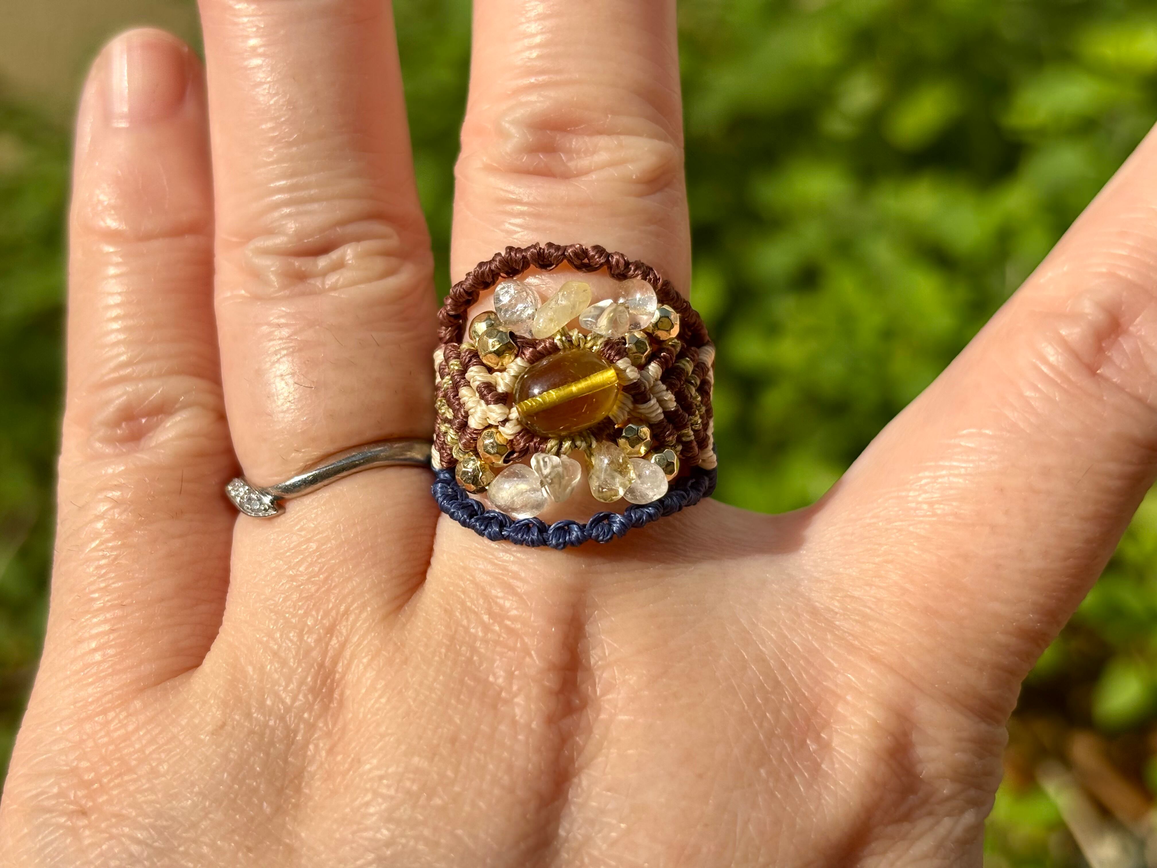 #879リトアニア産グリーンアンバー(グリーンアンバー×シトリン×水晶 マクラメ編みリング/指輪)