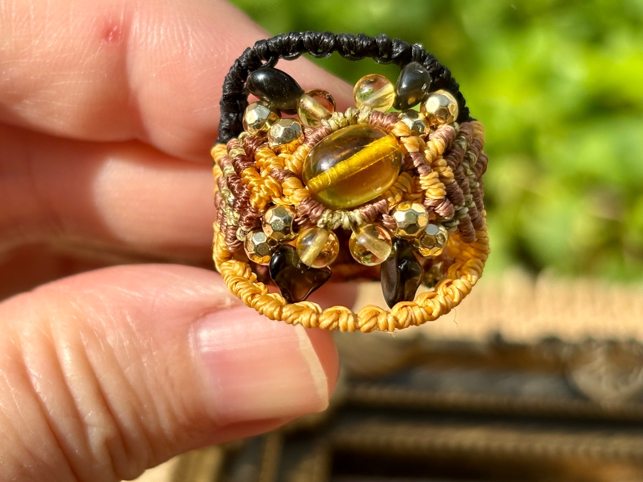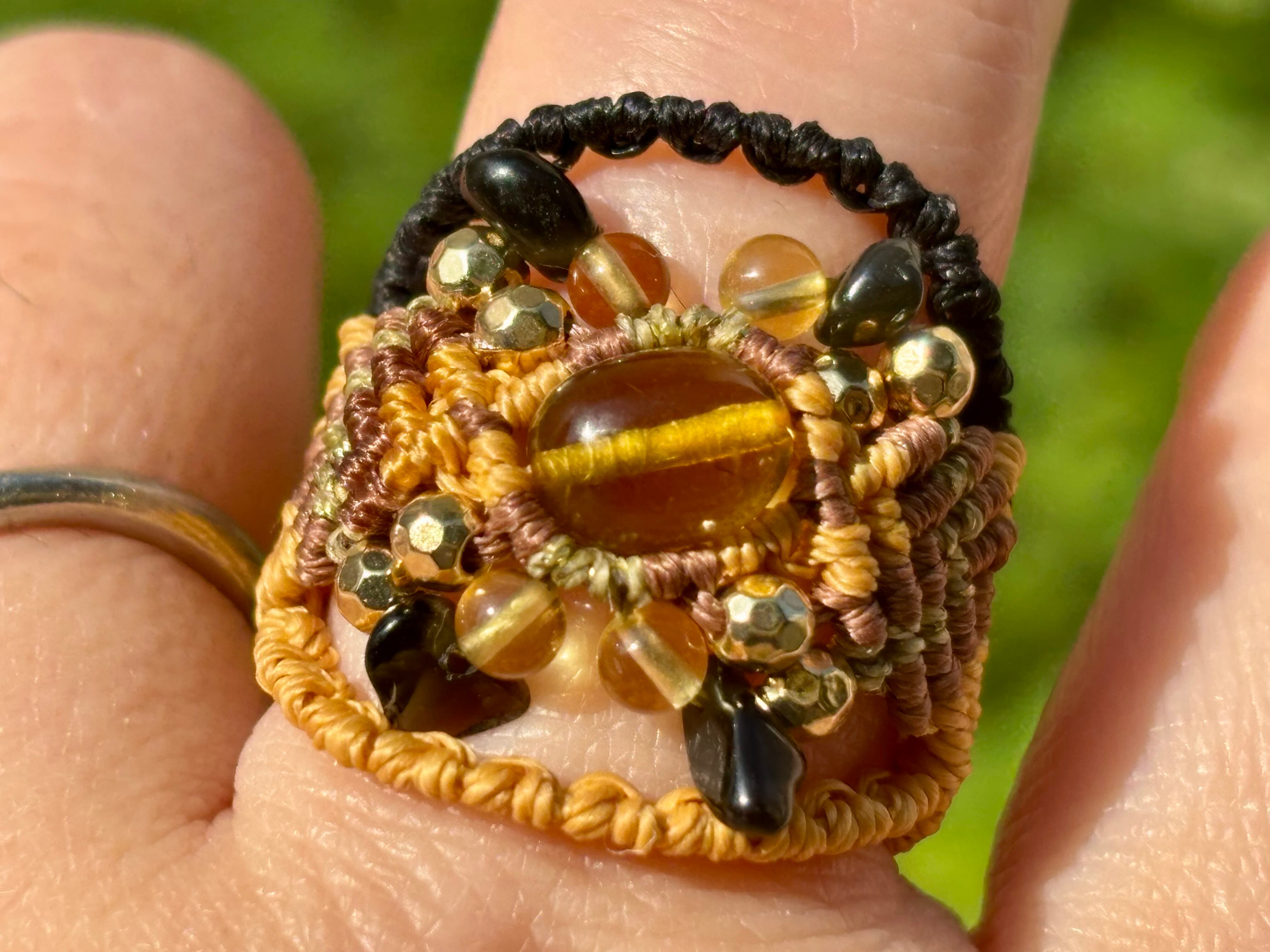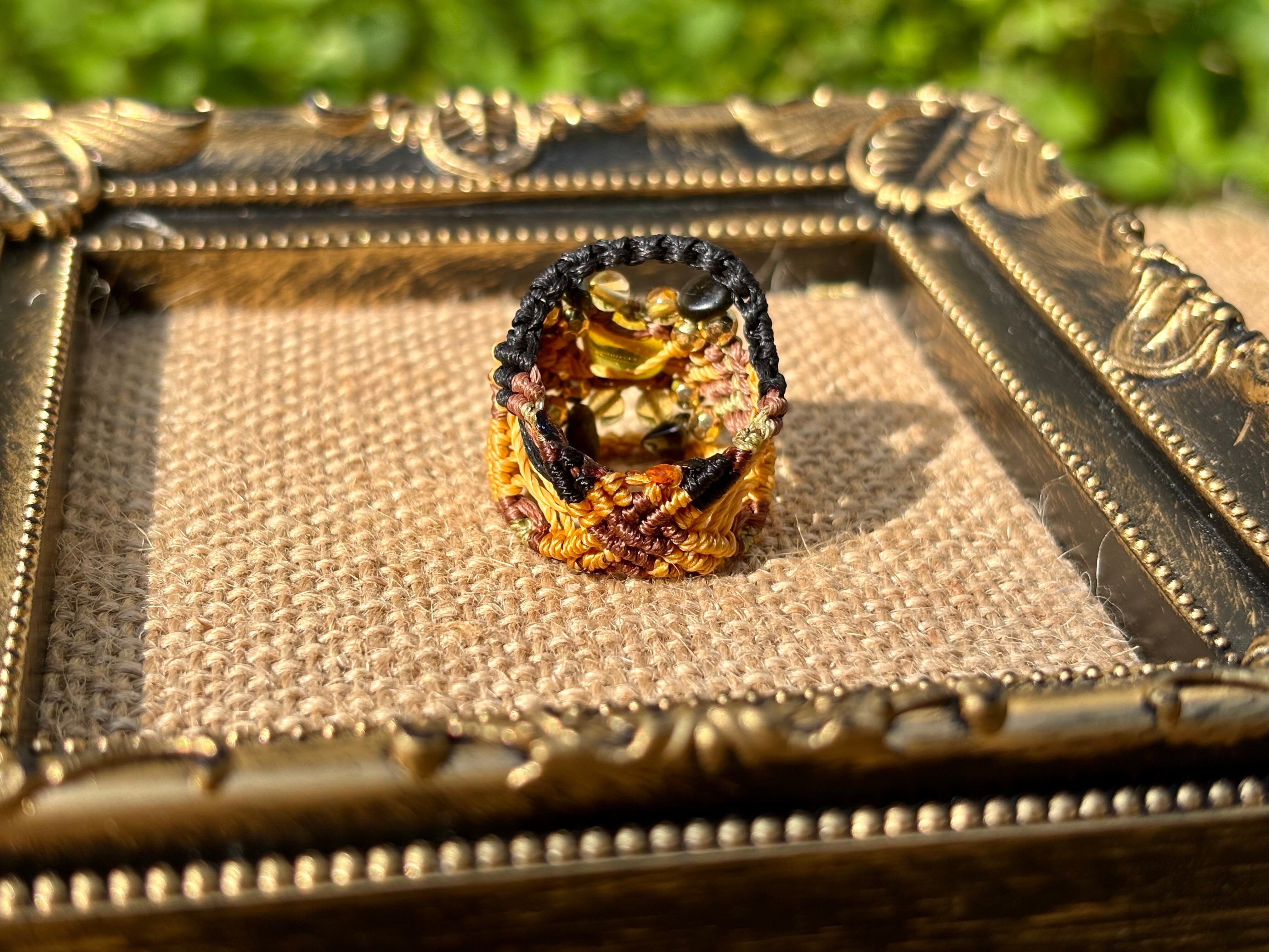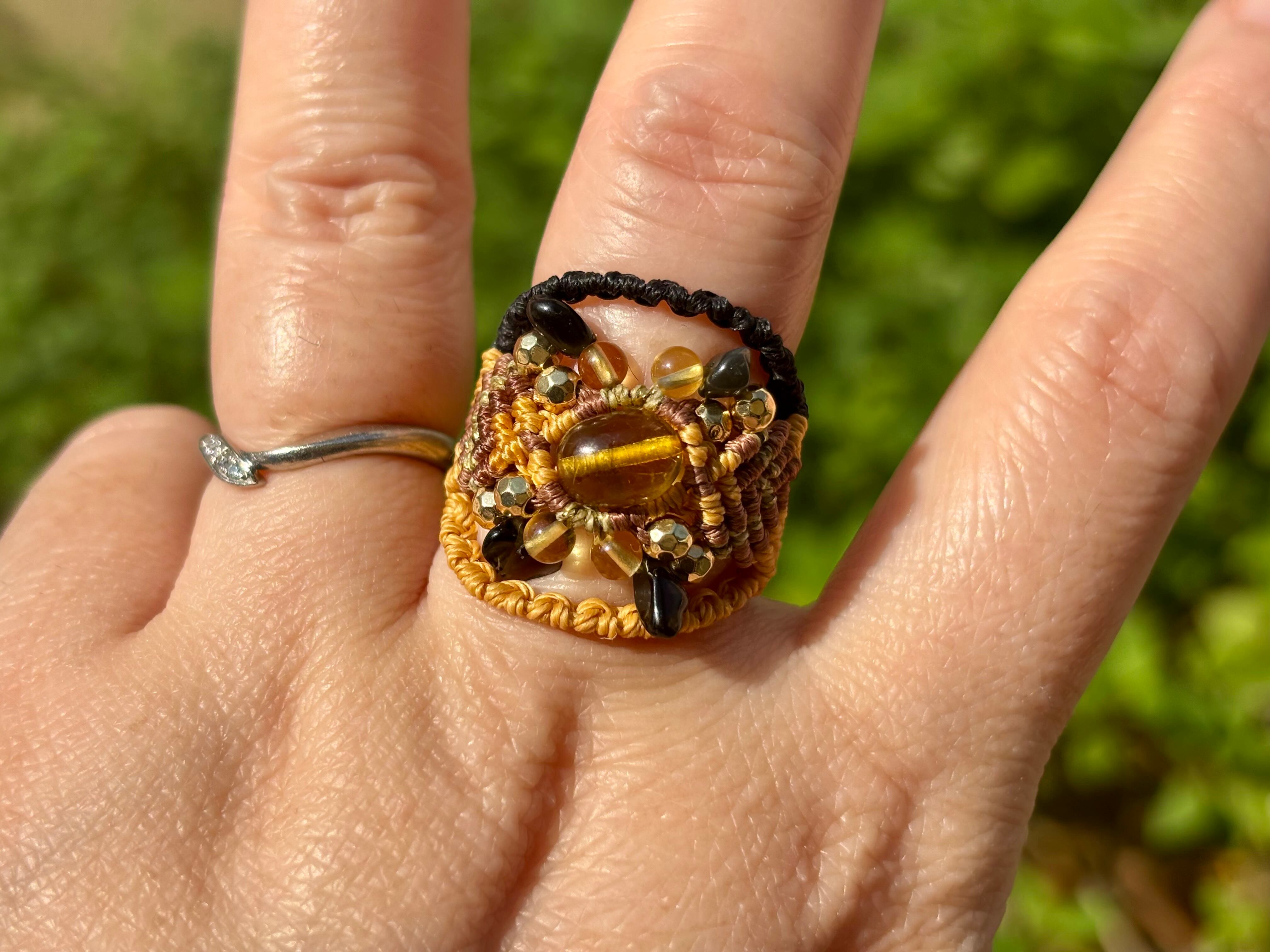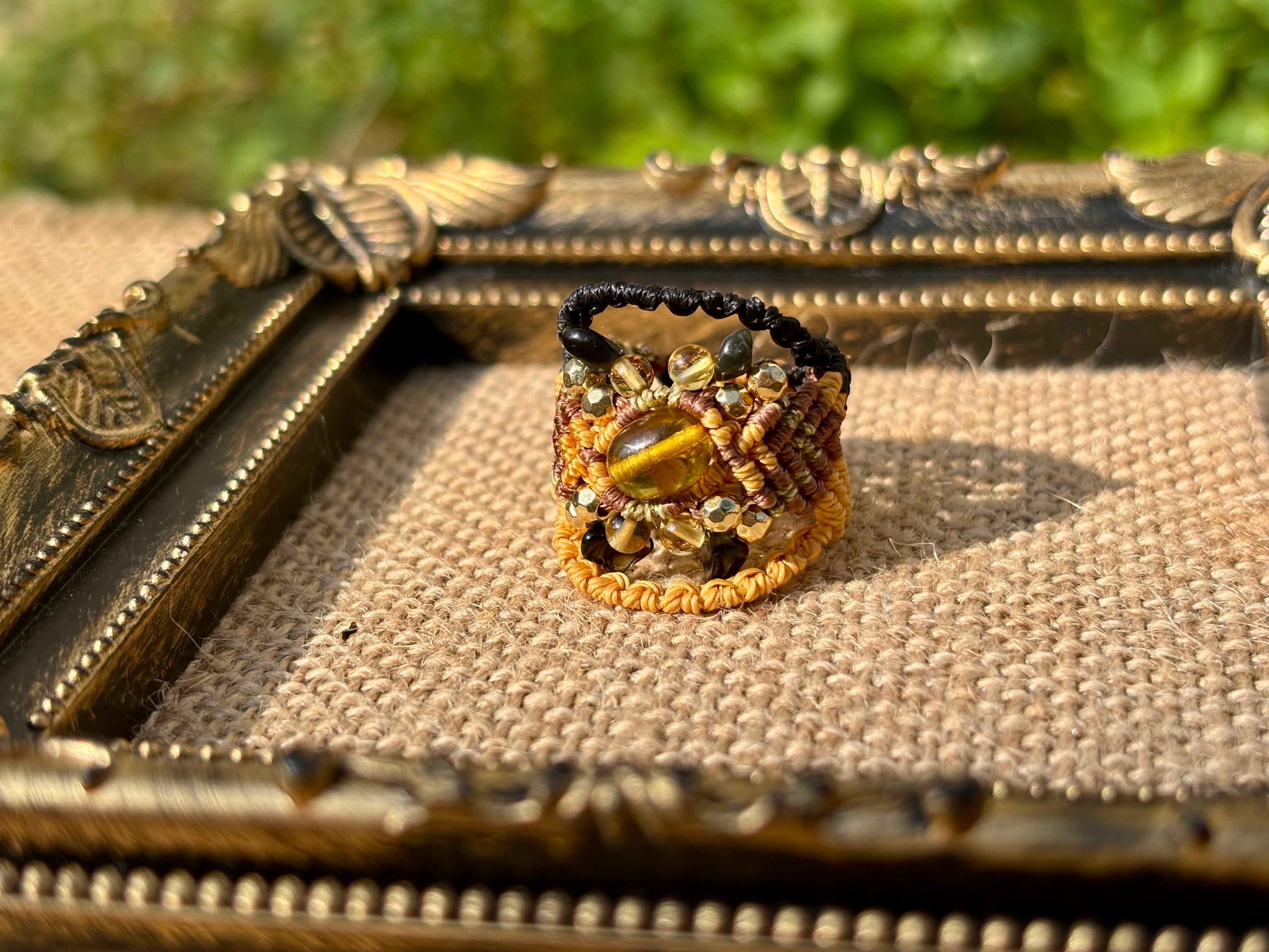 #881リトアニア産グリーンアンバー(グリーンアンバー×シトリン×オニキス マクラメ編みリング/指輪)