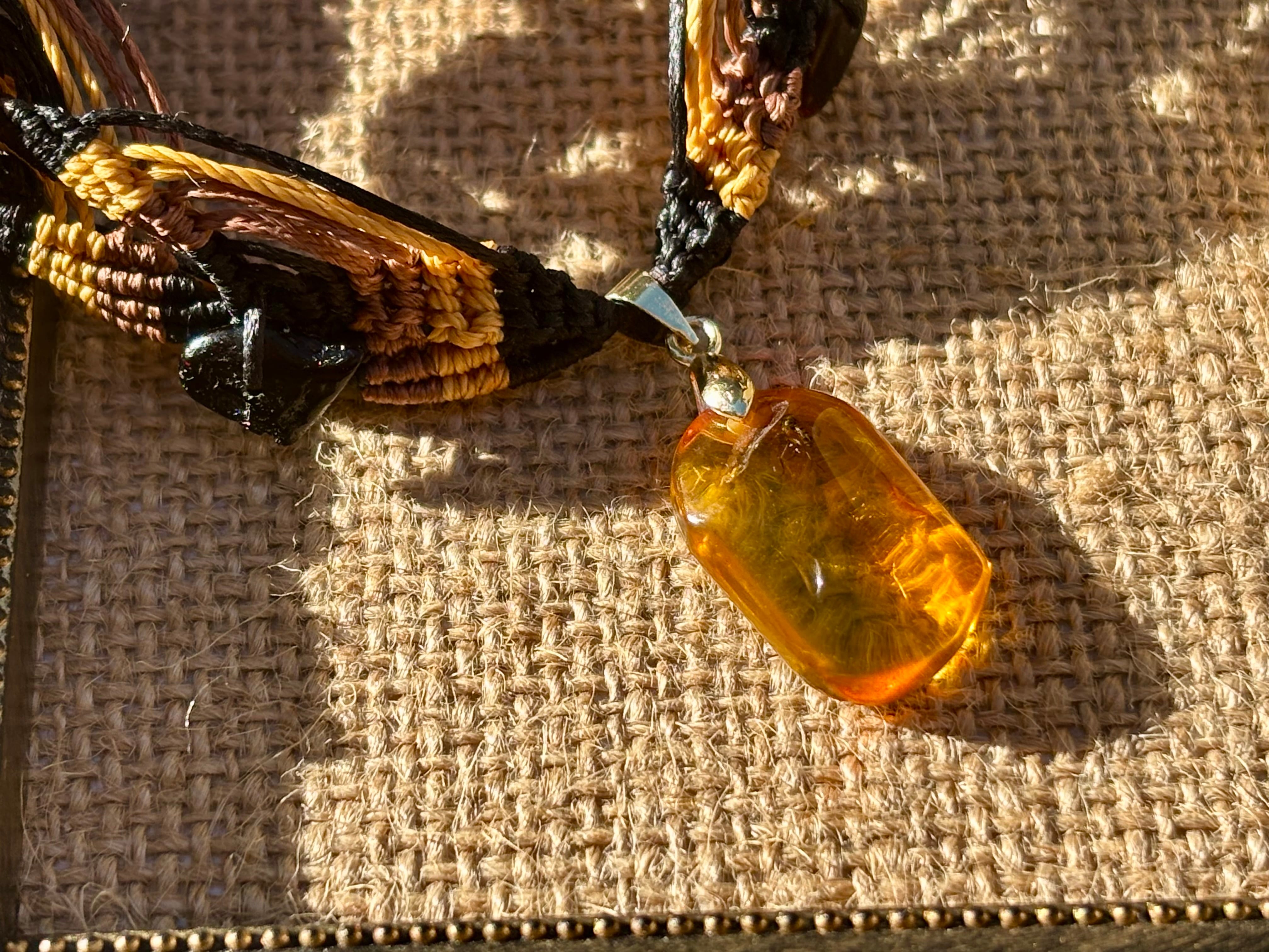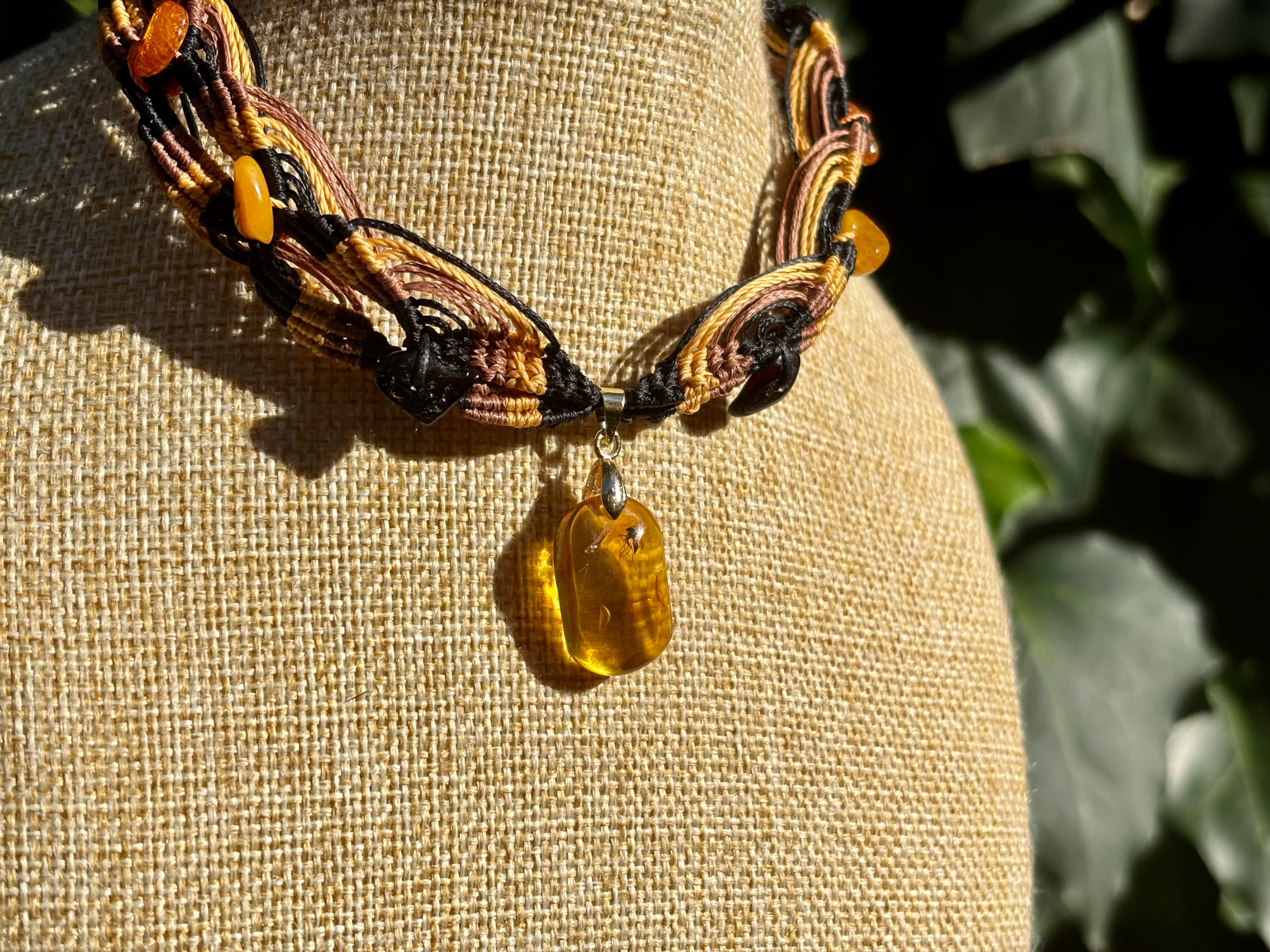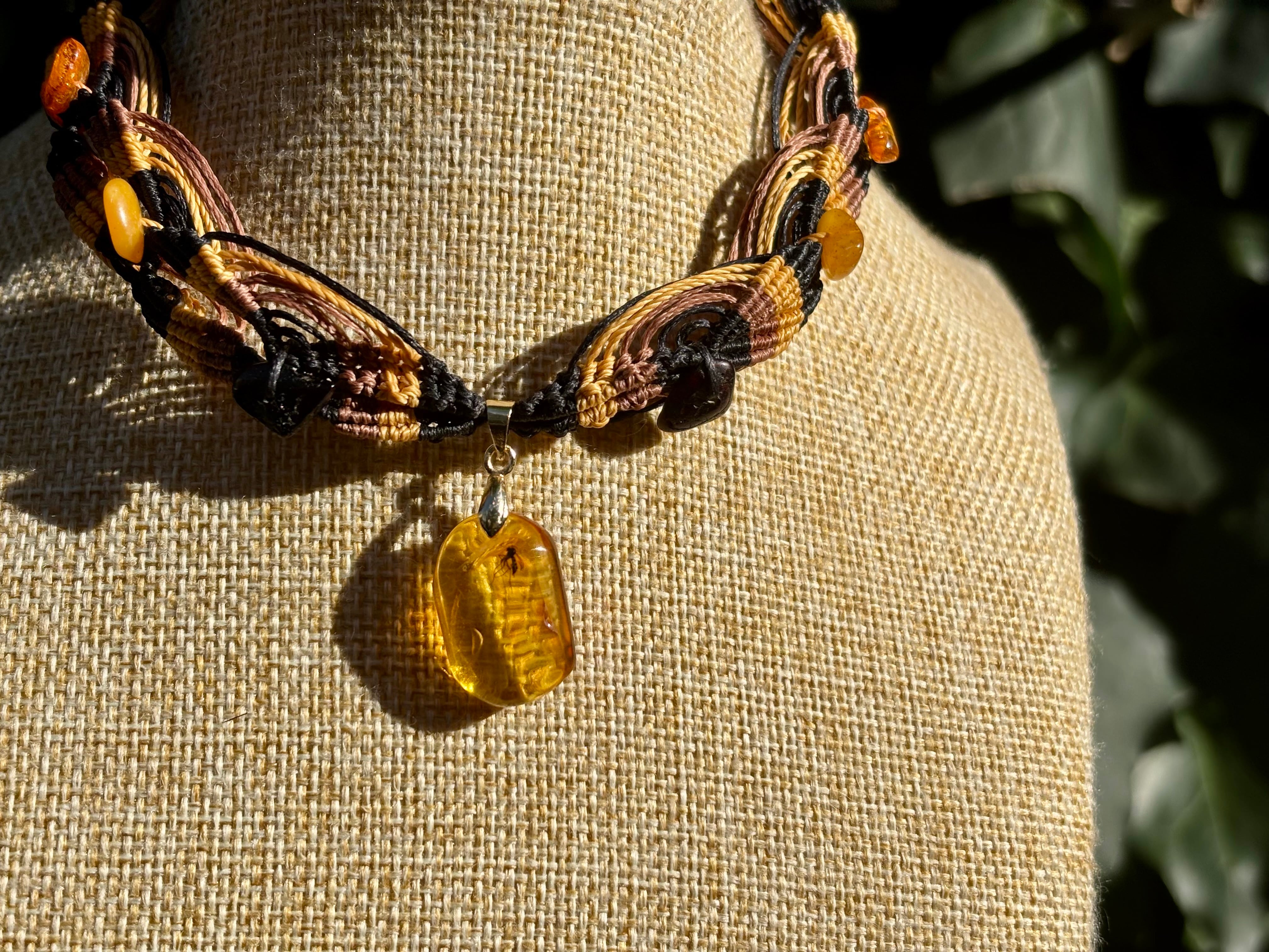 #886高品質虫入りアンバー一点物(虫入りアンバーロシア産×北投石 マクラメ編みネックレス)