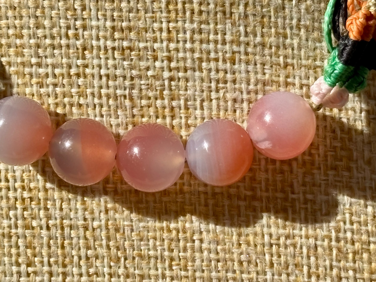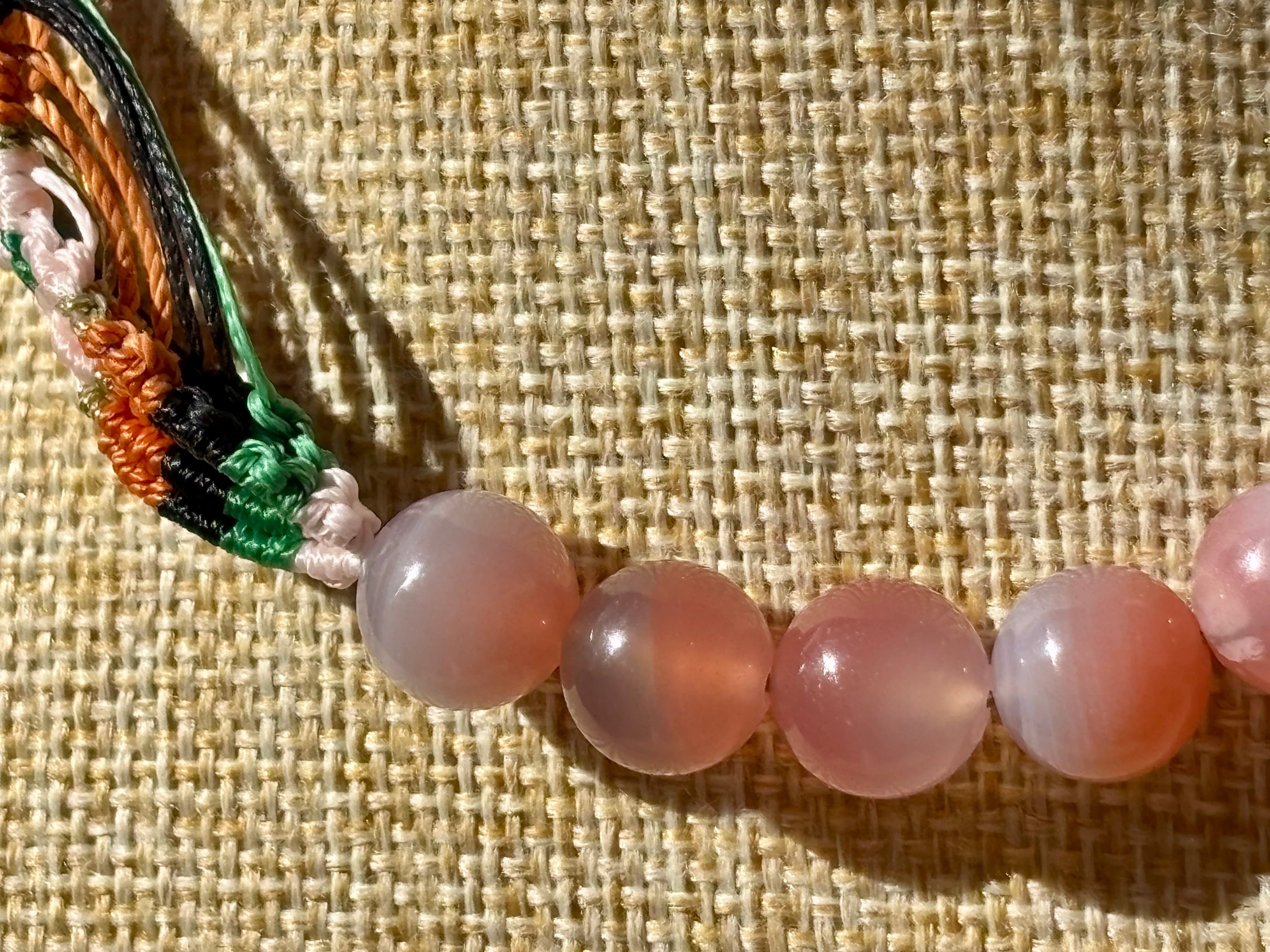 ソルトソースアゲート(塩源瑪瑙)は、中国の四川省塩源県でのみ産出される希少な天然石です。ややオレンジよりの桃色が鮮やかで、半透明でぷるつや、みずみずしい質感が特徴です。加工を一切していない天然の色合いが魅力です。