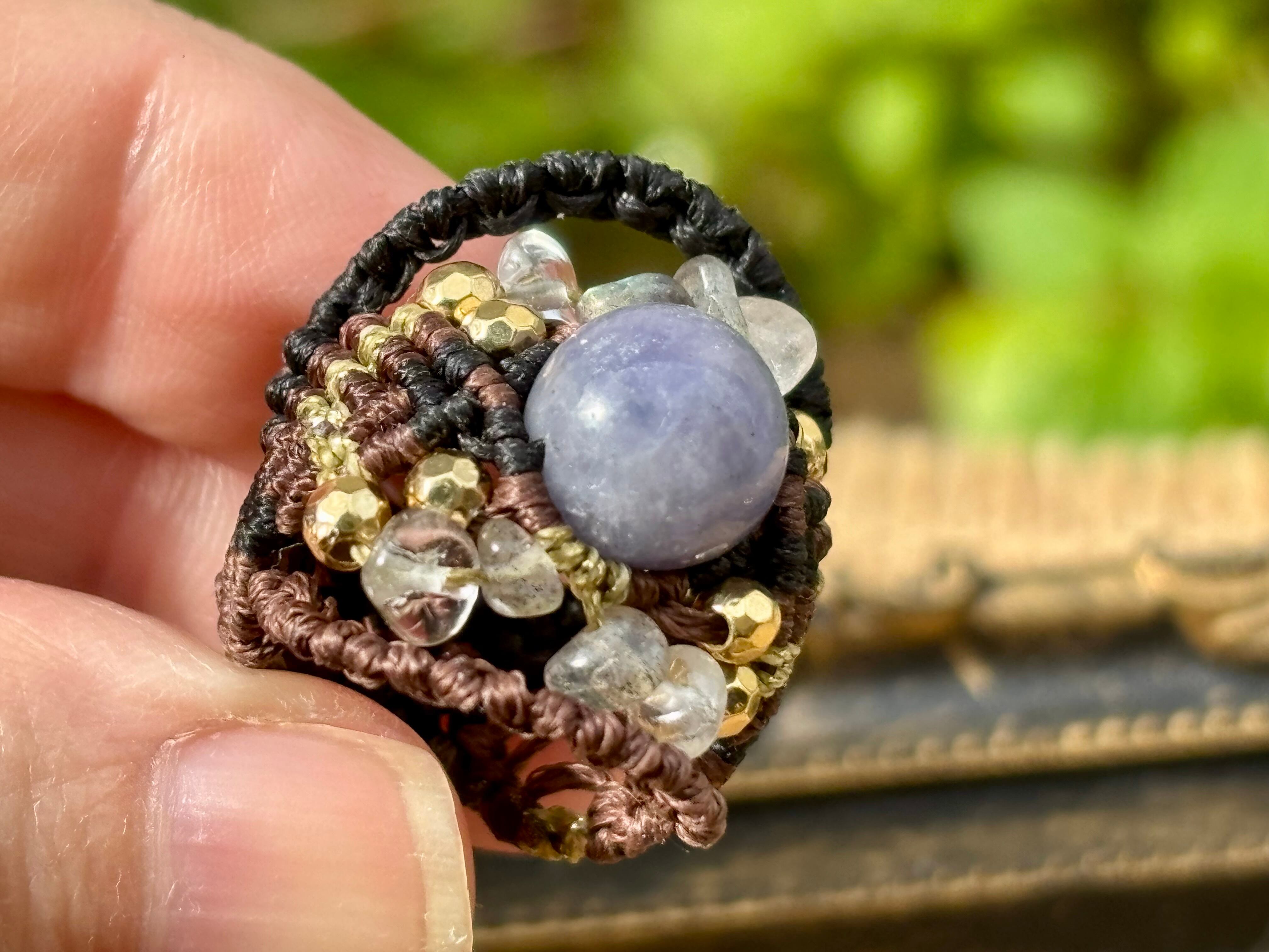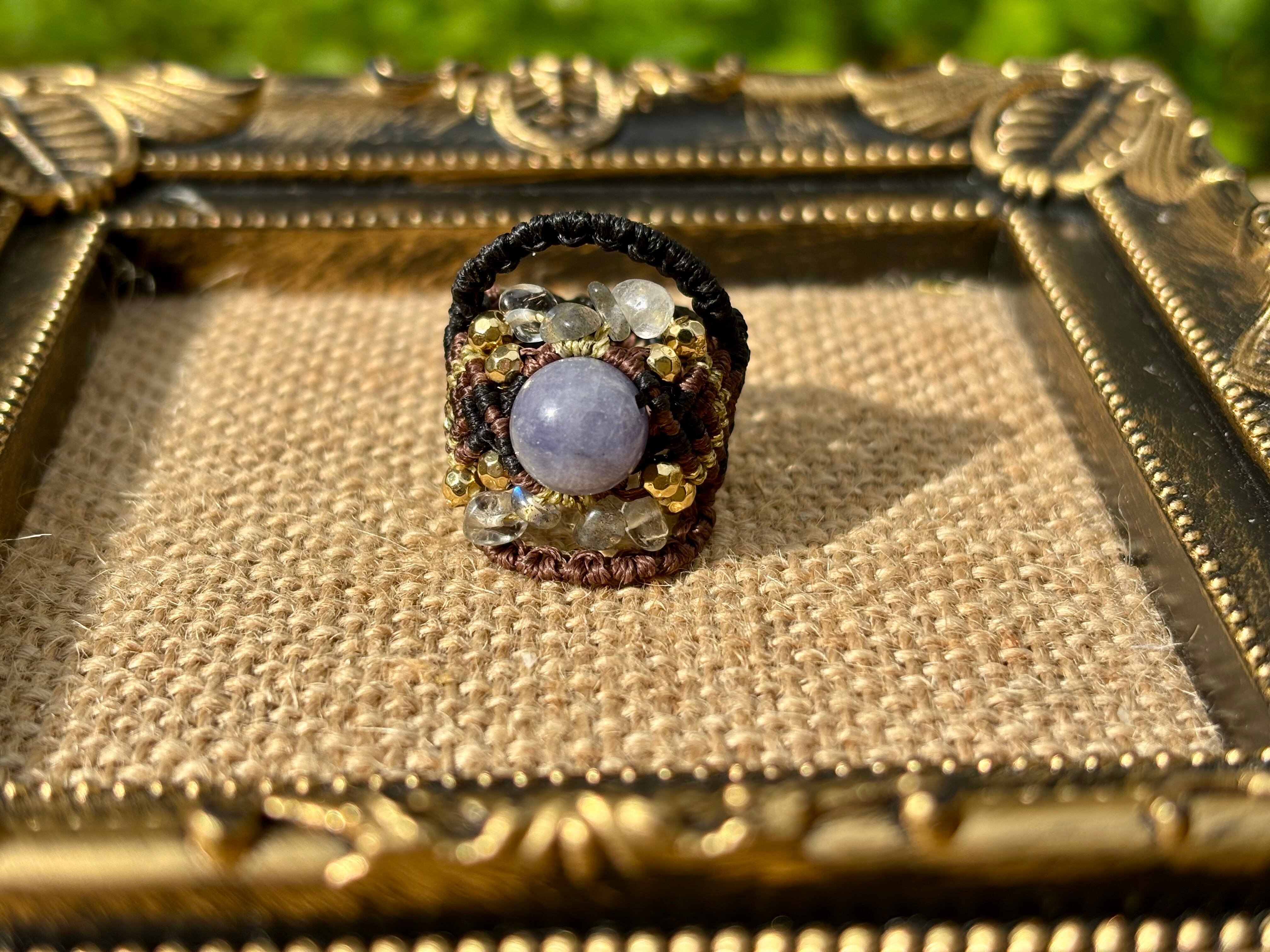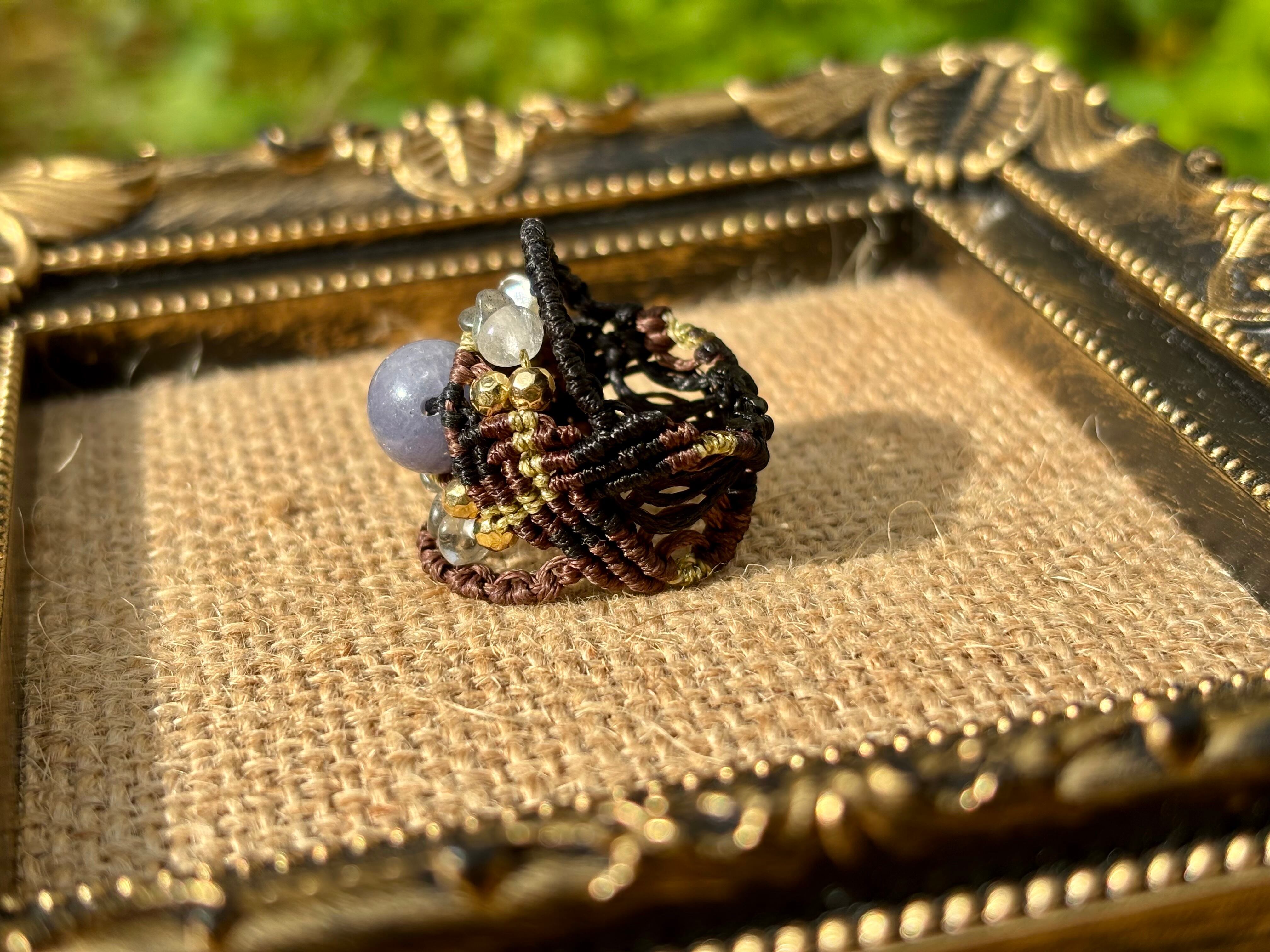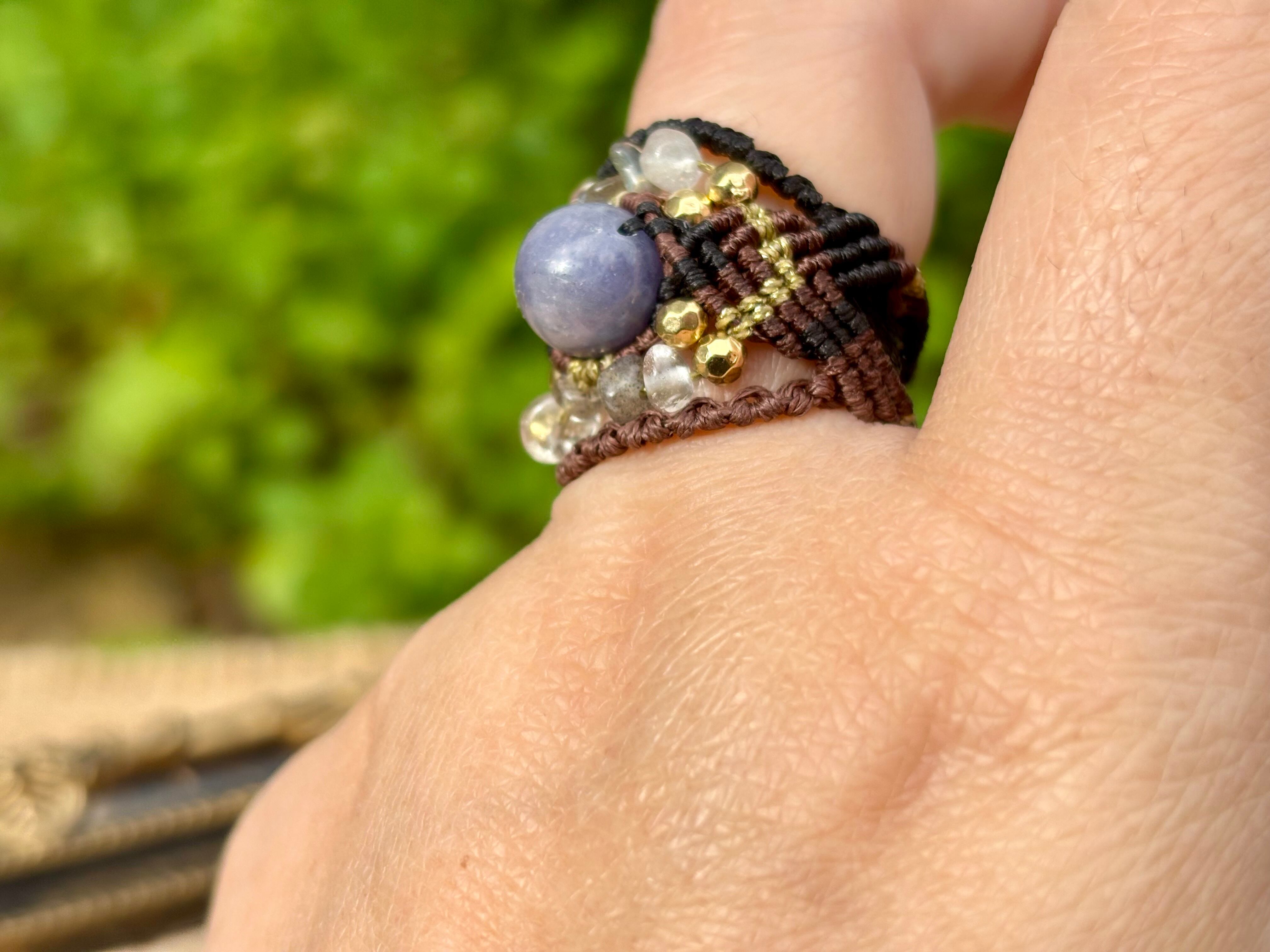 #893希少タンザナイト一点物(タンザナイト×水晶×ラブラドライト マクラメ編みリング/指輪)